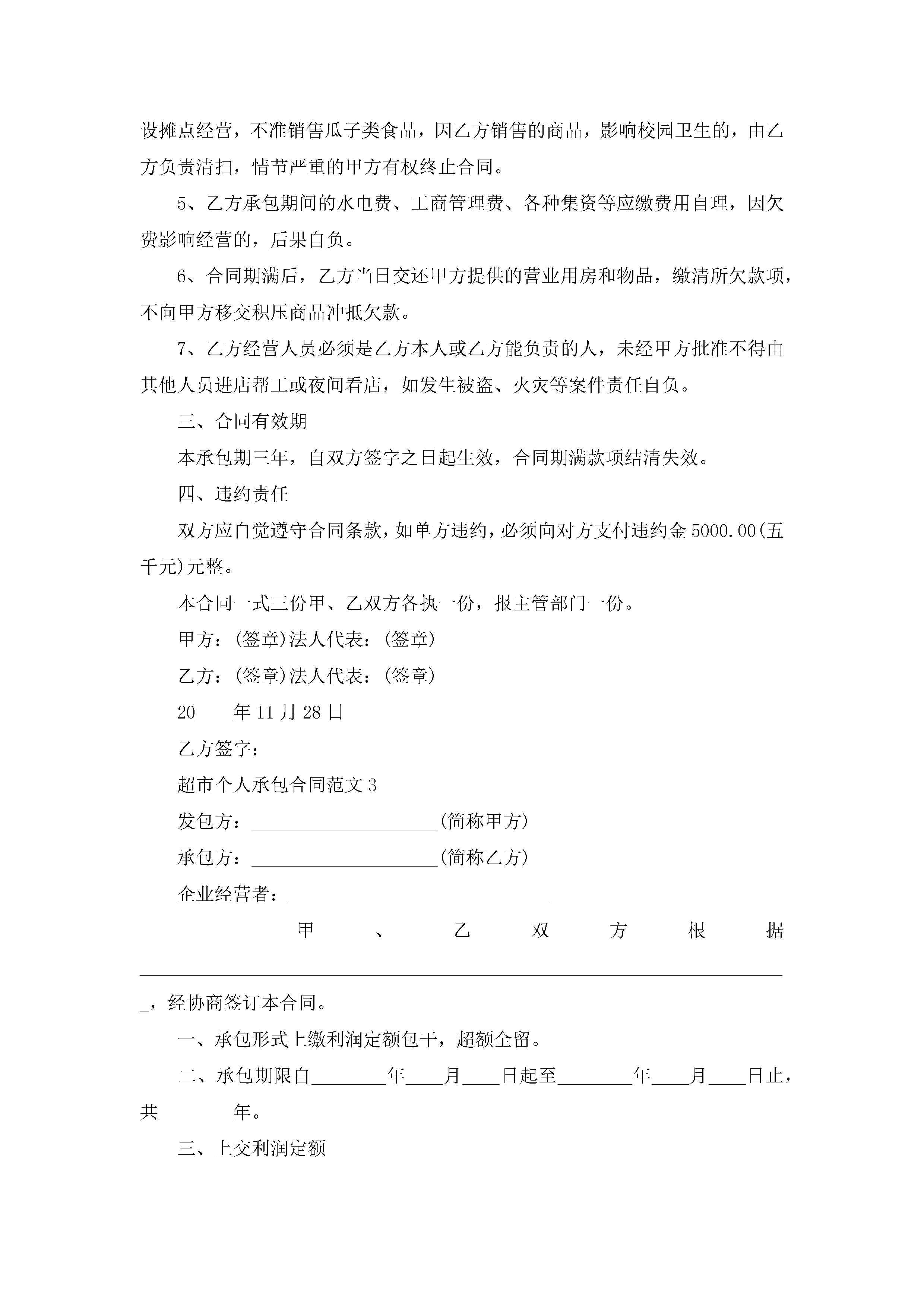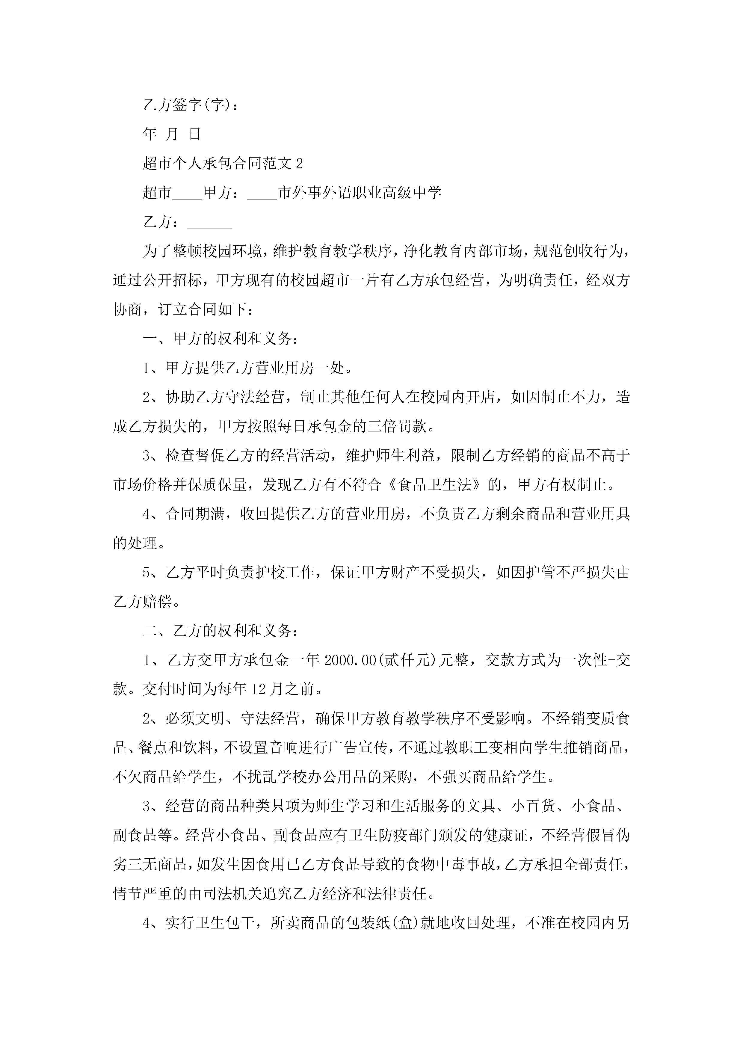 超市个人承包合同范文5篇jugei3月23日 01:35发布关注290 超市个人承包合同范文5篇此内容为付费资源,请付费后查看¥10.9 单篇文档限时特惠¥15个人会员开通企业会员开通立即下载无需登陆!可直接快捷下载单个模板付费资源© 版权声明THE ENDWord模板# 实用文档# 实用模板# 合同模板# 承包合同 如有问题,可点击最底部“联系我们”联系客服 分享QQ空间微博QQ好友海报分享复制链接收藏