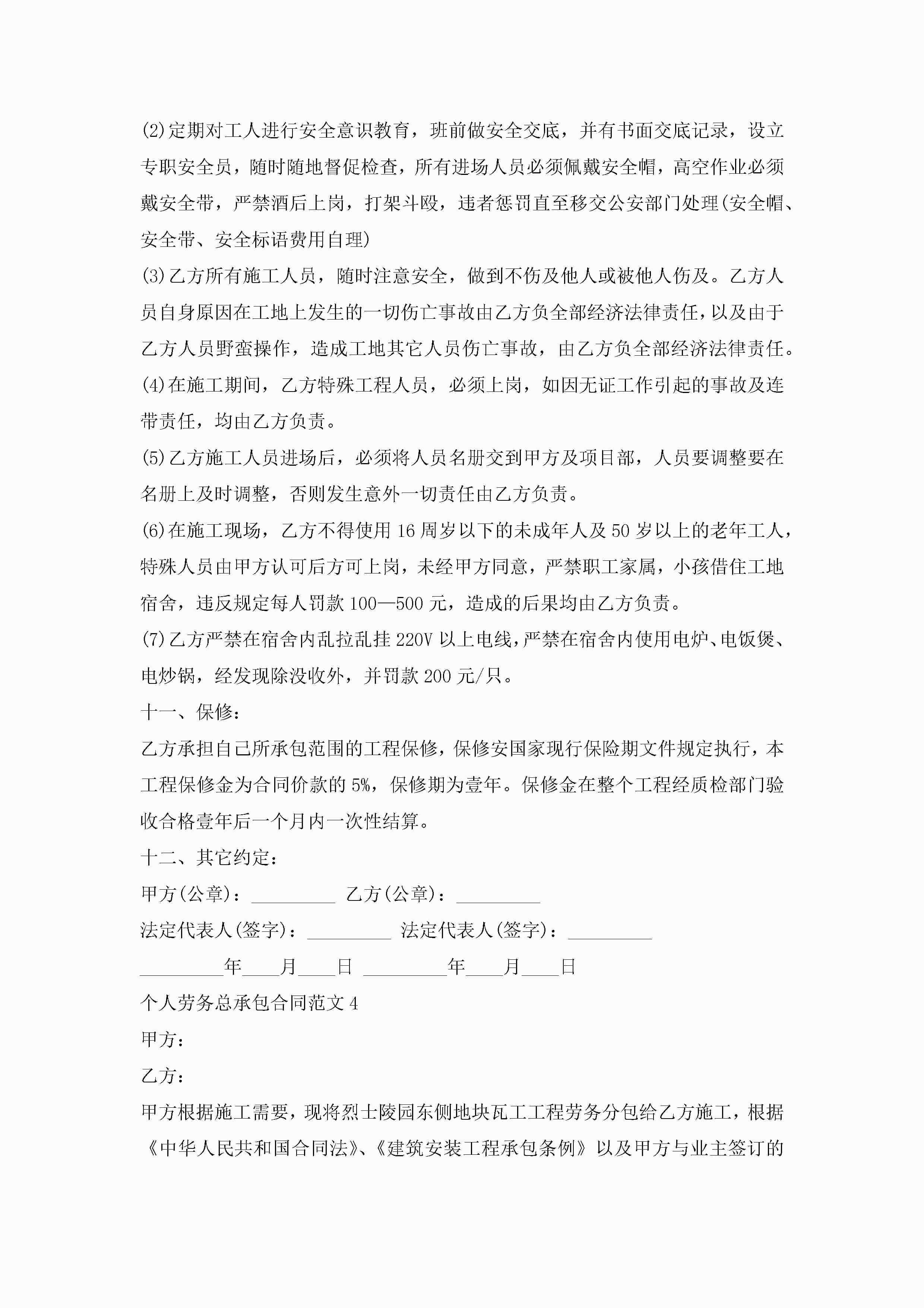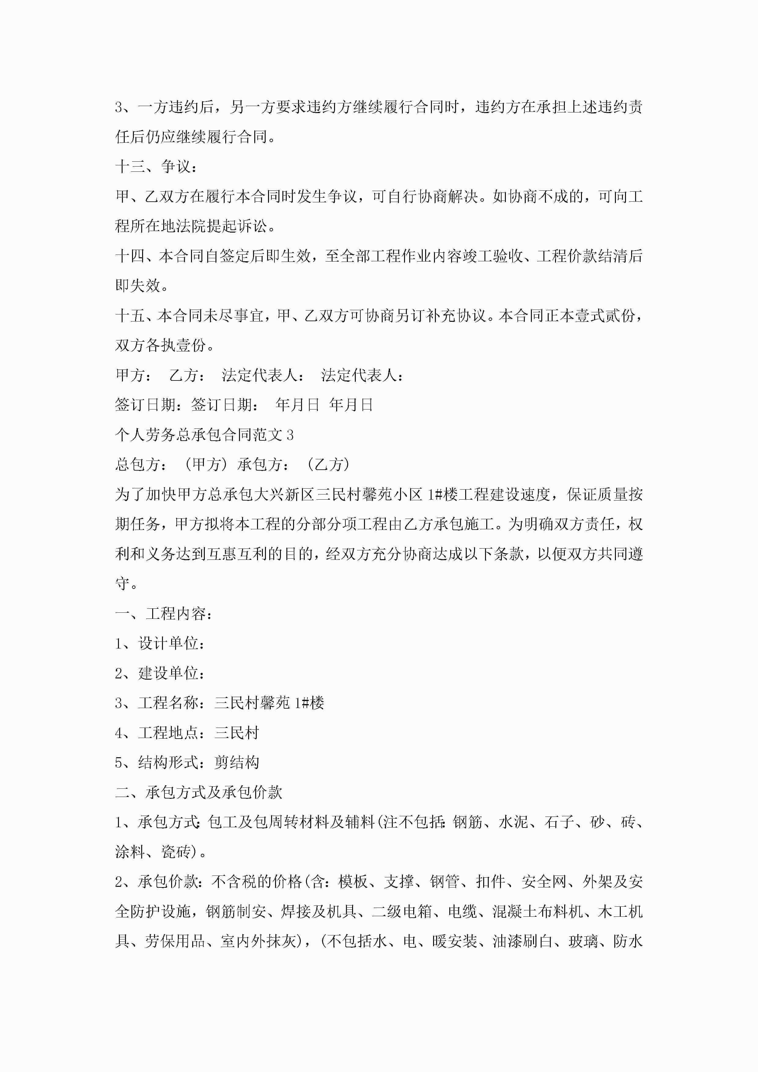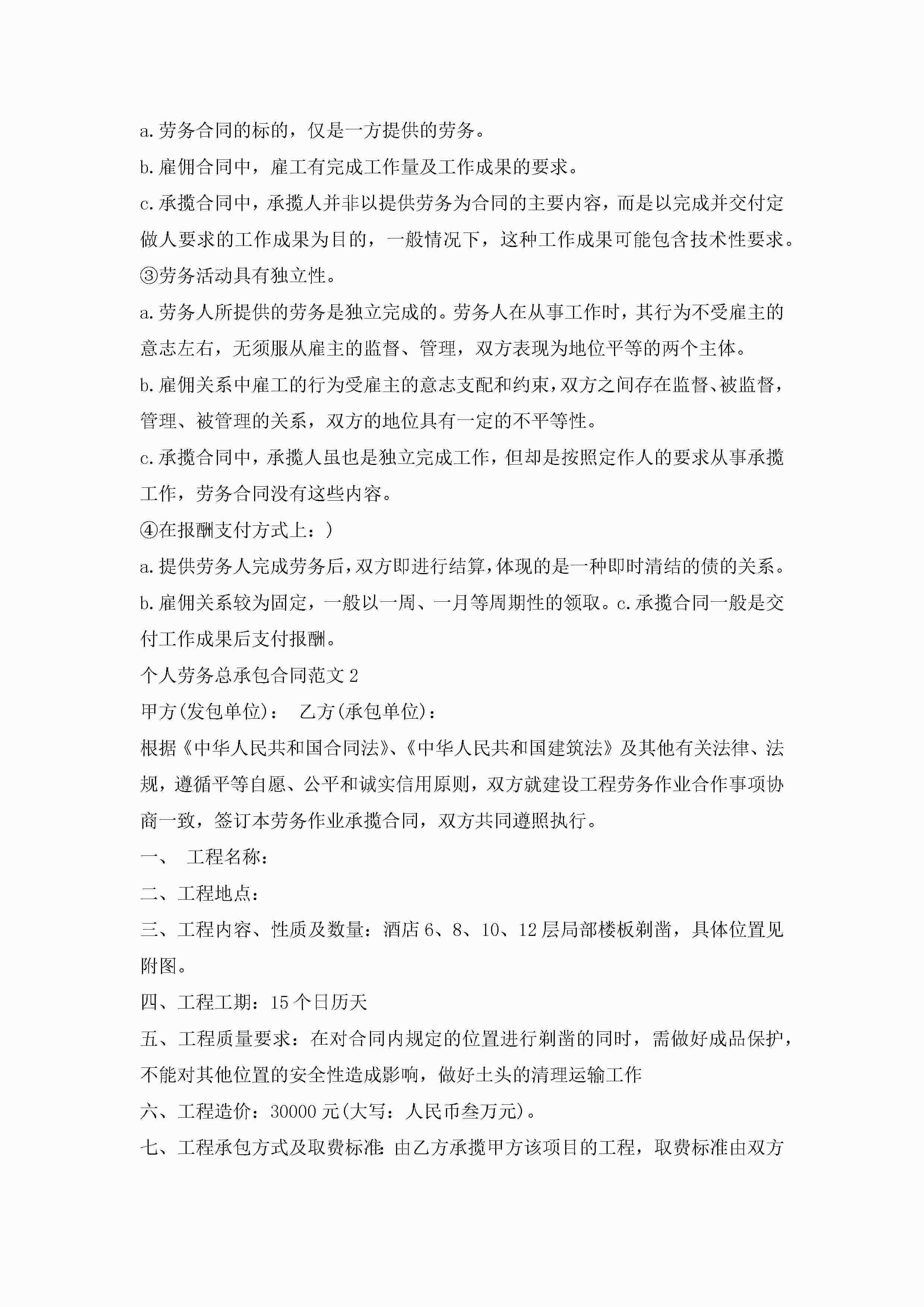 个人劳务总承包合同范文5篇jugei3月23日 01:35发布关注232 个人劳务总承包合同范文5篇此内容为付费资源,请付费后查看¥10.9 单篇文档限时特惠¥15个人会员开通企业会员开通立即下载无需登陆!可直接快捷下载单个模板付费资源© 版权声明THE ENDWord模板# 实用文档# 实用模板# 合同模板# 承包合同 如有问题,可点击最底部“联系我们”联系客服 分享QQ空间微博QQ好友海报分享复制链接收藏