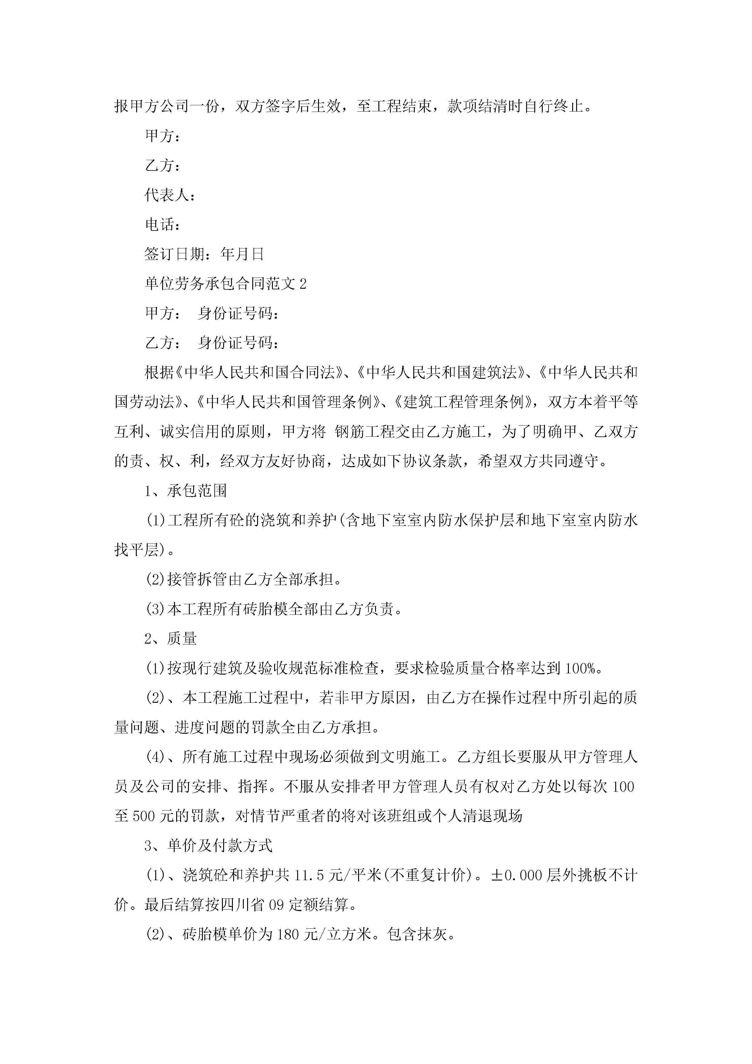 单位劳务承包合同范文5篇jugei3月23日 01:35发布关注224 单位劳务承包合同范文5篇此内容为付费资源,请付费后查看¥10.9 单篇文档限时特惠¥15个人会员开通企业会员开通立即下载无需登陆!可直接快捷下载单个模板付费资源© 版权声明THE ENDWord模板# 实用文档# 实用模板# 合同模板# 承包合同 如有问题,可点击最底部“联系我们”联系客服 分享QQ空间微博QQ好友海报分享复制链接收藏