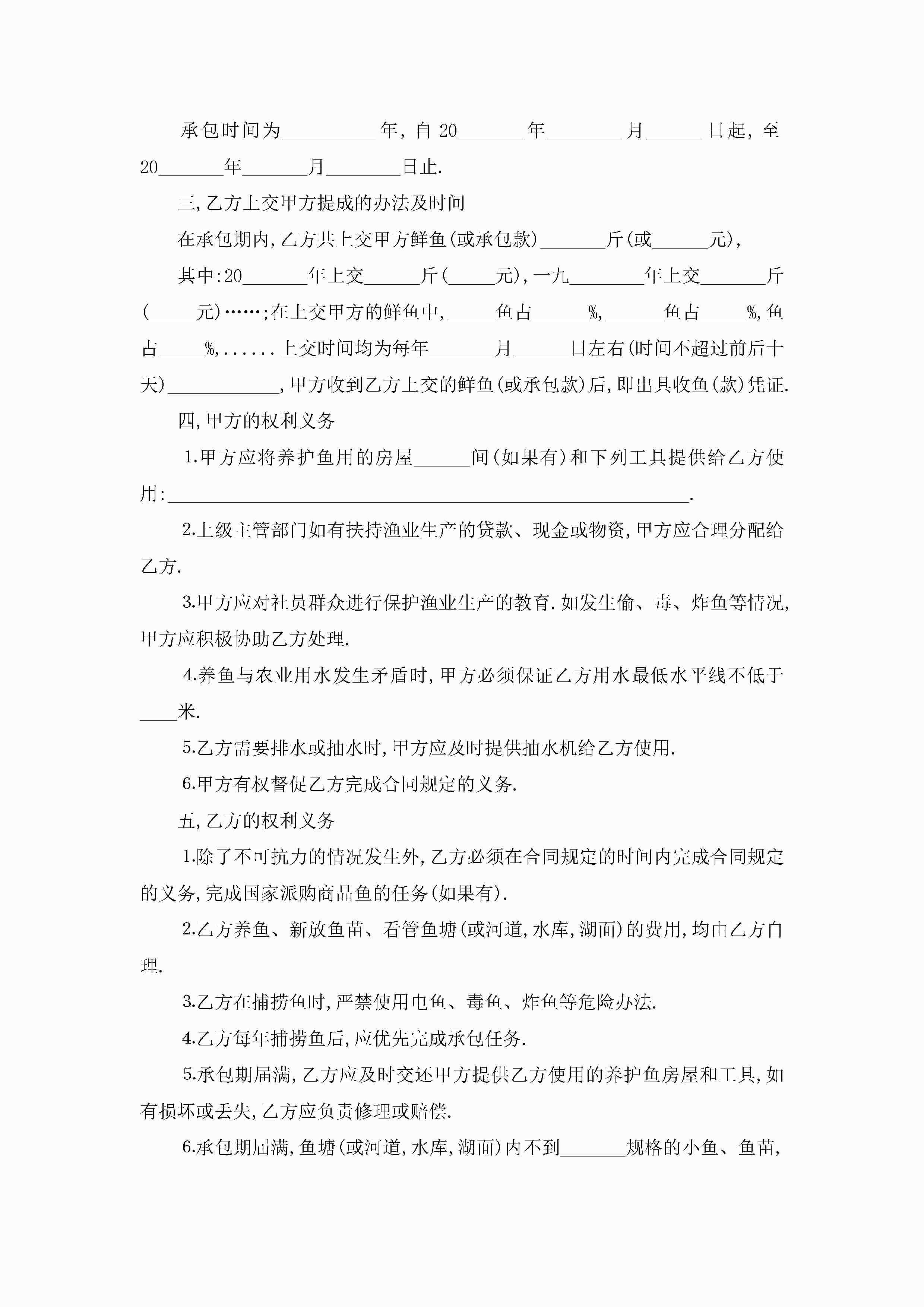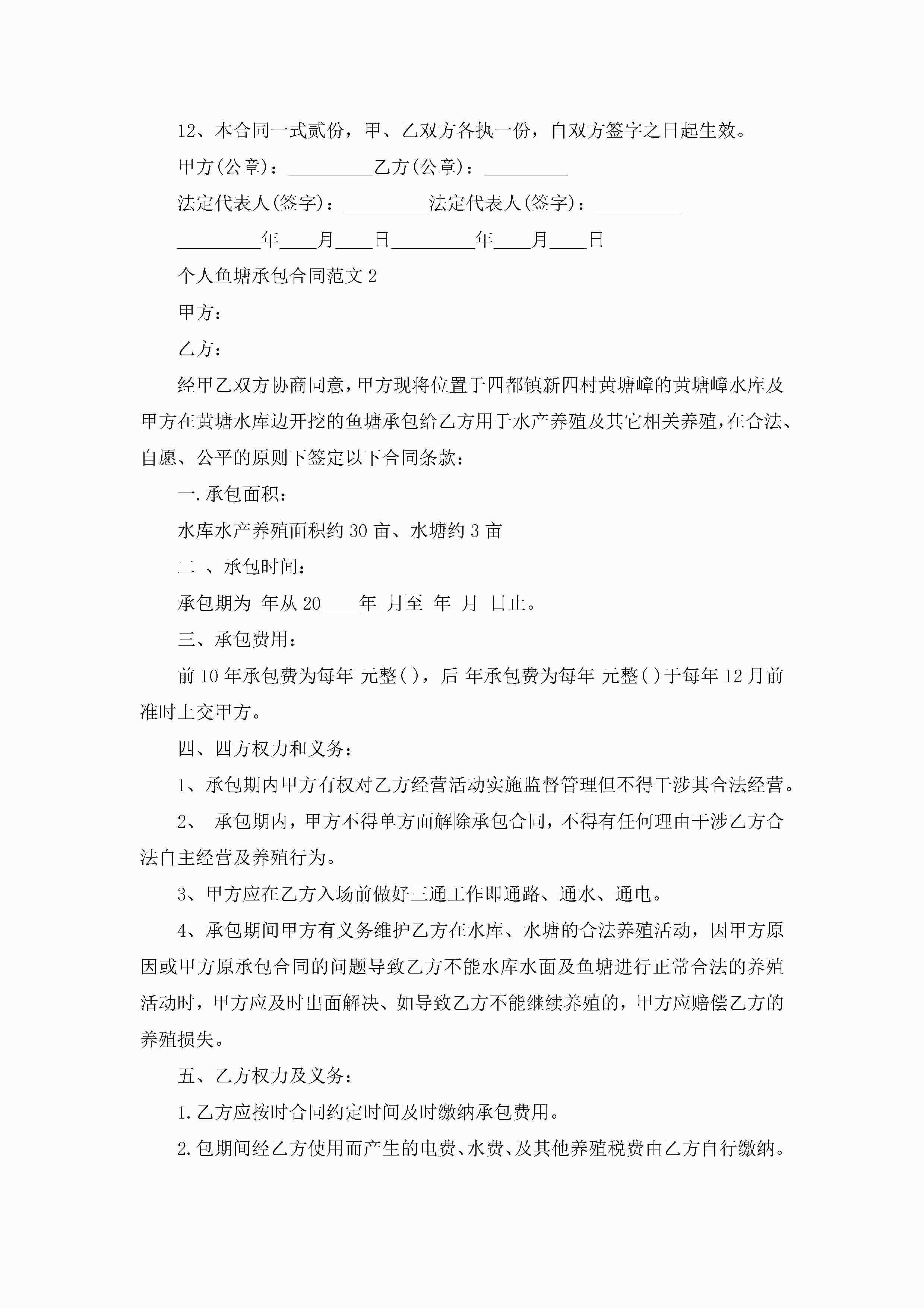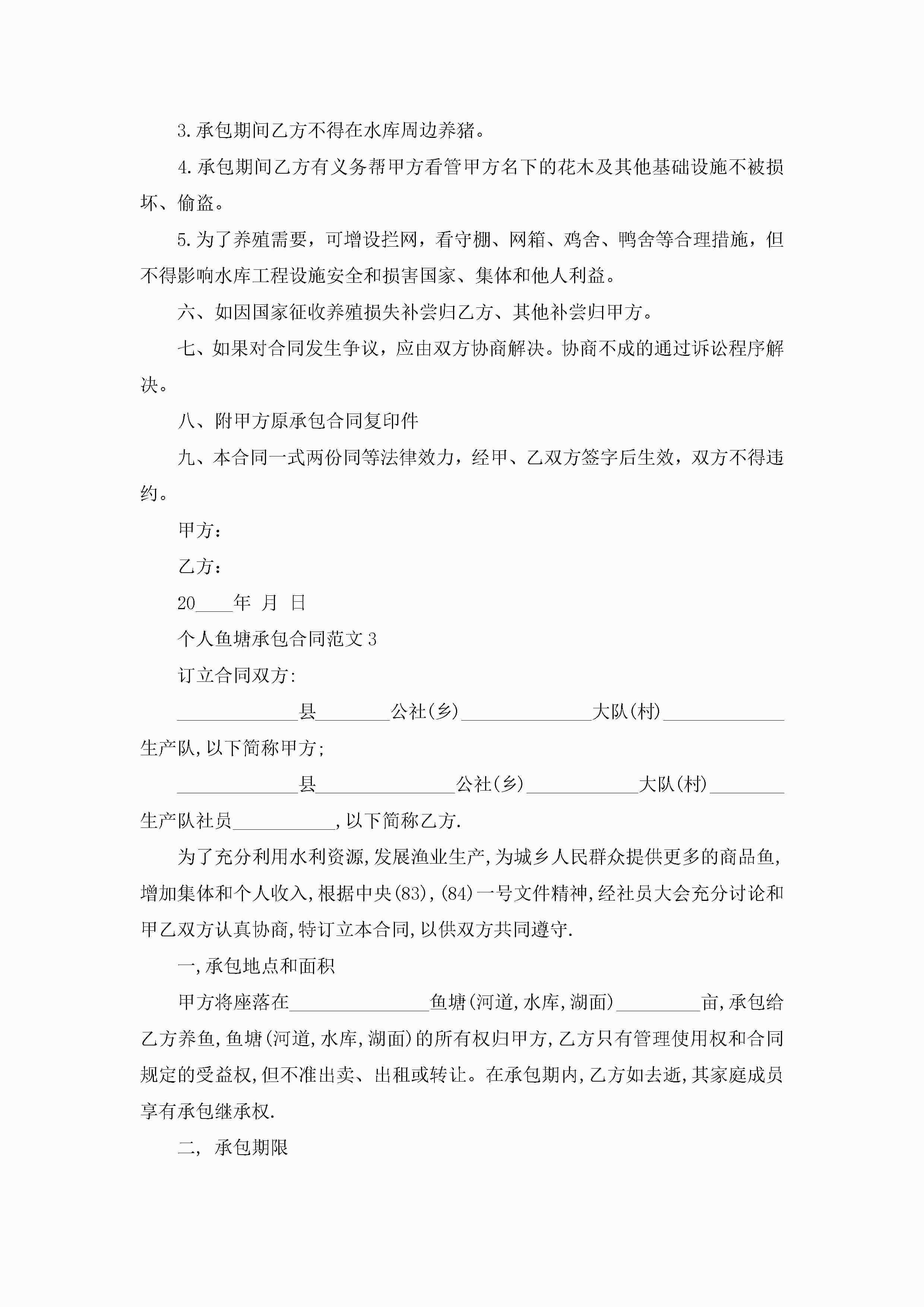 个人鱼塘承包合同范文5篇jugei3月23日 01:35发布关注202 个人鱼塘承包合同范文5篇此内容为付费资源,请付费后查看¥10.9 单篇文档限时特惠¥15个人会员开通企业会员开通立即下载无需登陆!可直接快捷下载单个模板付费资源© 版权声明THE ENDWord模板# 实用文档# 实用模板# 合同模板# 承包合同 如有问题,可点击最底部“联系我们”联系客服 分享QQ空间微博QQ好友海报分享复制链接收藏
