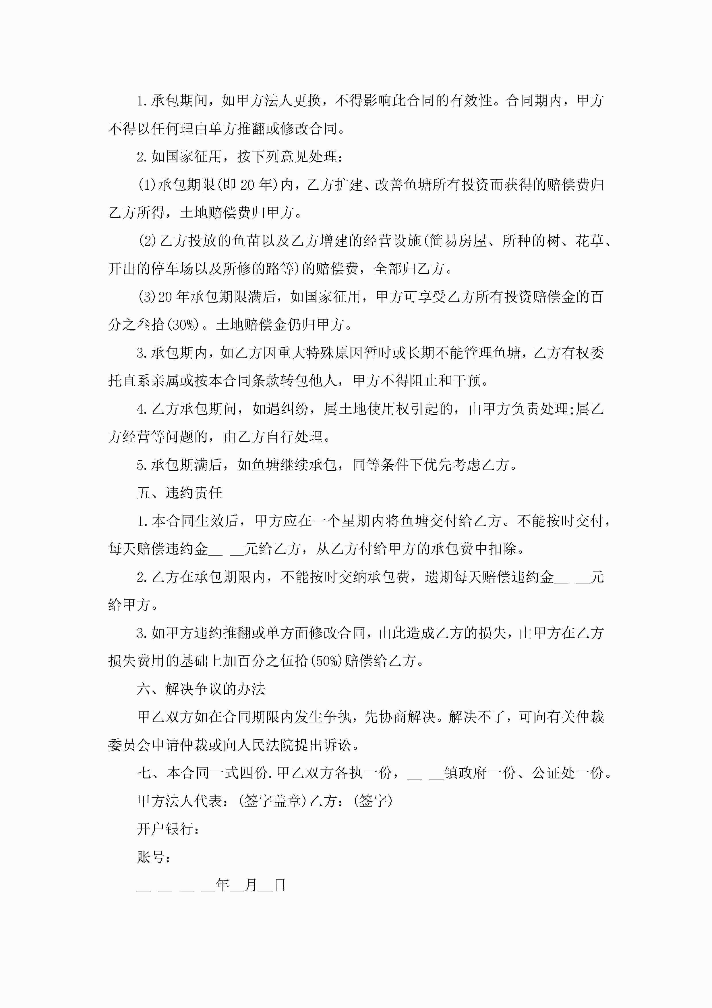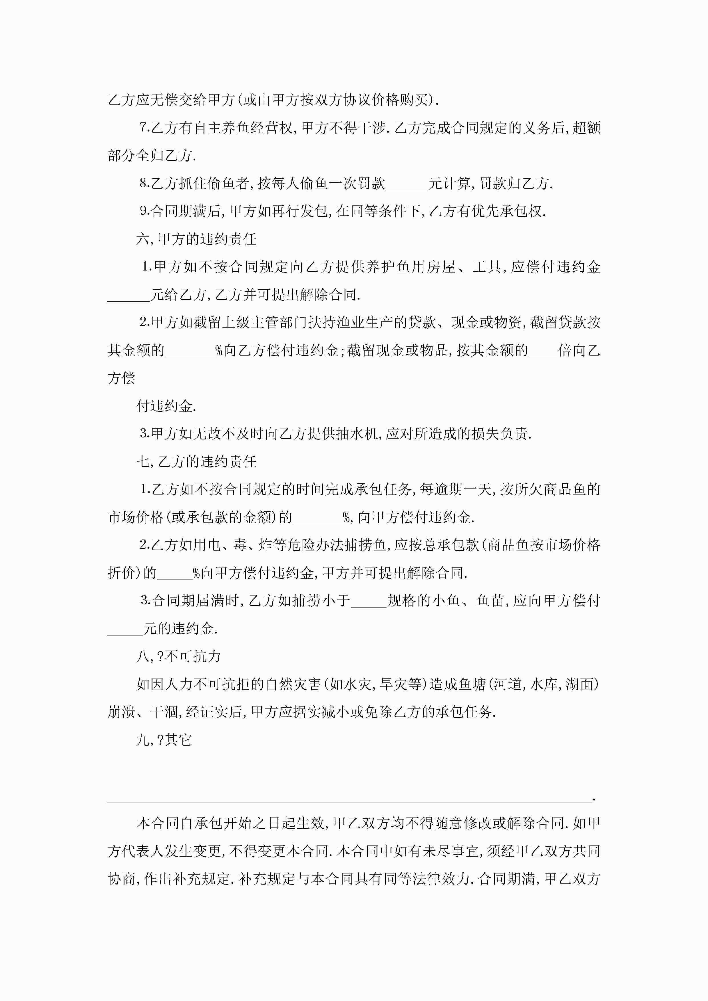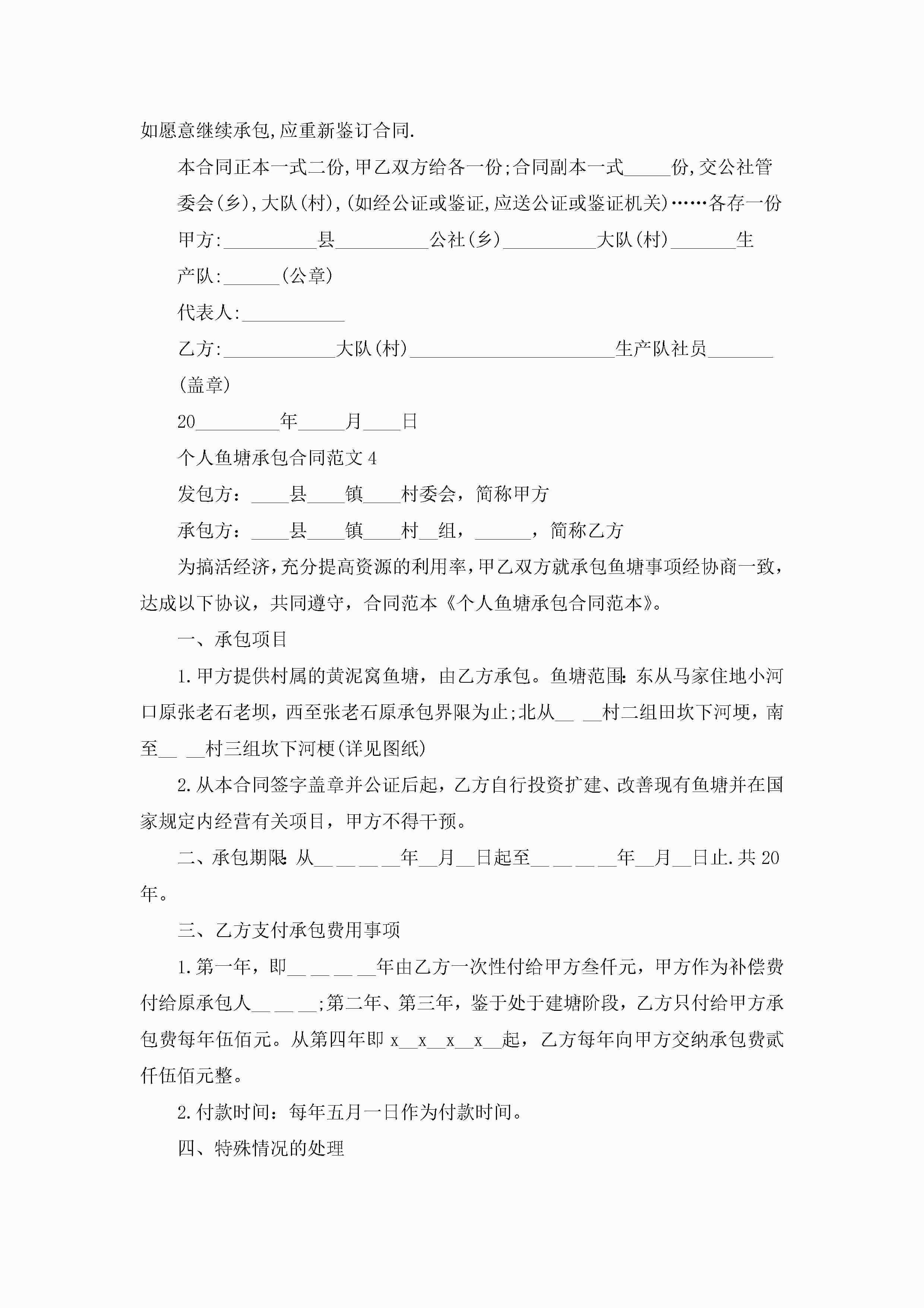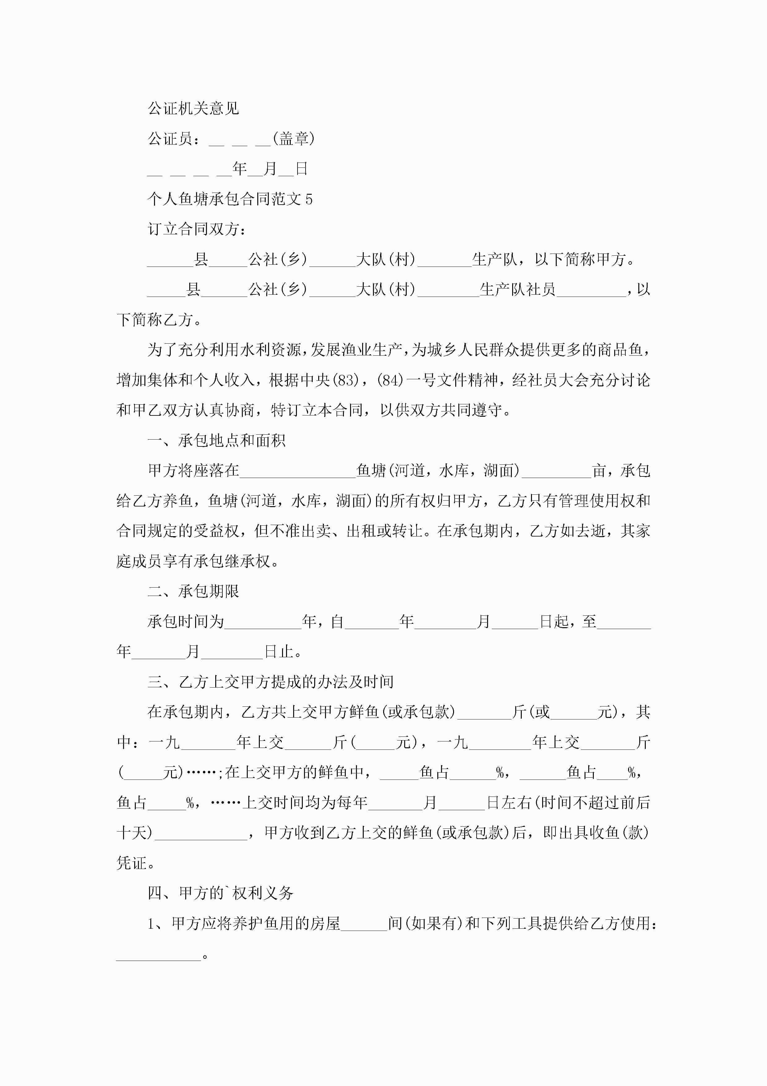 个人鱼塘承包合同范文5篇jugei3月23日 01:35发布关注202 个人鱼塘承包合同范文5篇此内容为付费资源,请付费后查看¥10.9 单篇文档限时特惠¥15个人会员开通企业会员开通立即下载无需登陆!可直接快捷下载单个模板付费资源© 版权声明THE ENDWord模板# 实用文档# 实用模板# 合同模板# 承包合同 如有问题,可点击最底部“联系我们”联系客服 分享QQ空间微博QQ好友海报分享复制链接收藏