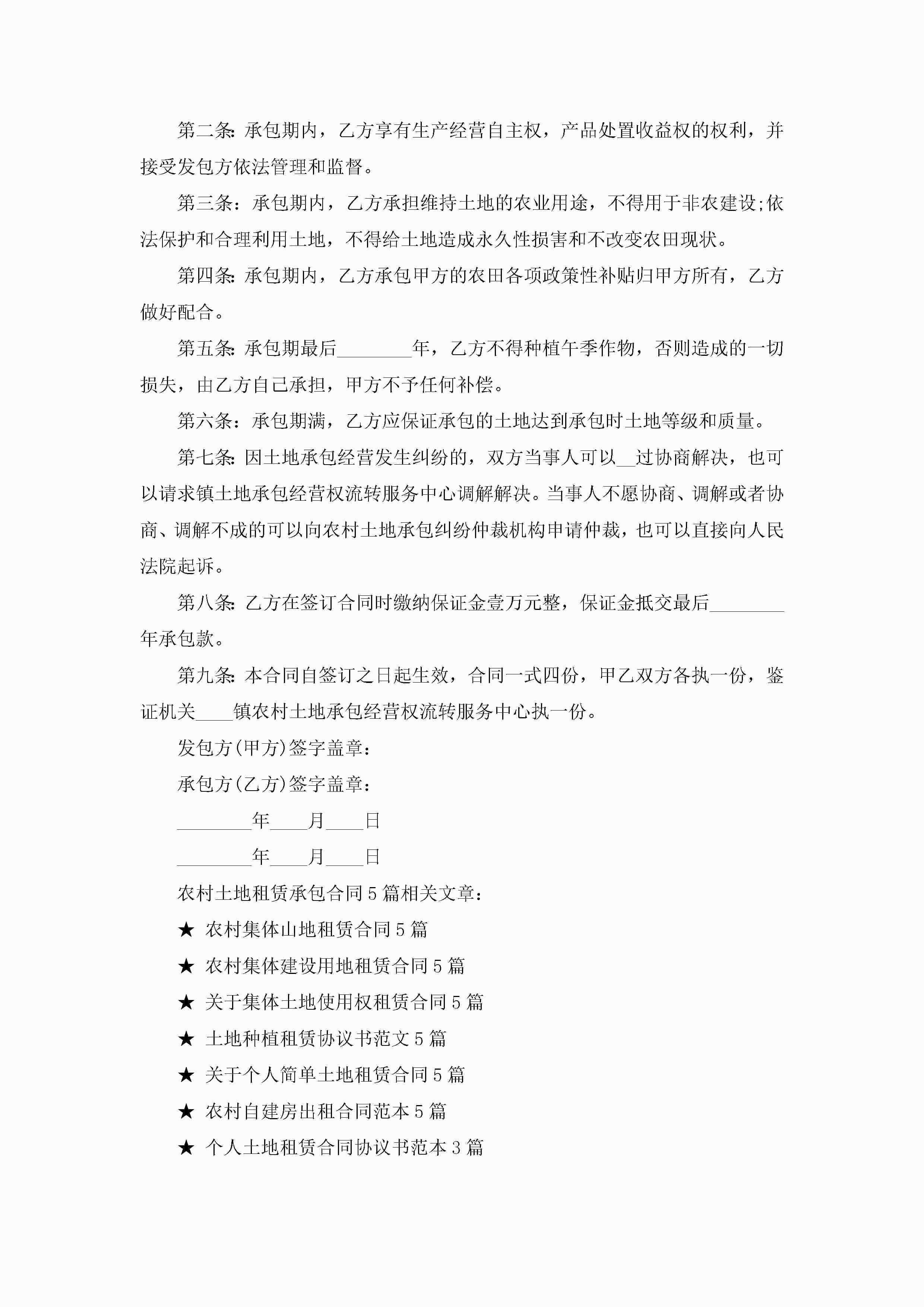 农村土地租赁承包合同范文5篇jugei3月23日 01:35发布关注198 农村土地租赁承包合同范文5篇此内容为付费资源,请付费后查看¥10.9 单篇文档限时特惠¥15个人会员开通企业会员开通立即下载无需登陆!可直接快捷下载单个模板付费资源© 版权声明THE ENDWord模板# 实用文档# 实用模板# 合同模板# 承包合同 如有问题,可点击最底部“联系我们”联系客服 分享QQ空间微博QQ好友海报分享复制链接收藏