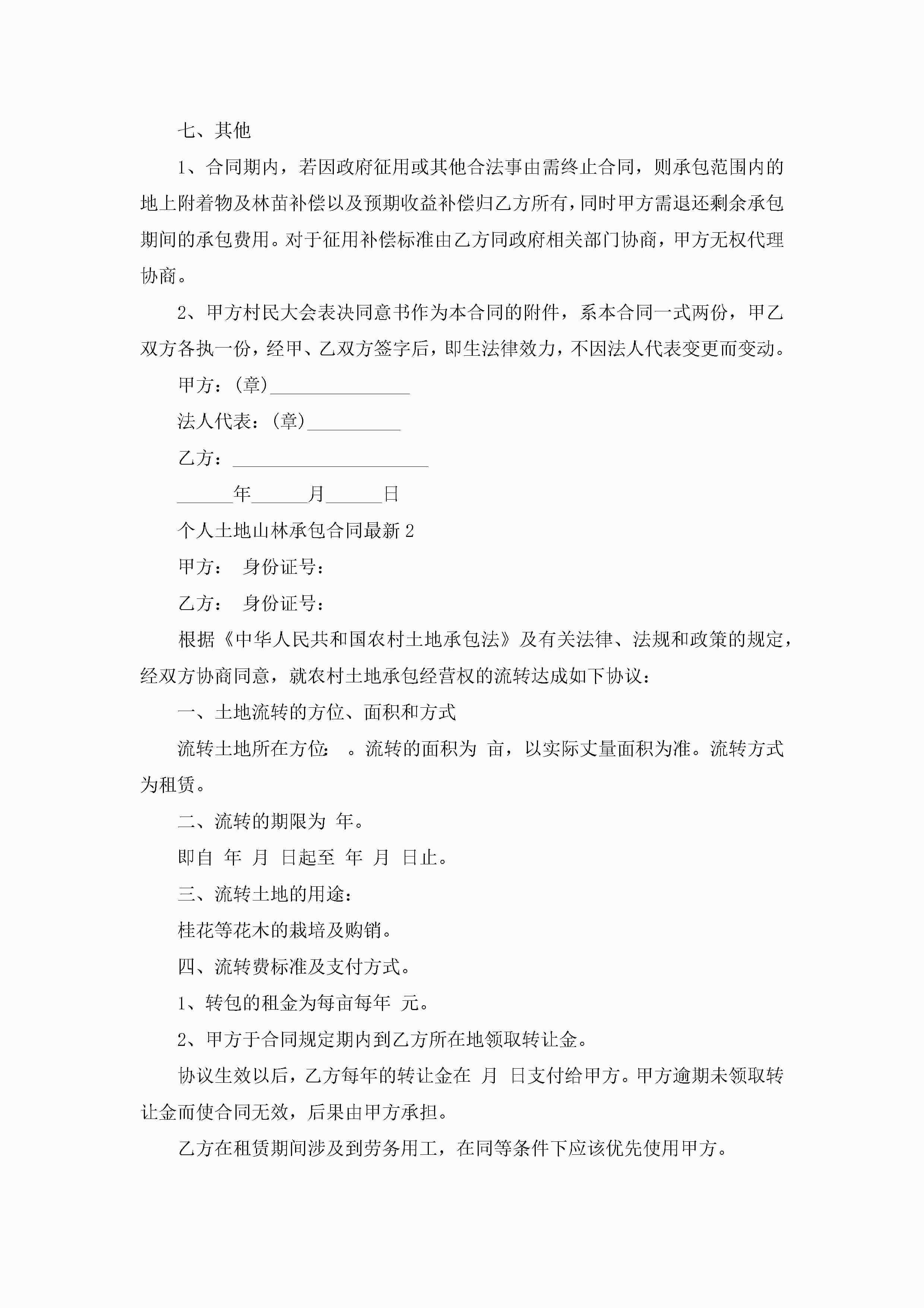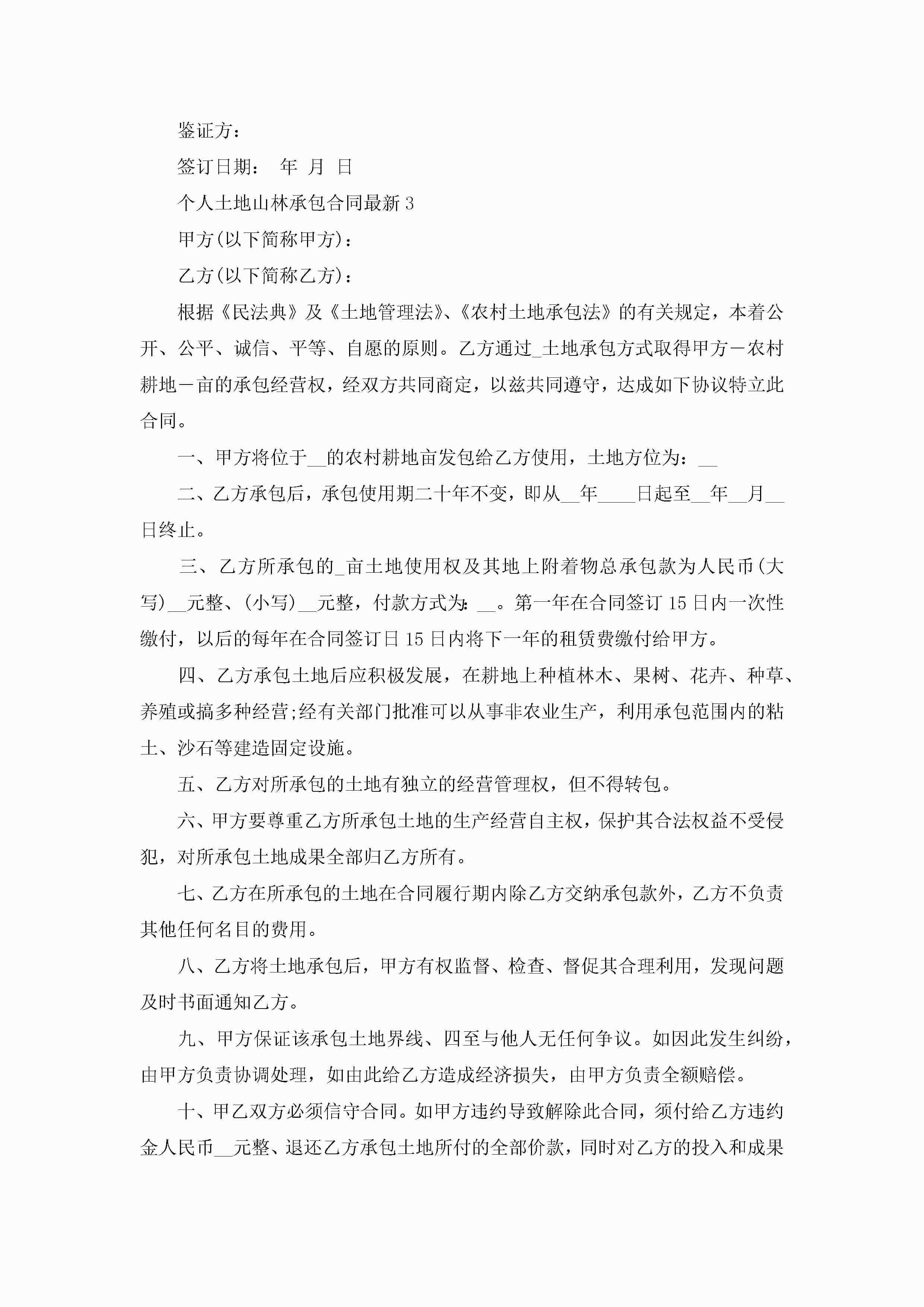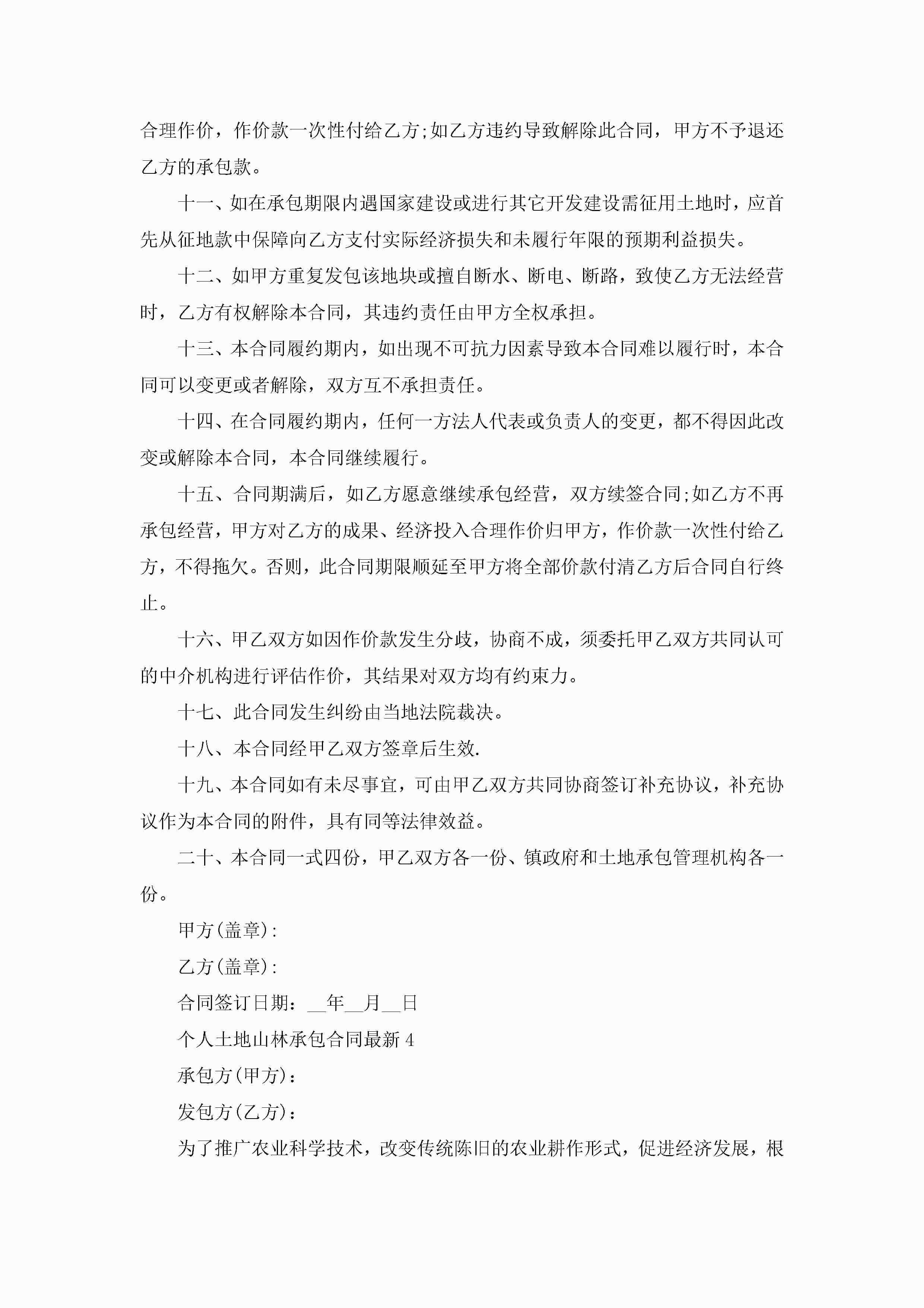 关于个人土地山林承包合同最新5篇jugei3月23日 01:35发布关注193 关于个人土地山林承包合同最新5篇此内容为付费资源,请付费后查看¥10.9 单篇文档限时特惠¥15个人会员开通企业会员开通立即下载无需登陆!可直接快捷下载单个模板付费资源© 版权声明THE ENDWord模板# 实用文档# 实用模板# 合同模板# 承包合同 如有问题,可点击最底部“联系我们”联系客服 分享QQ空间微博QQ好友海报分享复制链接收藏