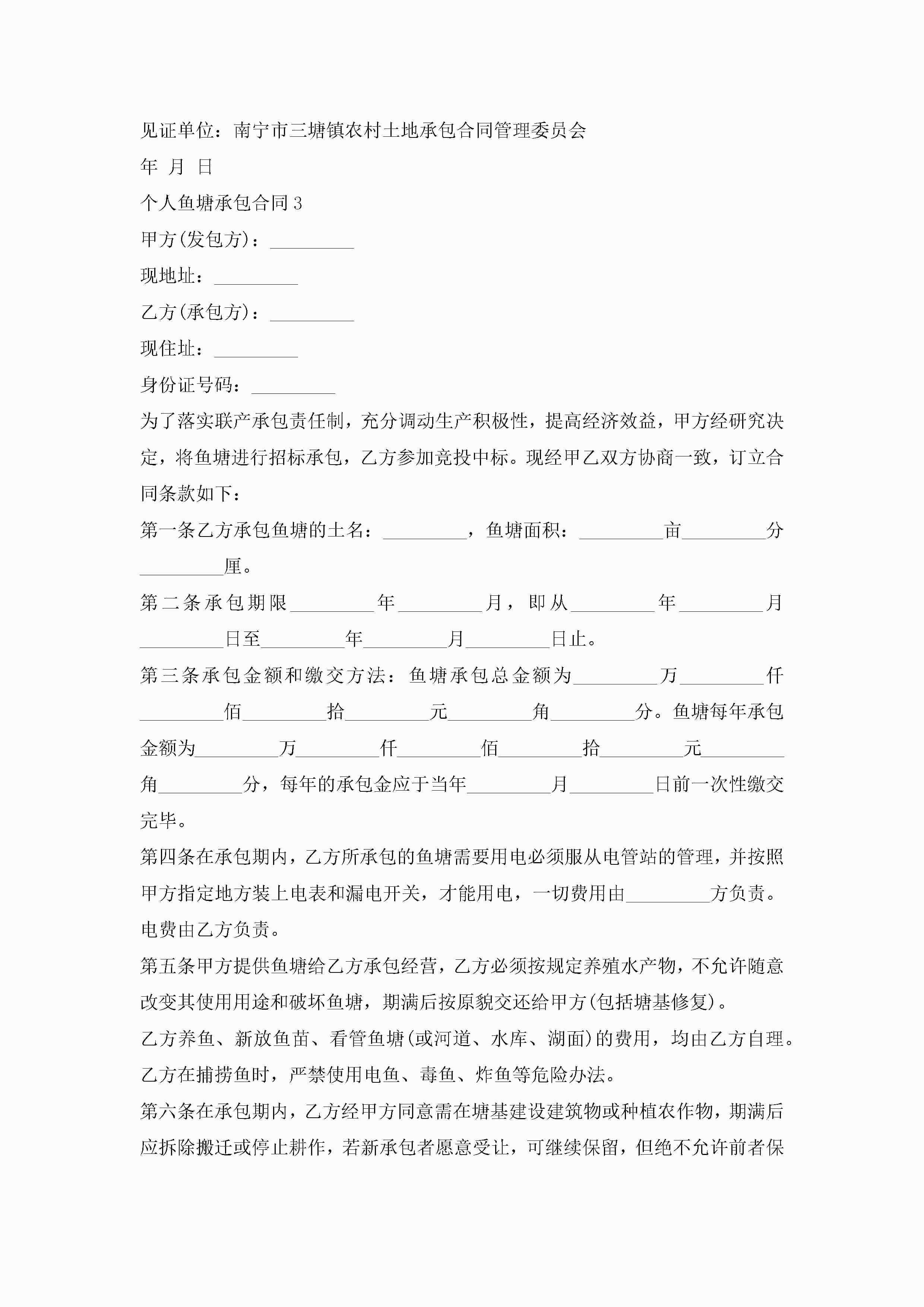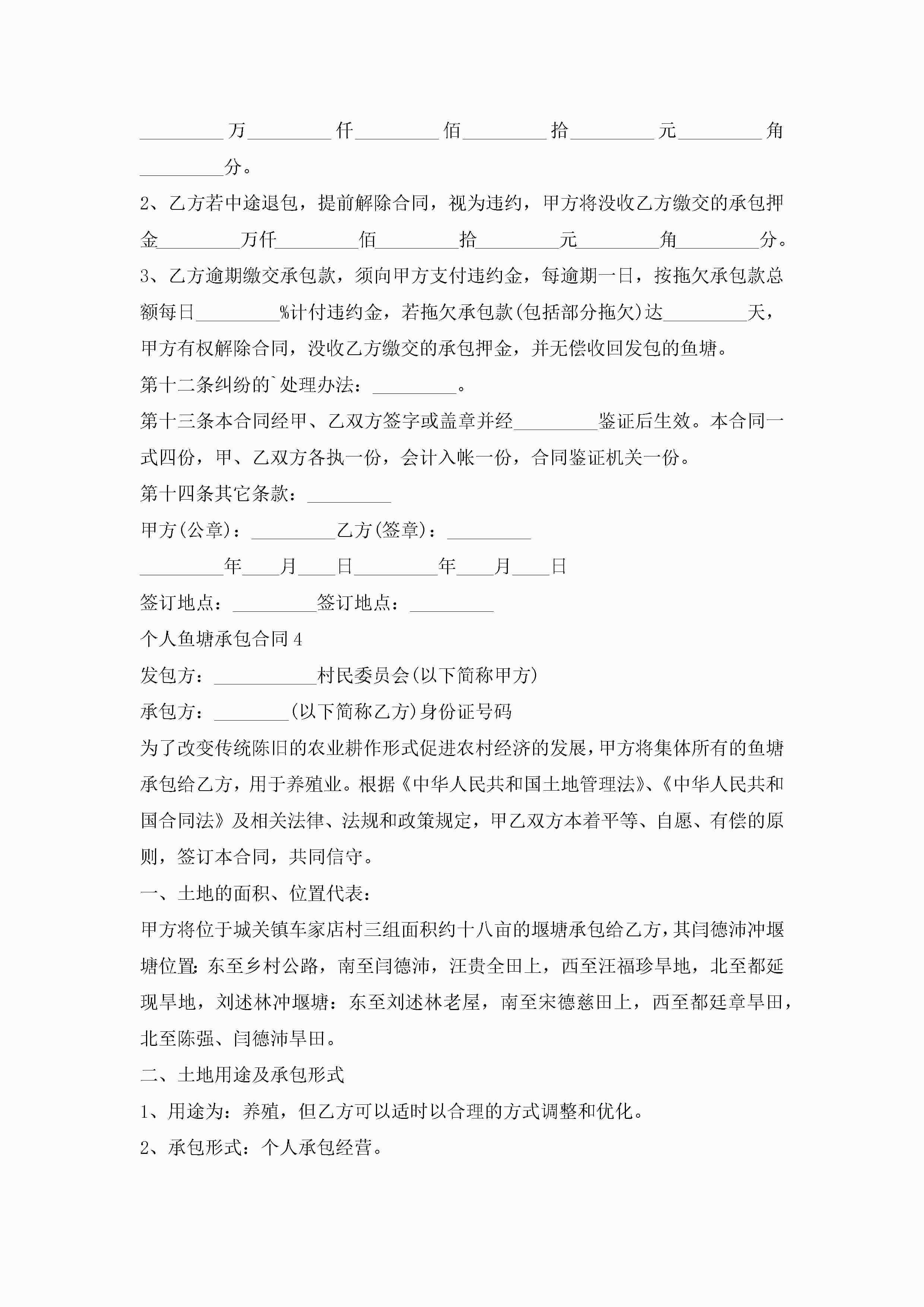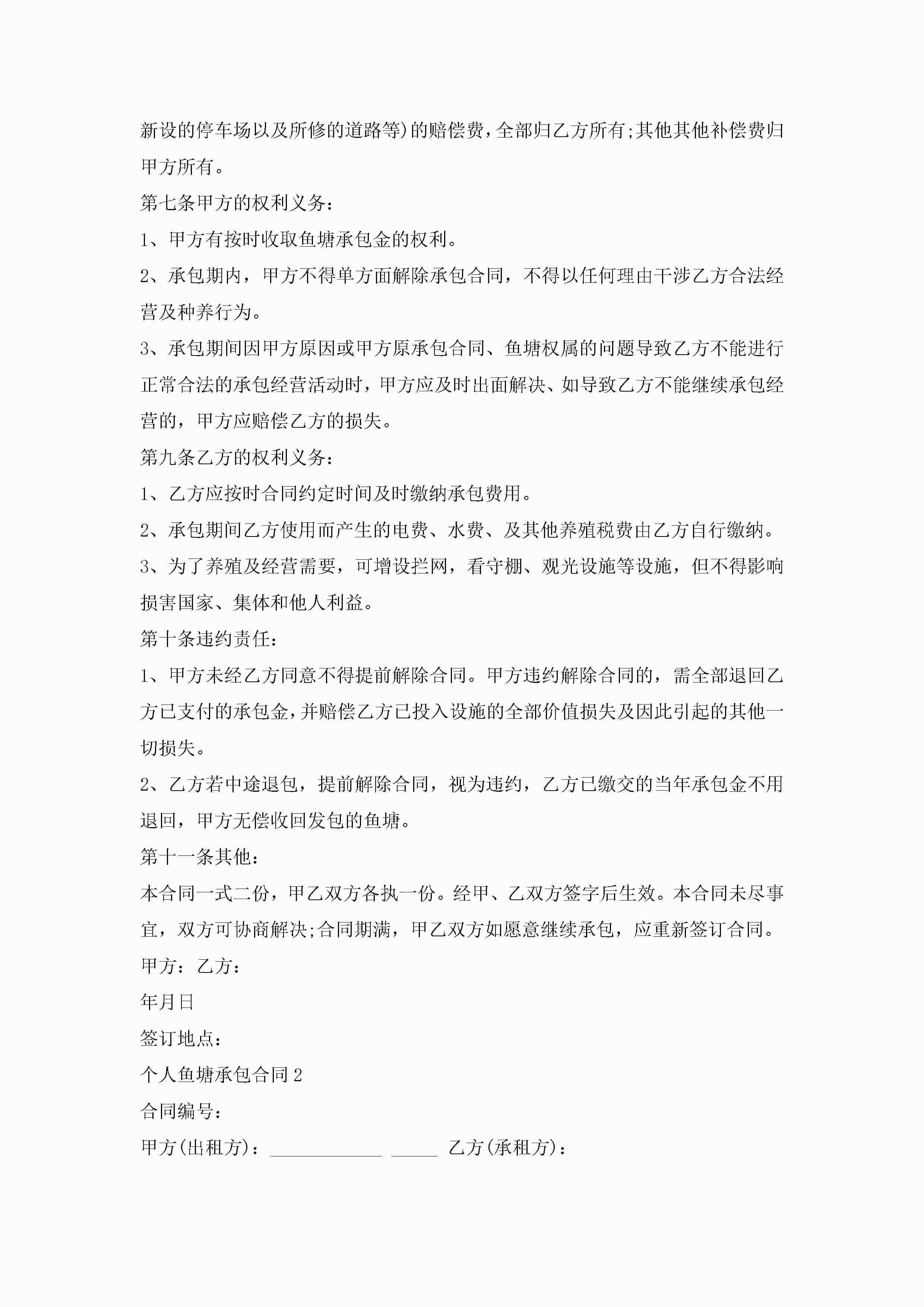 个人鱼塘承包合同范文5篇jugei3月23日 01:35发布关注196 个人鱼塘承包合同范文5篇此内容为付费资源,请付费后查看¥10.9 单篇文档限时特惠¥15个人会员开通企业会员开通立即下载无需登陆!可直接快捷下载单个模板付费资源© 版权声明THE ENDWord模板# 实用文档# 实用模板# 合同模板# 承包合同 如有问题,可点击最底部“联系我们”联系客服 分享QQ空间微博QQ好友海报分享复制链接收藏