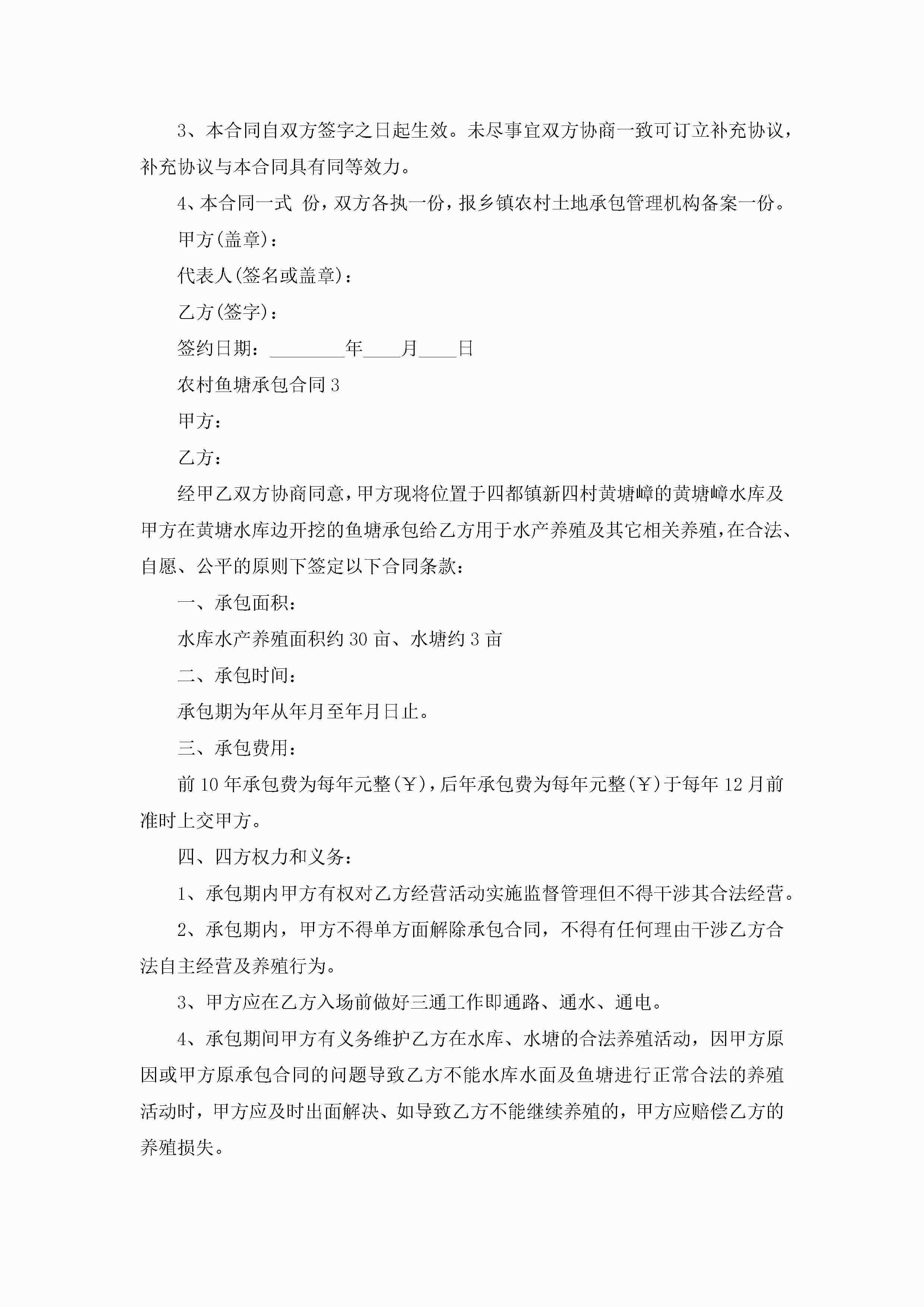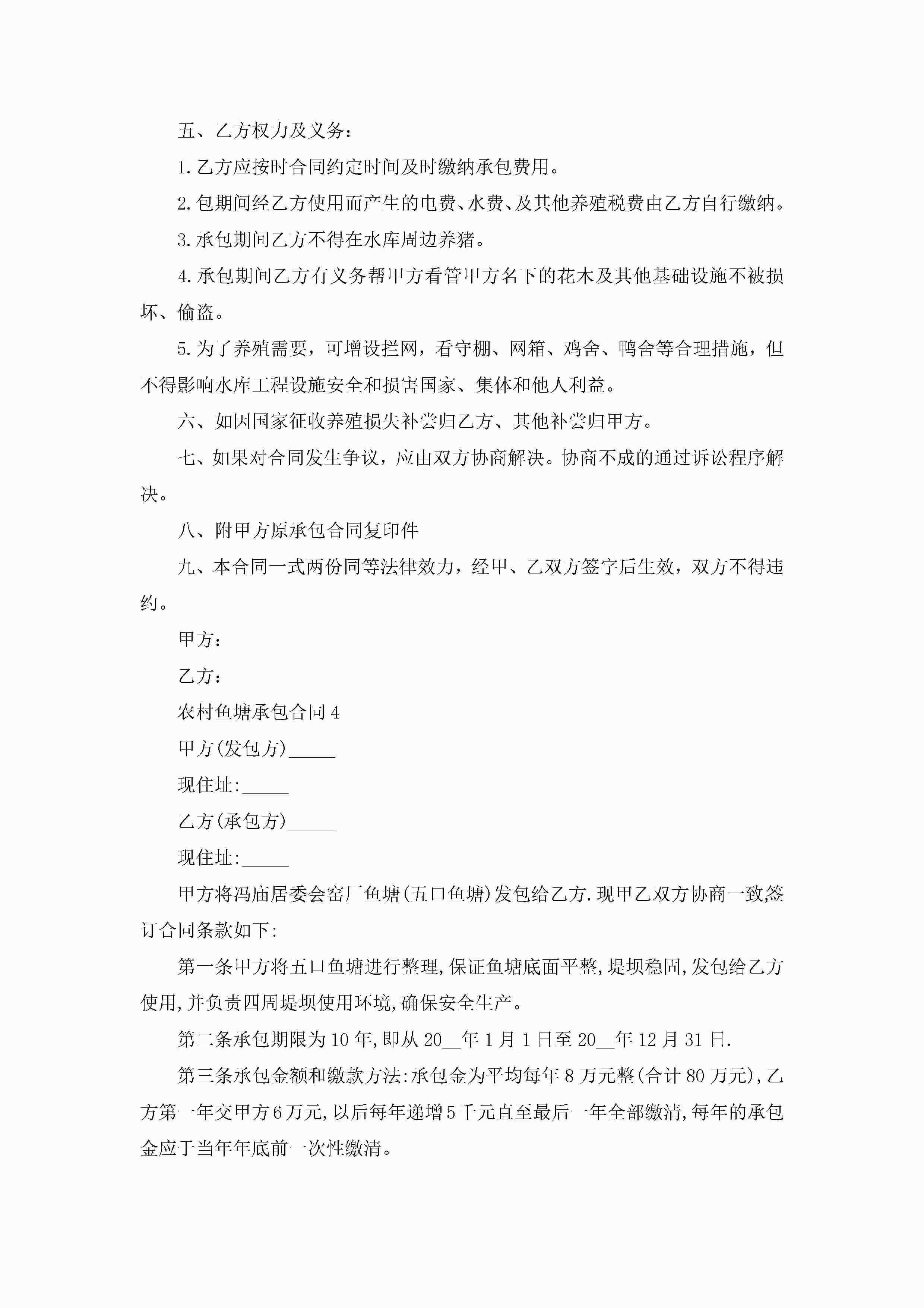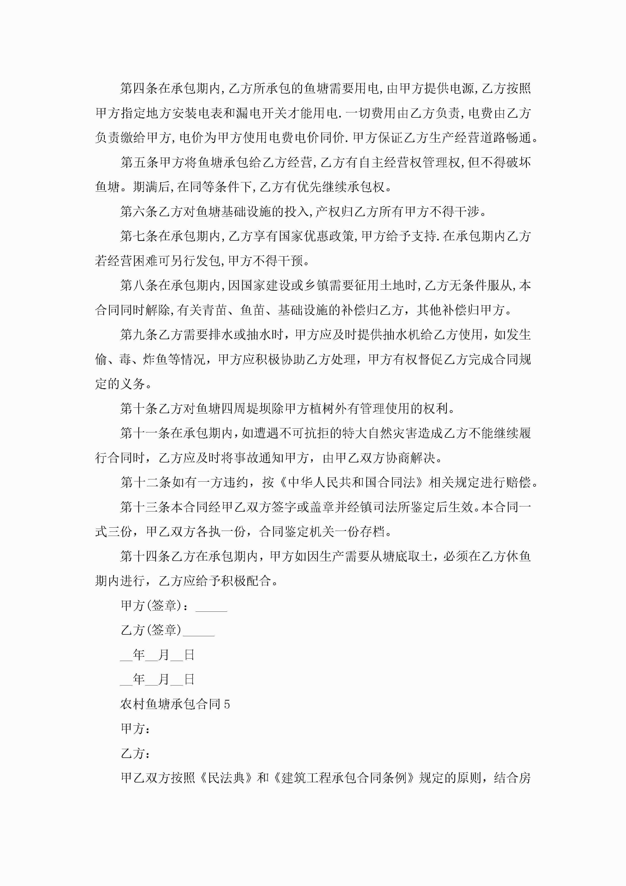 关于农村鱼塘承包合同5篇jugei3月23日 01:35发布关注184 关于农村鱼塘承包合同5篇此内容为付费资源,请付费后查看¥10.9 单篇文档限时特惠¥15个人会员开通企业会员开通立即下载无需登陆!可直接快捷下载单个模板付费资源© 版权声明THE ENDWord模板# 实用文档# 实用模板# 合同模板# 承包合同 如有问题,可点击最底部“联系我们”联系客服 分享QQ空间微博QQ好友海报分享复制链接收藏