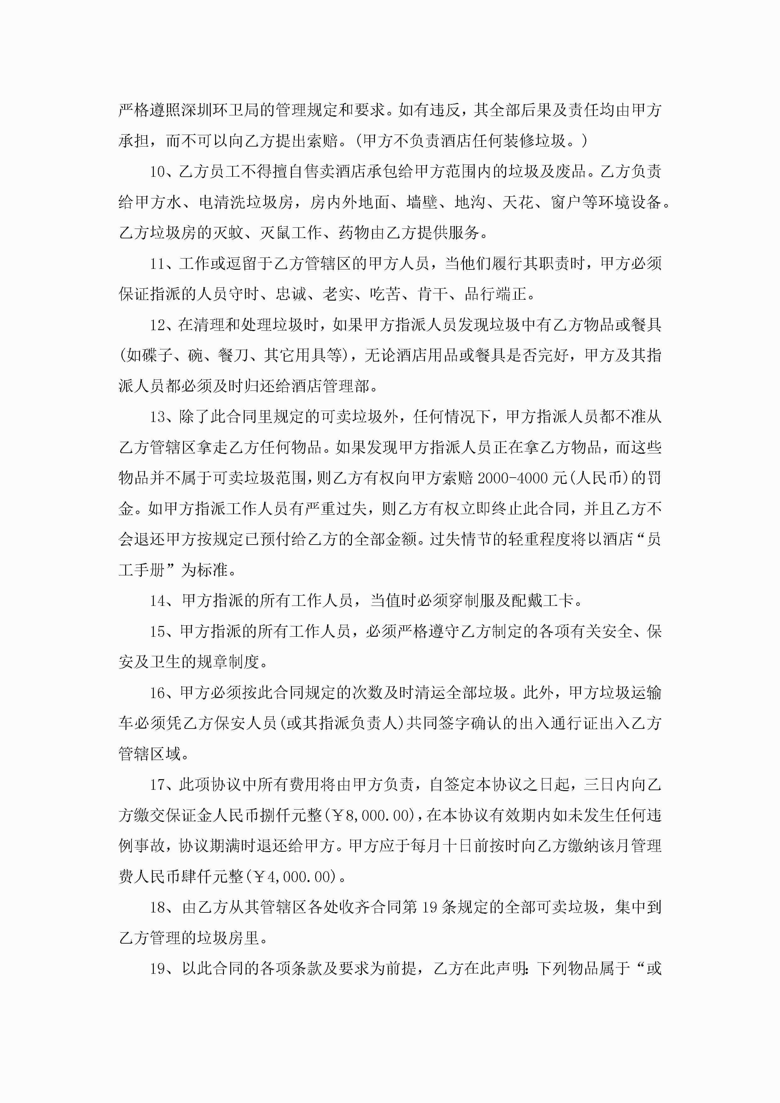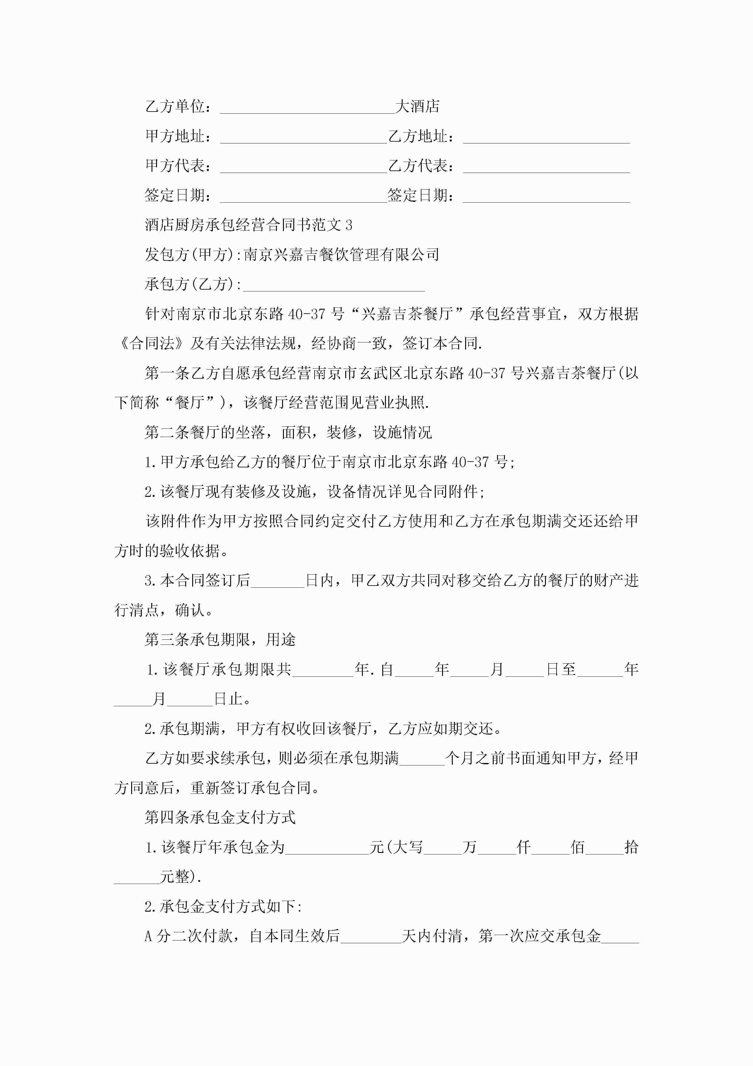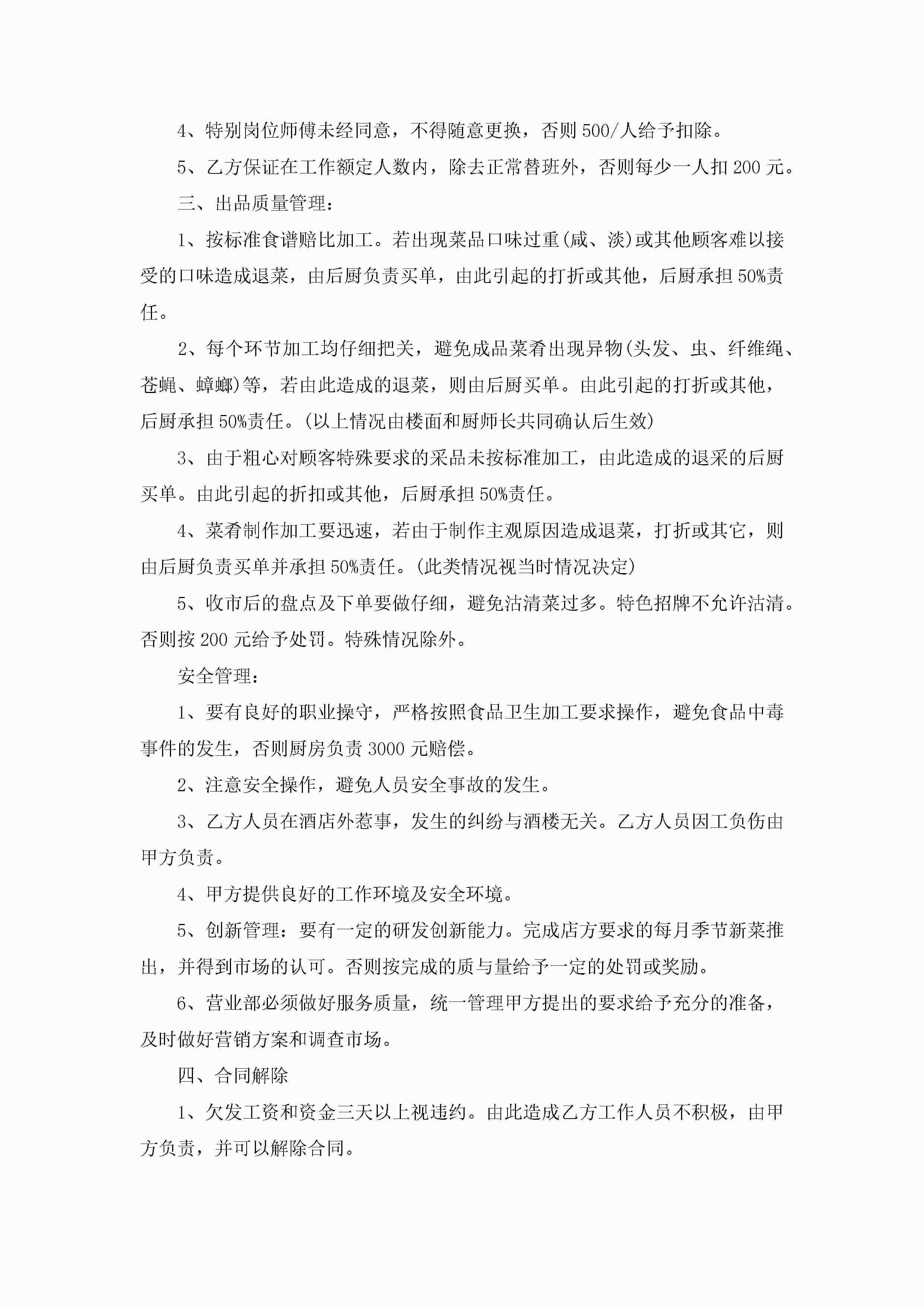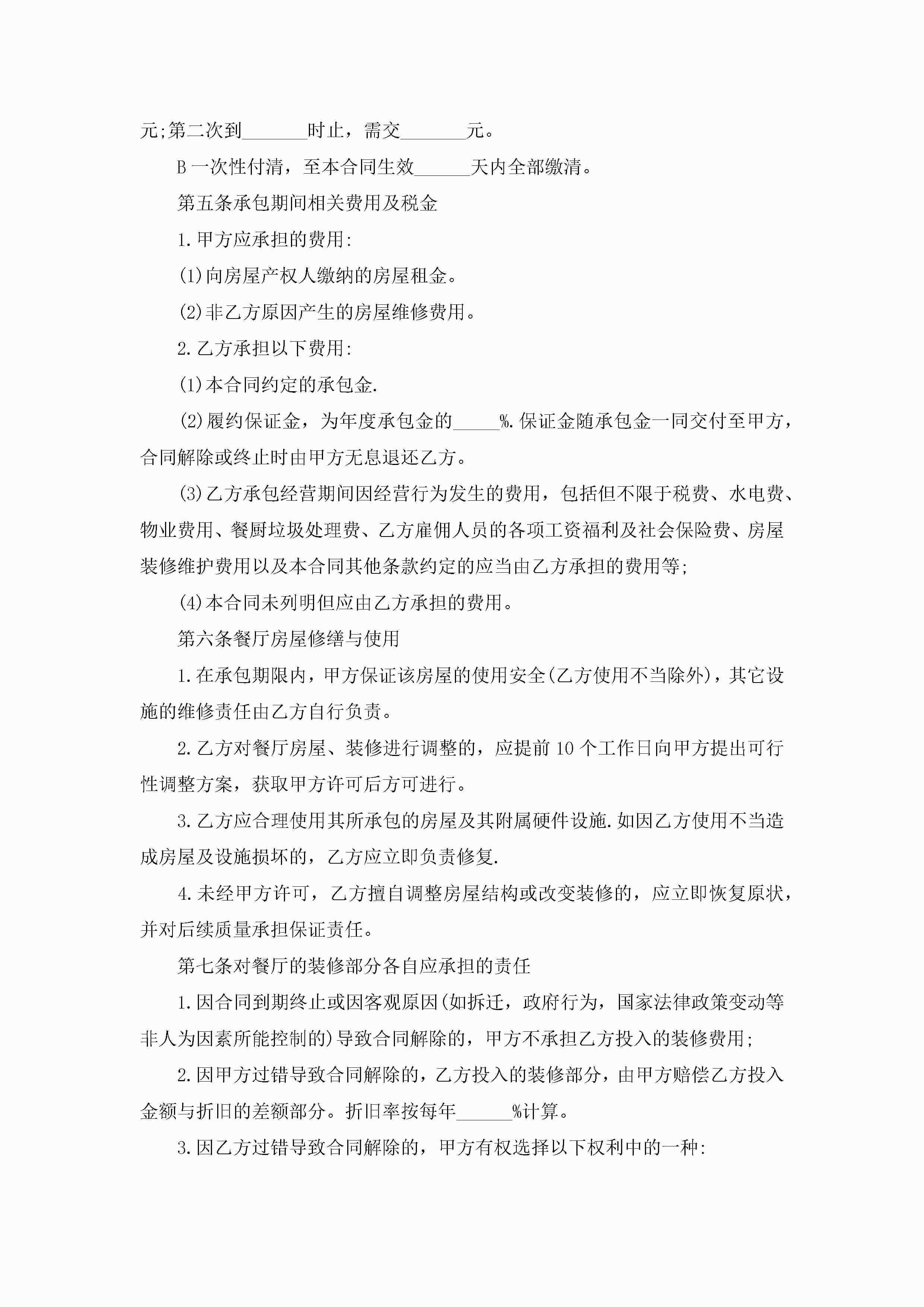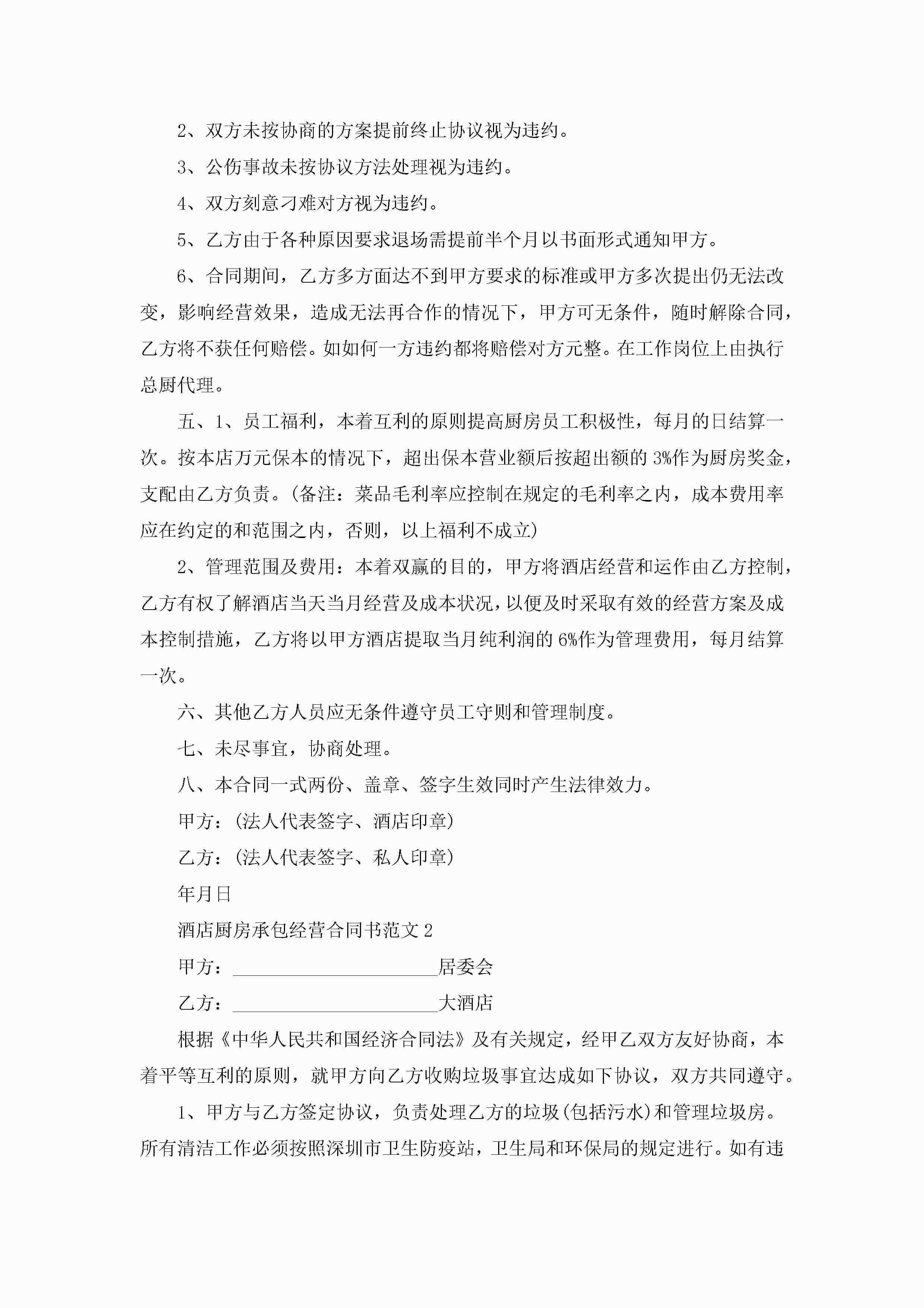 酒店厨房承包经营合同书范文5篇jugei3月23日 01:35发布关注206 酒店厨房承包经营合同书范文5篇此内容为付费资源,请付费后查看¥10.9 单篇文档限时特惠¥15个人会员开通企业会员开通立即下载无需登陆!可直接快捷下载单个模板付费资源© 版权声明THE ENDWord模板# 实用文档# 实用模板# 合同模板# 承包合同 如有问题,可点击最底部“联系我们”联系客服 分享QQ空间微博QQ好友海报分享复制链接收藏