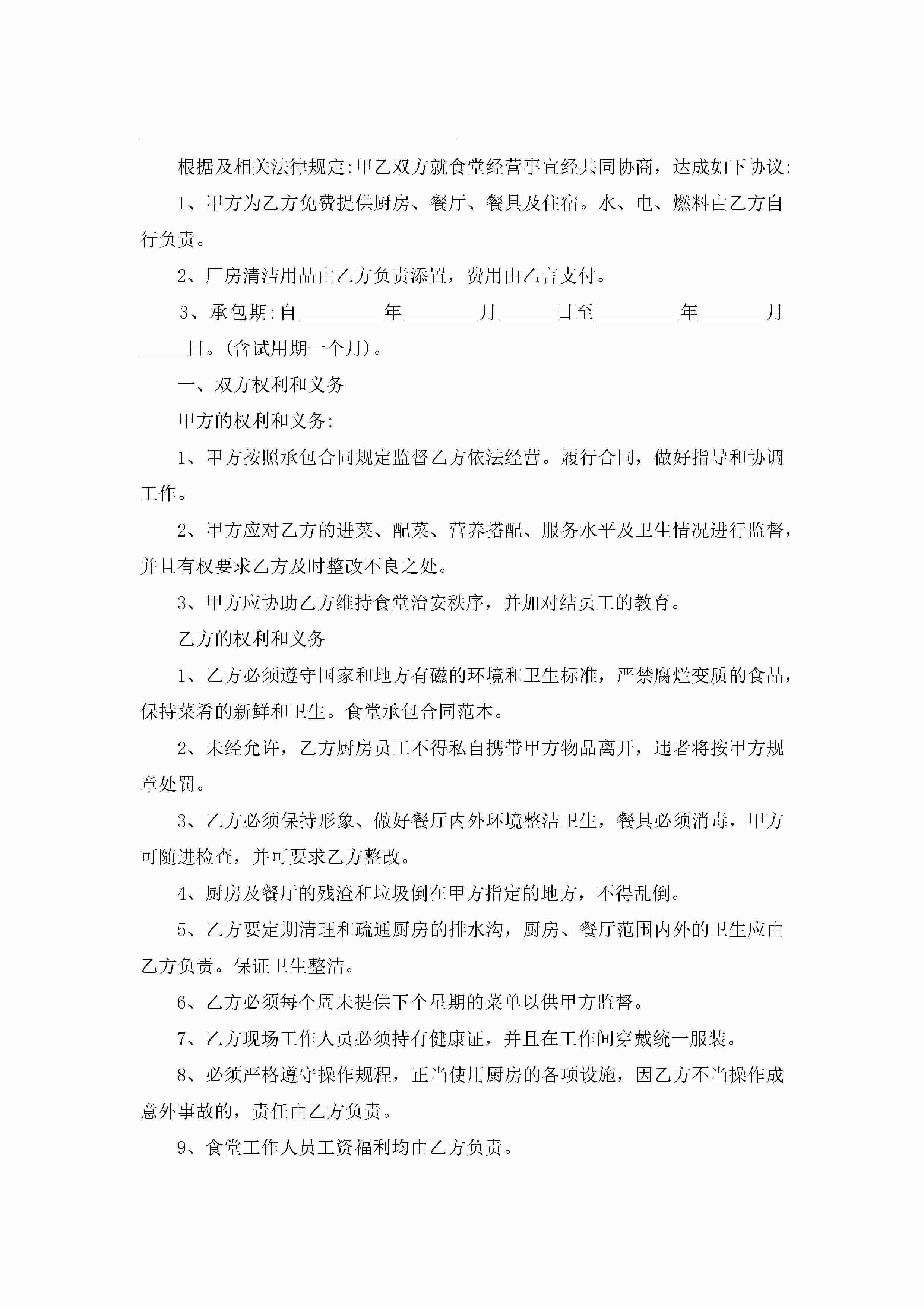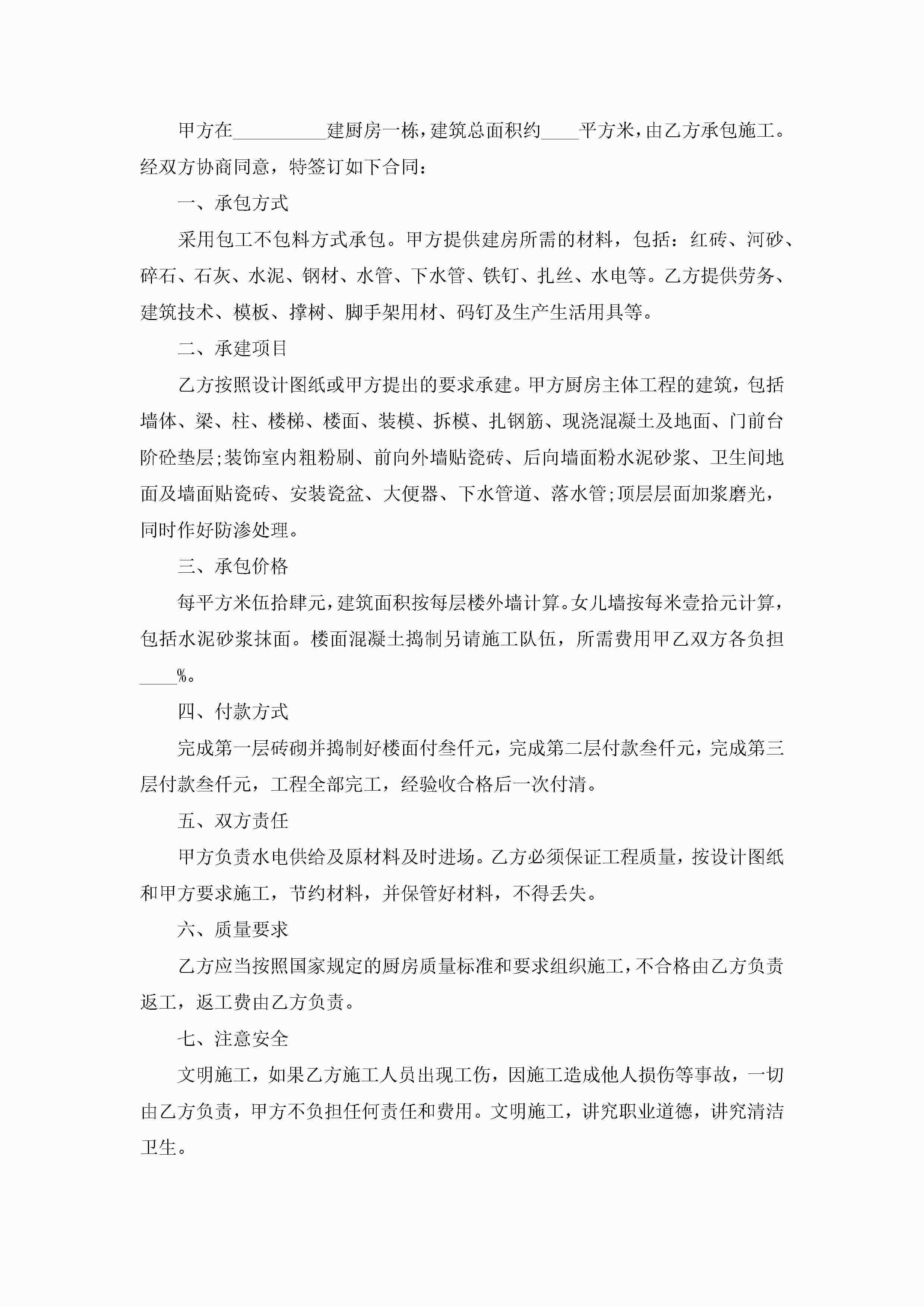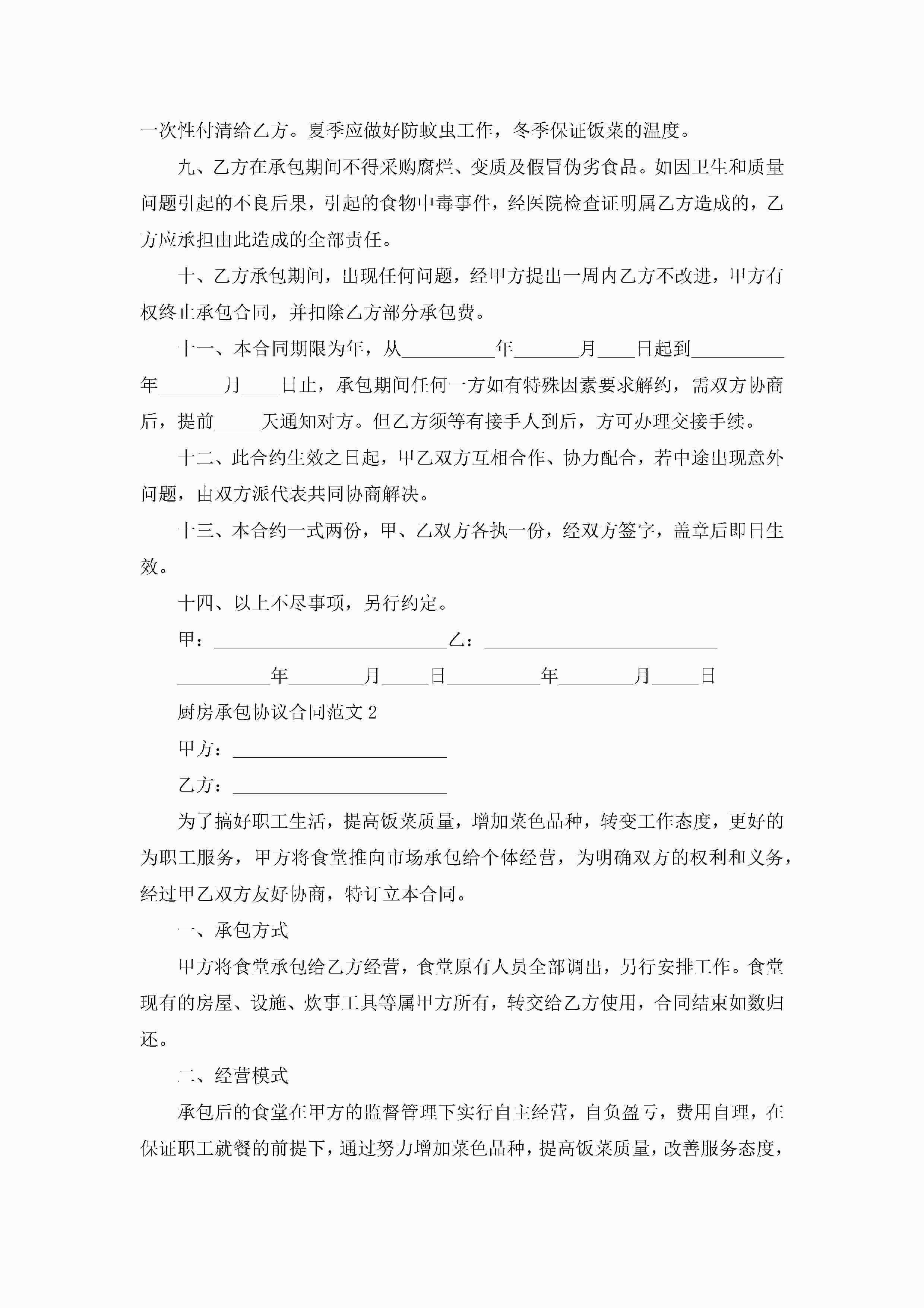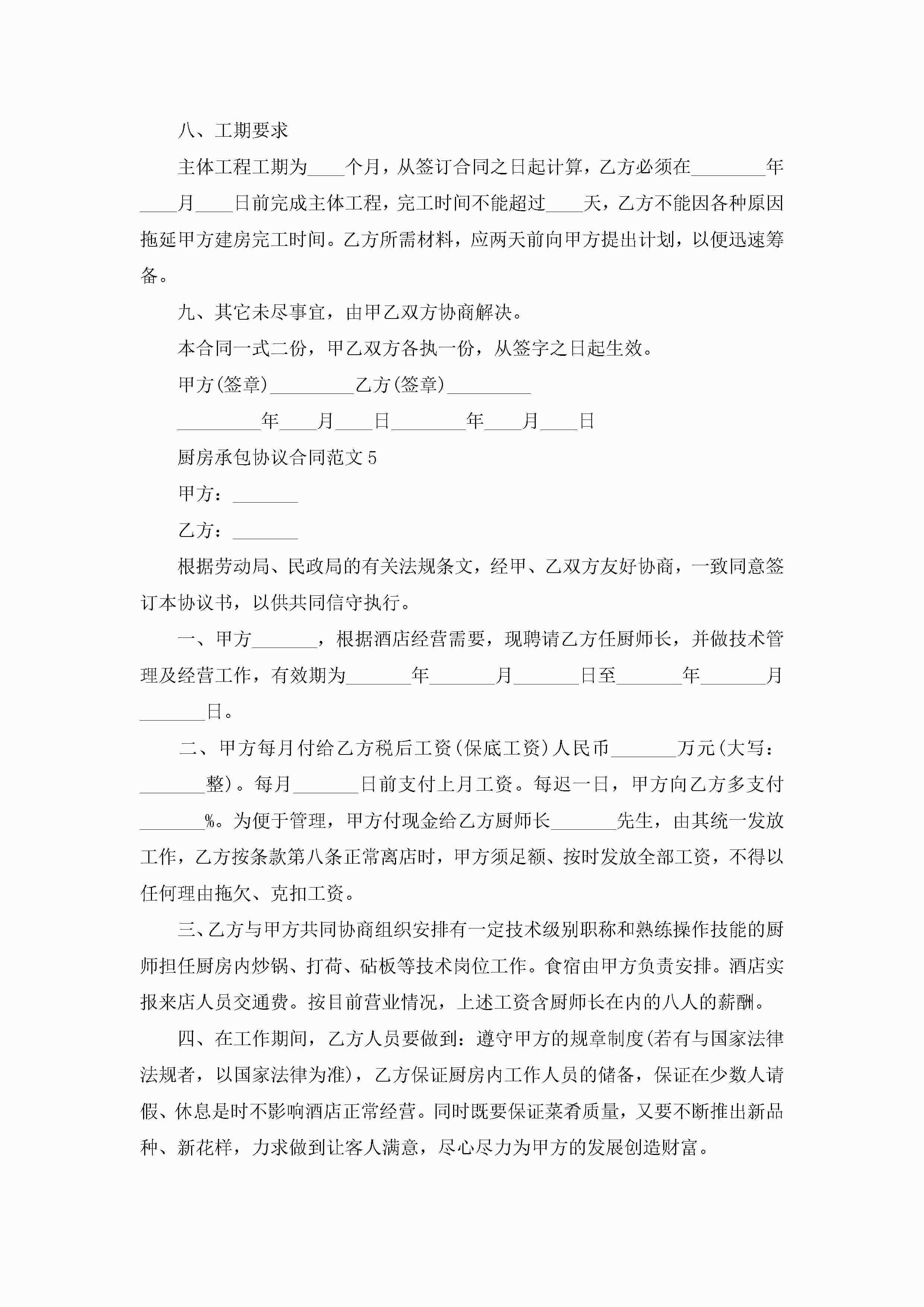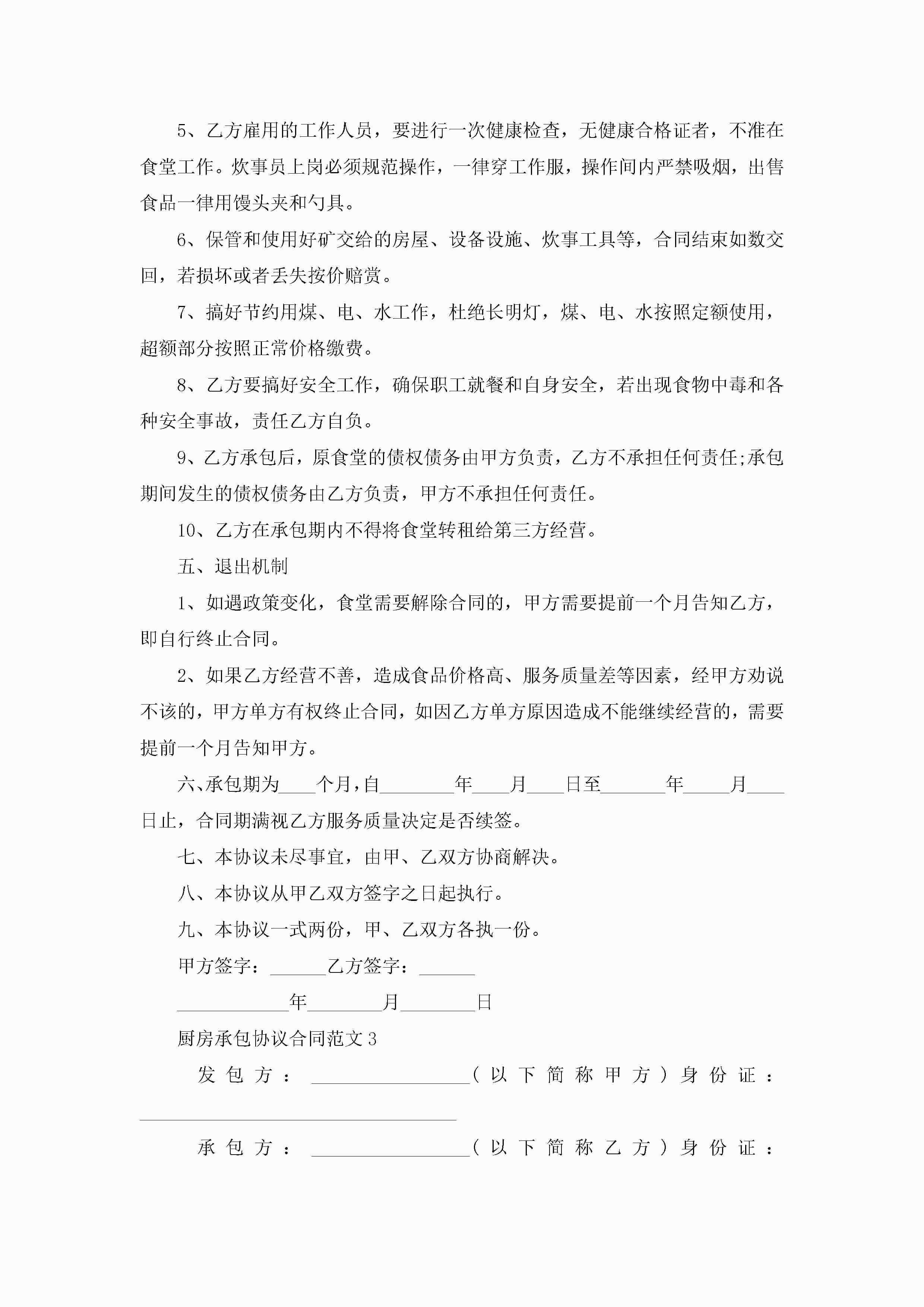 厨房承包协议合同范文5篇jugei3月23日 01:35发布关注418 厨房承包协议合同范文5篇此内容为付费资源,请付费后查看¥10.9 单篇文档限时特惠¥15个人会员开通企业会员开通立即下载无需登陆!可直接快捷下载单个模板付费资源© 版权声明THE ENDWord模板# 实用文档# 实用模板# 合同模板# 承包合同 如有问题,可点击最底部“联系我们”联系客服 分享QQ空间微博QQ好友海报分享复制链接收藏