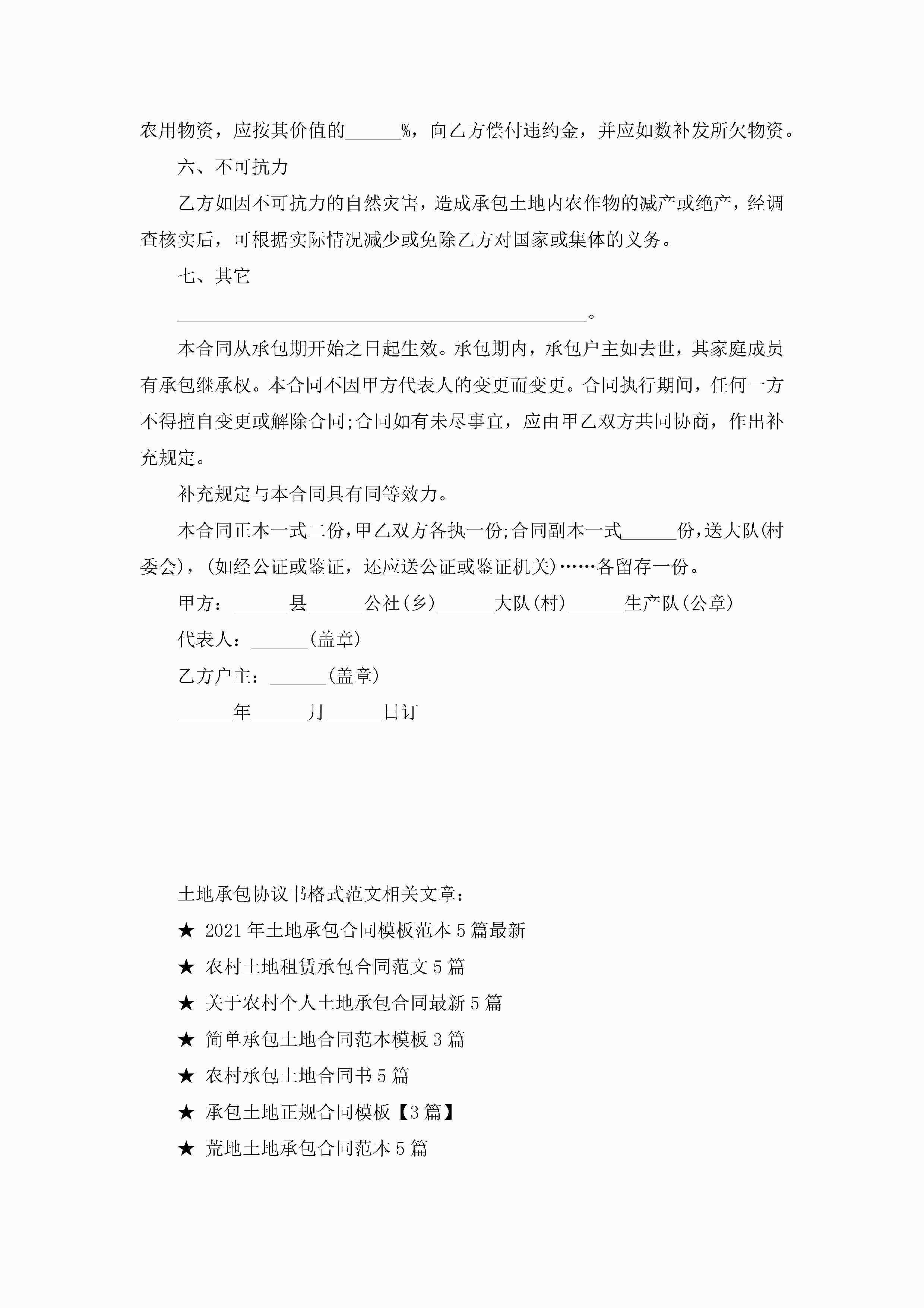 土地承包协议书格式最新范文jugei3月23日 01:35发布关注186 土地承包协议书格式最新范文此内容为付费资源,请付费后查看¥10.9 单篇文档限时特惠¥15个人会员开通企业会员开通立即下载无需登陆!可直接快捷下载单个模板付费资源© 版权声明THE ENDWord模板# 实用文档# 实用模板# 合同模板# 承包合同 如有问题,可点击最底部“联系我们”联系客服 分享QQ空间微博QQ好友海报分享复制链接收藏