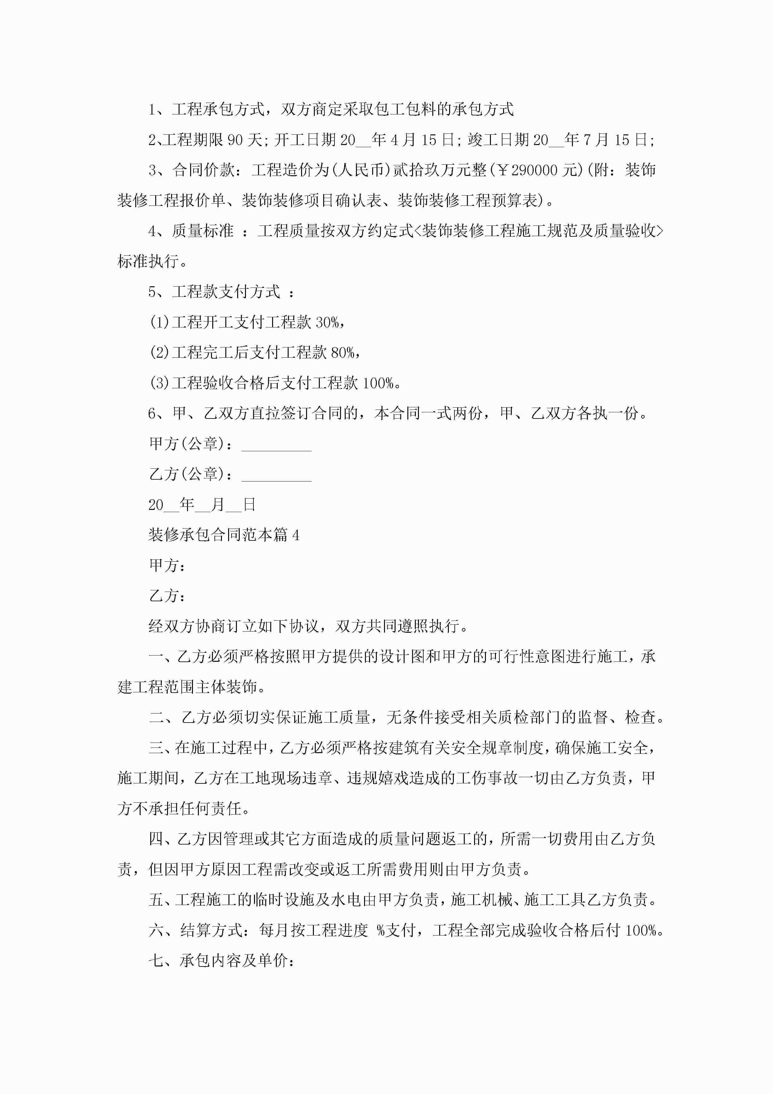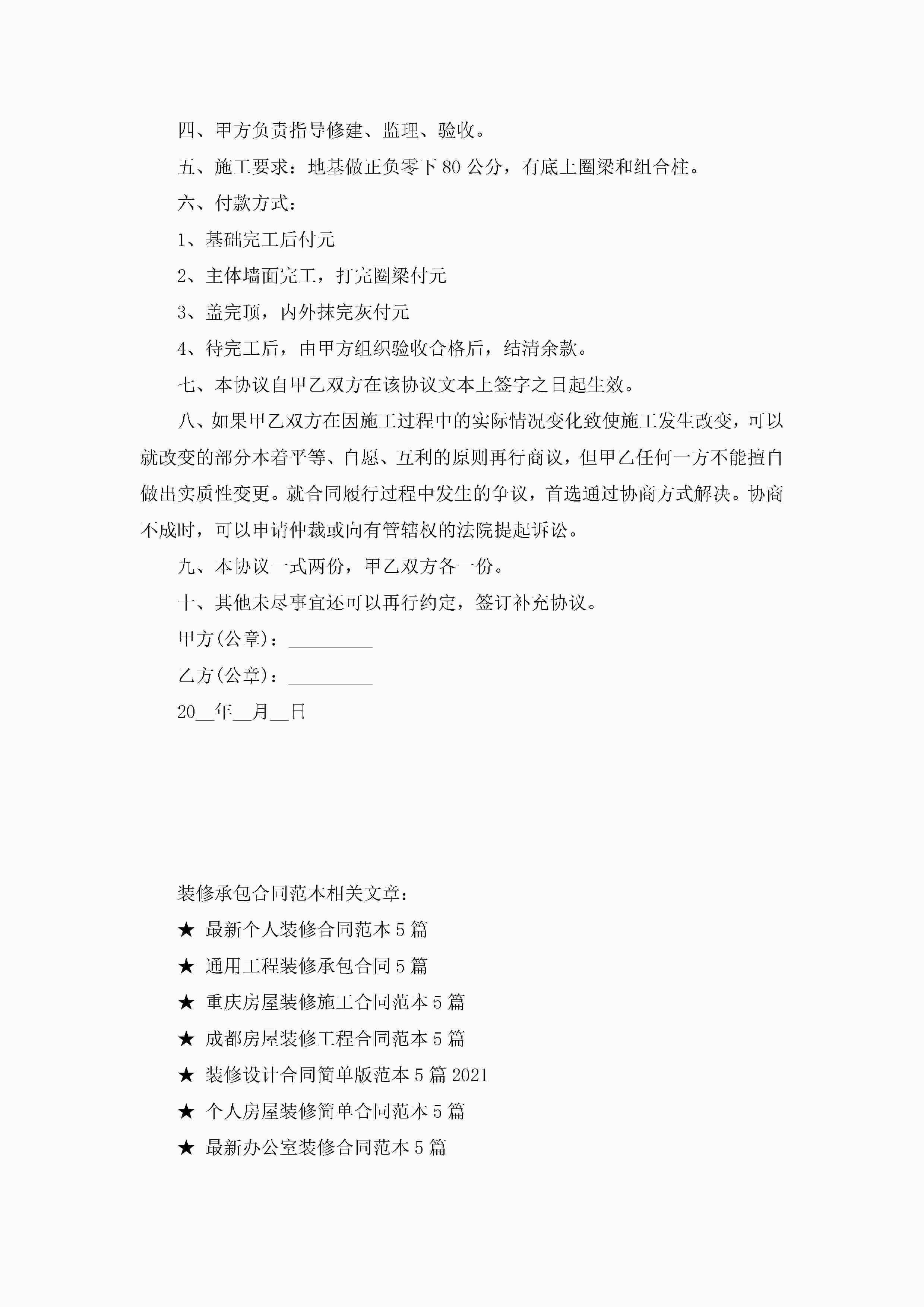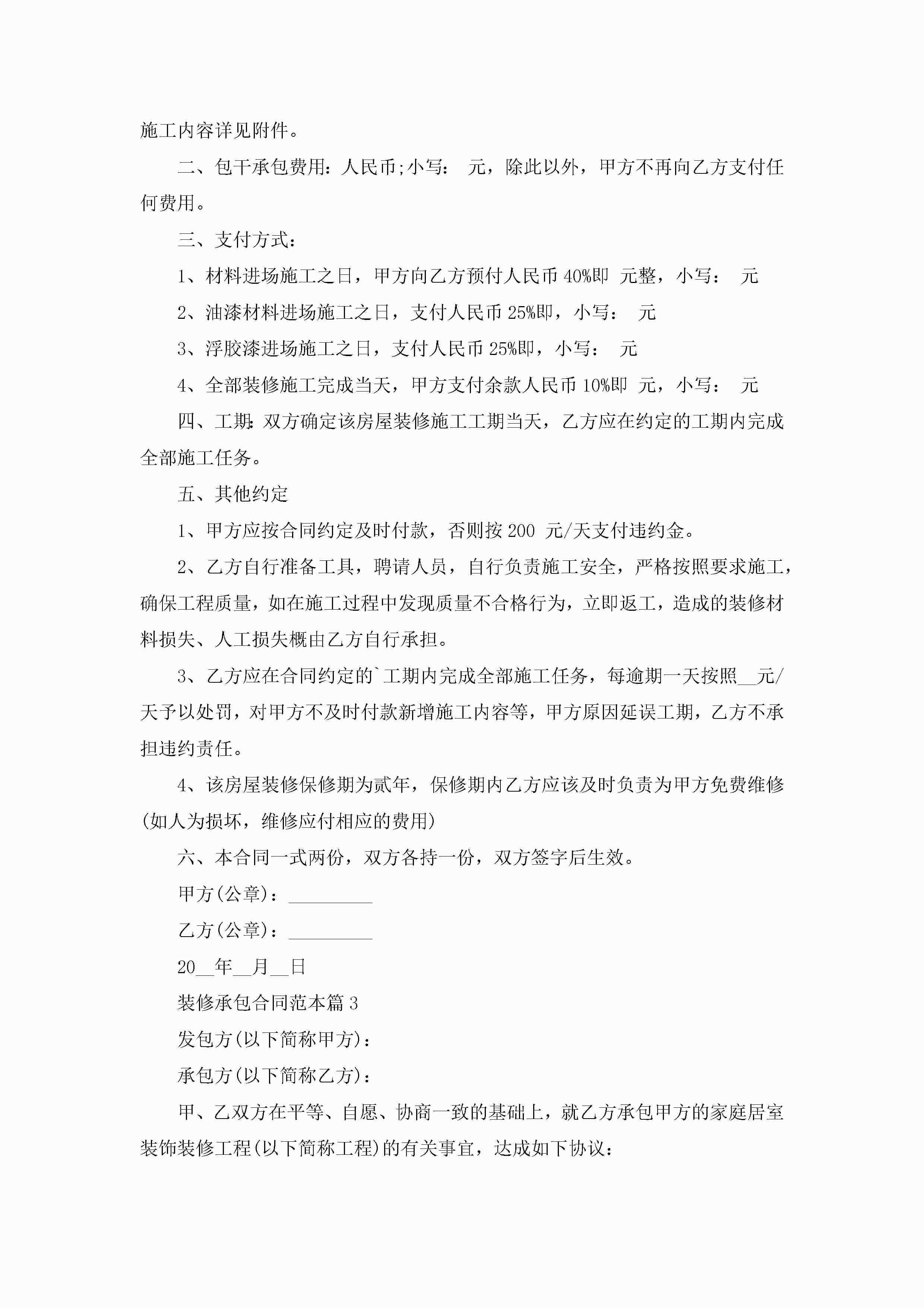装修承包合同最新范本jugei3月23日 01:35发布关注255 装修承包合同最新范本此内容为付费资源,请付费后查看¥10.9 单篇文档限时特惠¥15个人会员开通企业会员开通立即下载无需登陆!可直接快捷下载单个模板付费资源© 版权声明THE ENDWord模板# 实用文档# 实用模板# 合同模板# 承包合同 如有问题,可点击最底部“联系我们”联系客服 分享QQ空间微博QQ好友海报分享复制链接收藏
