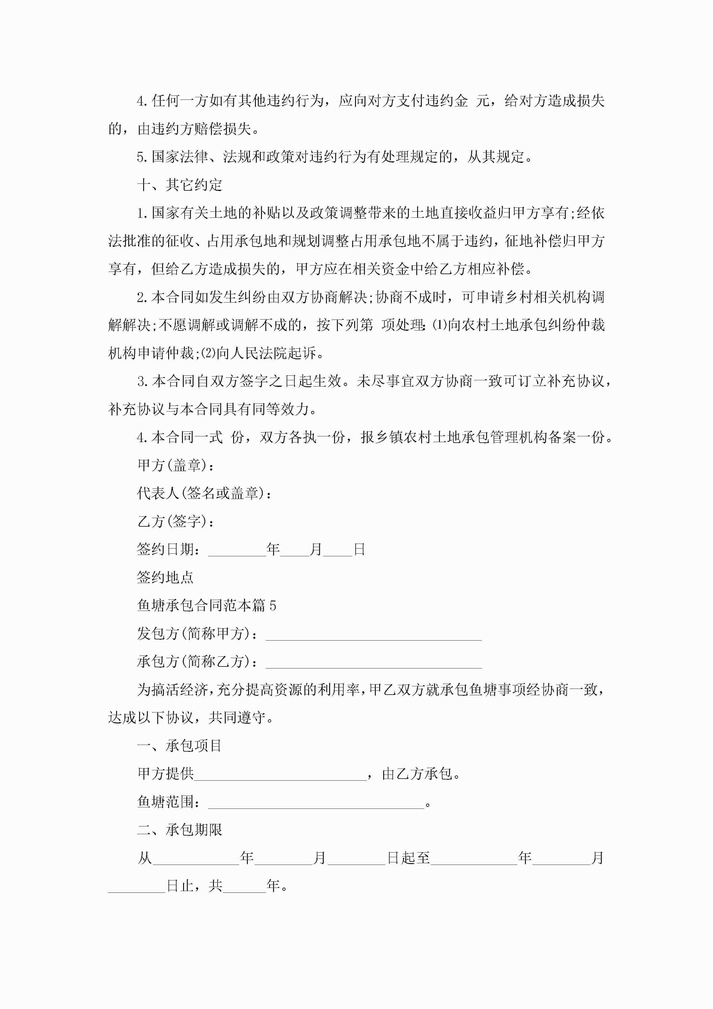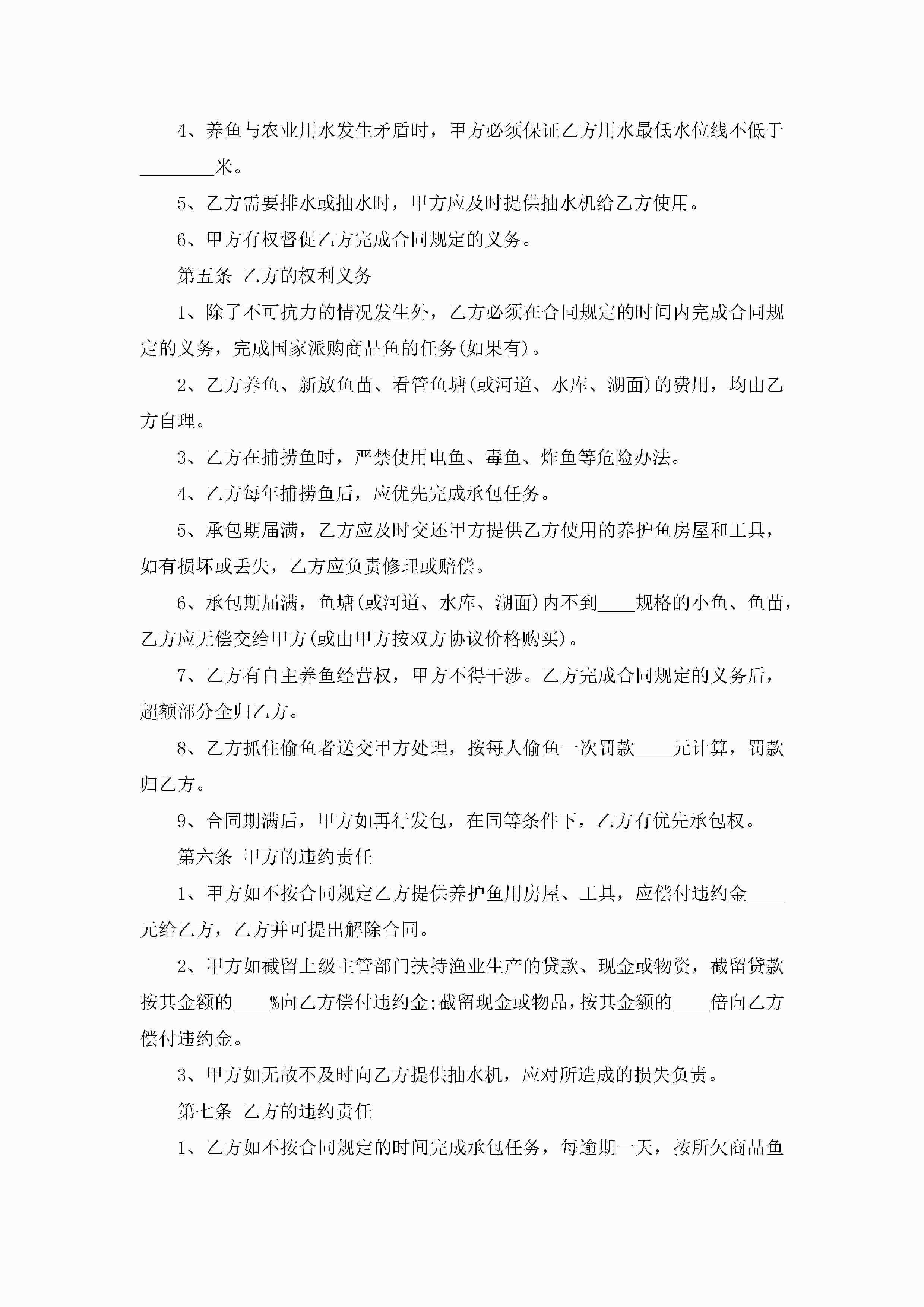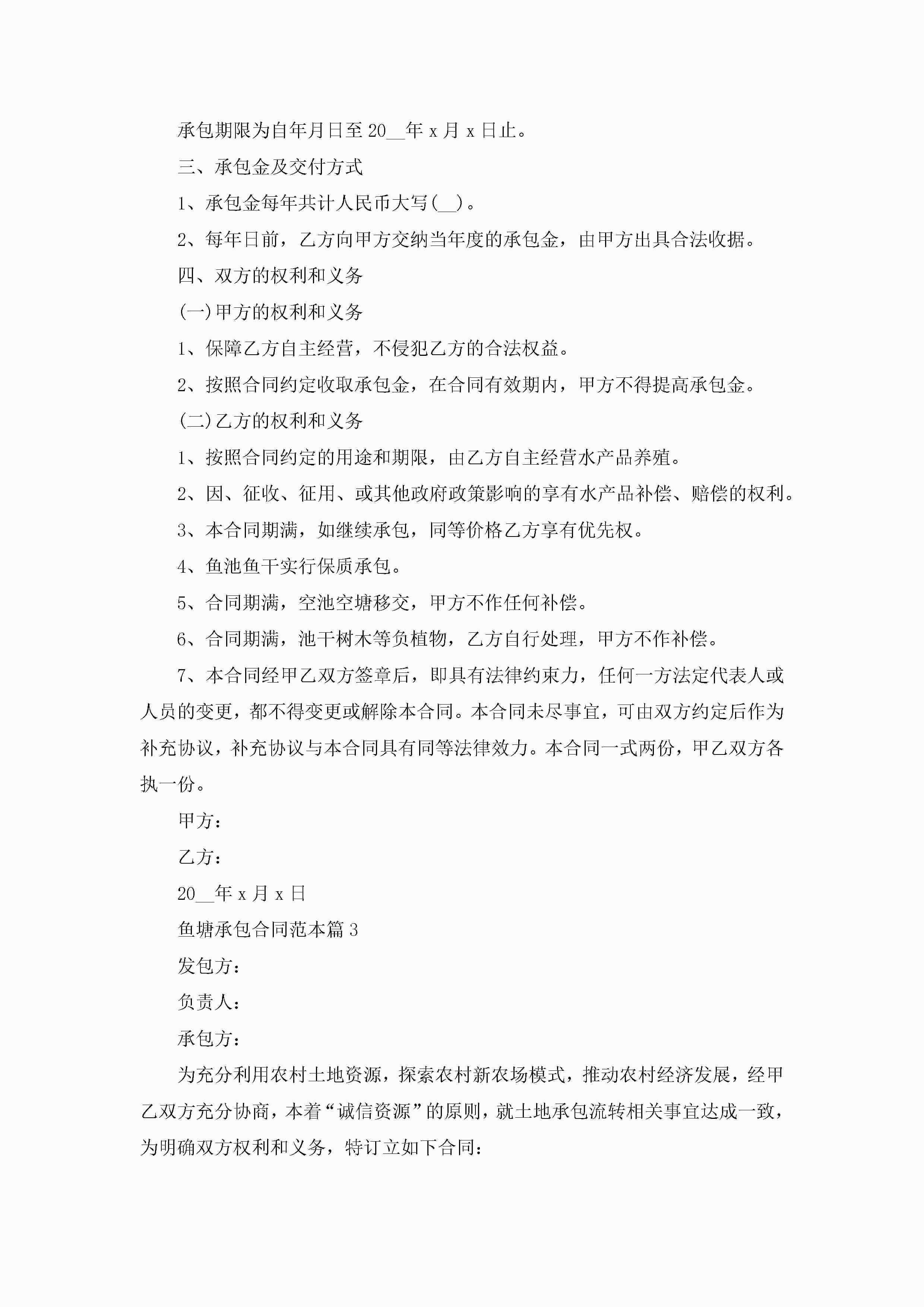 鱼塘承包合同最新范本jugei3月23日 01:35发布关注241 鱼塘承包合同最新范本此内容为付费资源,请付费后查看¥10.9 单篇文档限时特惠¥15个人会员开通企业会员开通立即下载无需登陆!可直接快捷下载单个模板付费资源© 版权声明THE ENDWord模板# 实用文档# 实用模板# 合同模板# 承包合同 如有问题,可点击最底部“联系我们”联系客服 分享QQ空间微博QQ好友海报分享复制链接收藏