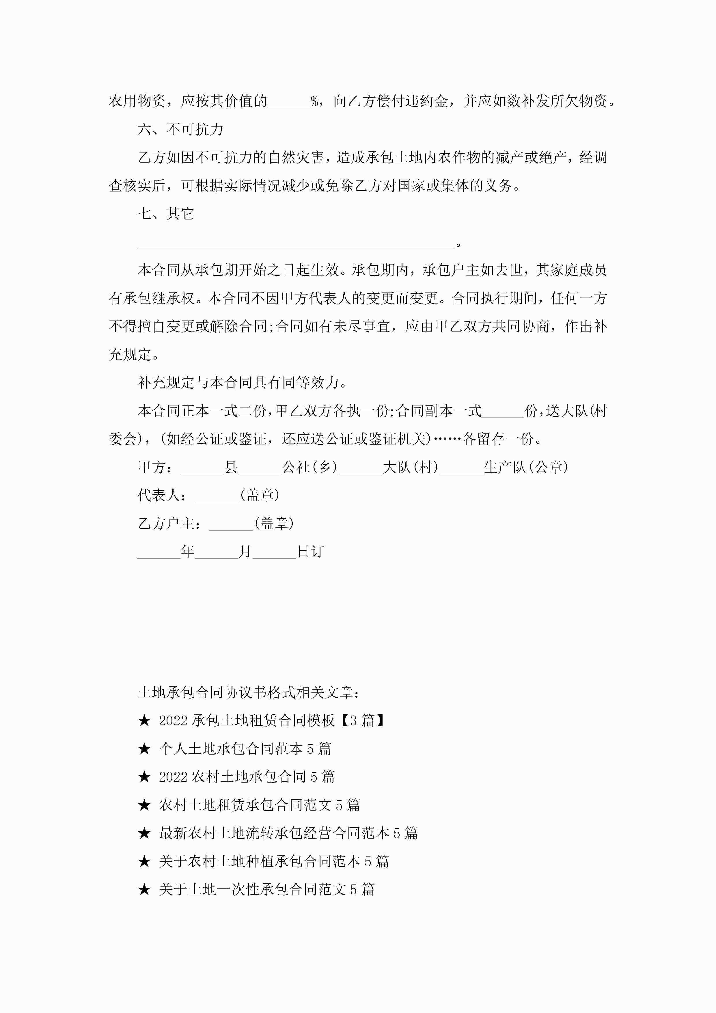 土地承包合同协议书最新格式jugei3月23日 01:35发布关注199 土地承包合同协议书最新格式此内容为付费资源,请付费后查看¥10.9 单篇文档限时特惠¥15个人会员开通企业会员开通立即下载无需登陆!可直接快捷下载单个模板付费资源© 版权声明THE ENDWord模板# 实用文档# 实用模板# 合同模板# 承包合同 如有问题,可点击最底部“联系我们”联系客服 分享QQ空间微博QQ好友海报分享复制链接收藏