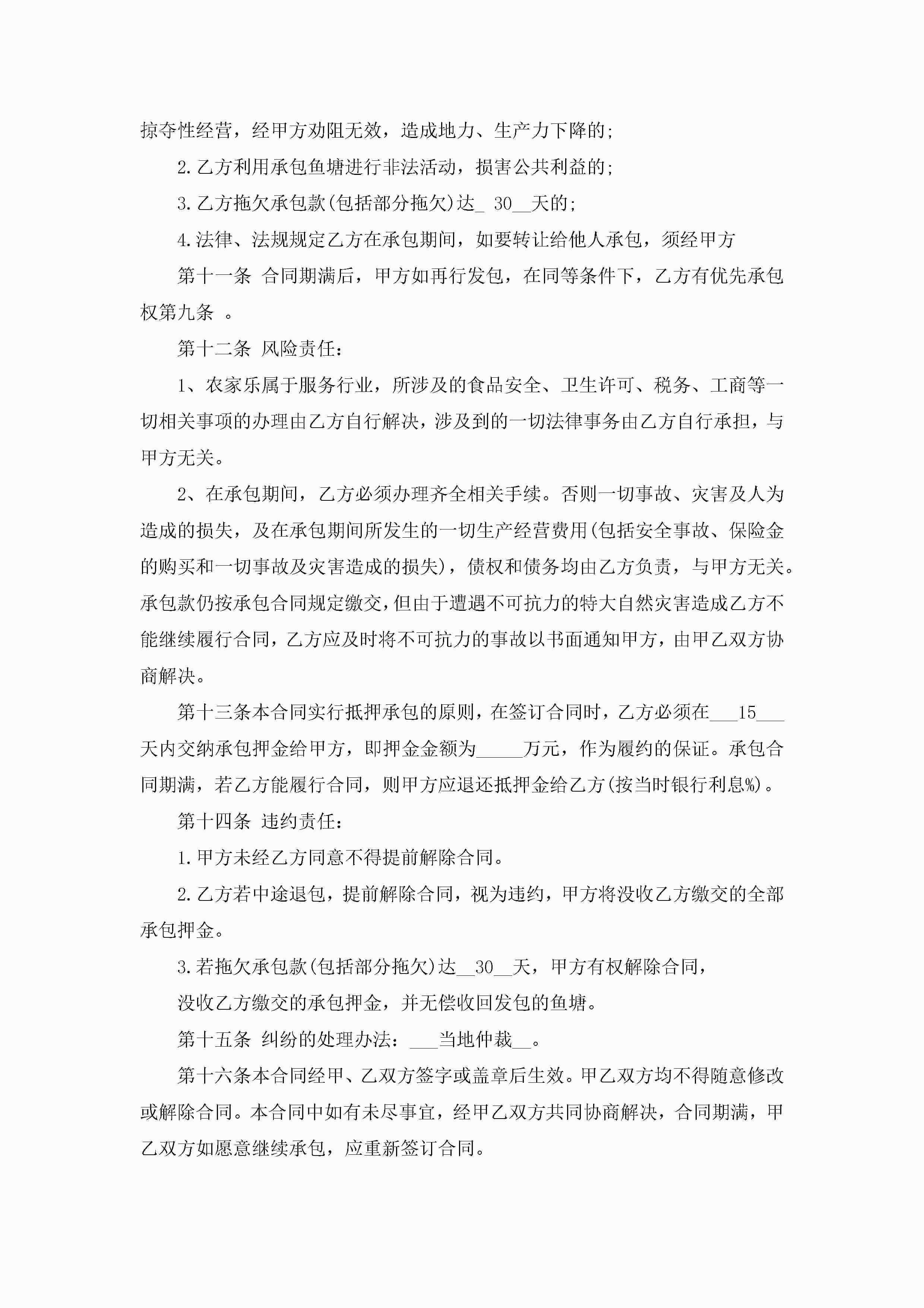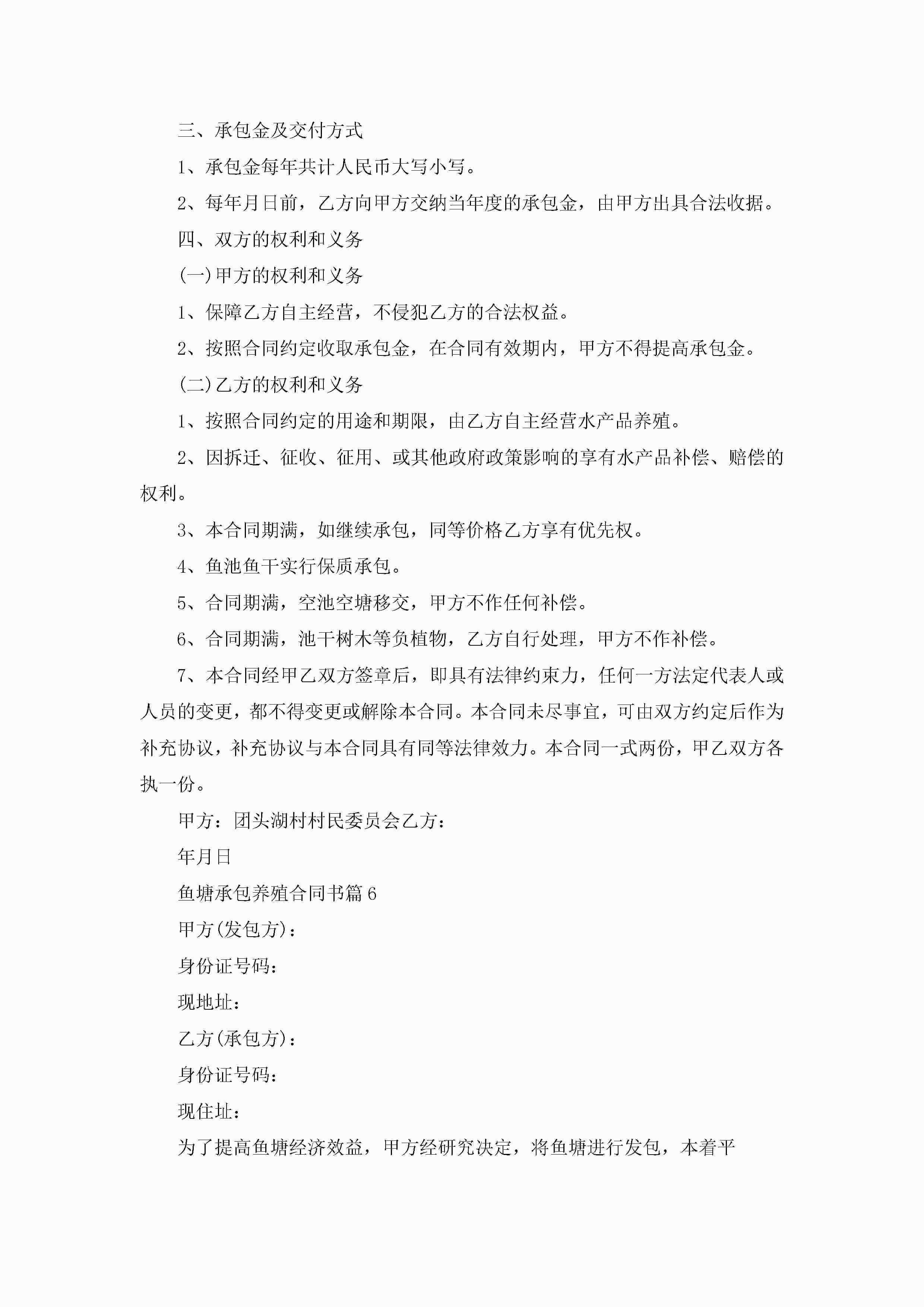 鱼塘承包养殖合同书(7篇)jugei3月23日 01:36发布关注204 鱼塘承包养殖合同书(7篇)此内容为付费资源,请付费后查看¥10.9 单篇文档限时特惠¥15个人会员开通企业会员开通立即下载无需登陆!可直接快捷下载单个模板付费资源© 版权声明THE ENDWord模板# 实用文档# 实用模板# 合同模板# 承包合同 如有问题,可点击最底部“联系我们”联系客服 分享QQ空间微博QQ好友海报分享复制链接收藏