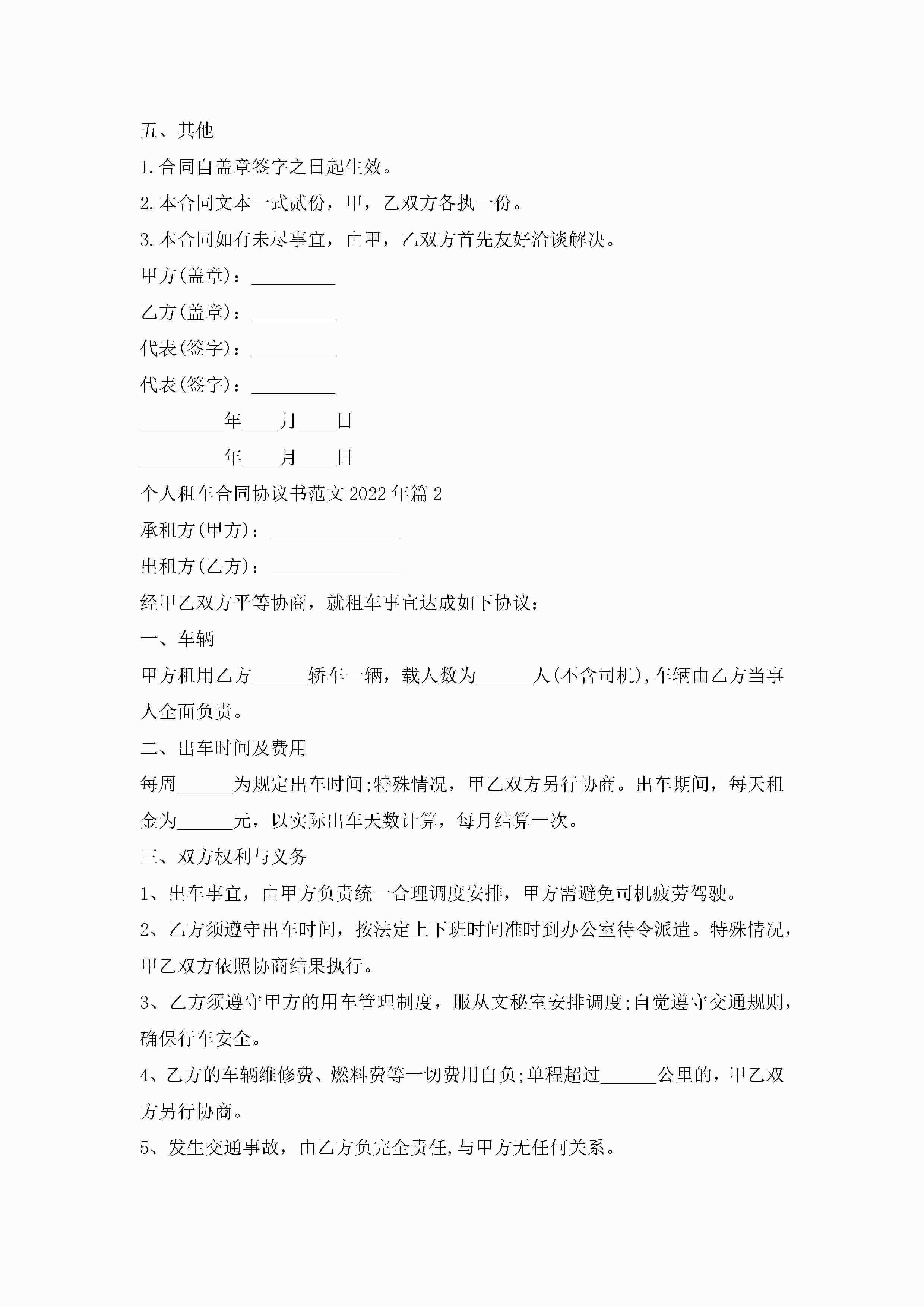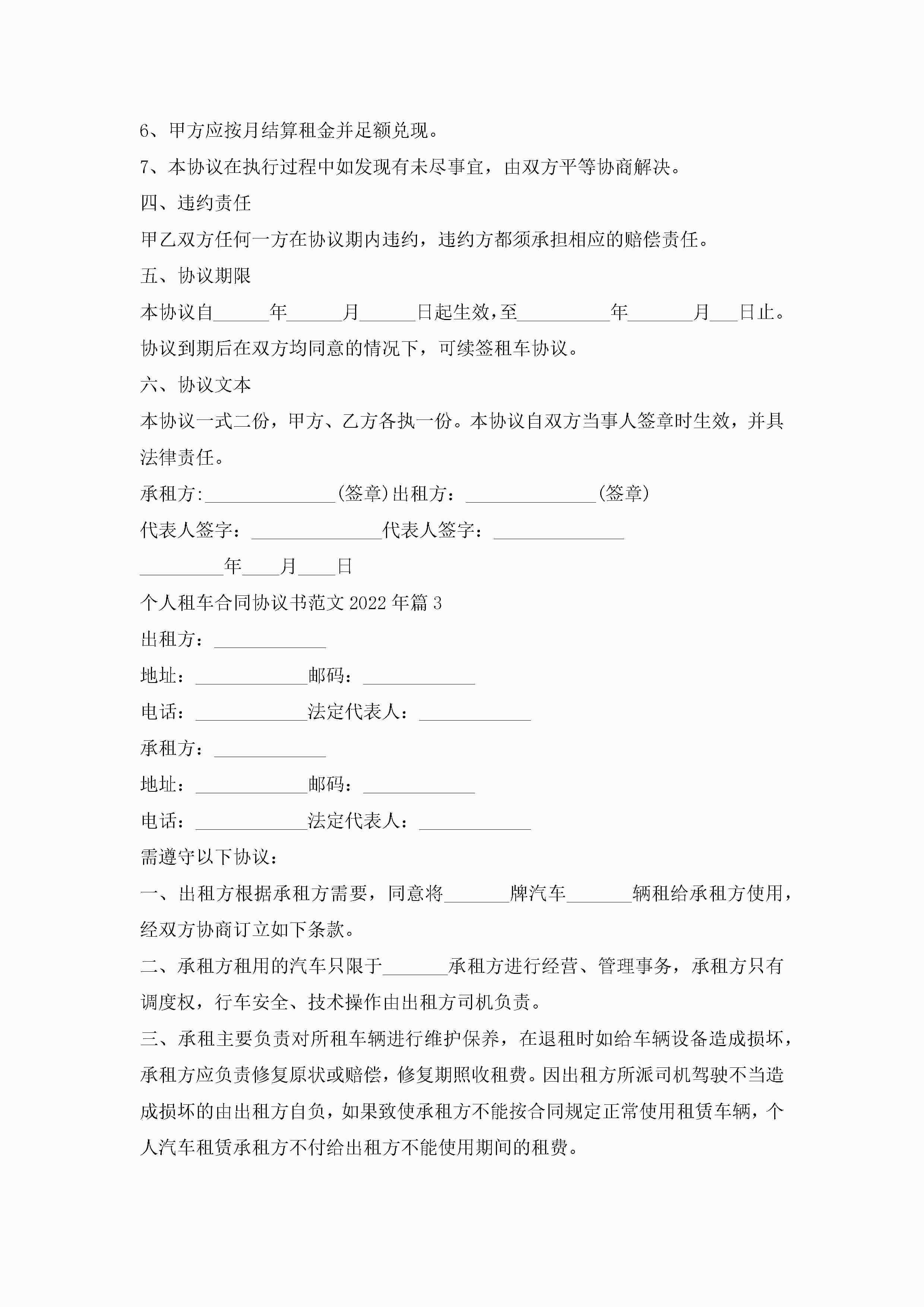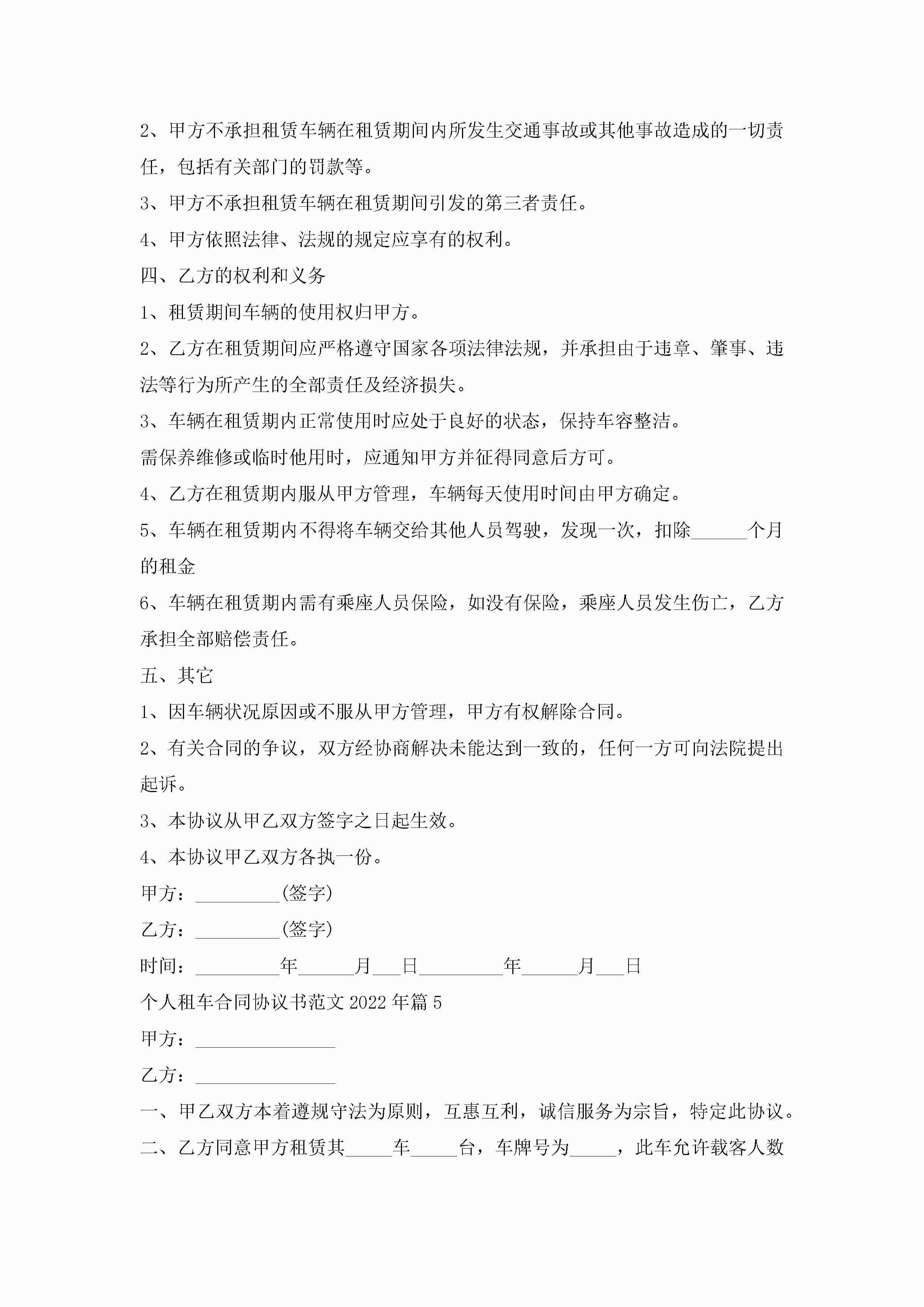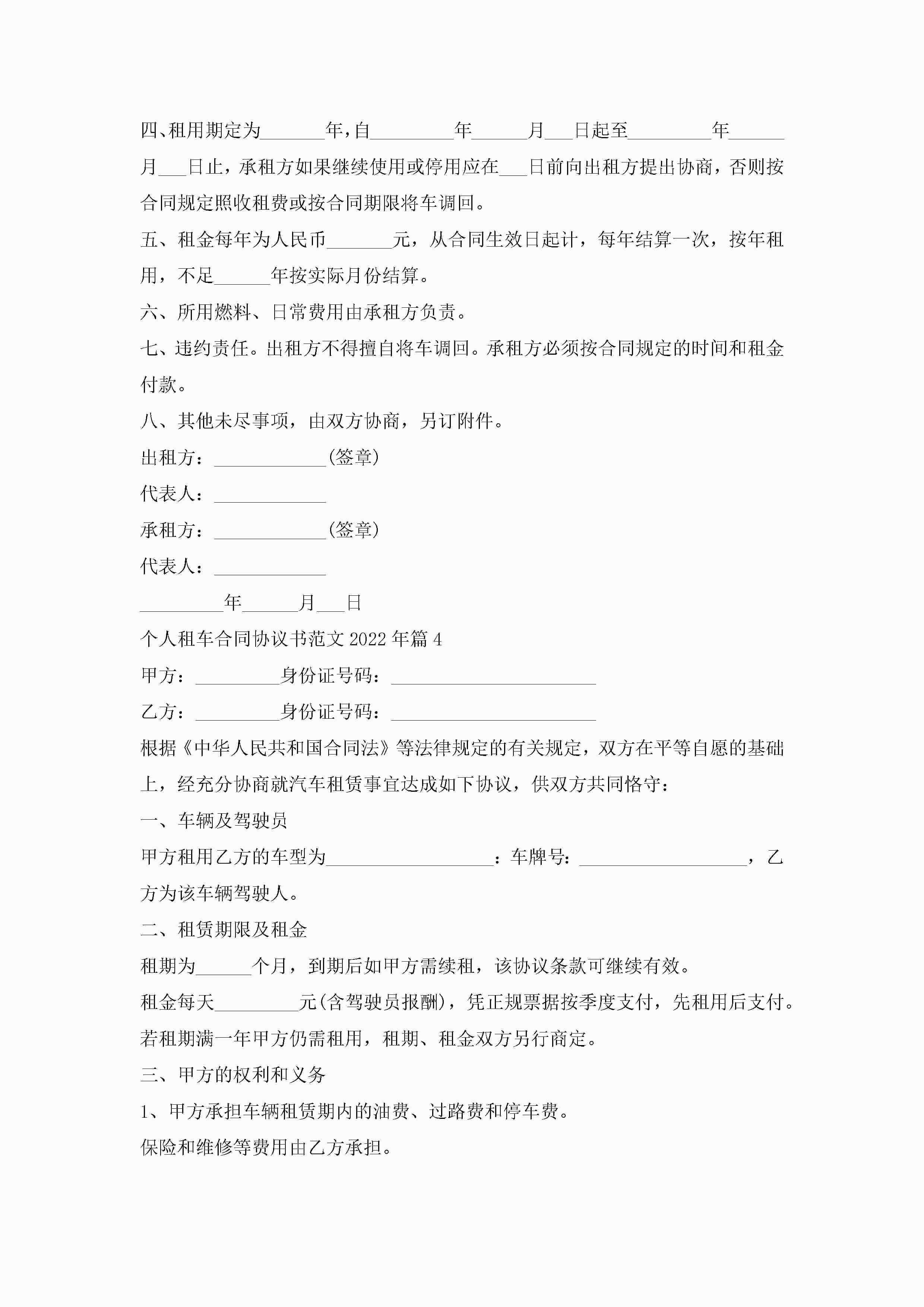 个人租车合同协议书最新范文2022年jugei3月23日 01:36发布关注188 个人租车合同协议书最新范文2022年此内容为付费资源,请付费后查看¥10.9 单篇文档限时特惠¥15个人会员开通企业会员开通立即下载无需登陆!可直接快捷下载单个模板付费资源© 版权声明THE ENDWord模板# 实用文档# 实用模板# 合同模板# 合同范本 如有问题,可点击最底部“联系我们”联系客服 分享QQ空间微博QQ好友海报分享复制链接收藏