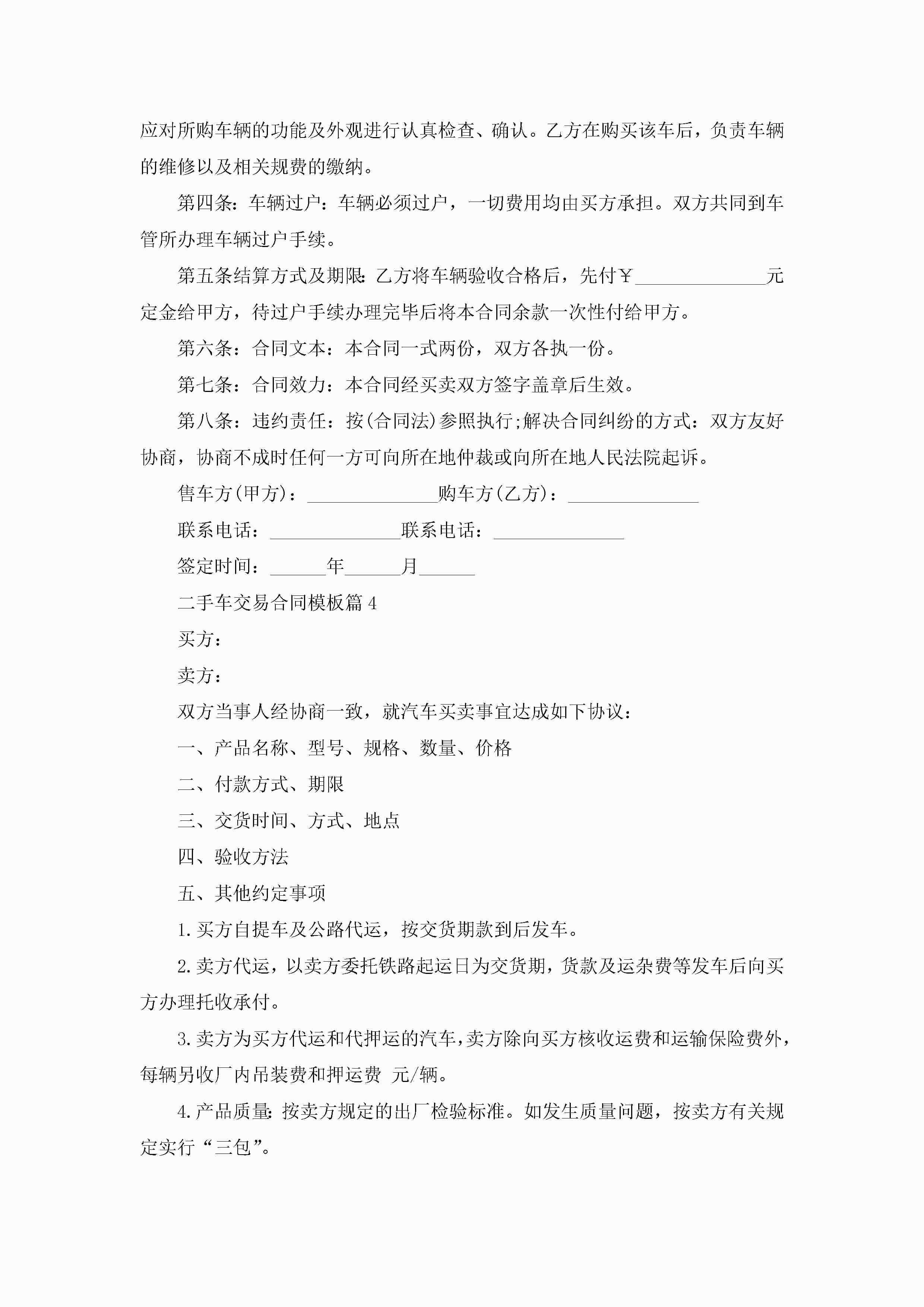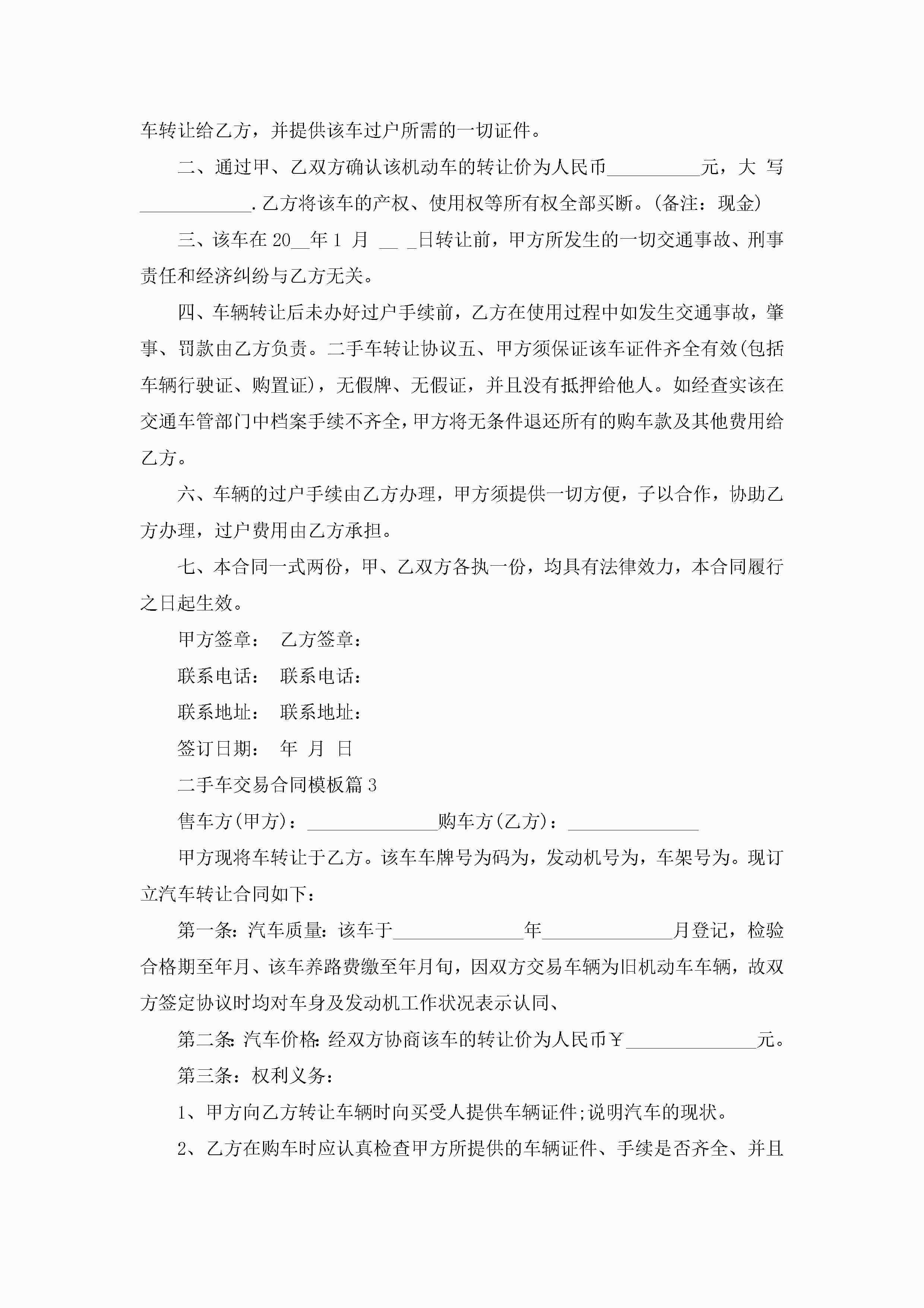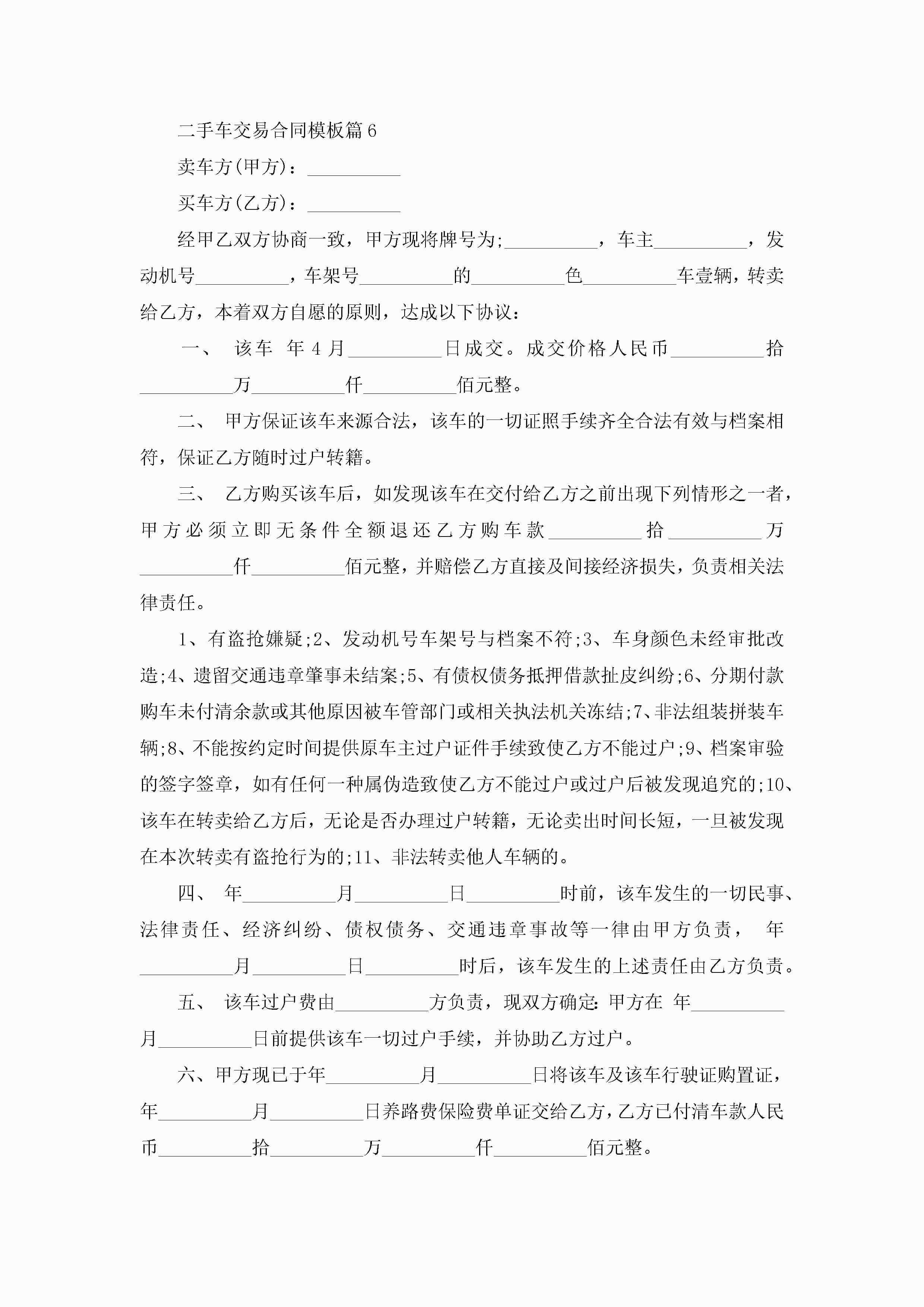 二手车交易合同最新模板jugei3月23日 01:36发布关注189 二手车交易合同最新模板此内容为付费资源,请付费后查看¥10.9 单篇文档限时特惠¥15个人会员开通企业会员开通立即下载无需登陆!可直接快捷下载单个模板付费资源© 版权声明THE ENDWord模板# 实用文档# 实用模板# 合同模板# 合同范本 如有问题,可点击最底部“联系我们”联系客服 分享QQ空间微博QQ好友海报分享复制链接收藏