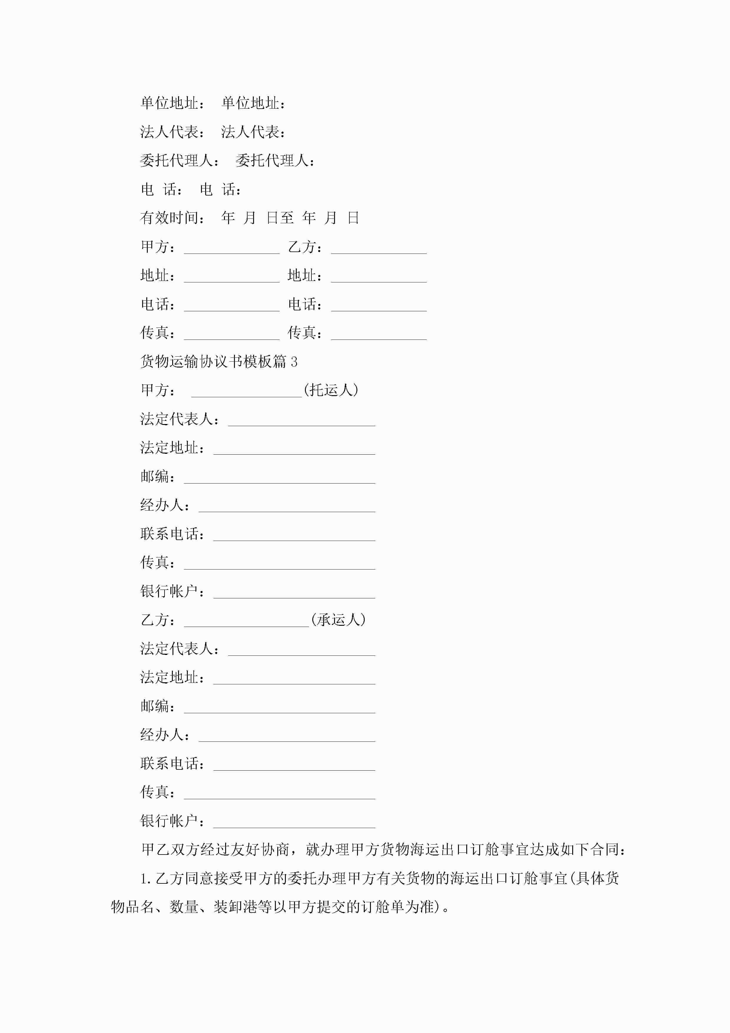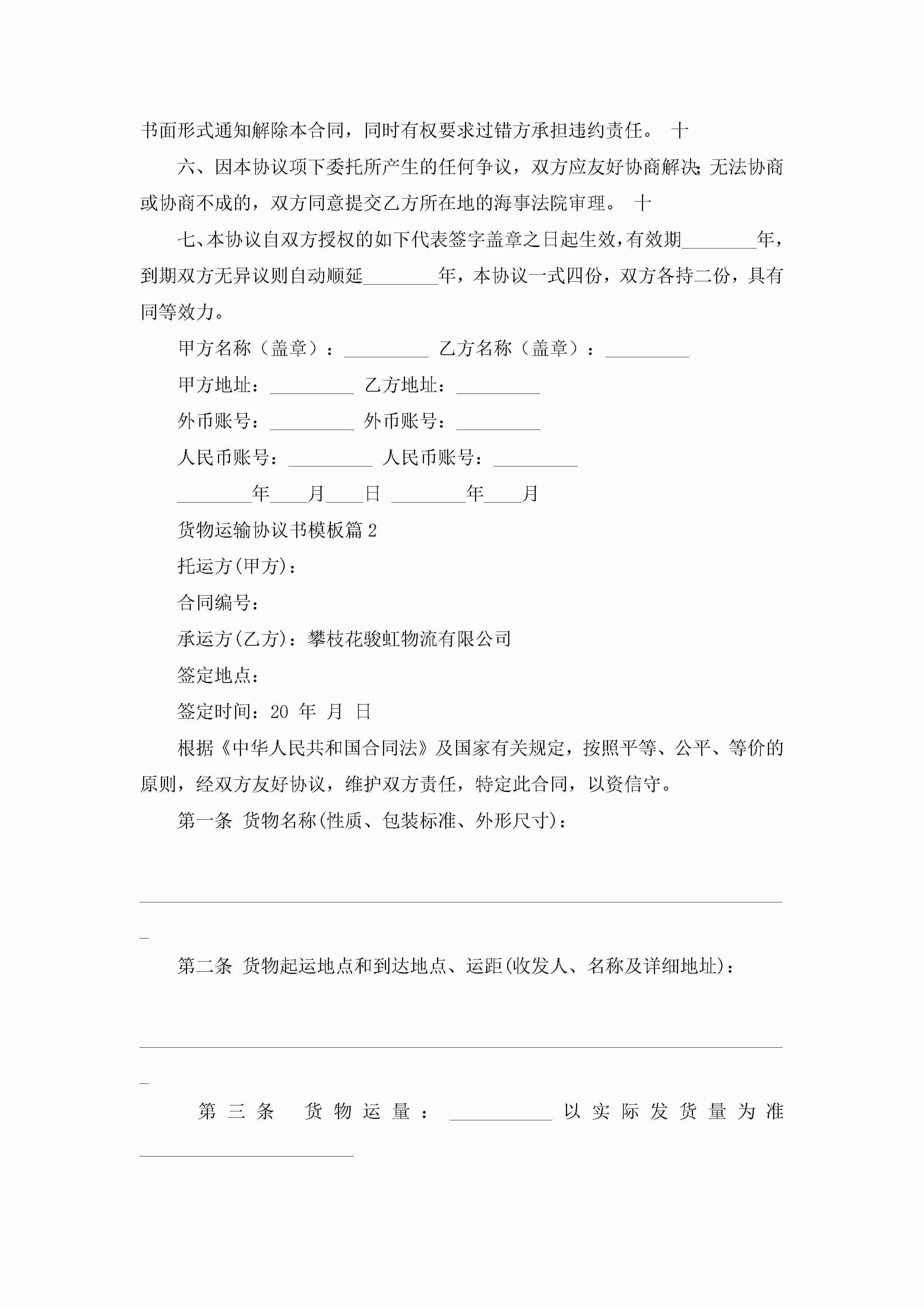 货物运输协议书模板【7篇】jugei3月23日 01:36发布关注189 货物运输协议书模板【7篇】此内容为付费资源,请付费后查看¥10.9 单篇文档限时特惠¥15个人会员开通企业会员开通立即下载无需登陆!可直接快捷下载单个模板付费资源© 版权声明THE ENDWord模板# 实用文档# 实用模板# 合同模板# 合同范本 如有问题,可点击最底部“联系我们”联系客服 分享QQ空间微博QQ好友海报分享复制链接收藏