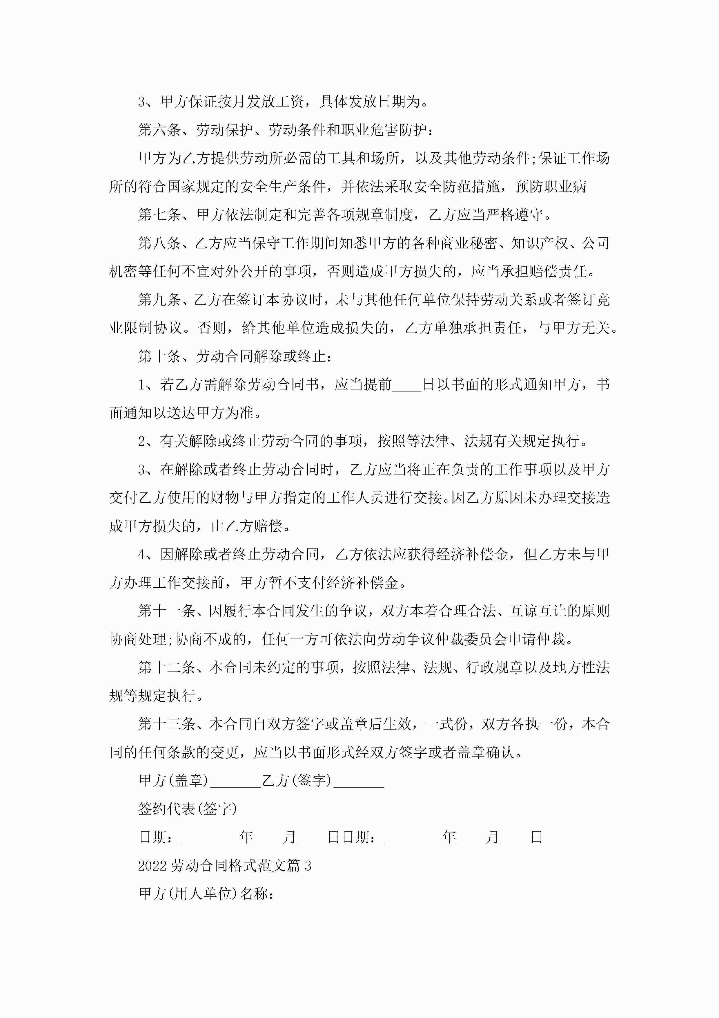 2022劳动合同最新格式范文jugei3月23日 01:36发布关注191 2022劳动合同最新格式范文此内容为付费资源,请付费后查看¥10.9 单篇文档限时特惠¥15个人会员开通企业会员开通立即下载无需登陆!可直接快捷下载单个模板付费资源© 版权声明THE ENDWord模板# 实用文档# 实用模板# 合同模板# 合同范本 如有问题,可点击最底部“联系我们”联系客服 分享QQ空间微博QQ好友海报分享复制链接收藏