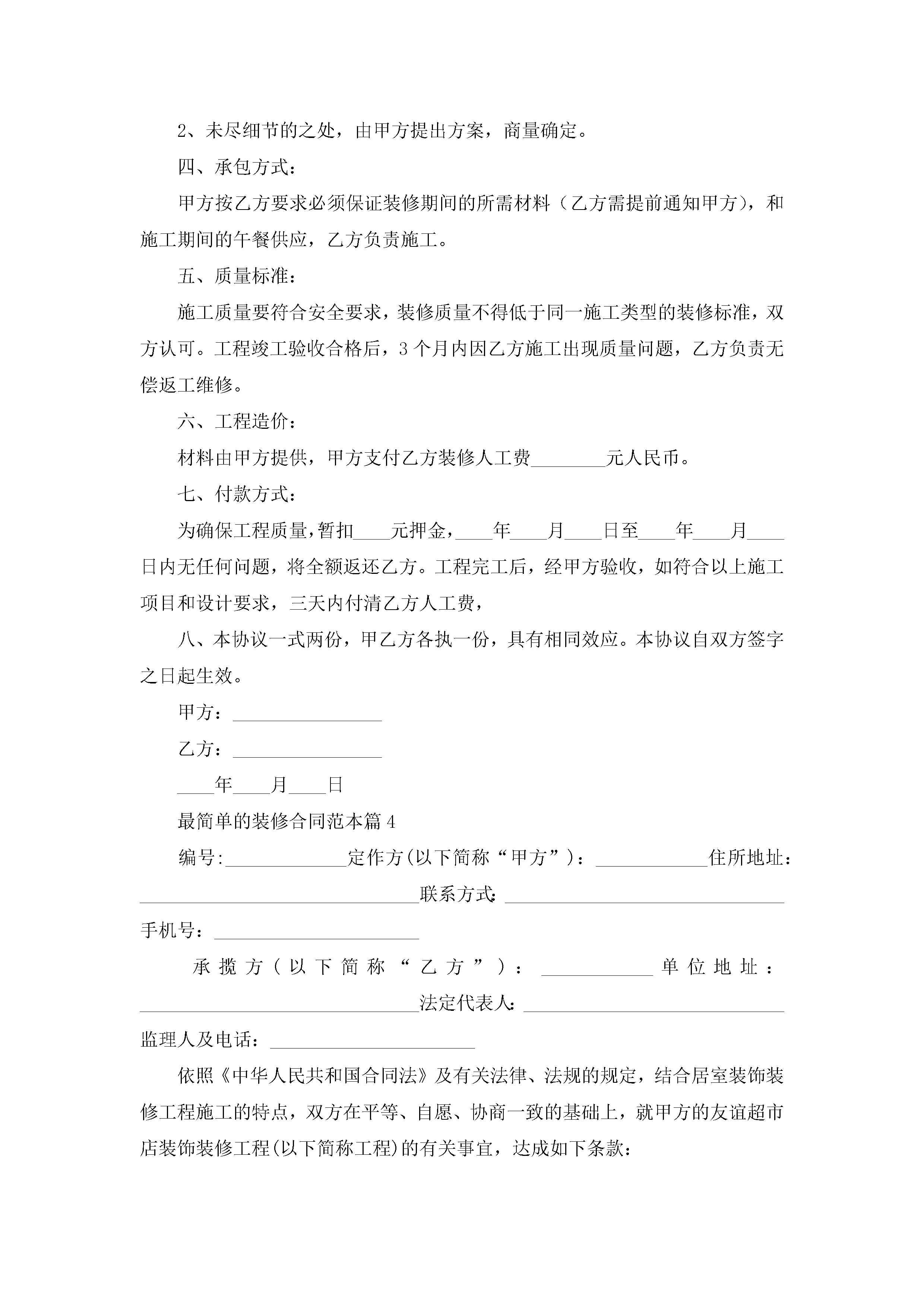 最简单的优秀装修合同范本jugei3月23日 01:36发布关注189 最简单的优秀装修合同范本此内容为付费资源,请付费后查看¥10.9 单篇文档限时特惠¥15个人会员开通企业会员开通立即下载无需登陆!可直接快捷下载单个模板付费资源© 版权声明THE ENDWord模板# 实用文档# 合同模板# 合同范本# 最简单的装修合同范本 如有问题,可点击最底部“联系我们”联系客服 分享QQ空间微博QQ好友海报分享复制链接收藏