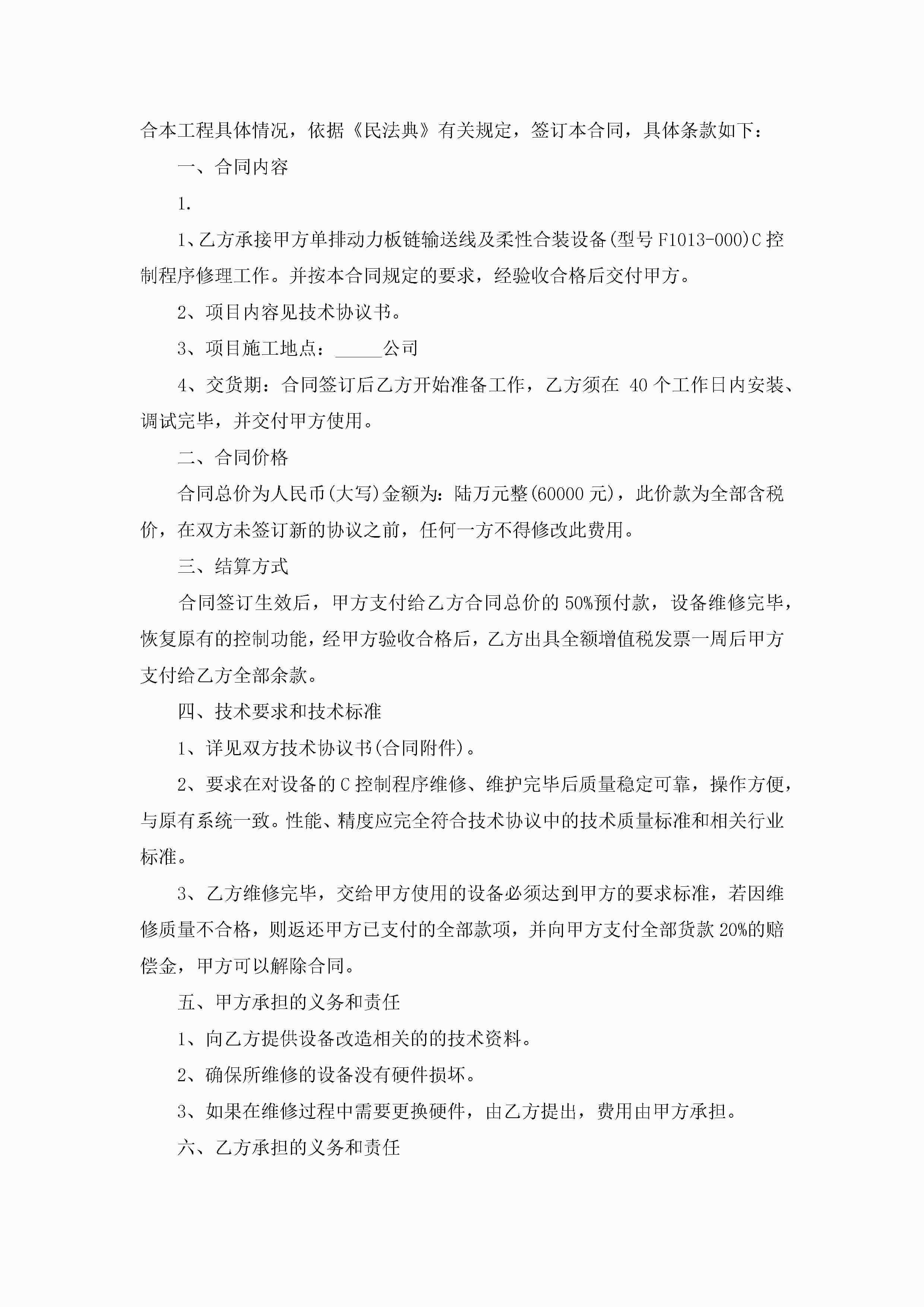 设备维修合同范文通用版jugei3月23日 01:36发布关注191 设备维修合同范文通用版此内容为付费资源,请付费后查看¥10.9 单篇文档限时特惠¥15个人会员开通企业会员开通立即下载无需登陆!可直接快捷下载单个模板付费资源© 版权声明THE ENDWord模板# 实用文档# 实用模板# 合同模板# 合同范本 如有问题,可点击最底部“联系我们”联系客服 分享QQ空间微博QQ好友海报分享复制链接收藏