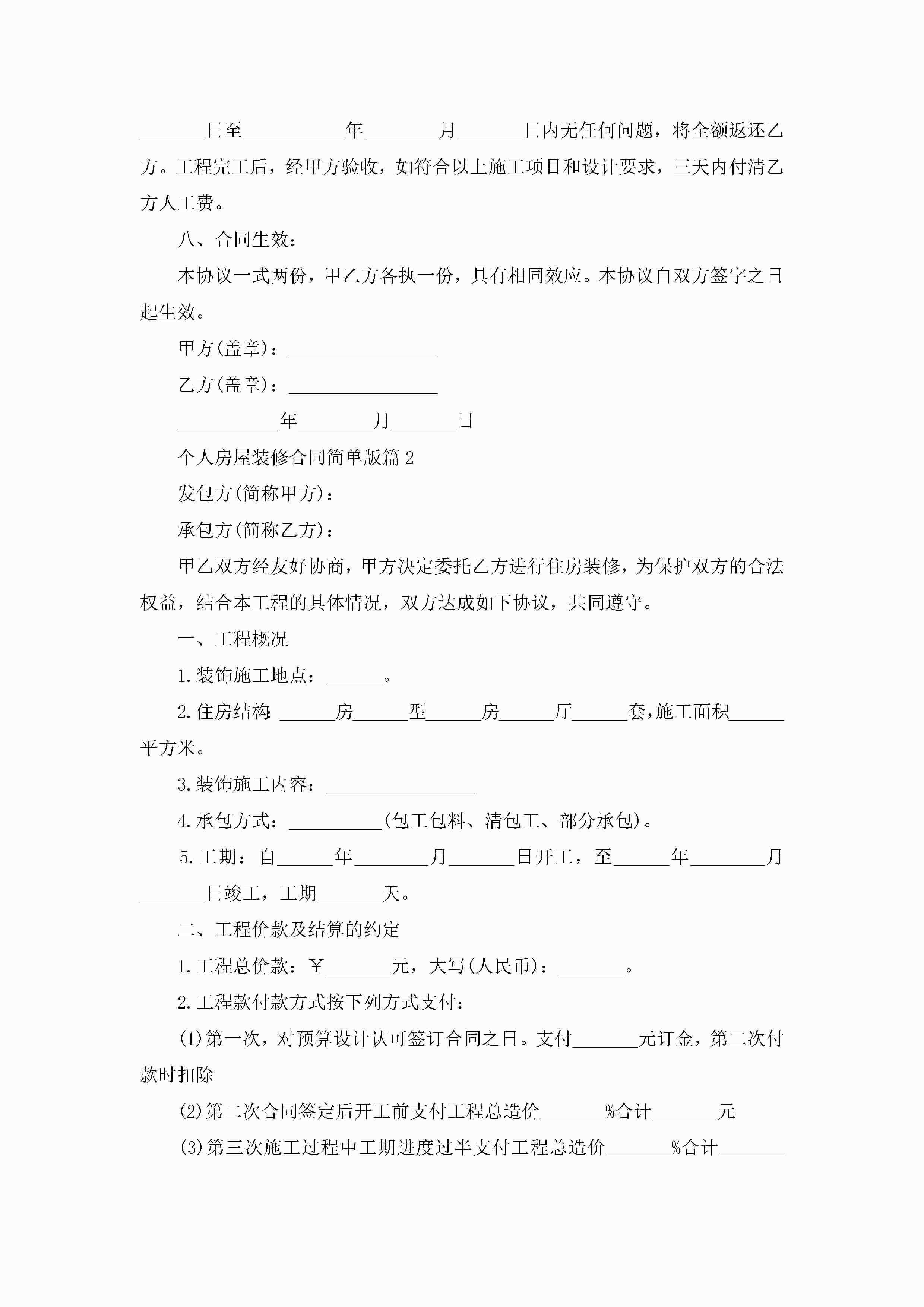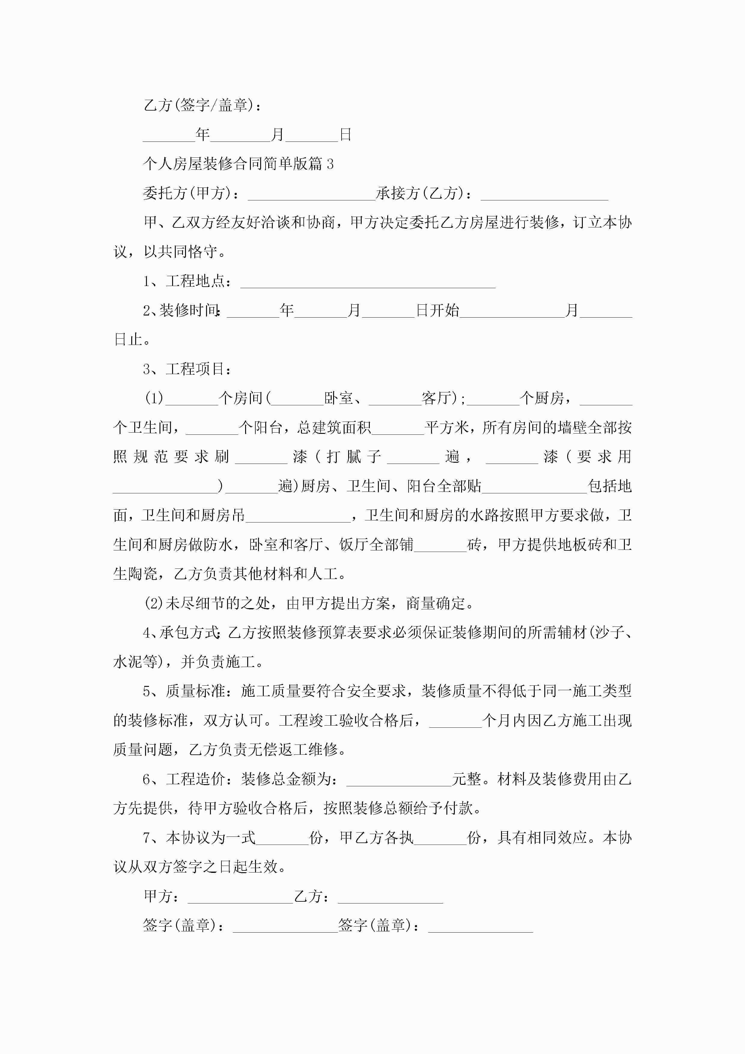 个人房屋装修合同范文简单版jugei3月23日 01:36发布关注255 个人房屋装修合同范文简单版此内容为付费资源,请付费后查看¥10.9 单篇文档限时特惠¥15个人会员开通企业会员开通立即下载无需登陆!可直接快捷下载单个模板付费资源© 版权声明THE ENDWord模板# 实用文档# 实用模板# 合同模板# 合同范本 如有问题,可点击最底部“联系我们”联系客服 分享QQ空间微博QQ好友海报分享复制链接收藏