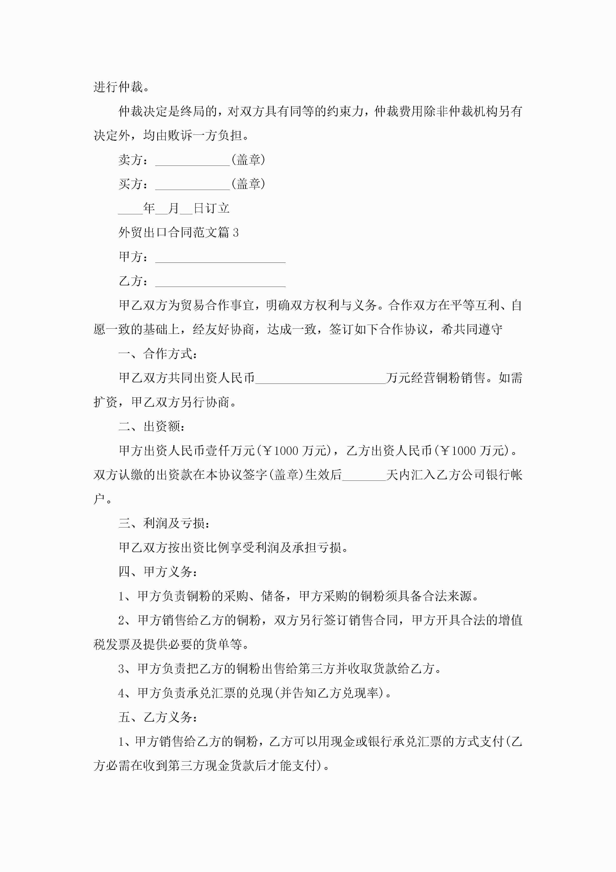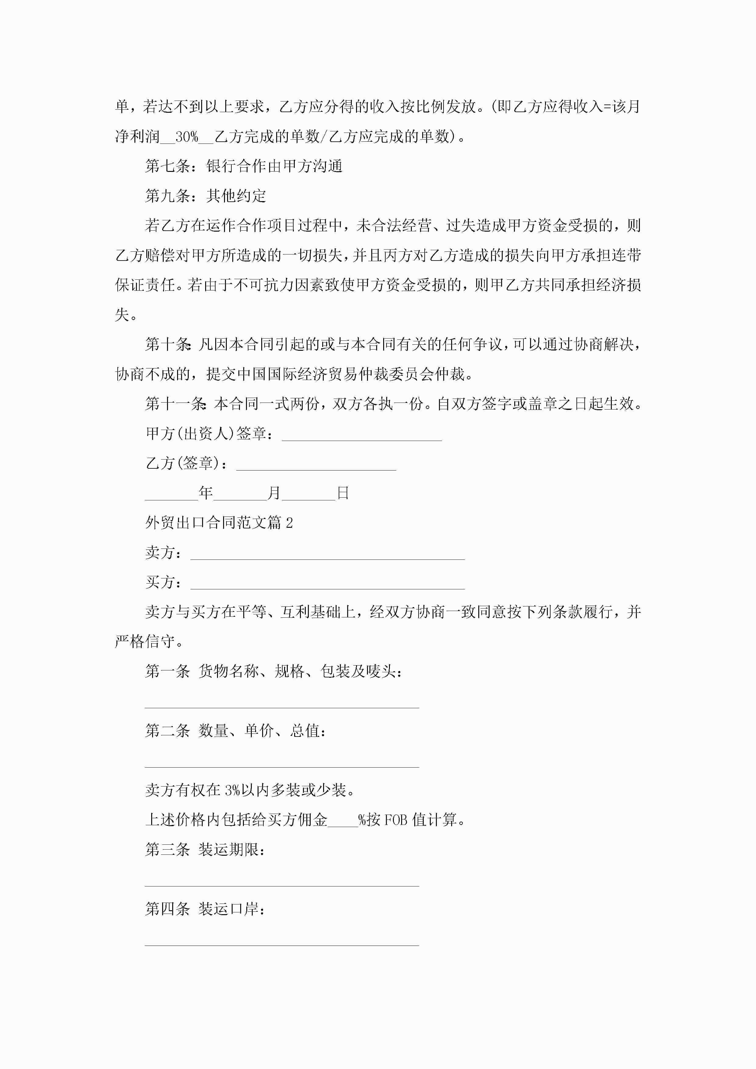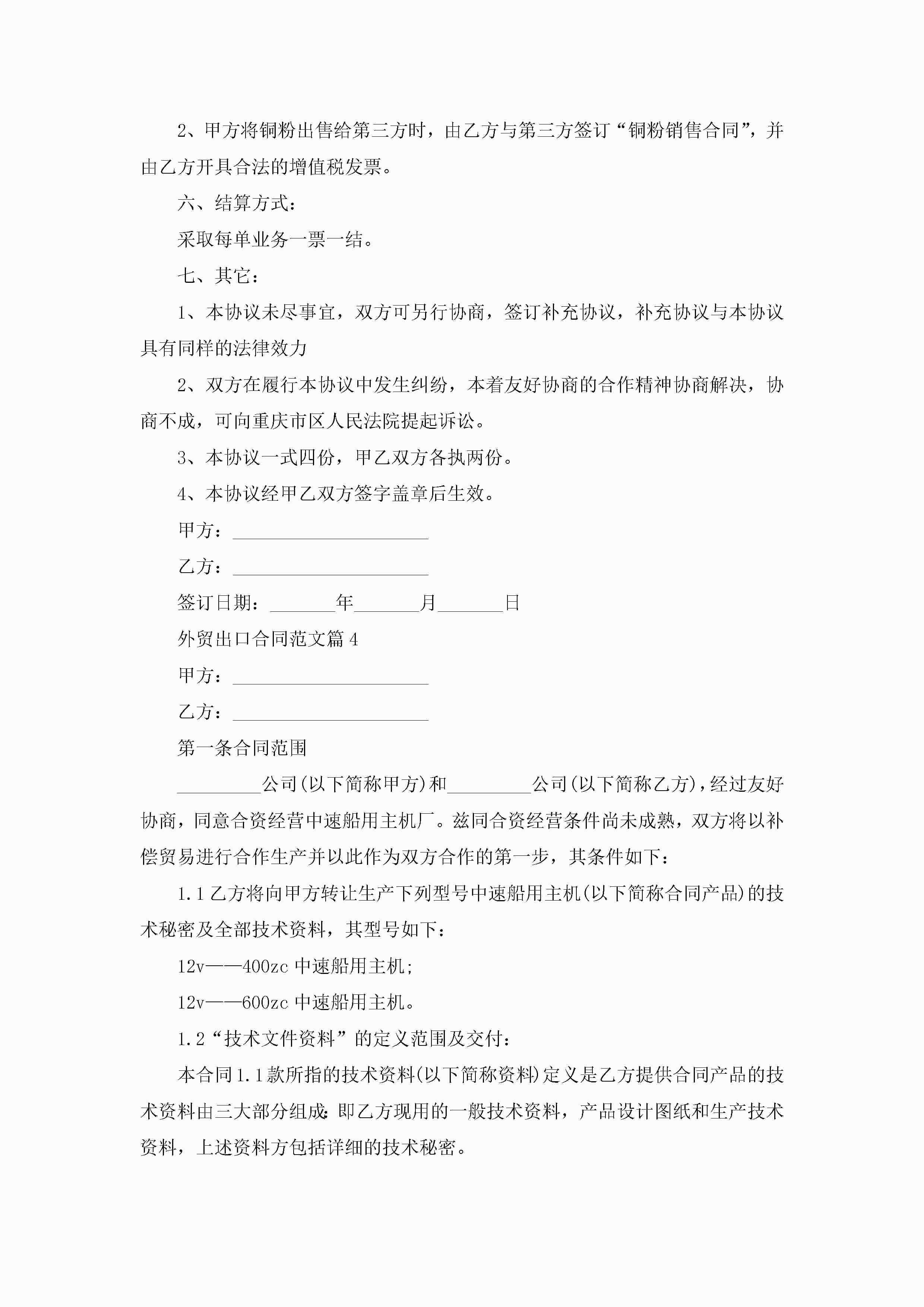 外贸出口合同最新范文jugei3月23日 01:37发布关注277 外贸出口合同最新范文此内容为付费资源,请付费后查看¥10.9 单篇文档限时特惠¥15个人会员开通企业会员开通立即下载无需登陆!可直接快捷下载单个模板付费资源© 版权声明THE ENDWord模板# 实用文档# 实用模板# 合同模板# 合同范本 如有问题,可点击最底部“联系我们”联系客服 分享QQ空间微博QQ好友海报分享复制链接收藏