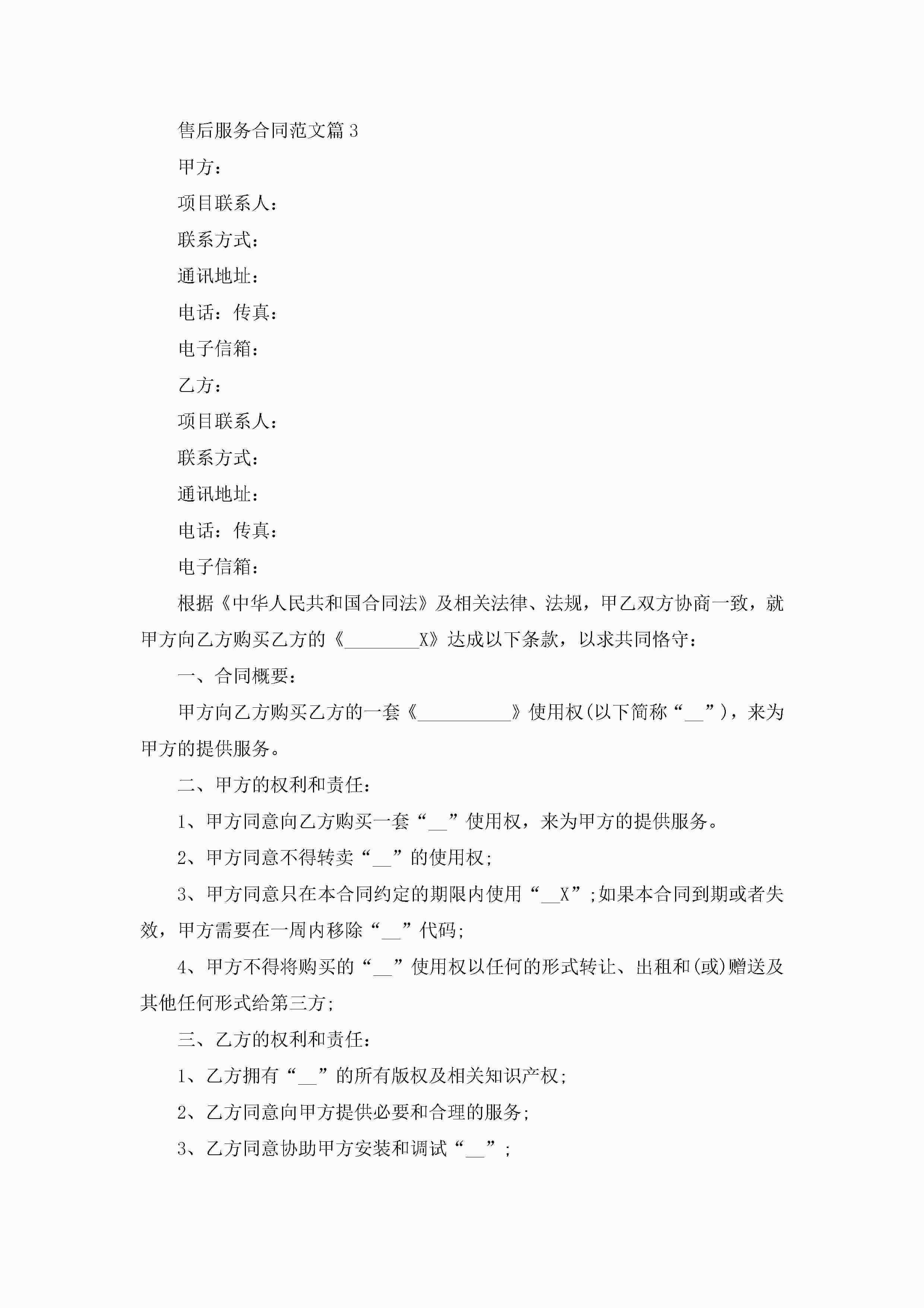 售后服务合同范文模板jugei3月23日 01:37发布关注198 售后服务合同范文模板此内容为付费资源,请付费后查看¥10.9 单篇文档限时特惠¥15个人会员开通企业会员开通立即下载无需登陆!可直接快捷下载单个模板付费资源© 版权声明THE ENDWord模板# 实用文档# 实用模板# 合同模板# 合同范本 如有问题,可点击最底部“联系我们”联系客服 分享QQ空间微博QQ好友海报分享复制链接收藏