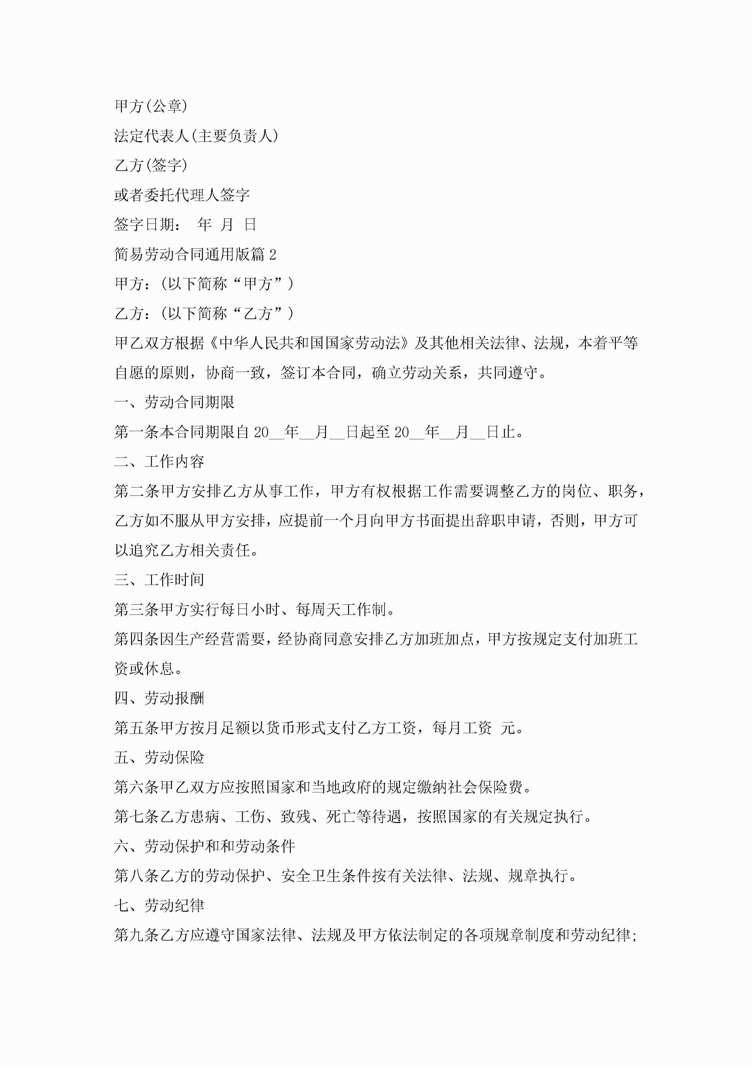 简易劳动合同通用版范文jugei3月23日 01:37发布关注196 简易劳动合同通用版范文此内容为付费资源,请付费后查看¥10.9 单篇文档限时特惠¥15个人会员开通企业会员开通立即下载无需登陆!可直接快捷下载单个模板付费资源© 版权声明THE ENDWord模板# 实用文档# 实用模板# 合同模板# 合同范本 如有问题,可点击最底部“联系我们”联系客服 分享QQ空间微博QQ好友海报分享复制链接收藏