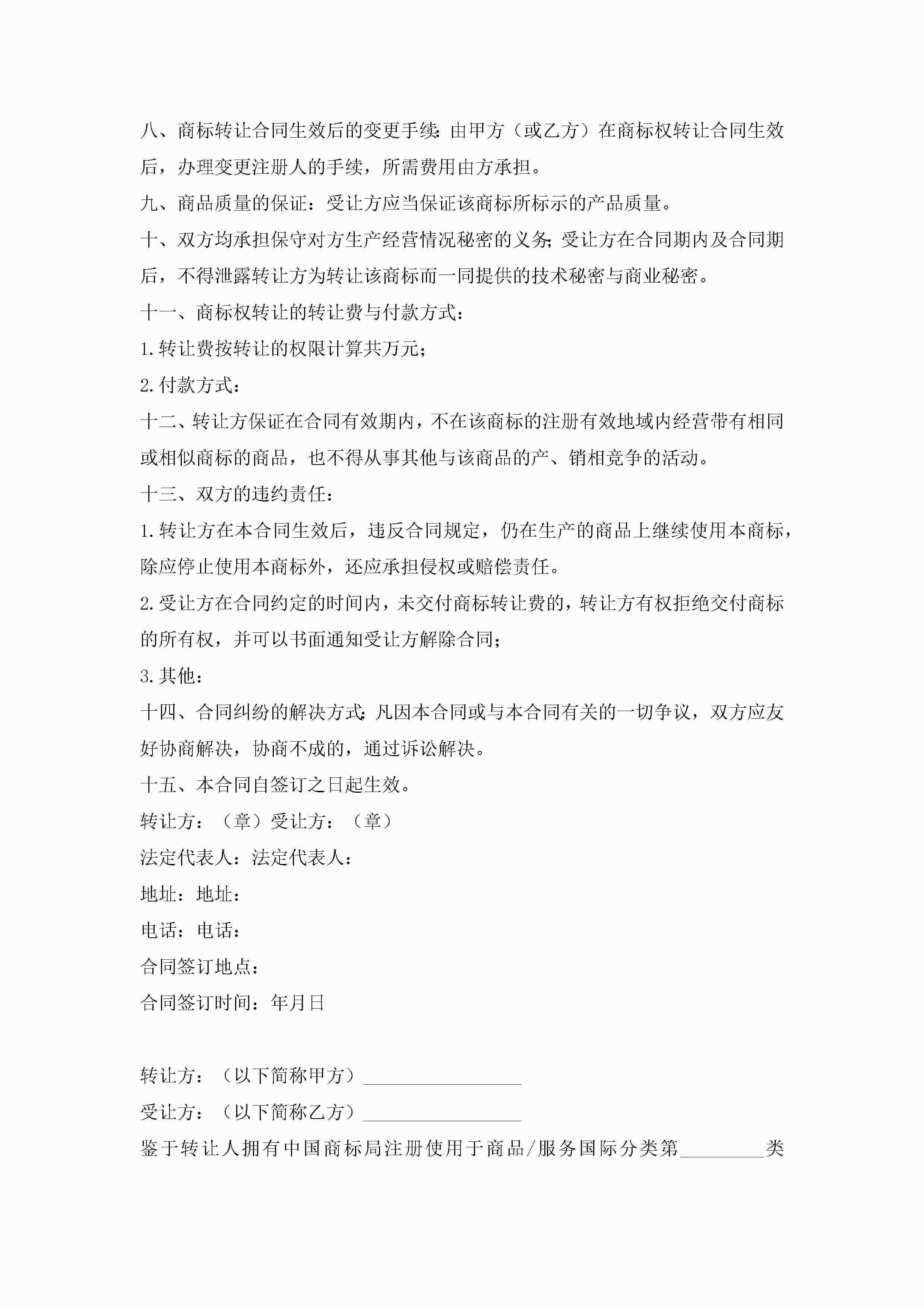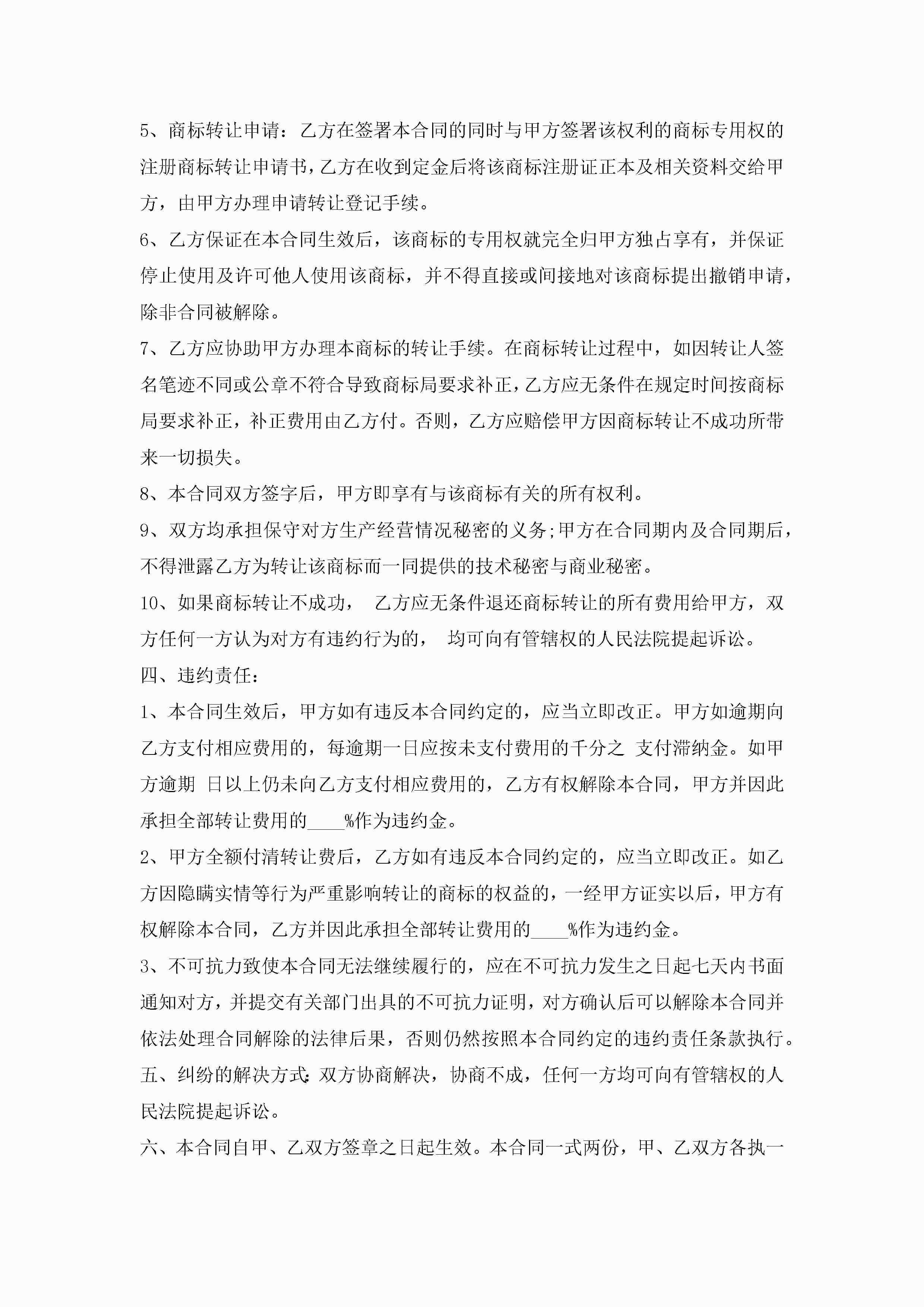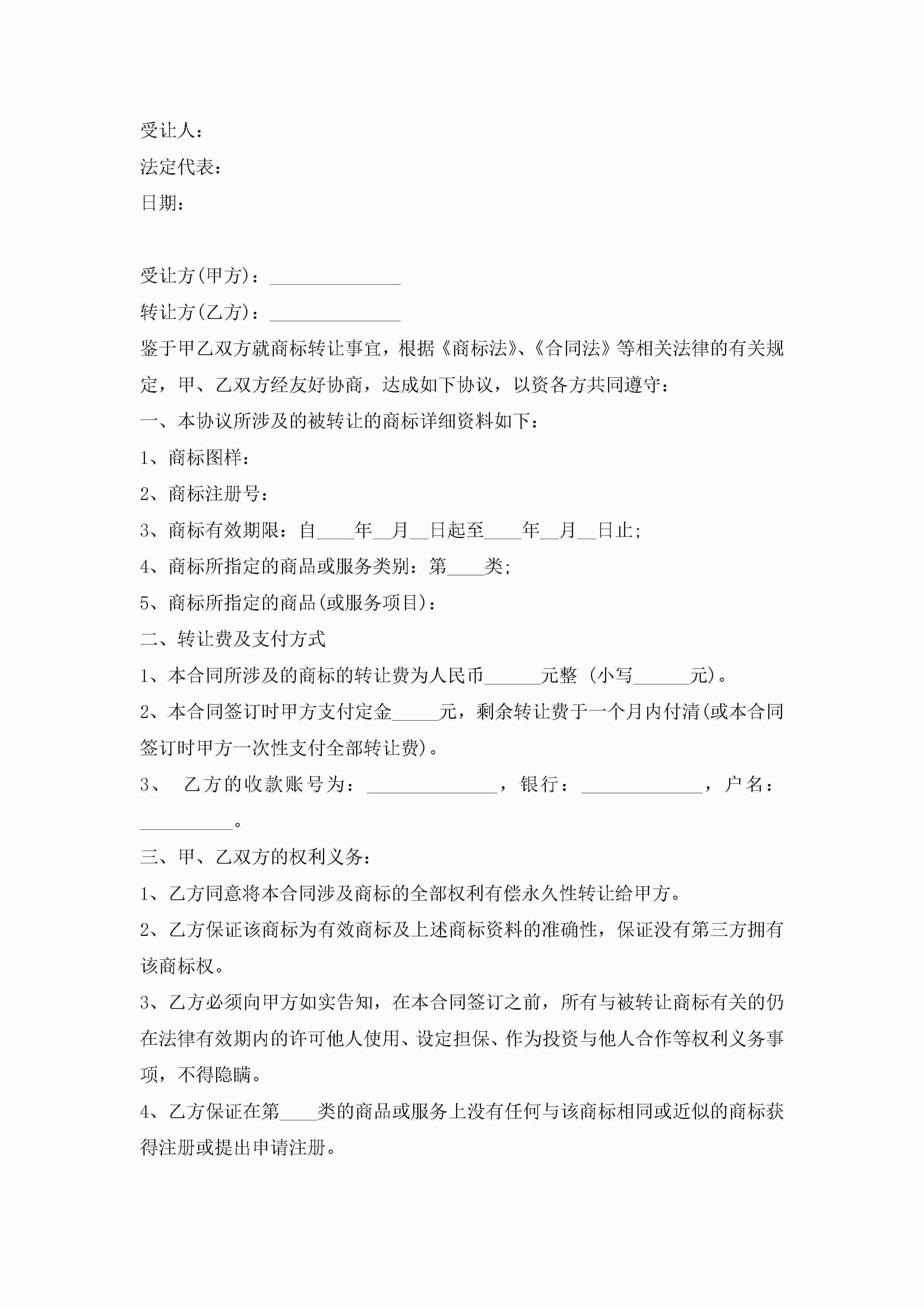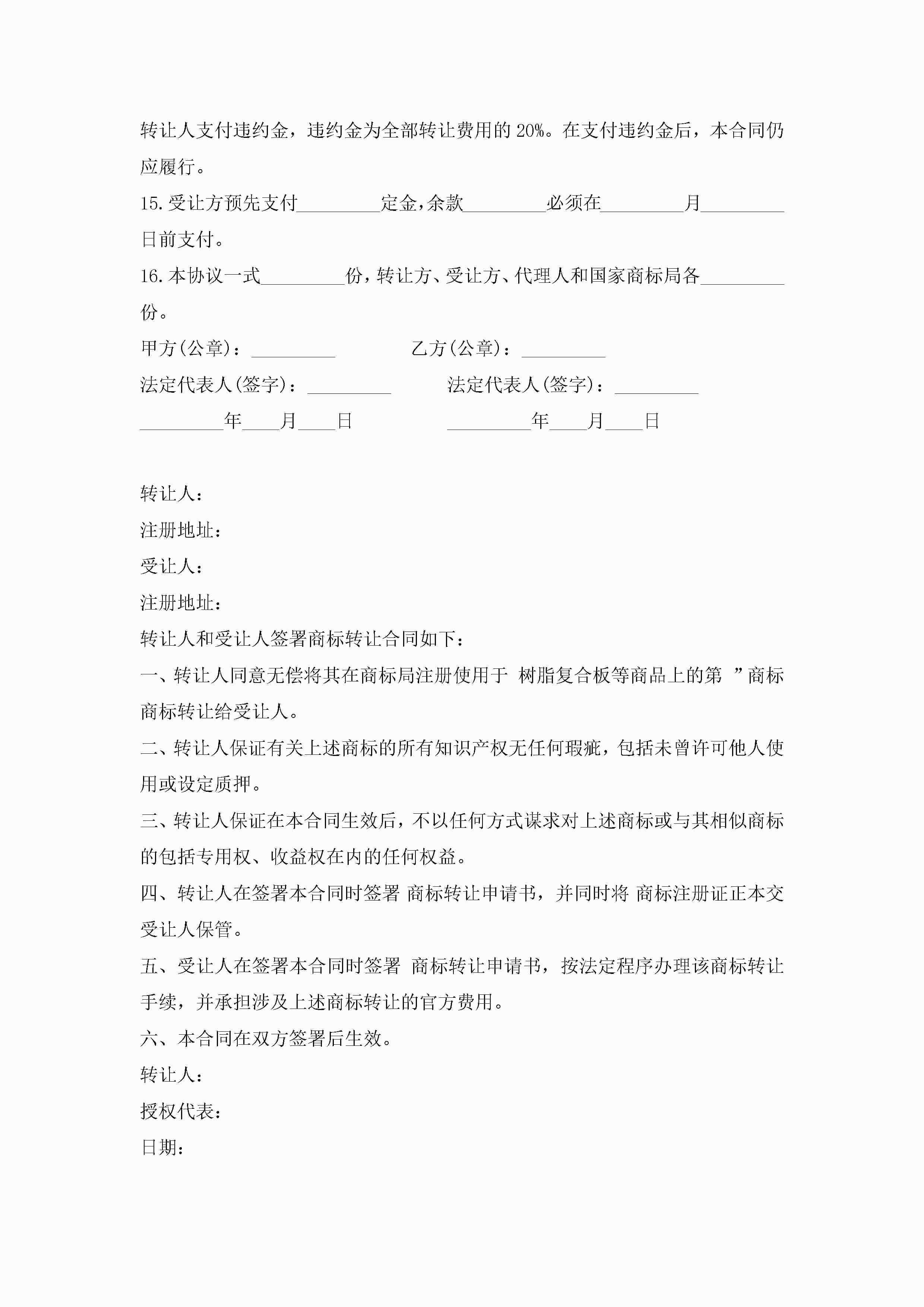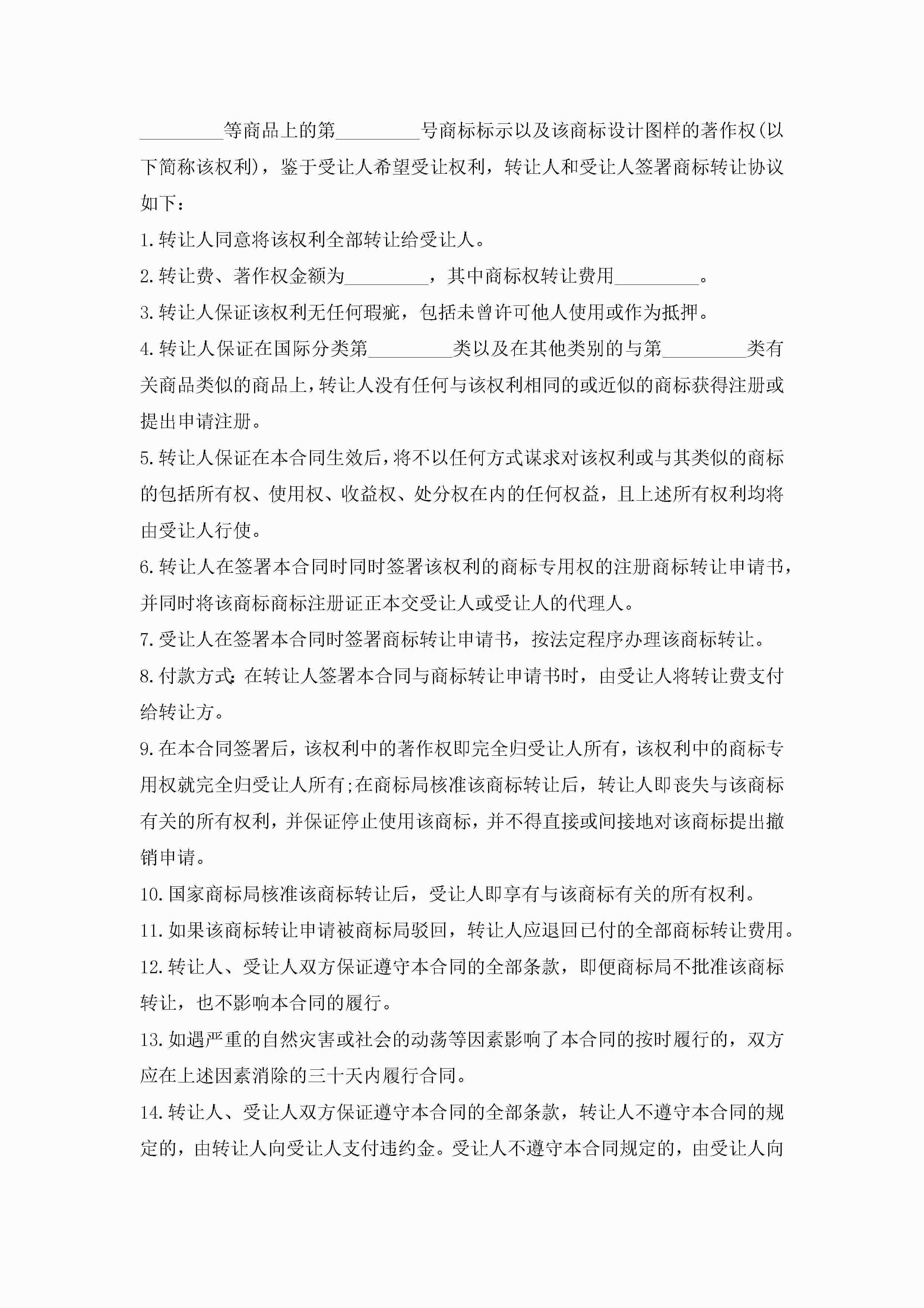 商标转让合同电子版(通用7篇)jugei3月23日 01:37发布关注194 商标转让合同电子版(通用7篇)此内容为付费资源,请付费后查看¥10.9 单篇文档限时特惠¥15个人会员开通企业会员开通立即下载无需登陆!可直接快捷下载单个模板付费资源© 版权声明THE ENDWord模板# 实用文档# 实用模板# 合同模板# 合同范本 如有问题,可点击最底部“联系我们”联系客服 分享QQ空间微博QQ好友海报分享复制链接收藏