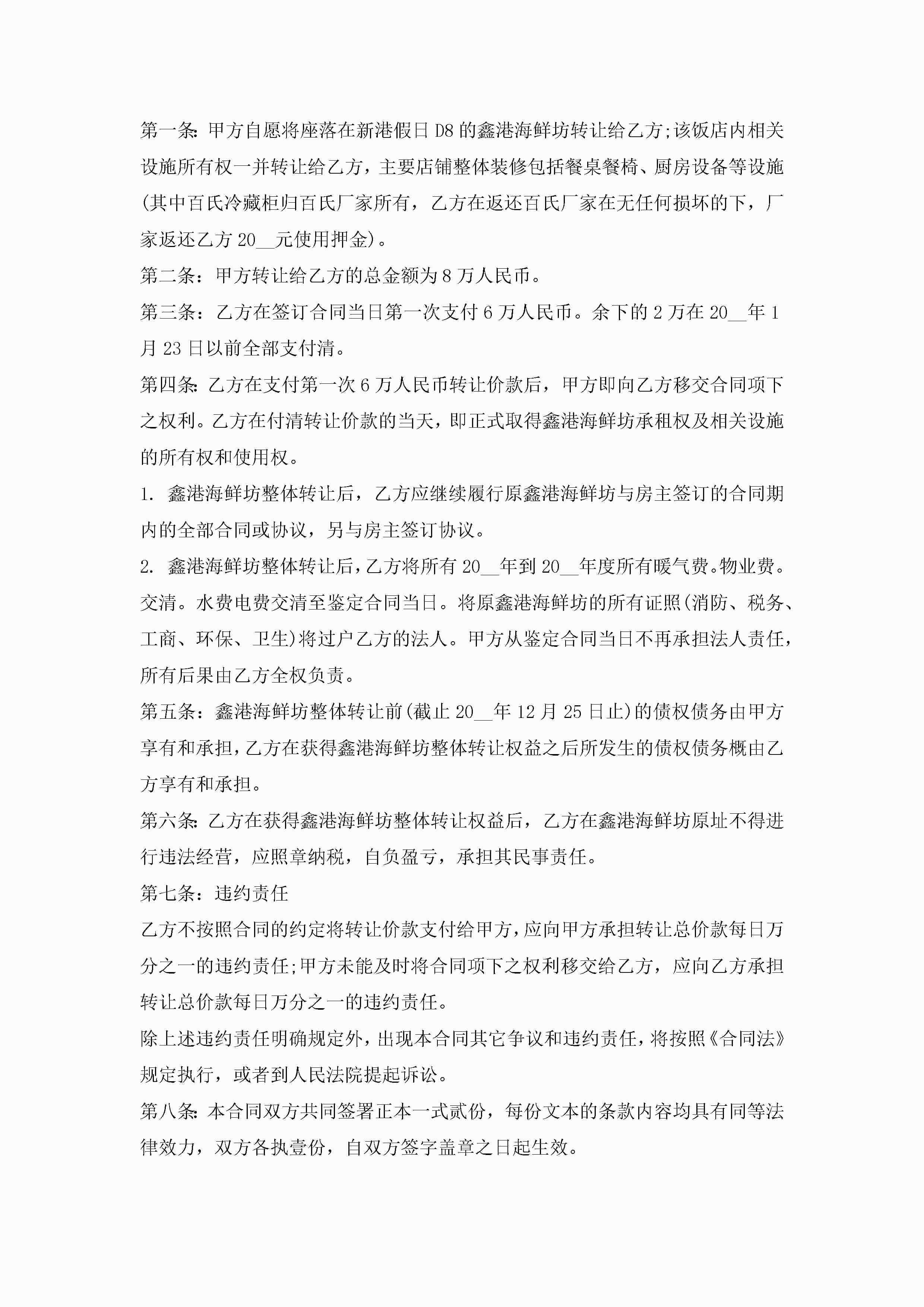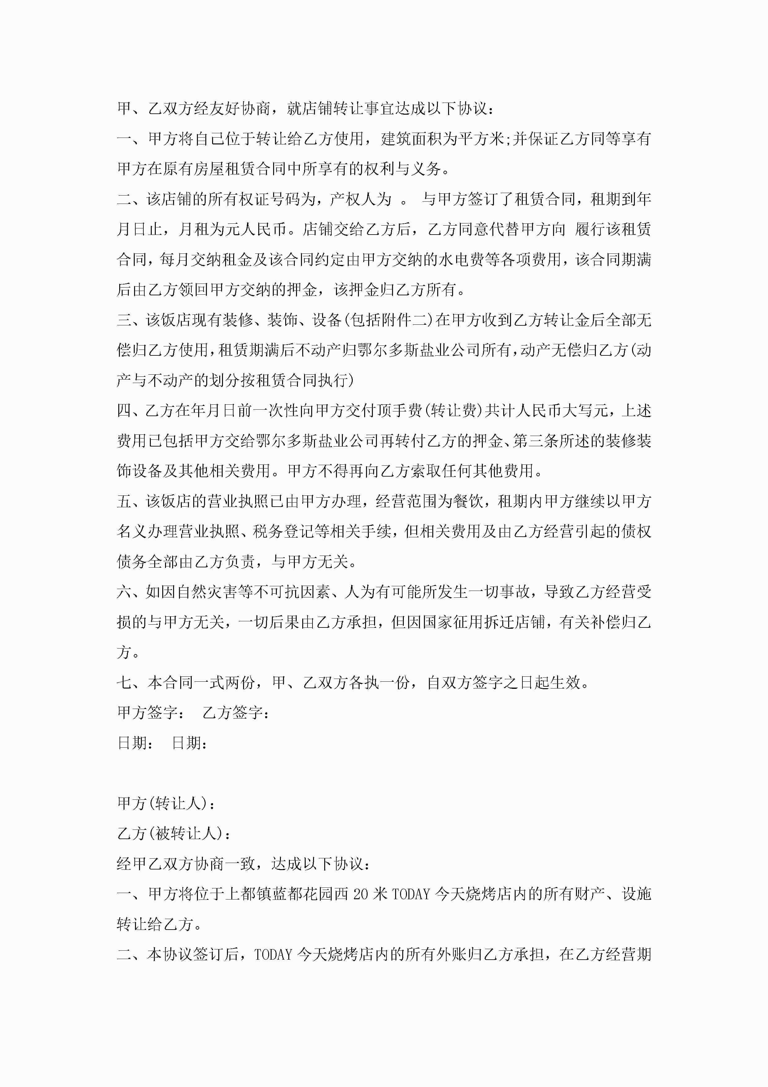 餐饮店铺转让合同【通用7篇】jugei3月23日 01:37发布关注190 餐饮店铺转让合同【通用7篇】此内容为付费资源,请付费后查看¥10.9 单篇文档限时特惠¥15个人会员开通企业会员开通立即下载无需登陆!可直接快捷下载单个模板付费资源© 版权声明THE ENDWord模板# 实用文档# 实用模板# 合同模板# 合同范本 如有问题,可点击最底部“联系我们”联系客服 分享QQ空间微博QQ好友海报分享复制链接收藏