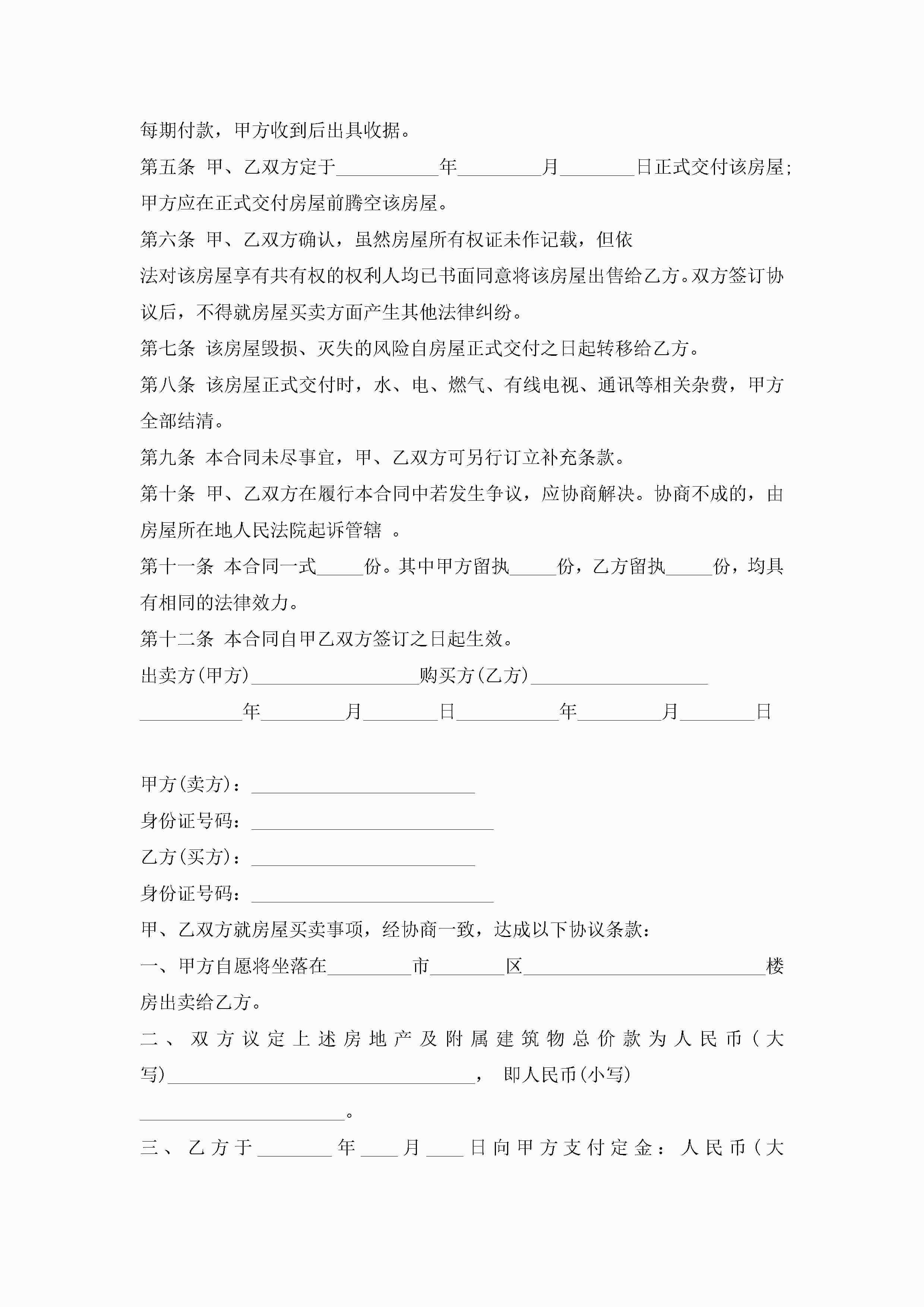 年房屋买卖合同模板范本5篇大全jugei3月23日 01:37发布关注256 年房屋买卖合同模板范本5篇大全此内容为付费资源,请付费后查看¥10.9 单篇文档限时特惠¥15个人会员开通企业会员开通立即下载无需登陆!可直接快捷下载单个模板付费资源© 版权声明THE ENDWord模板# 实用文档# 实用模板# 合同模板# 买卖合同 如有问题,可点击最底部“联系我们”联系客服 分享QQ空间微博QQ好友海报分享复制链接收藏