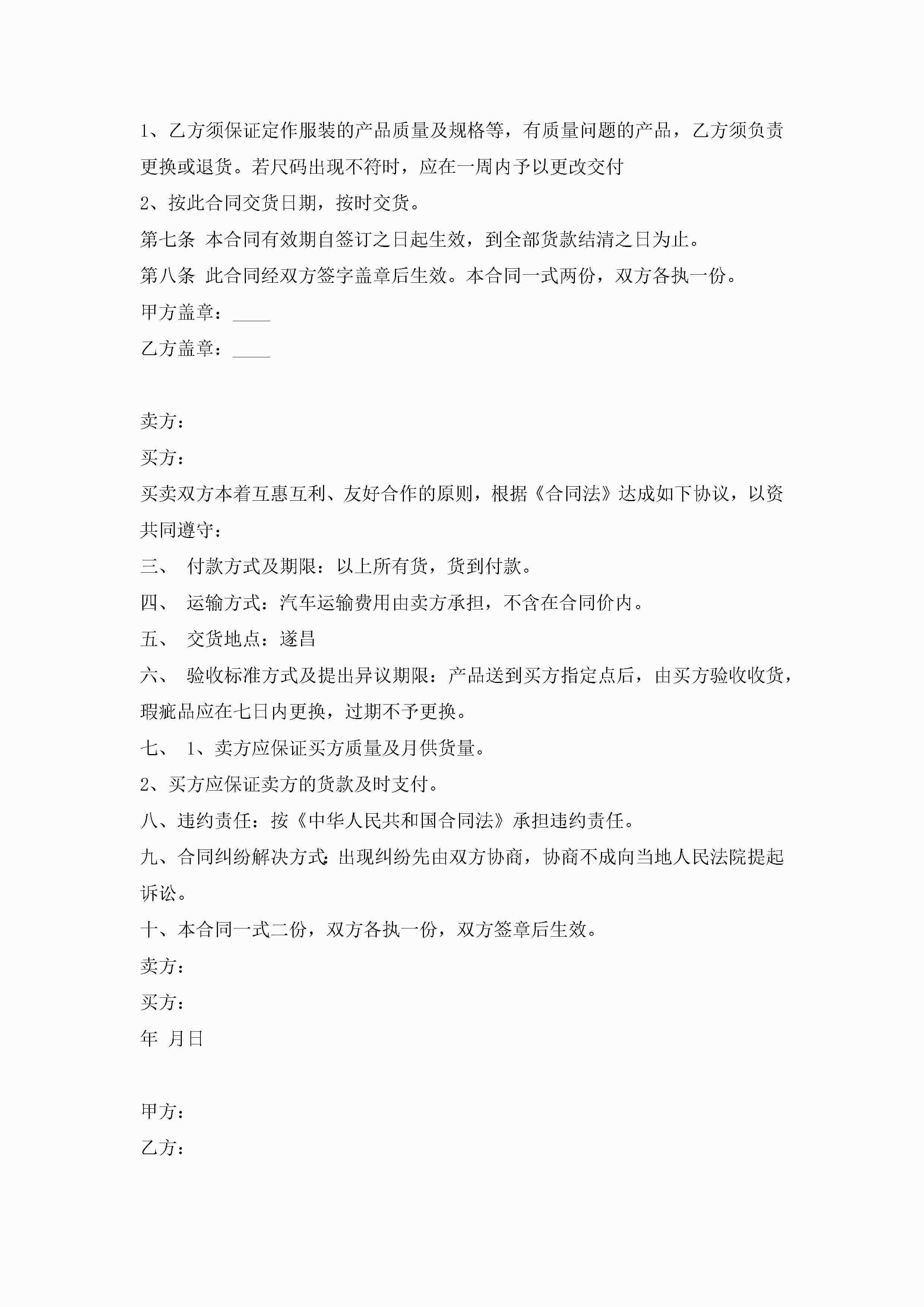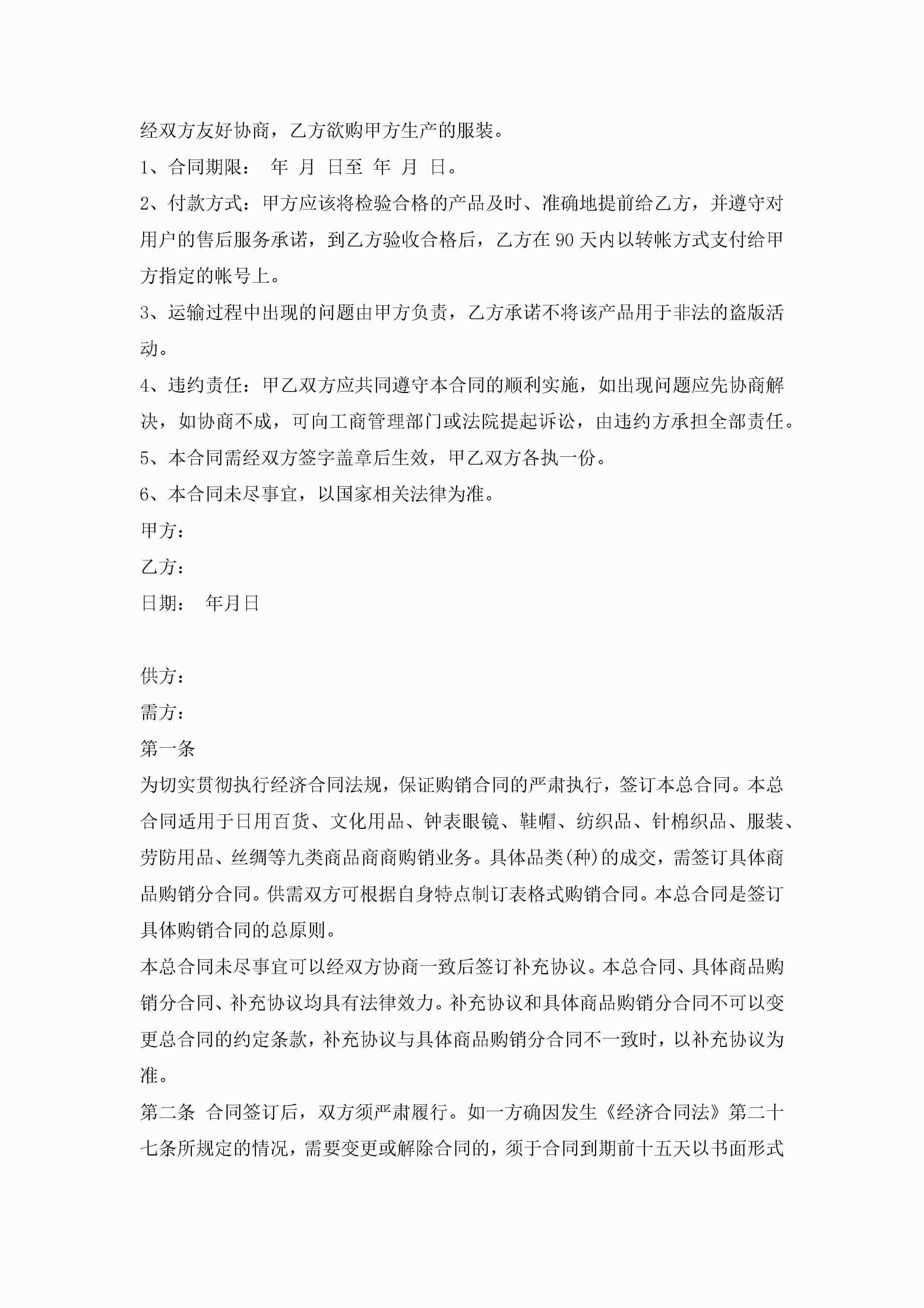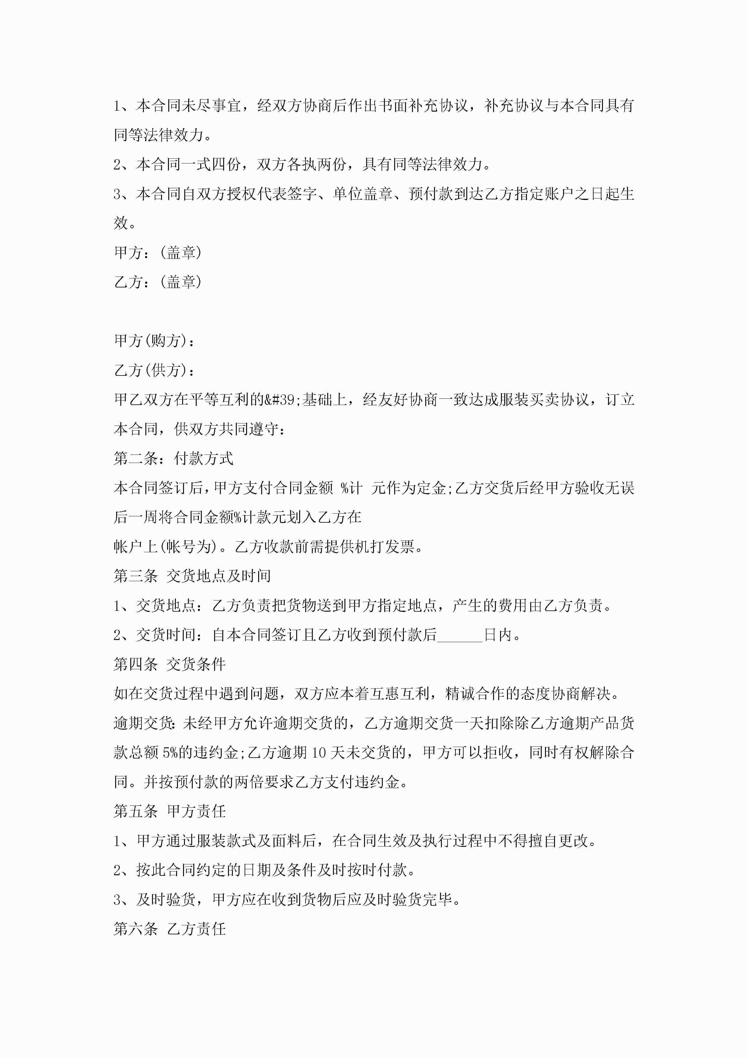 服装购销买卖合同5篇jugei3月23日 01:38发布关注186 服装购销买卖合同5篇此内容为付费资源,请付费后查看¥10.9 单篇文档限时特惠¥15个人会员开通企业会员开通立即下载无需登陆!可直接快捷下载单个模板付费资源© 版权声明THE ENDWord模板# 实用文档# 实用模板# 合同模板# 买卖合同 如有问题,可点击最底部“联系我们”联系客服 分享QQ空间微博QQ好友海报分享复制链接收藏
