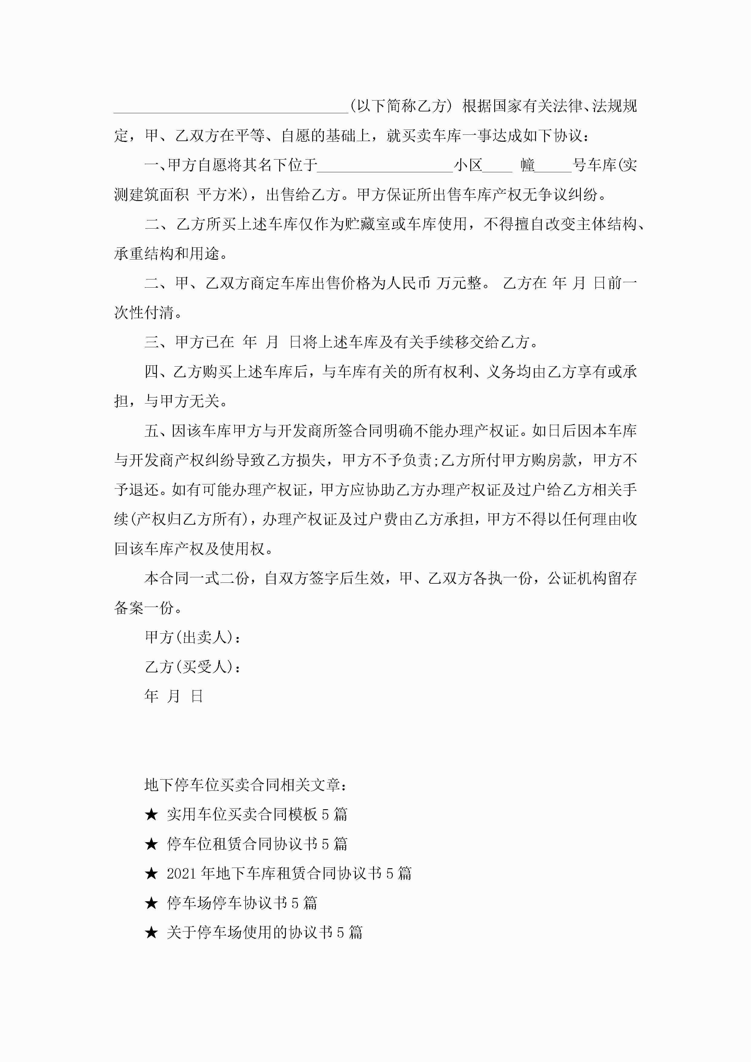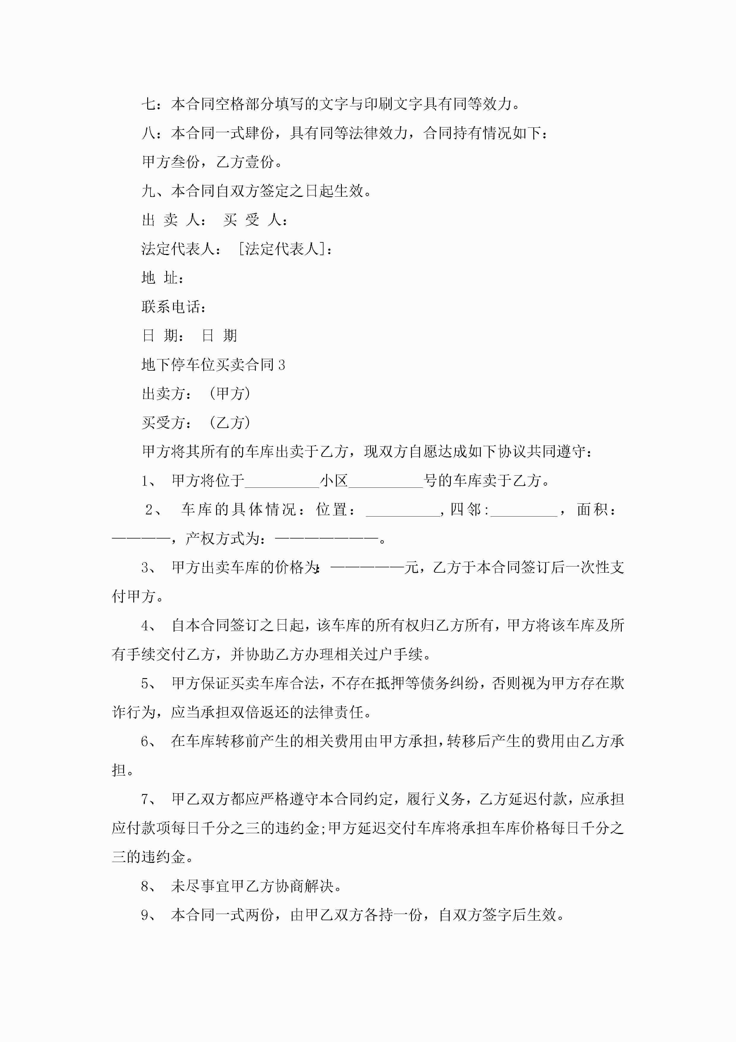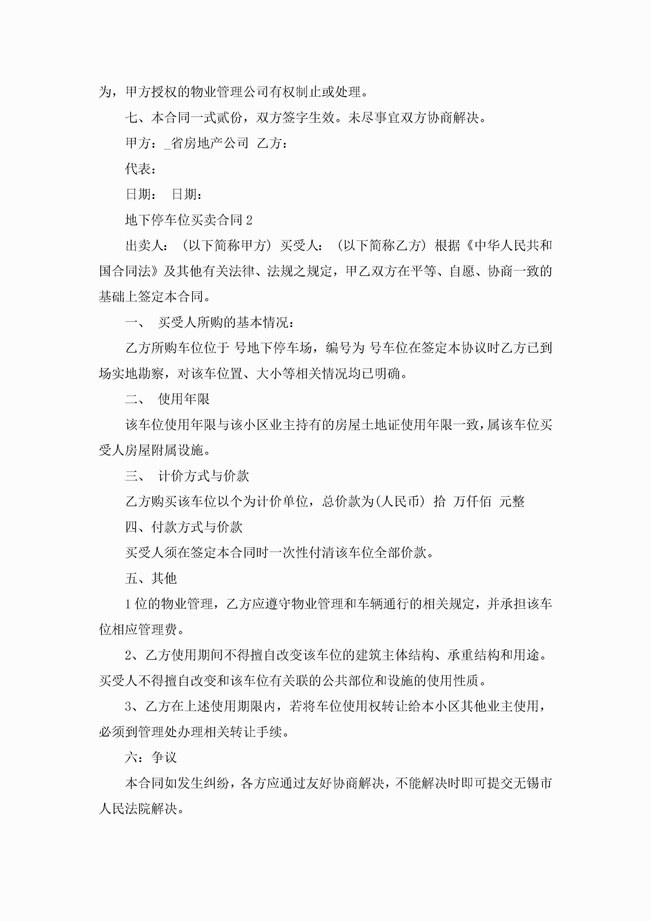 地下停车位买卖合同5篇jugei3月23日 01:38发布关注187 地下停车位买卖合同5篇此内容为付费资源,请付费后查看¥10.9 单篇文档限时特惠¥15个人会员开通企业会员开通立即下载无需登陆!可直接快捷下载单个模板付费资源© 版权声明THE ENDWord模板# 实用文档# 实用模板# 合同模板# 买卖合同 如有问题,可点击最底部“联系我们”联系客服 分享QQ空间微博QQ好友海报分享复制链接收藏