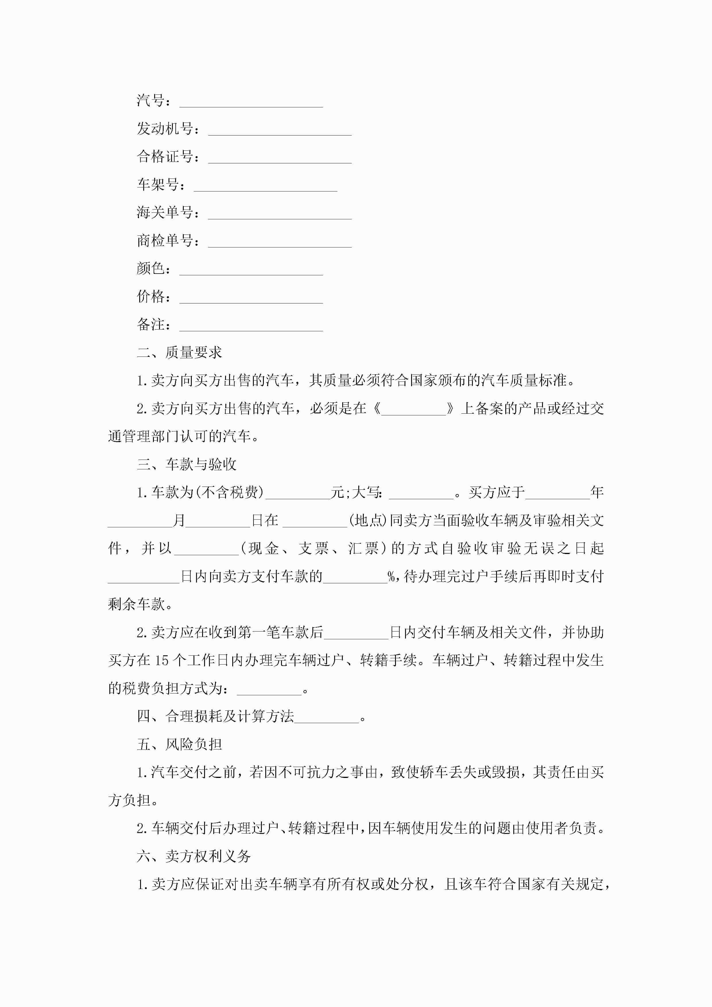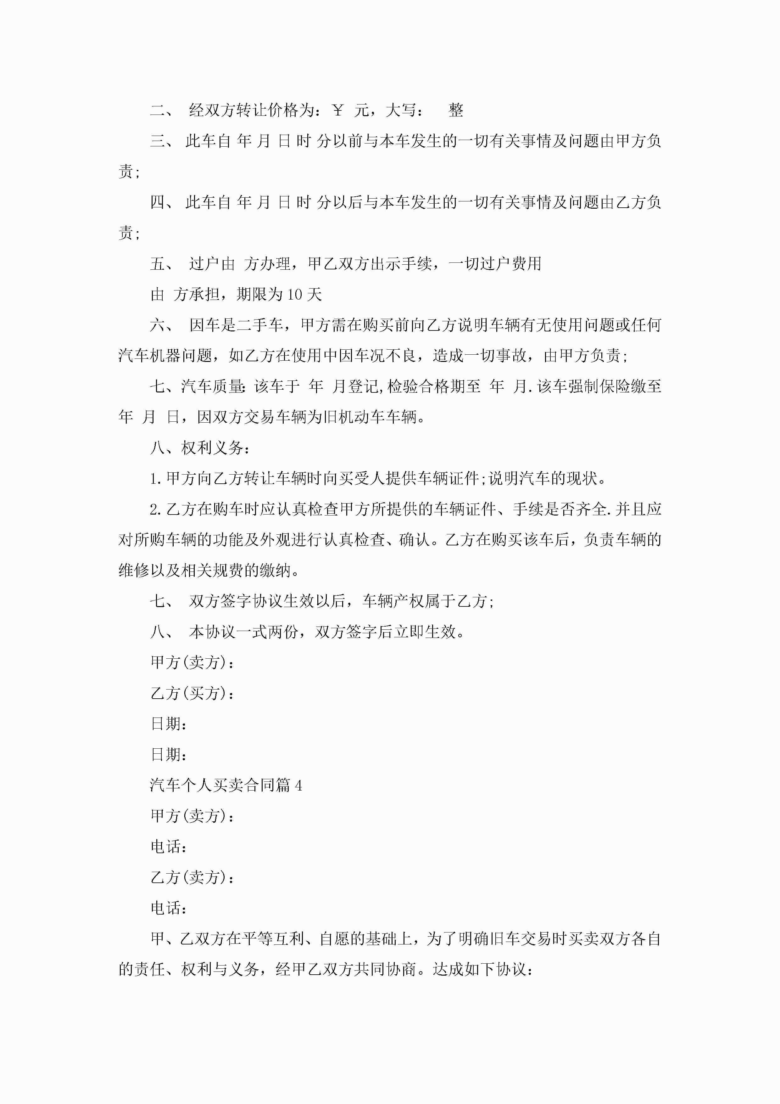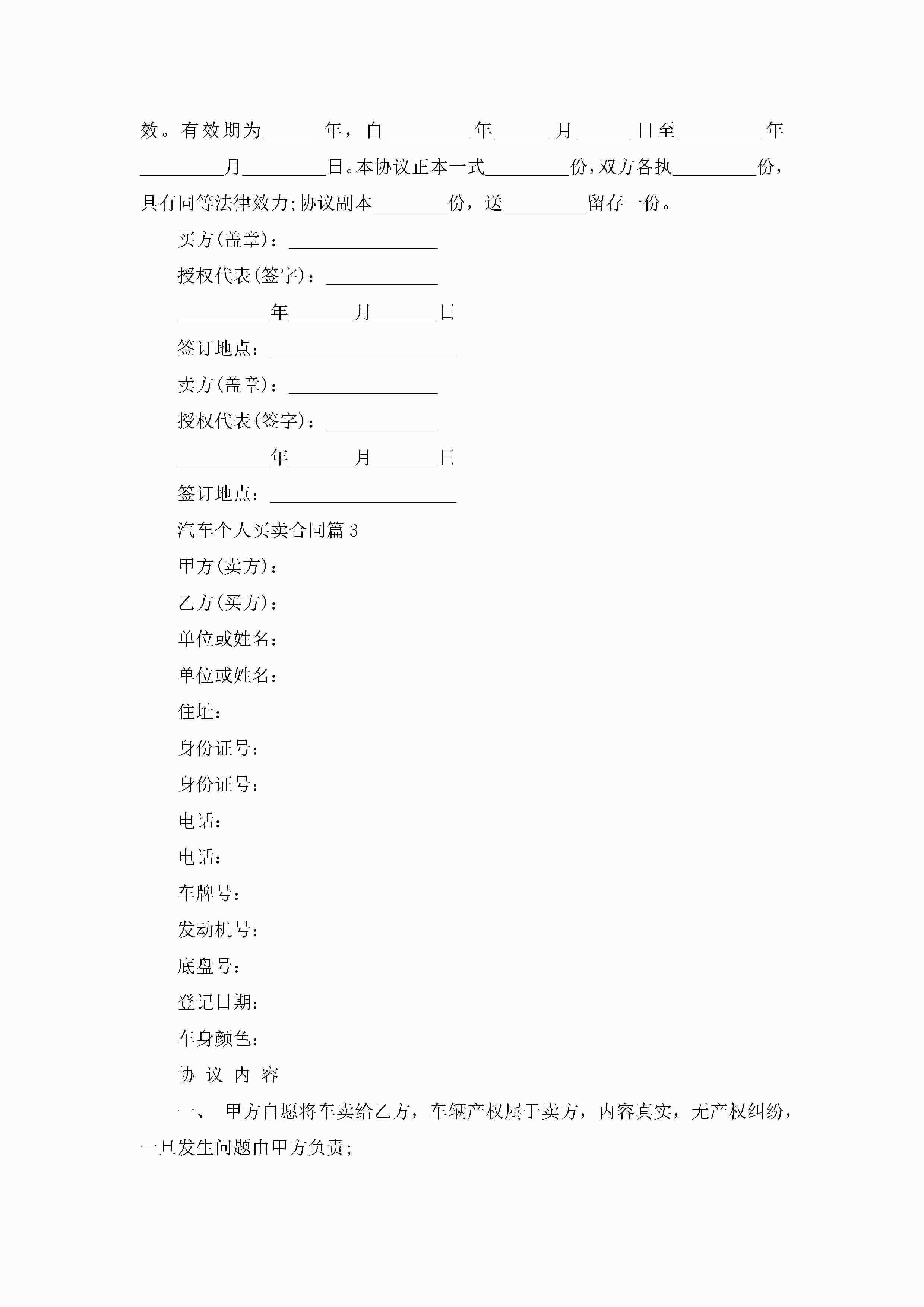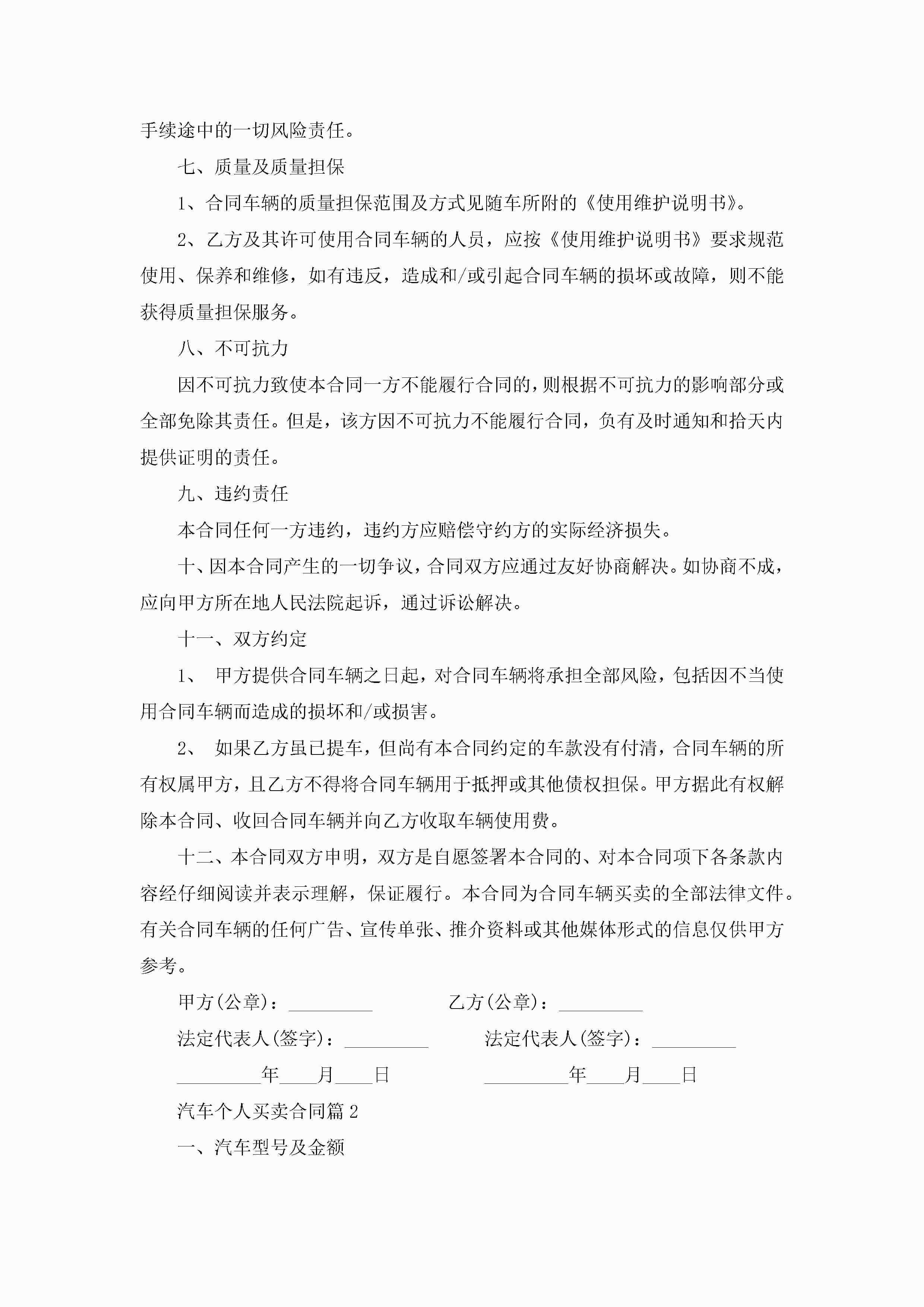 汽车个人买卖合同(精选10篇)jugei3月23日 01:38发布关注192 汽车个人买卖合同(精选10篇)此内容为付费资源,请付费后查看¥10.9 单篇文档限时特惠¥15个人会员开通企业会员开通立即下载无需登陆!可直接快捷下载单个模板付费资源© 版权声明THE ENDWord模板# 实用文档# 实用模板# 合同模板# 买卖合同 如有问题,可点击最底部“联系我们”联系客服 分享QQ空间微博QQ好友海报分享复制链接收藏