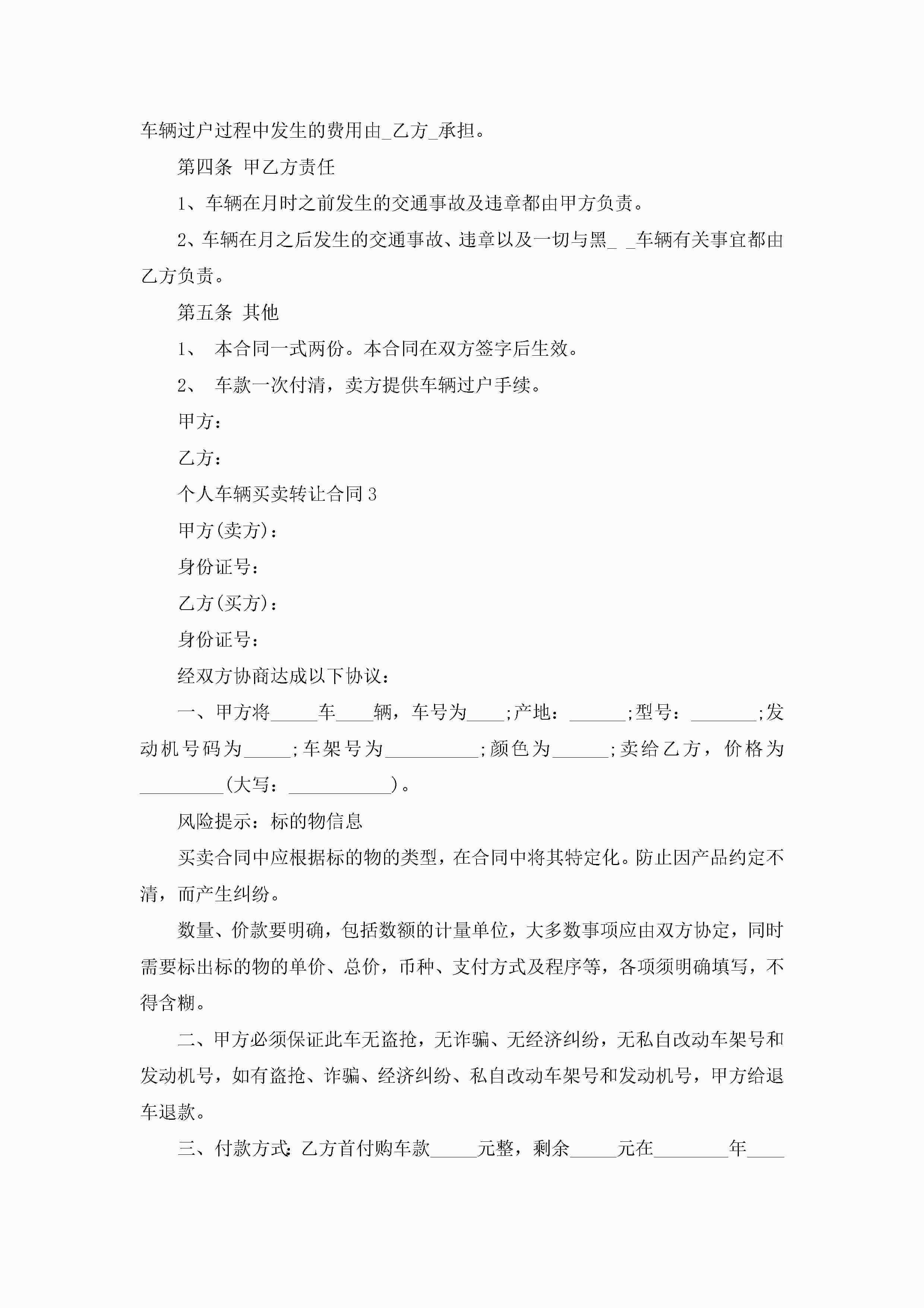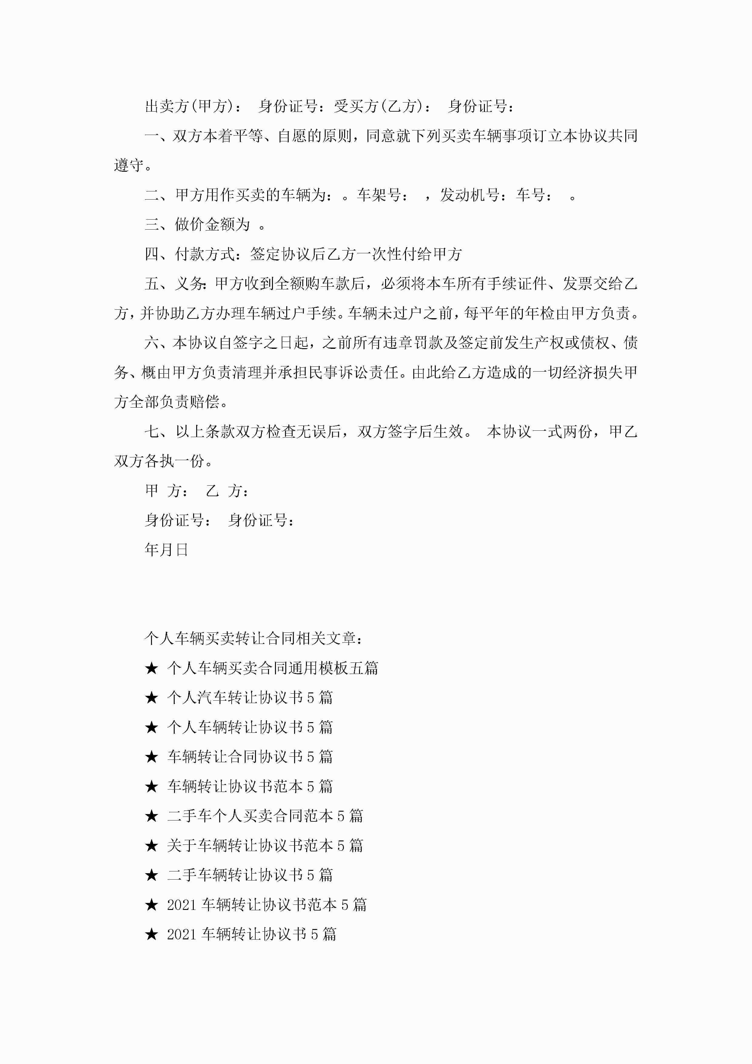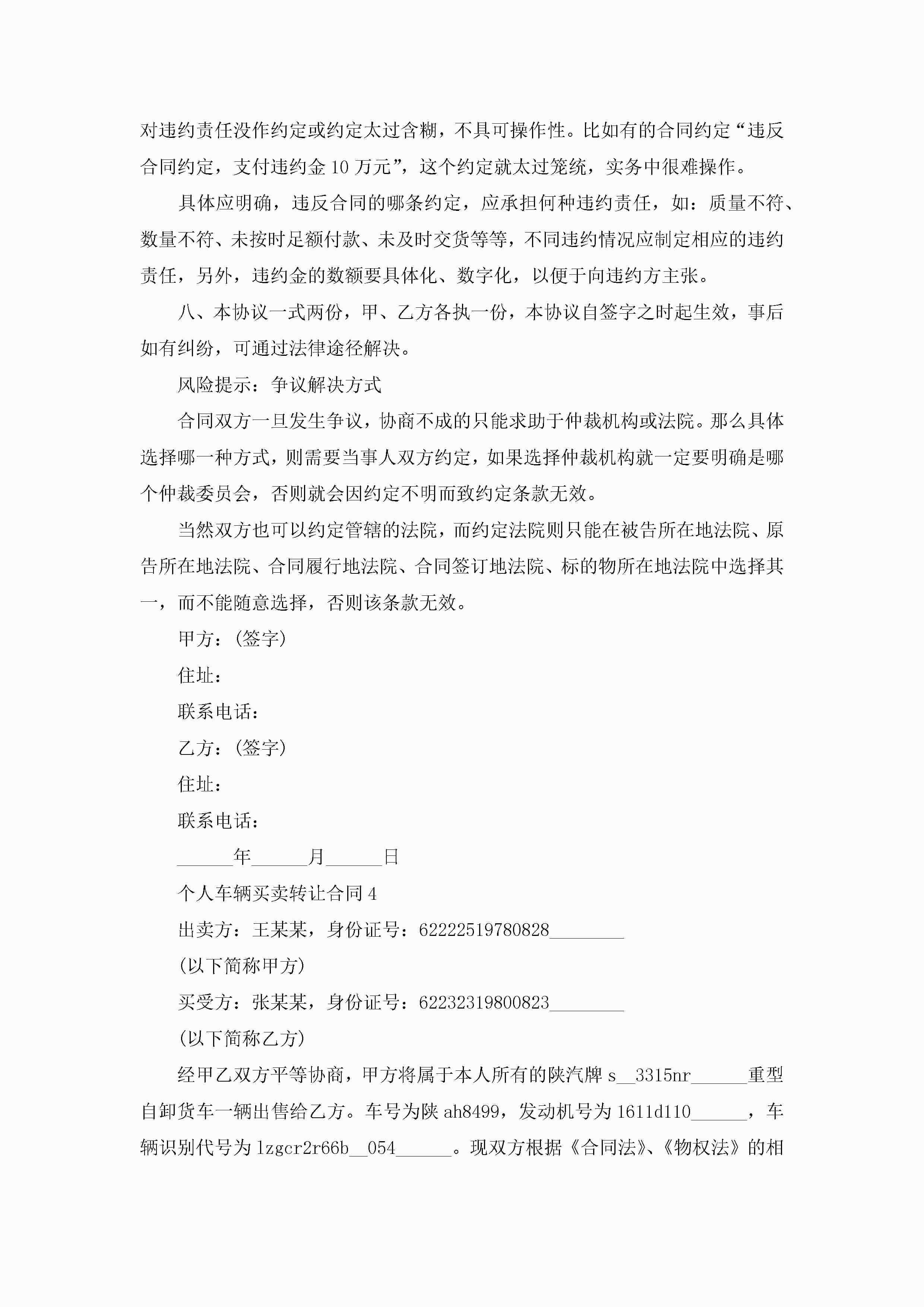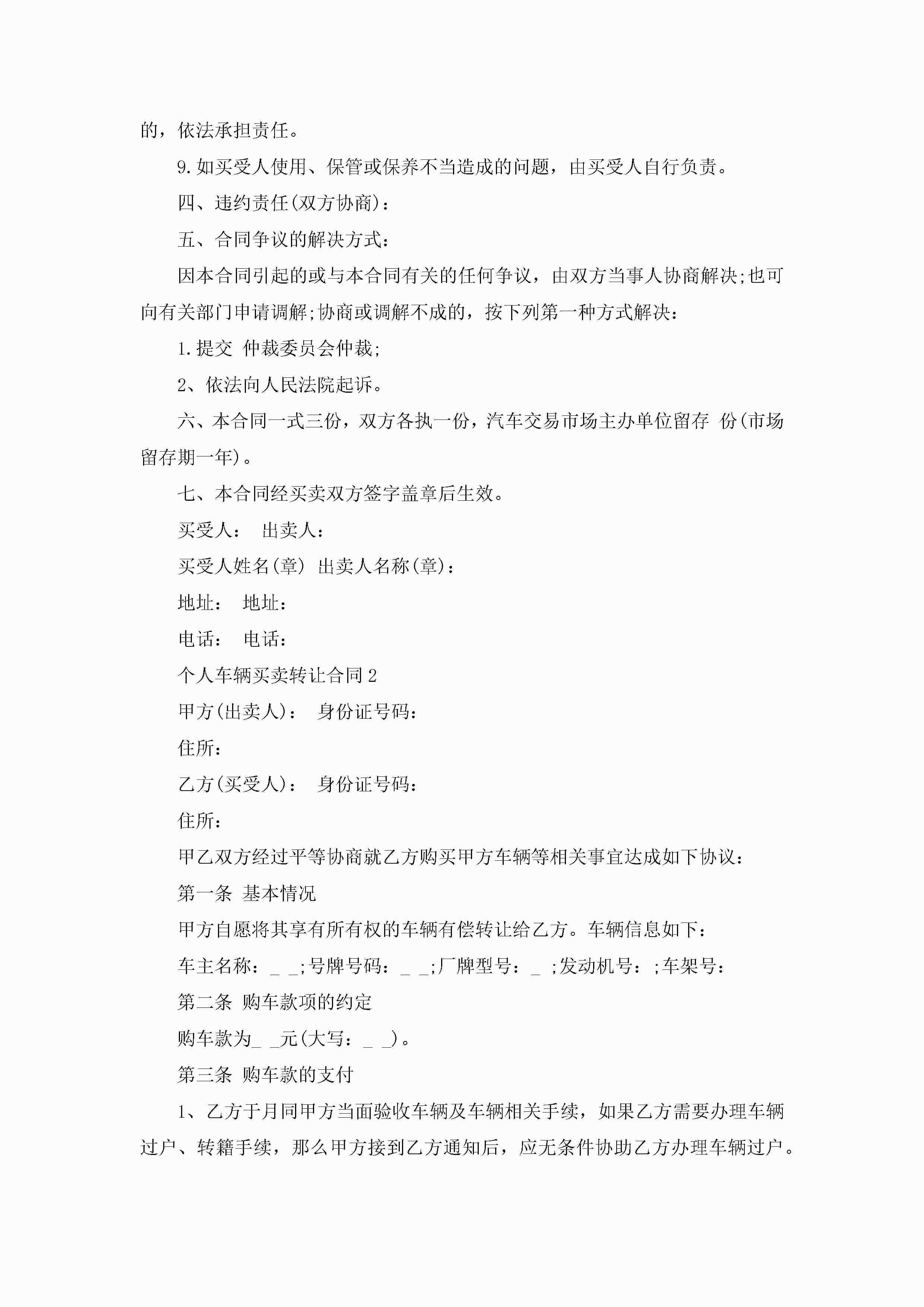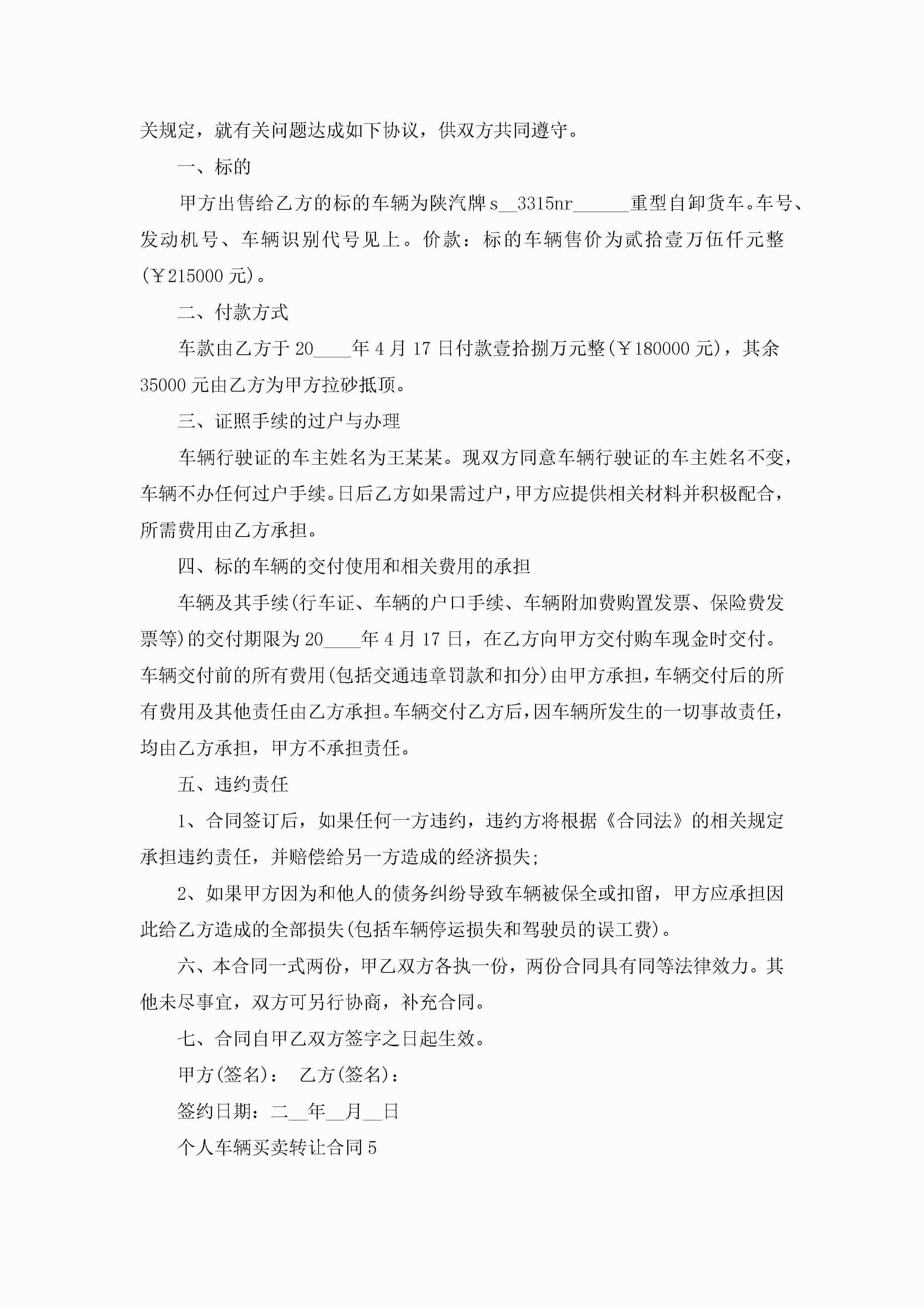 个人车辆买卖转让合同5篇jugei3月23日 01:38发布关注220 个人车辆买卖转让合同5篇此内容为付费资源,请付费后查看¥10.9 单篇文档限时特惠¥15个人会员开通企业会员开通立即下载无需登陆!可直接快捷下载单个模板付费资源© 版权声明THE ENDWord模板# 实用文档# 实用模板# 合同模板# 买卖合同 如有问题,可点击最底部“联系我们”联系客服 分享QQ空间微博QQ好友海报分享复制链接收藏