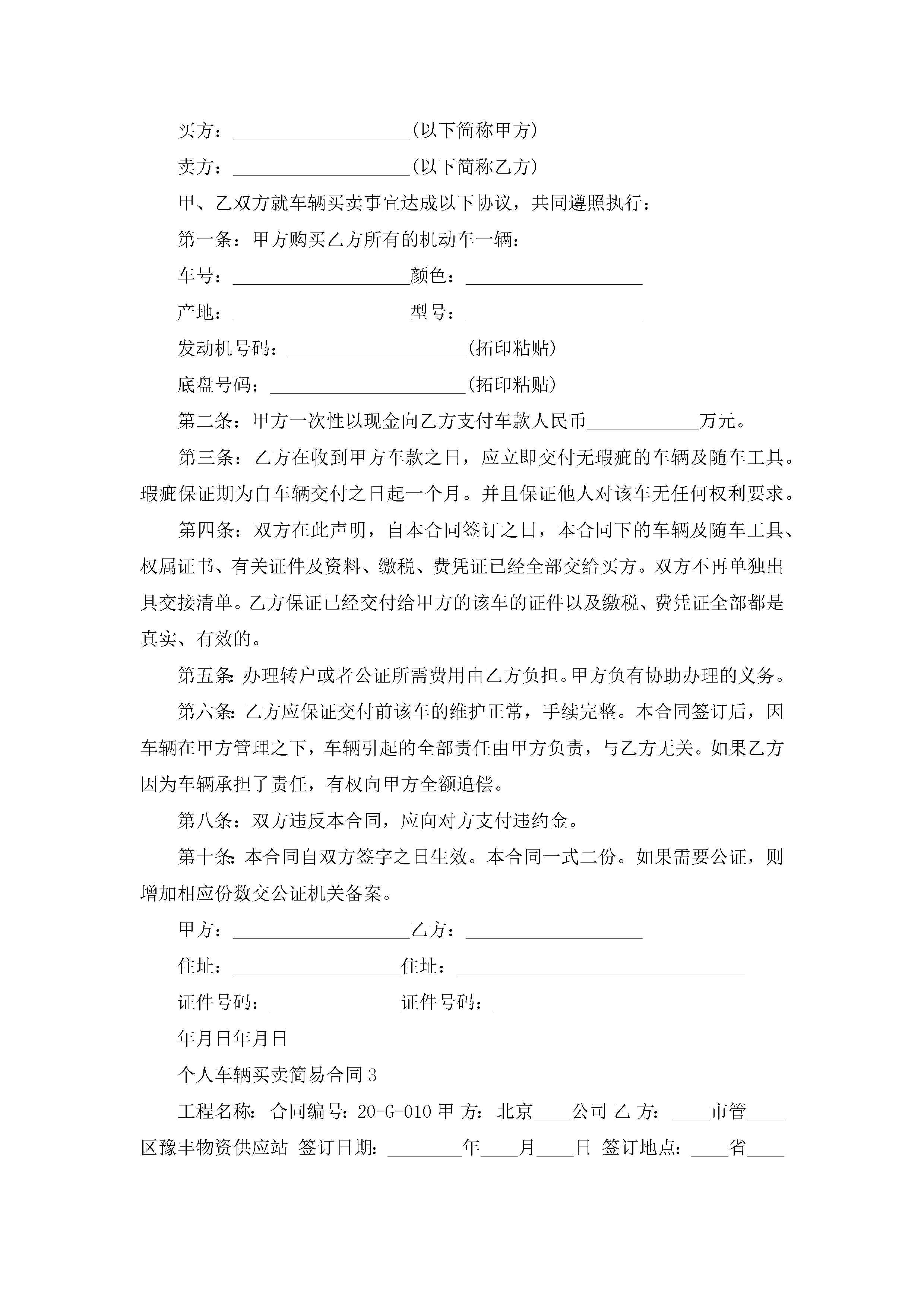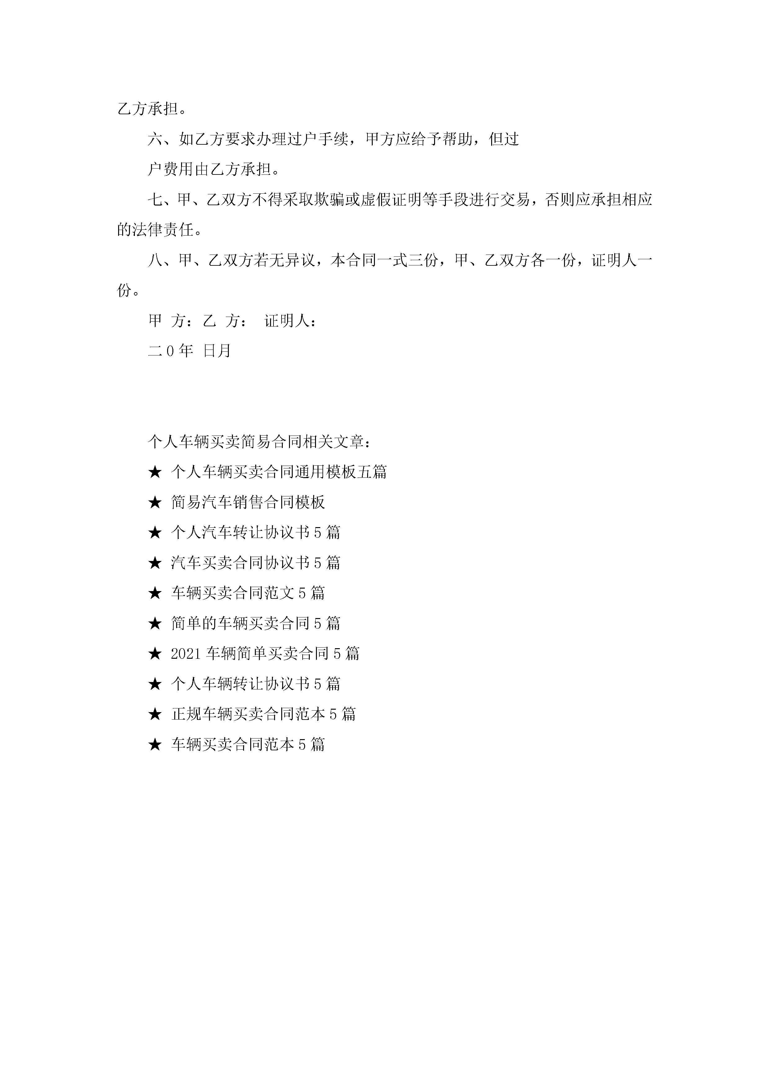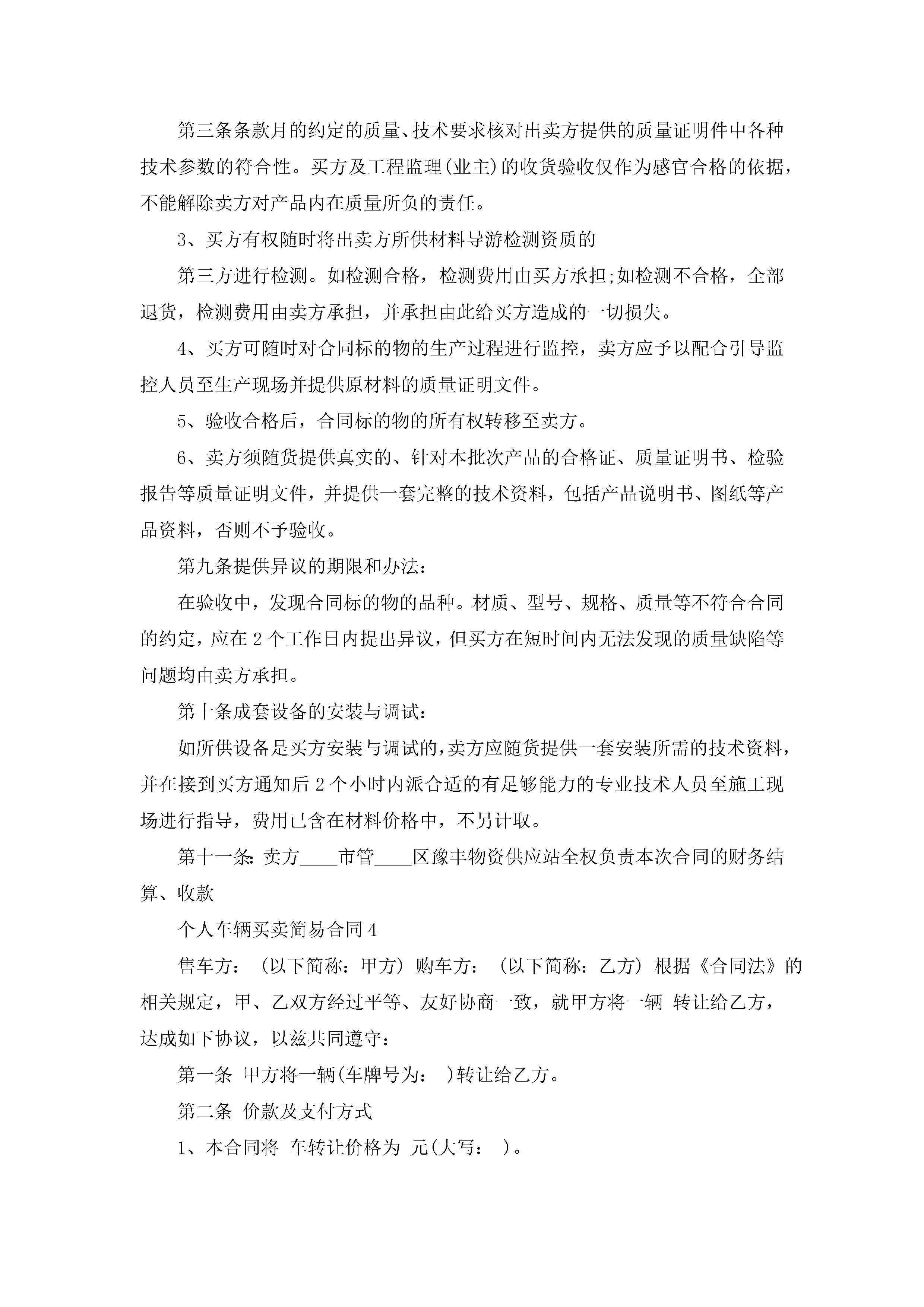 个人车辆买卖简易合同5篇jugei3月23日 01:38发布关注194 个人车辆买卖简易合同5篇此内容为付费资源,请付费后查看¥10.9 单篇文档限时特惠¥15个人会员开通企业会员开通立即下载无需登陆!可直接快捷下载单个模板付费资源© 版权声明THE ENDWord模板# 实用文档# 实用模板# 合同模板# 买卖合同 如有问题,可点击最底部“联系我们”联系客服 分享QQ空间微博QQ好友海报分享复制链接收藏