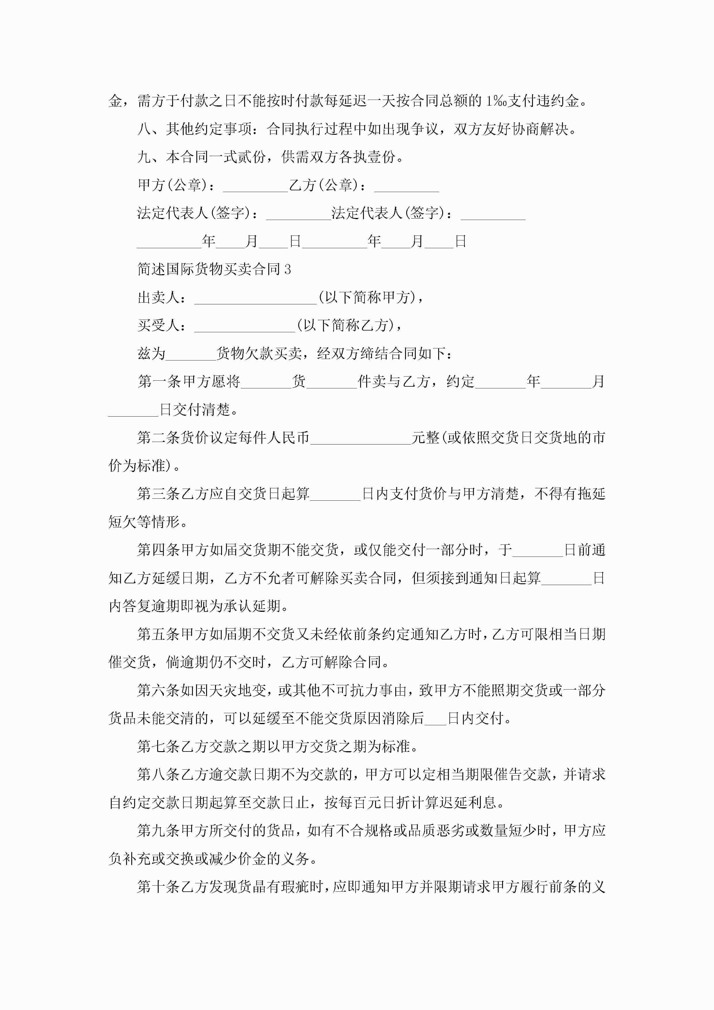 最新简述国际货物买卖合同5篇jugei3月23日 01:38发布关注191 最新简述国际货物买卖合同5篇此内容为付费资源,请付费后查看¥10.9 单篇文档限时特惠¥15个人会员开通企业会员开通立即下载无需登陆!可直接快捷下载单个模板付费资源© 版权声明THE ENDWord模板# 实用文档# 实用模板# 合同模板# 买卖合同 如有问题,可点击最底部“联系我们”联系客服 分享QQ空间微博QQ好友海报分享复制链接收藏