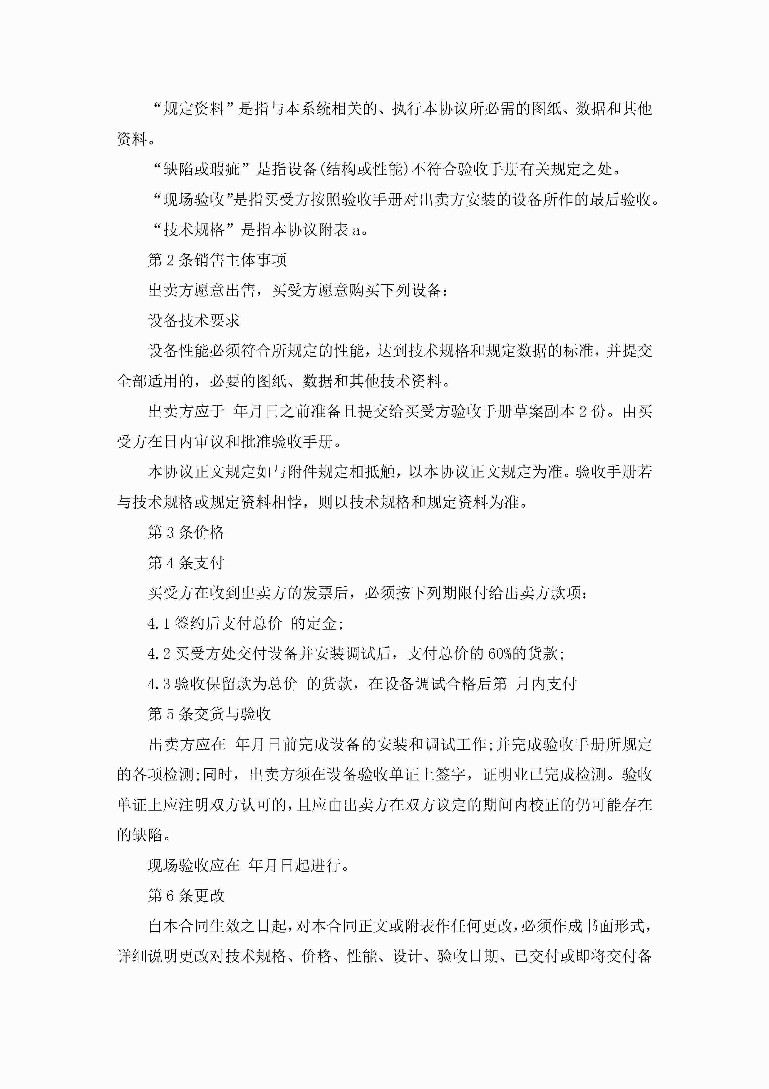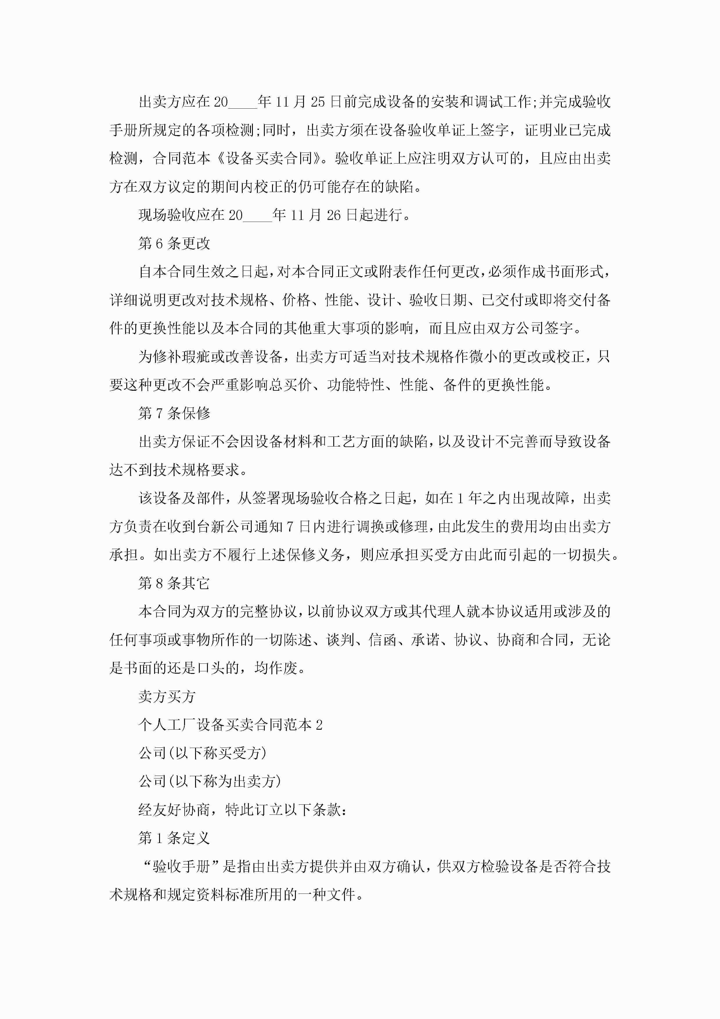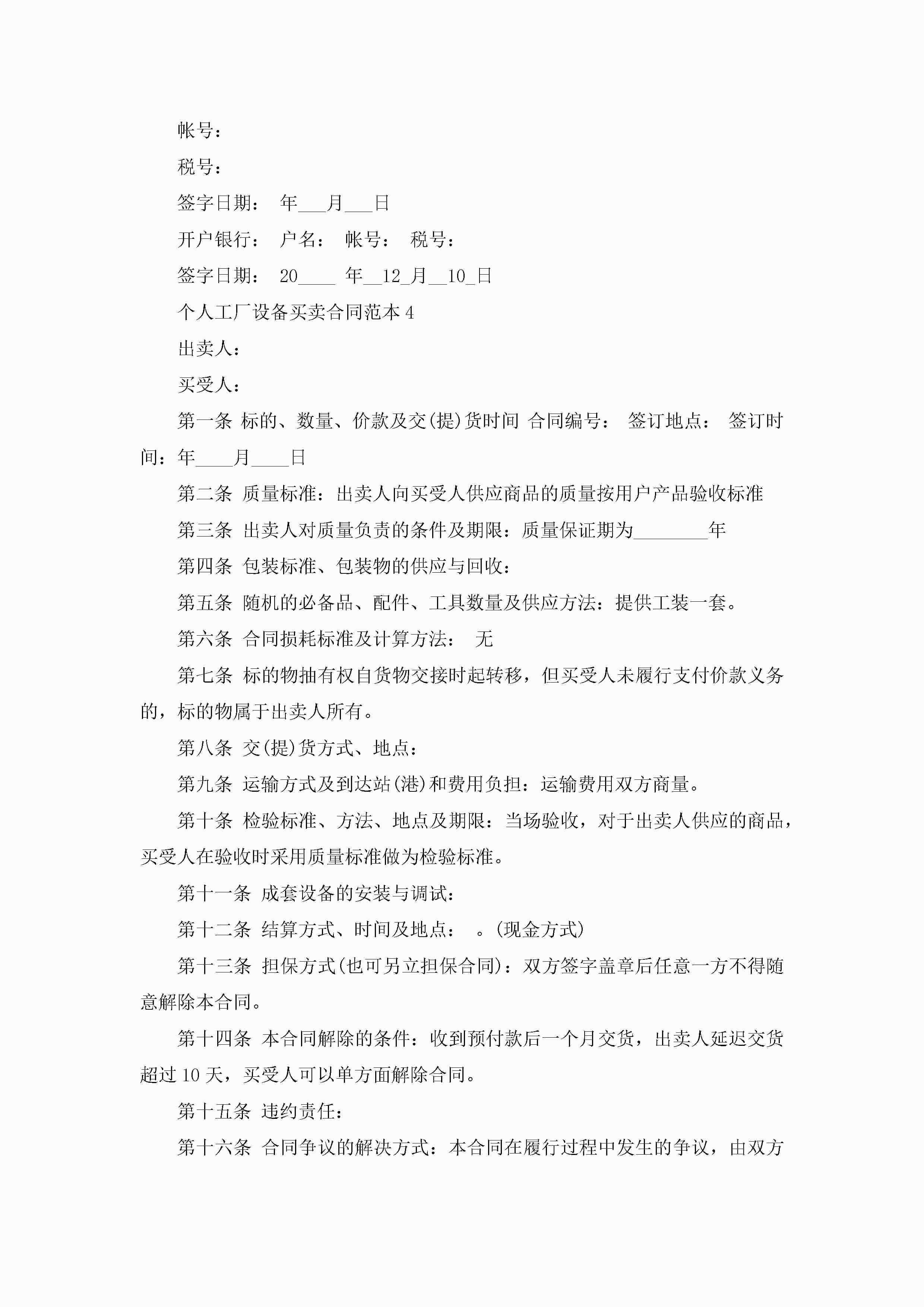 个人工厂设备买卖合同范本5篇jugei3月23日 01:38发布关注306 个人工厂设备买卖合同范本5篇此内容为付费资源,请付费后查看¥10.9 单篇文档限时特惠¥15个人会员开通企业会员开通立即下载无需登陆!可直接快捷下载单个模板付费资源© 版权声明THE ENDWord模板# 实用文档# 实用模板# 合同模板# 买卖合同 如有问题,可点击最底部“联系我们”联系客服 分享QQ空间微博QQ好友海报分享复制链接收藏