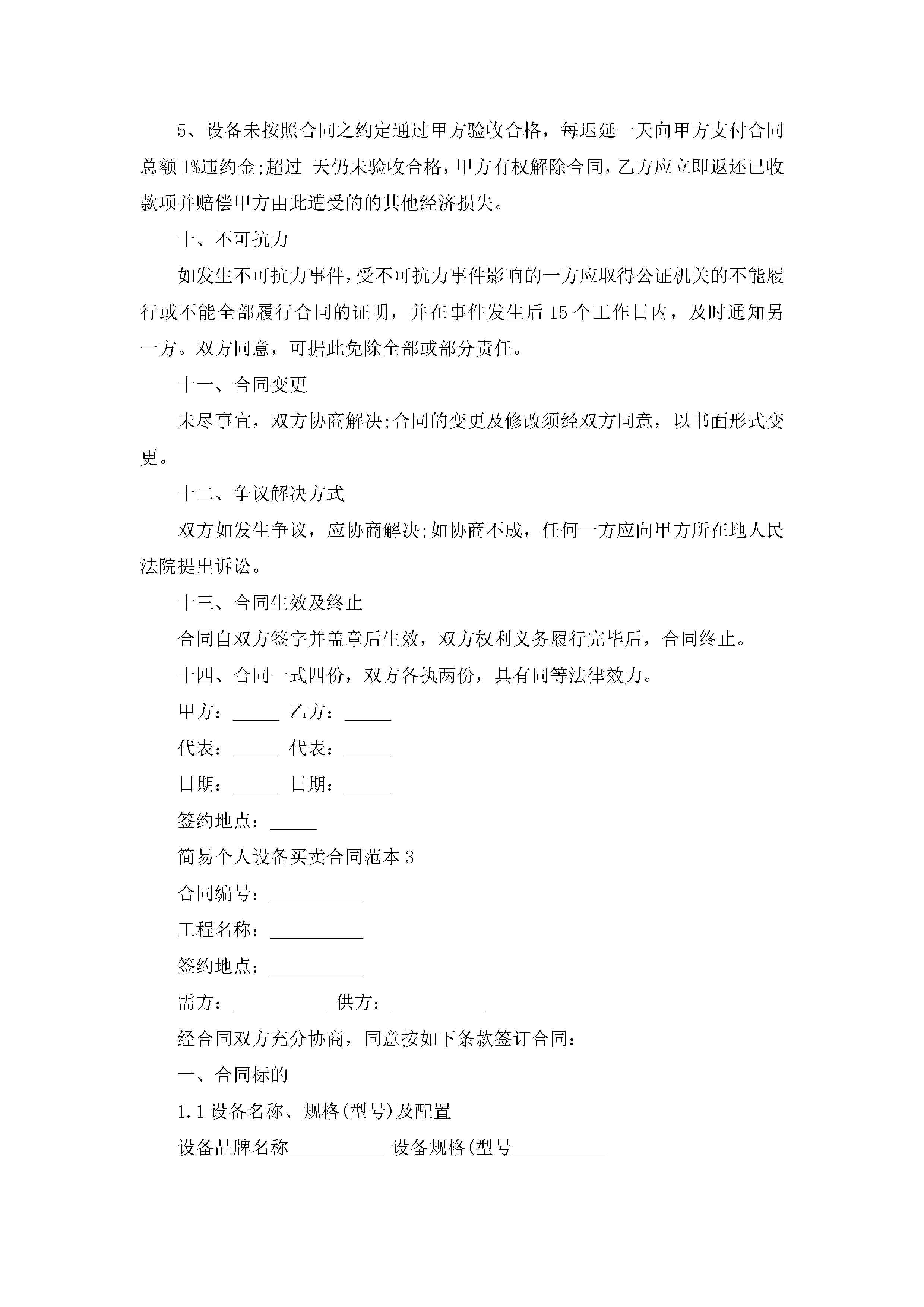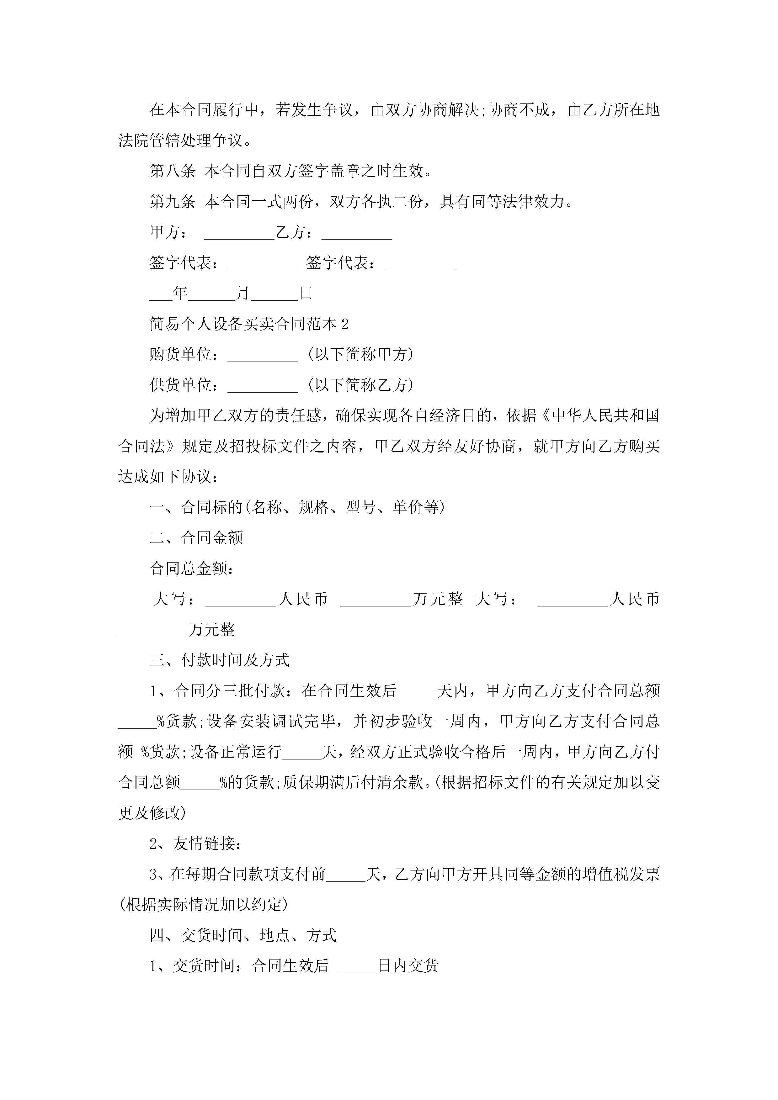 简易个人设备买卖合同范本5篇jugei3月23日 01:38发布关注189 简易个人设备买卖合同范本5篇此内容为付费资源,请付费后查看¥10.9 单篇文档限时特惠¥15个人会员开通企业会员开通立即下载无需登陆!可直接快捷下载单个模板付费资源© 版权声明THE ENDWord模板# 实用文档# 实用模板# 合同模板# 买卖合同 如有问题,可点击最底部“联系我们”联系客服 分享QQ空间微博QQ好友海报分享复制链接收藏