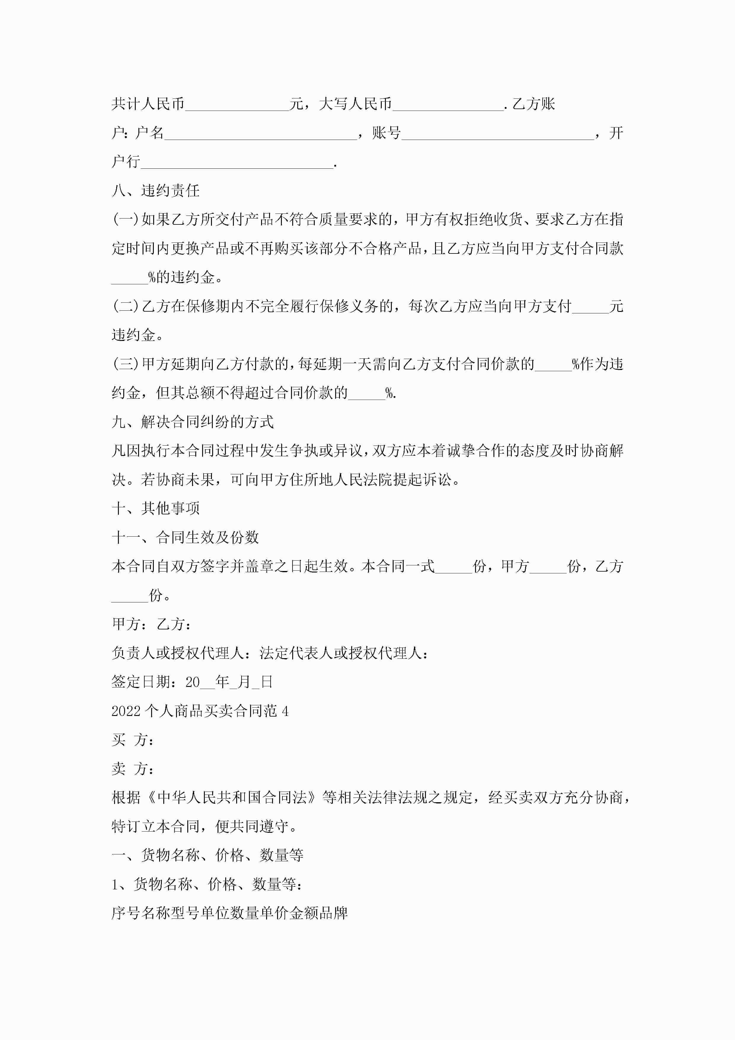 2022个人商品买卖合同范本5篇怎么写jugei3月23日 01:38发布关注205 2022个人商品买卖合同范本5篇怎么写此内容为付费资源,请付费后查看¥10.9 单篇文档限时特惠¥15个人会员开通企业会员开通立即下载无需登陆!可直接快捷下载单个模板付费资源© 版权声明THE ENDWord模板# 实用文档# 实用模板# 合同模板# 买卖合同 如有问题,可点击最底部“联系我们”联系客服 分享QQ空间微博QQ好友海报分享复制链接收藏