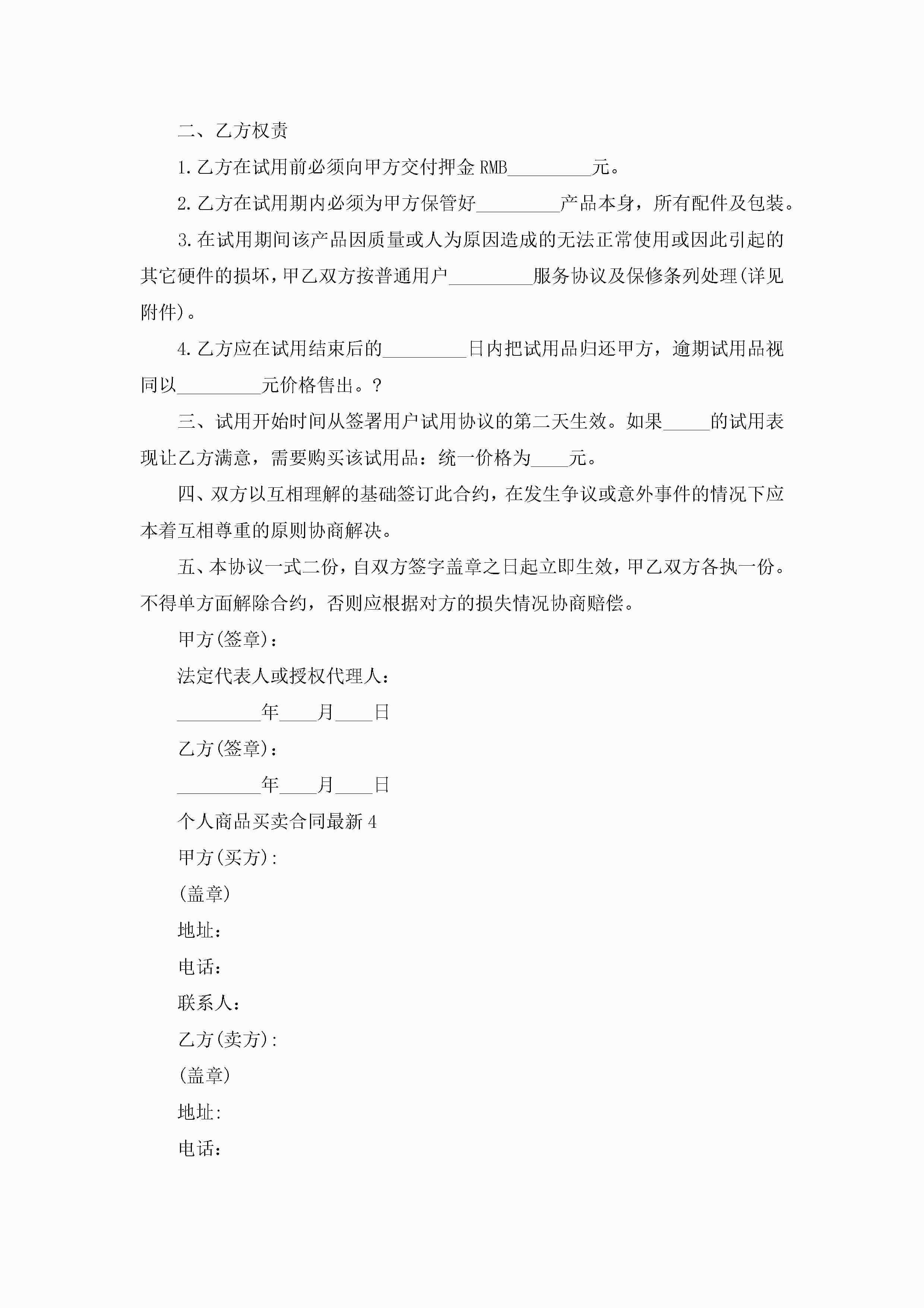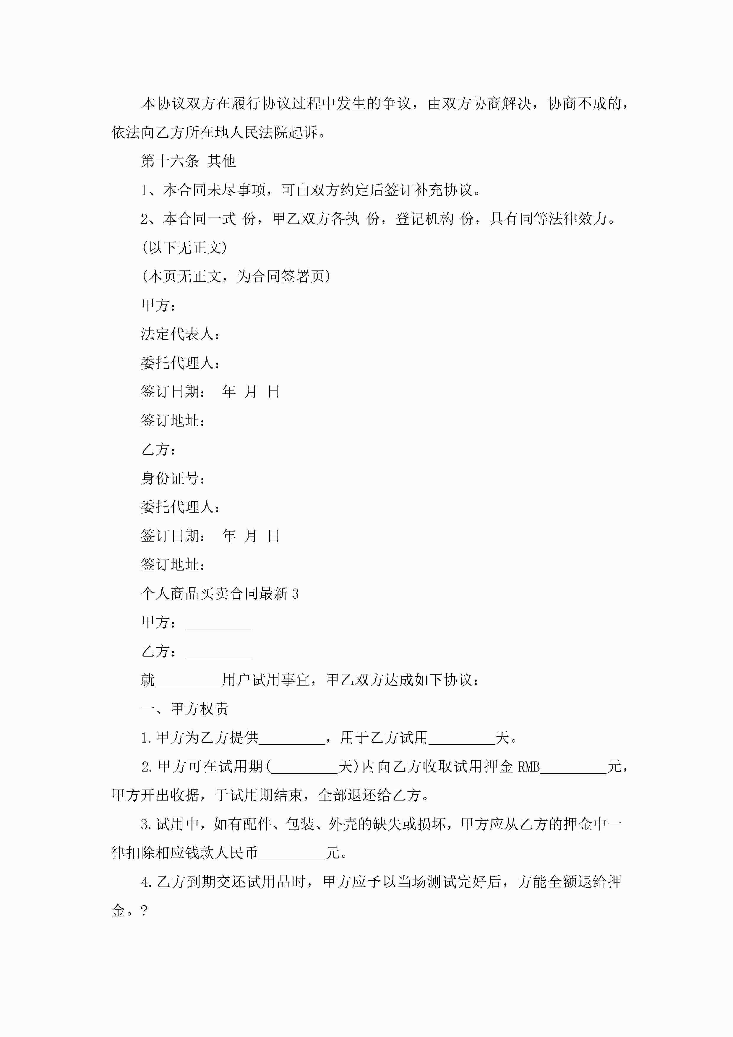 关于个人商品买卖合同最新5篇jugei3月23日 01:38发布关注186 关于个人商品买卖合同最新5篇此内容为付费资源,请付费后查看¥10.9 单篇文档限时特惠¥15个人会员开通企业会员开通立即下载无需登陆!可直接快捷下载单个模板付费资源© 版权声明THE ENDWord模板# 实用文档# 实用模板# 合同模板# 买卖合同 如有问题,可点击最底部“联系我们”联系客服 分享QQ空间微博QQ好友海报分享复制链接收藏