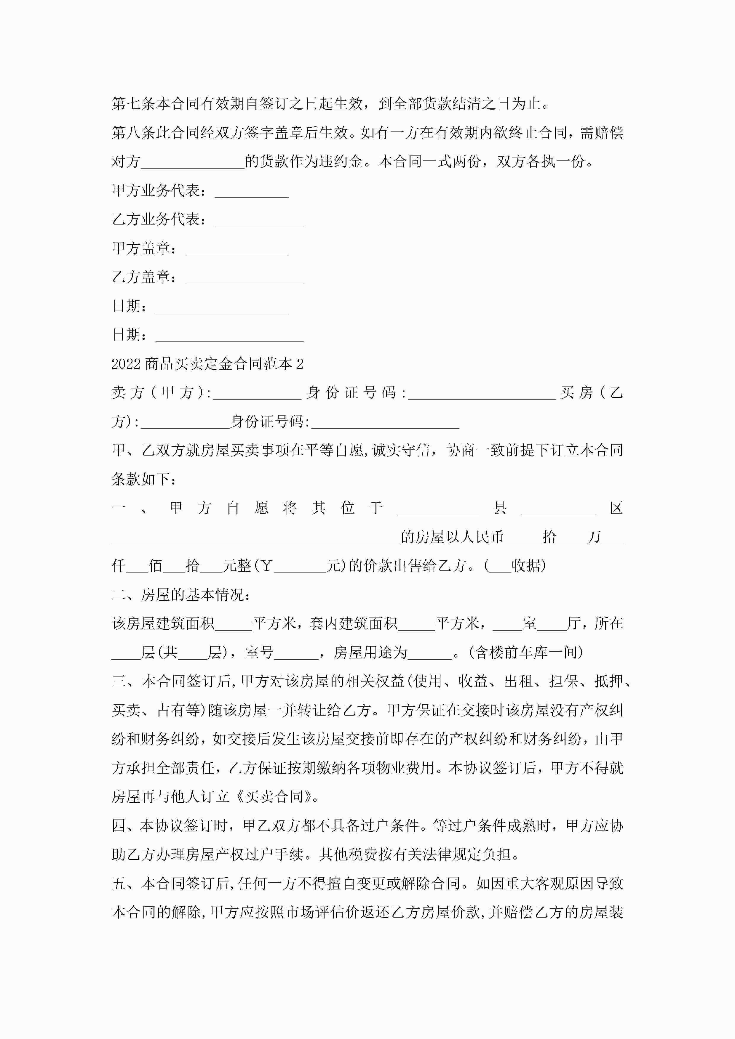 2022商品买卖定金合同范本5篇怎么写jugei3月23日 01:38发布关注188 2022商品买卖定金合同范本5篇怎么写此内容为付费资源,请付费后查看¥10.9 单篇文档限时特惠¥15个人会员开通企业会员开通立即下载无需登陆!可直接快捷下载单个模板付费资源© 版权声明THE ENDWord模板# 实用文档# 实用模板# 合同模板# 买卖合同 如有问题,可点击最底部“联系我们”联系客服 分享QQ空间微博QQ好友海报分享复制链接收藏
