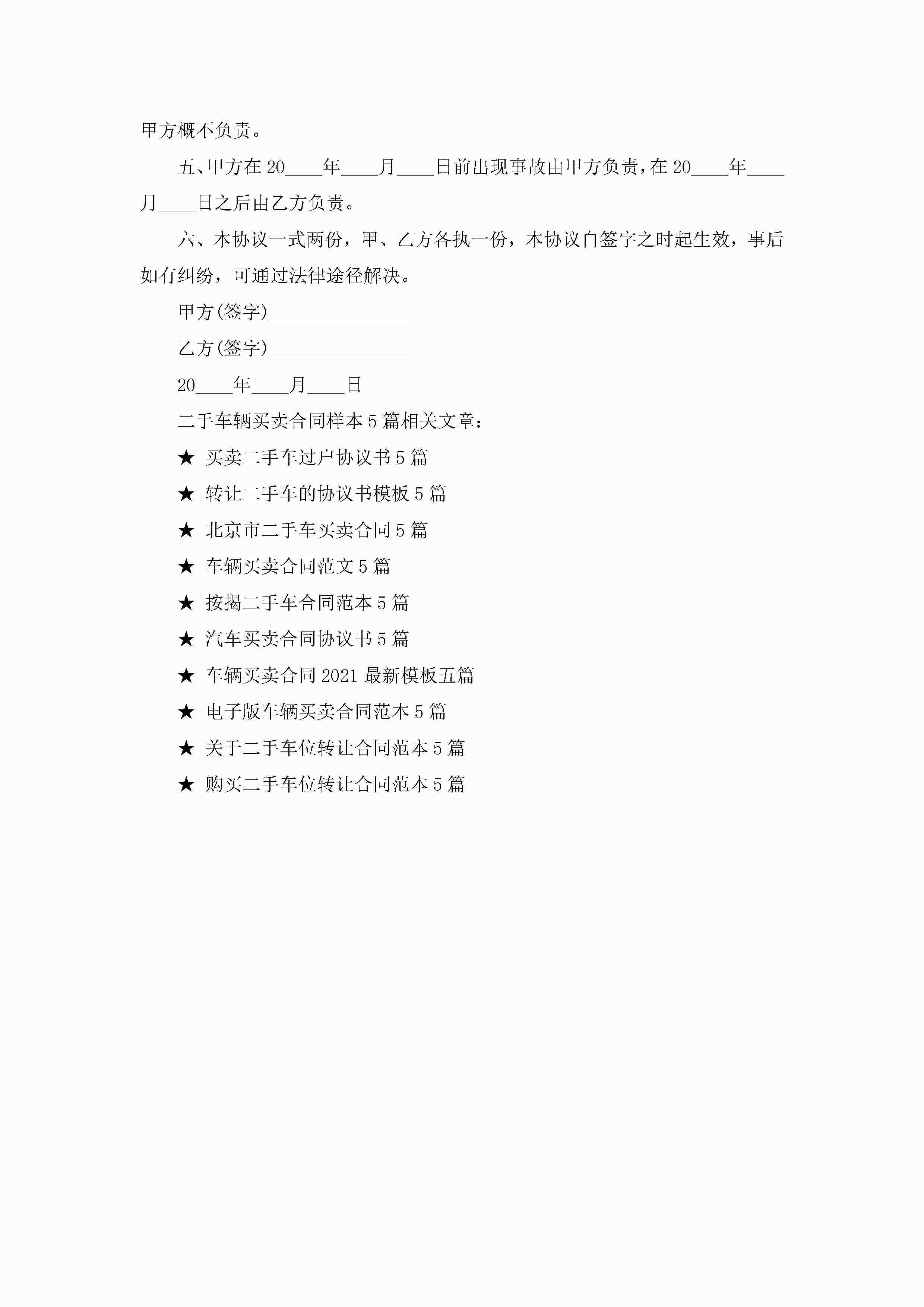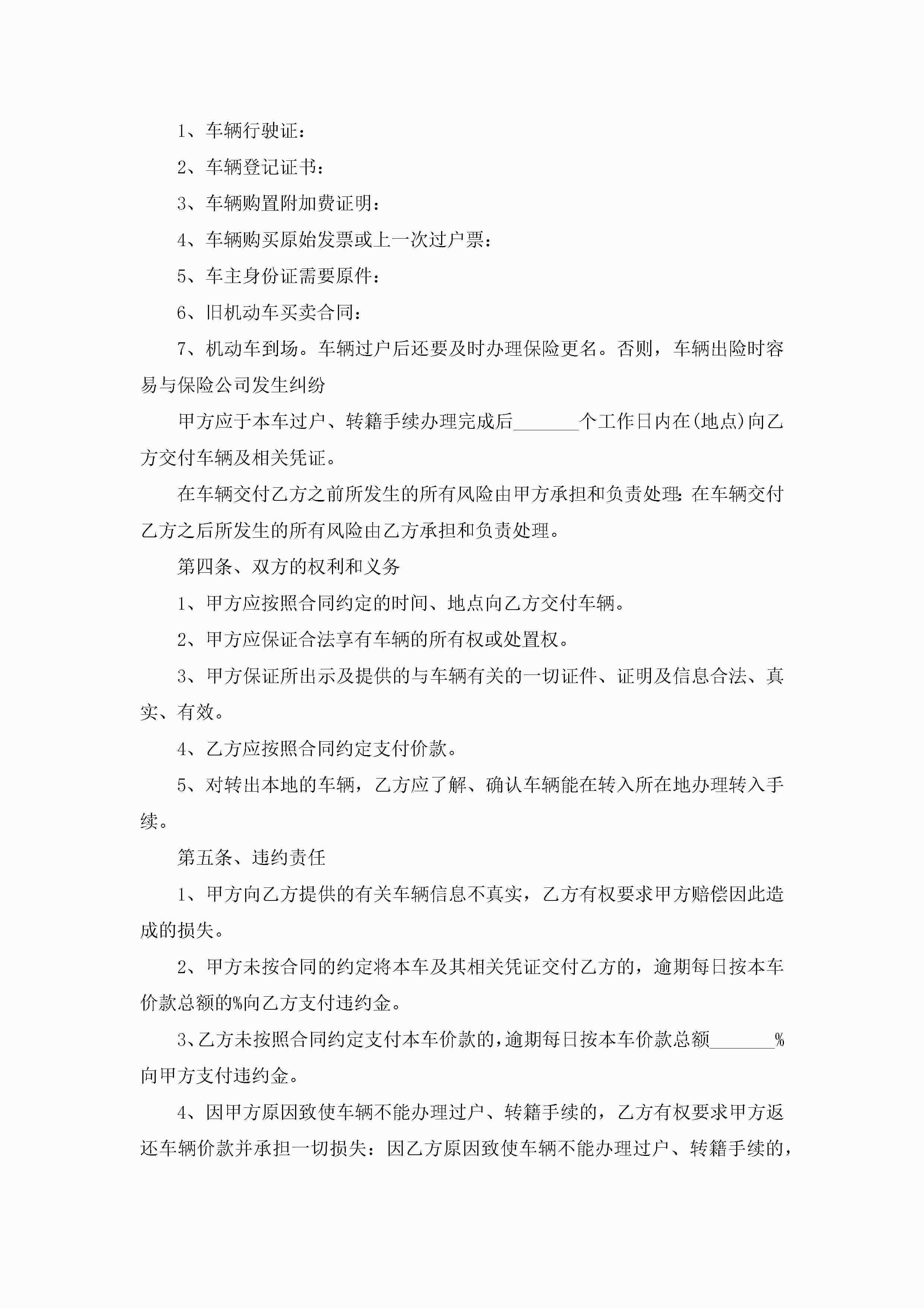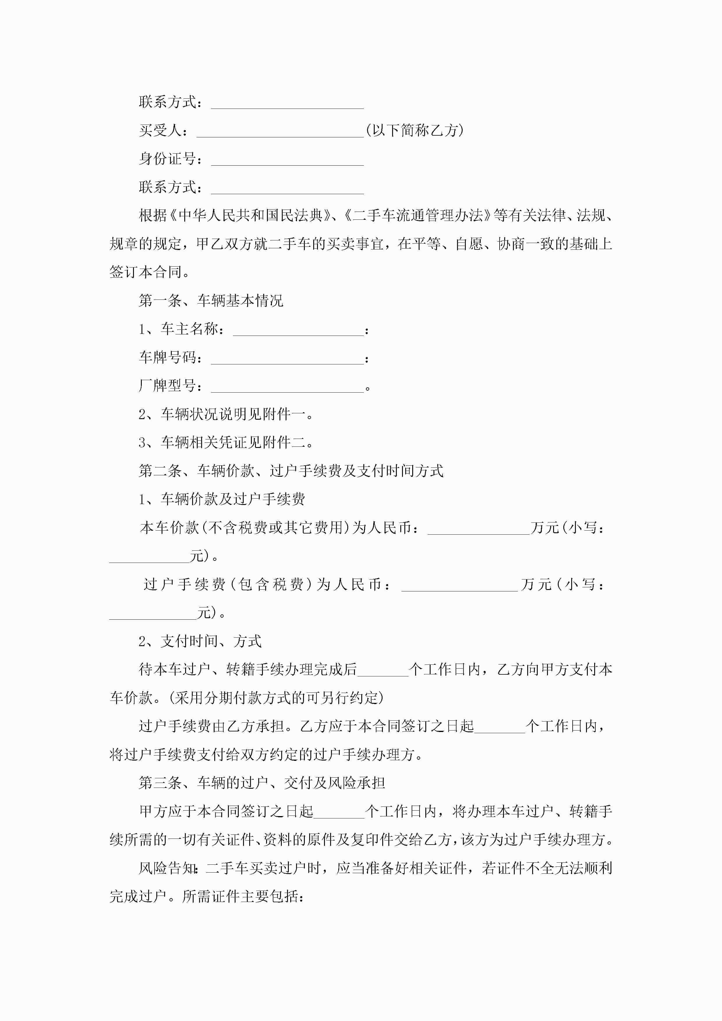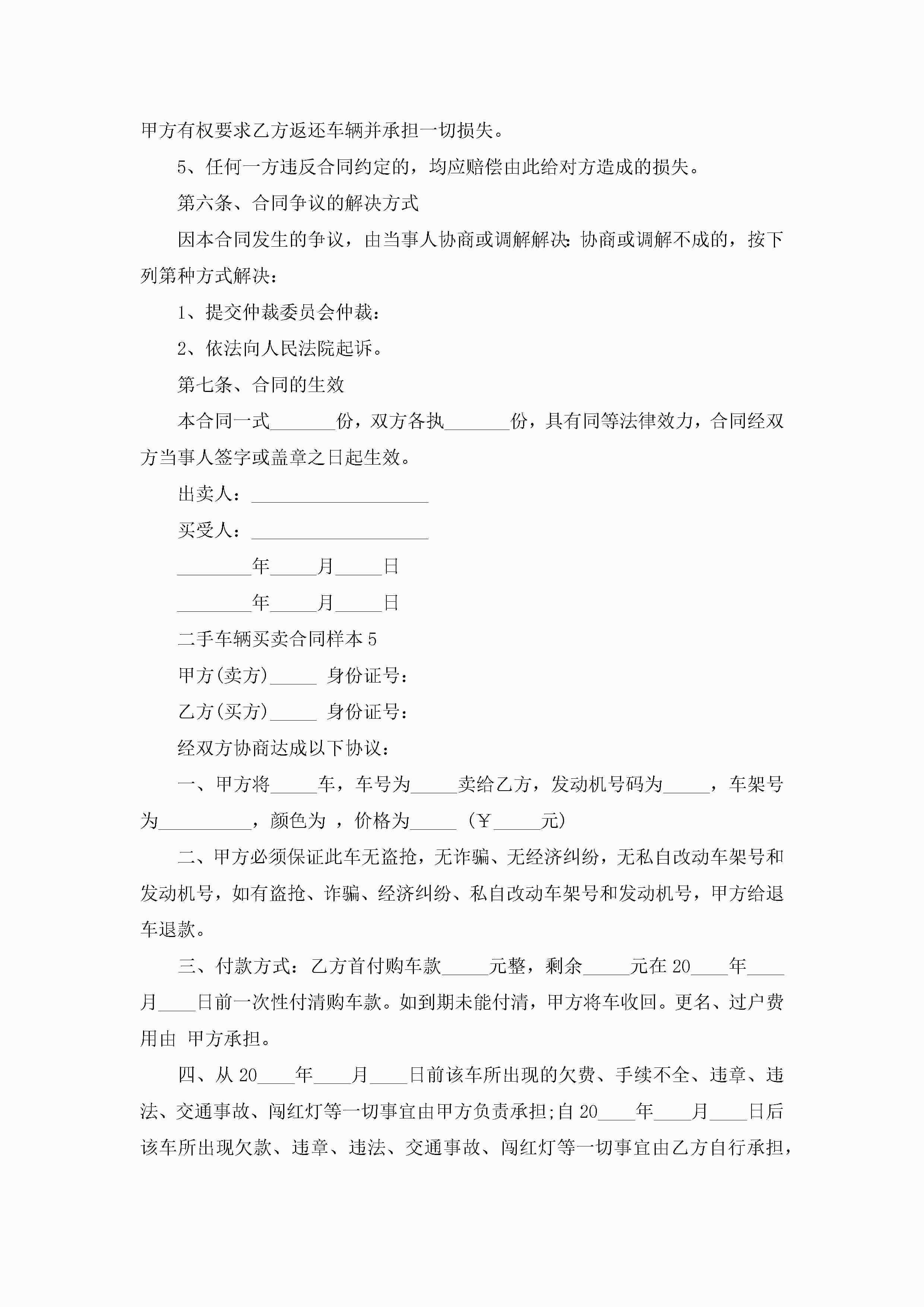 关于二手车辆买卖合同样本5篇jugei3月23日 01:38发布关注185 关于二手车辆买卖合同样本5篇此内容为付费资源,请付费后查看¥10.9 单篇文档限时特惠¥15个人会员开通企业会员开通立即下载无需登陆!可直接快捷下载单个模板付费资源© 版权声明THE ENDWord模板# 实用文档# 实用模板# 合同模板# 买卖合同 如有问题,可点击最底部“联系我们”联系客服 分享QQ空间微博QQ好友海报分享复制链接收藏