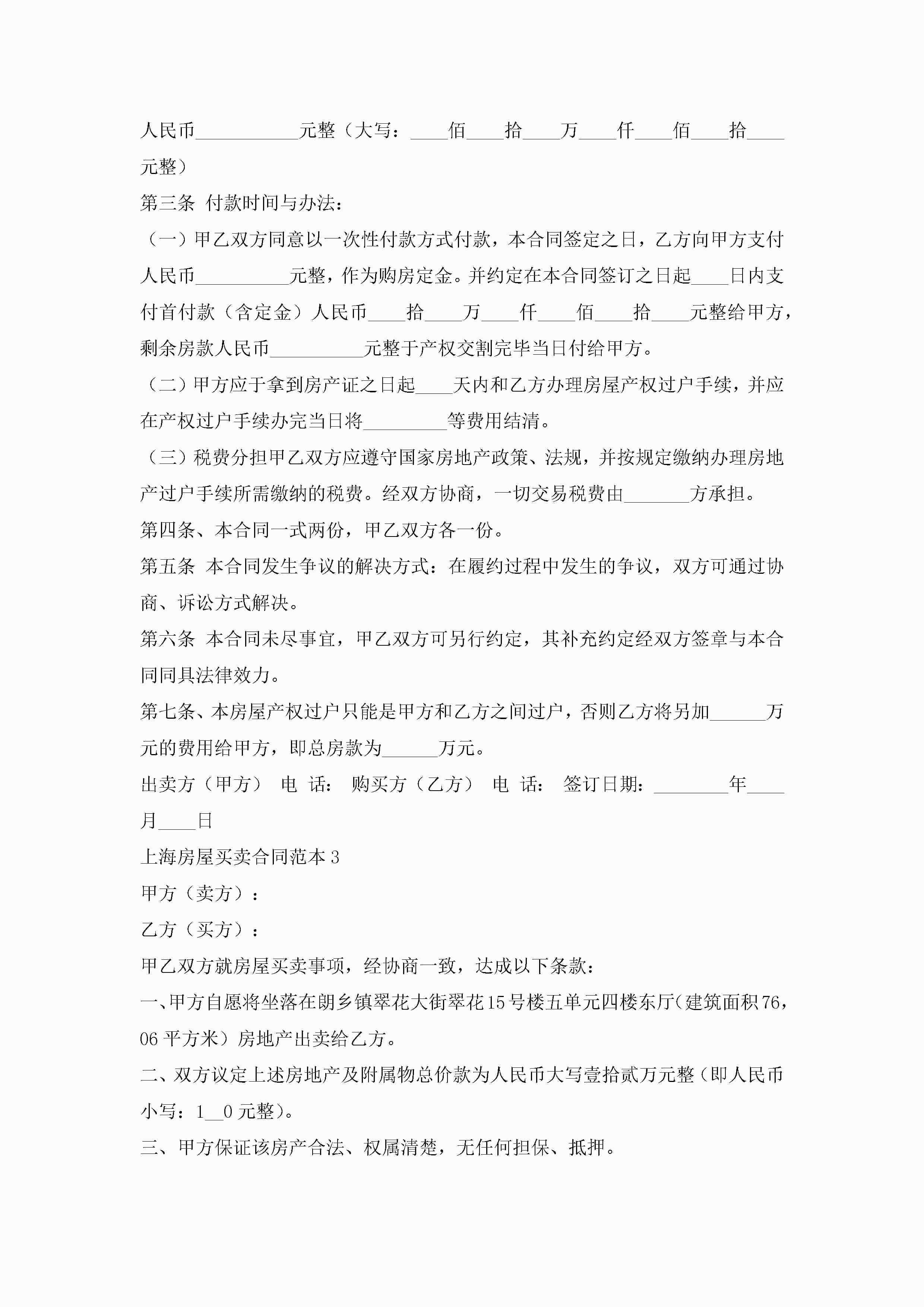 上海房屋买卖合同范本5篇jugei3月23日 01:38发布关注242 上海房屋买卖合同范本5篇此内容为付费资源,请付费后查看¥10.9 单篇文档限时特惠¥15个人会员开通企业会员开通立即下载无需登陆!可直接快捷下载单个模板付费资源© 版权声明THE ENDWord模板# 实用文档# 实用模板# 合同模板# 买卖合同 如有问题,可点击最底部“联系我们”联系客服 分享QQ空间微博QQ好友海报分享复制链接收藏