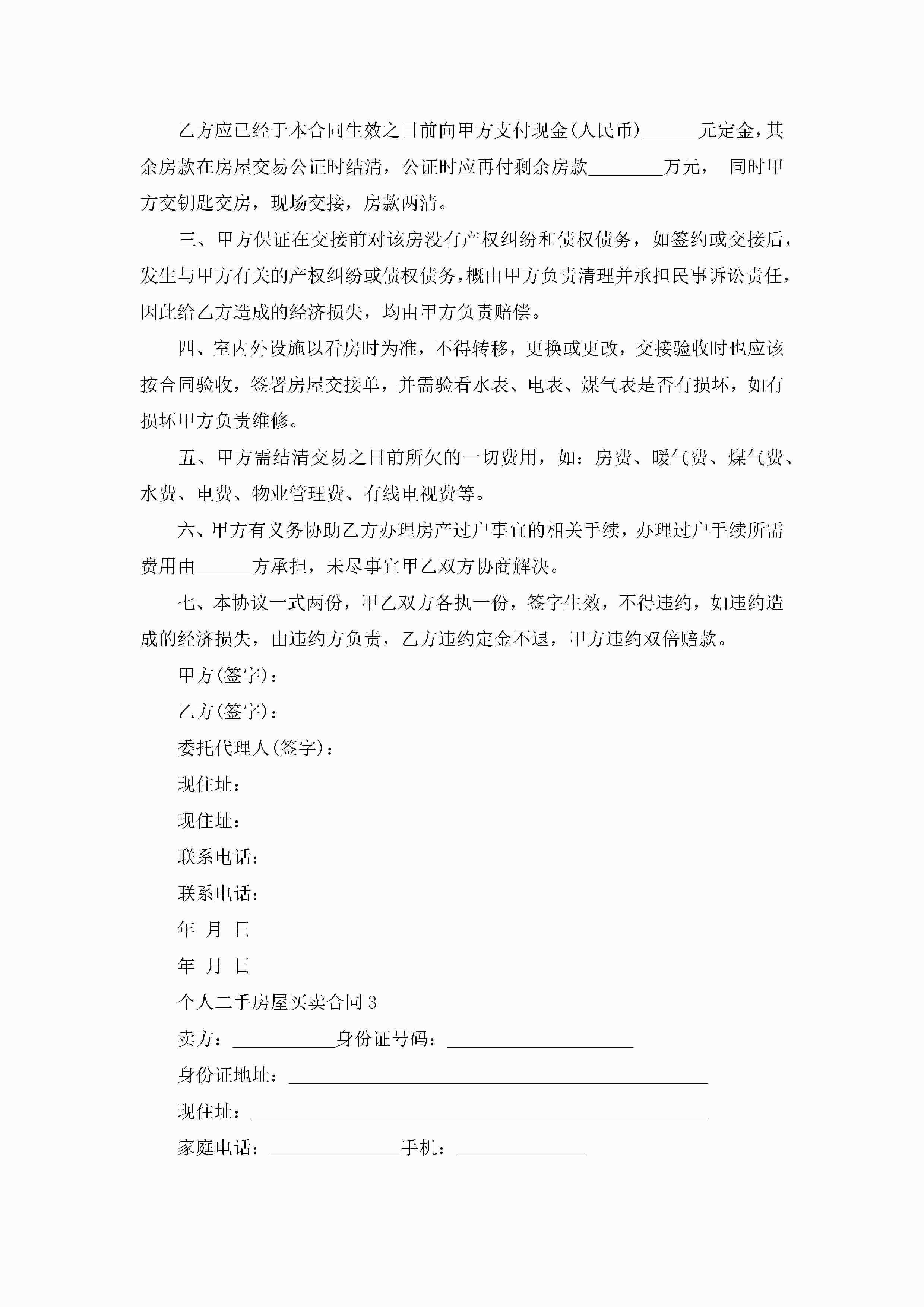 个人二手房屋买卖合同(精选5篇)jugei3月23日 01:38发布关注185 个人二手房屋买卖合同(精选5篇)此内容为付费资源,请付费后查看¥10.9 单篇文档限时特惠¥15个人会员开通企业会员开通立即下载无需登陆!可直接快捷下载单个模板付费资源© 版权声明THE ENDWord模板# 实用文档# 实用模板# 合同模板# 买卖合同 如有问题,可点击最底部“联系我们”联系客服 分享QQ空间微博QQ好友海报分享复制链接收藏