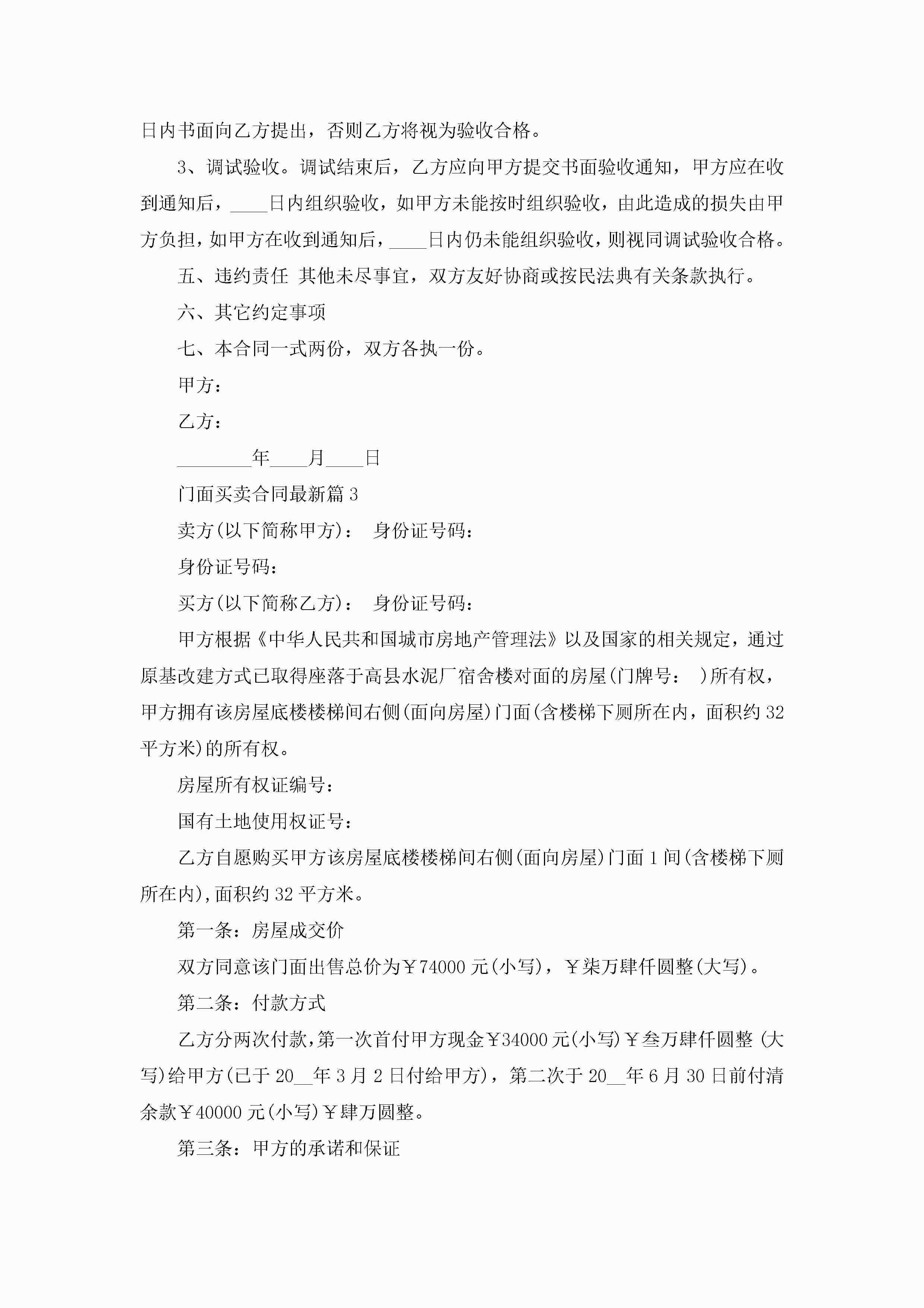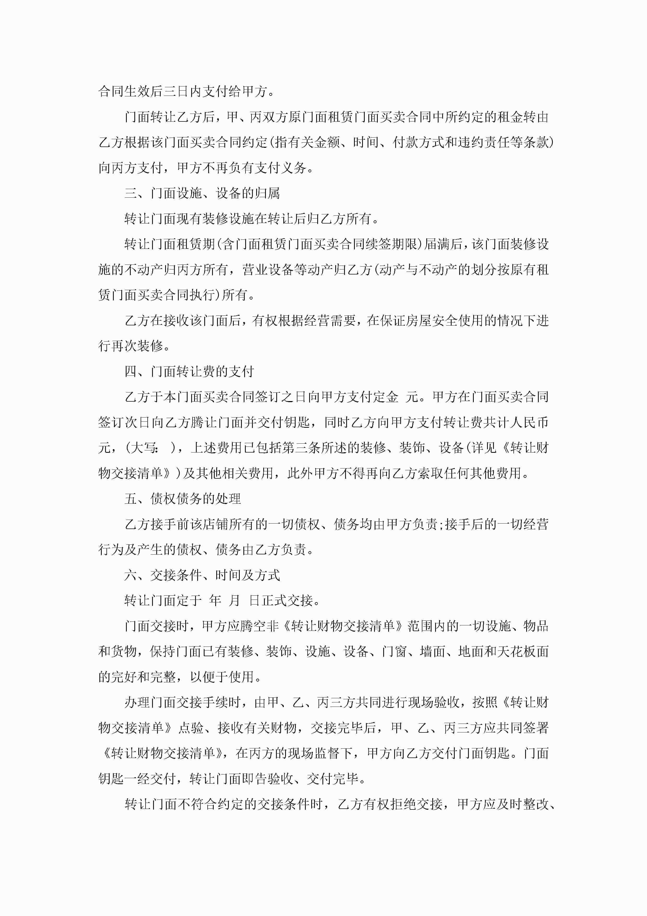 门面买卖合同最新模板jugei3月23日 01:38发布关注190 门面买卖合同最新模板此内容为付费资源,请付费后查看¥10.9 单篇文档限时特惠¥15个人会员开通企业会员开通立即下载无需登陆!可直接快捷下载单个模板付费资源© 版权声明THE ENDWord模板# 实用文档# 实用模板# 合同模板# 买卖合同 如有问题,可点击最底部“联系我们”联系客服 分享QQ空间微博QQ好友海报分享复制链接收藏