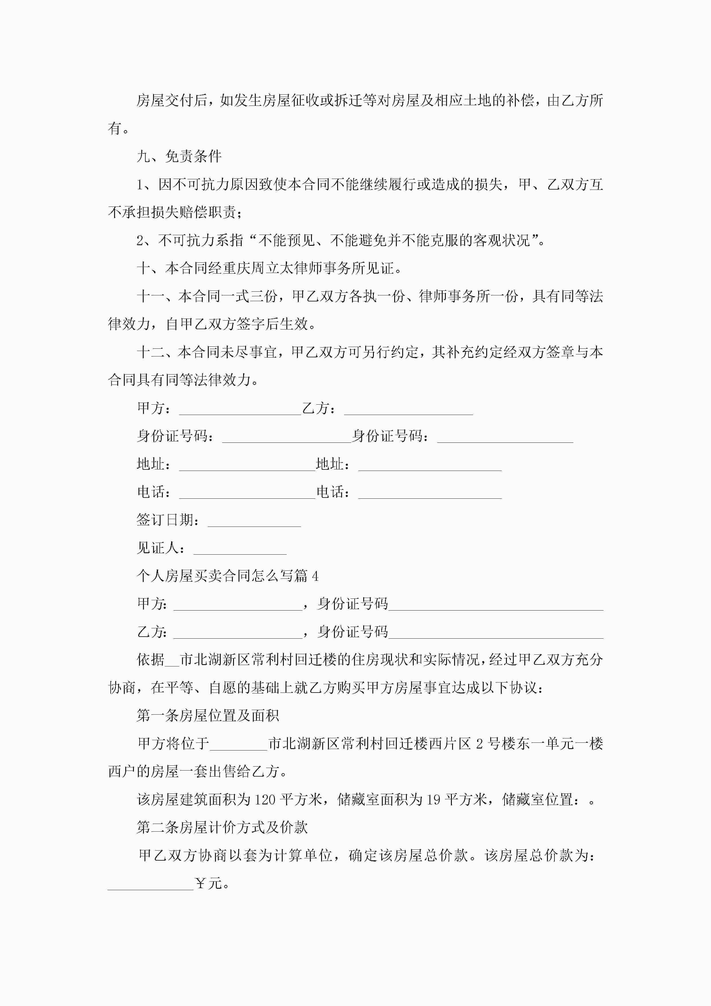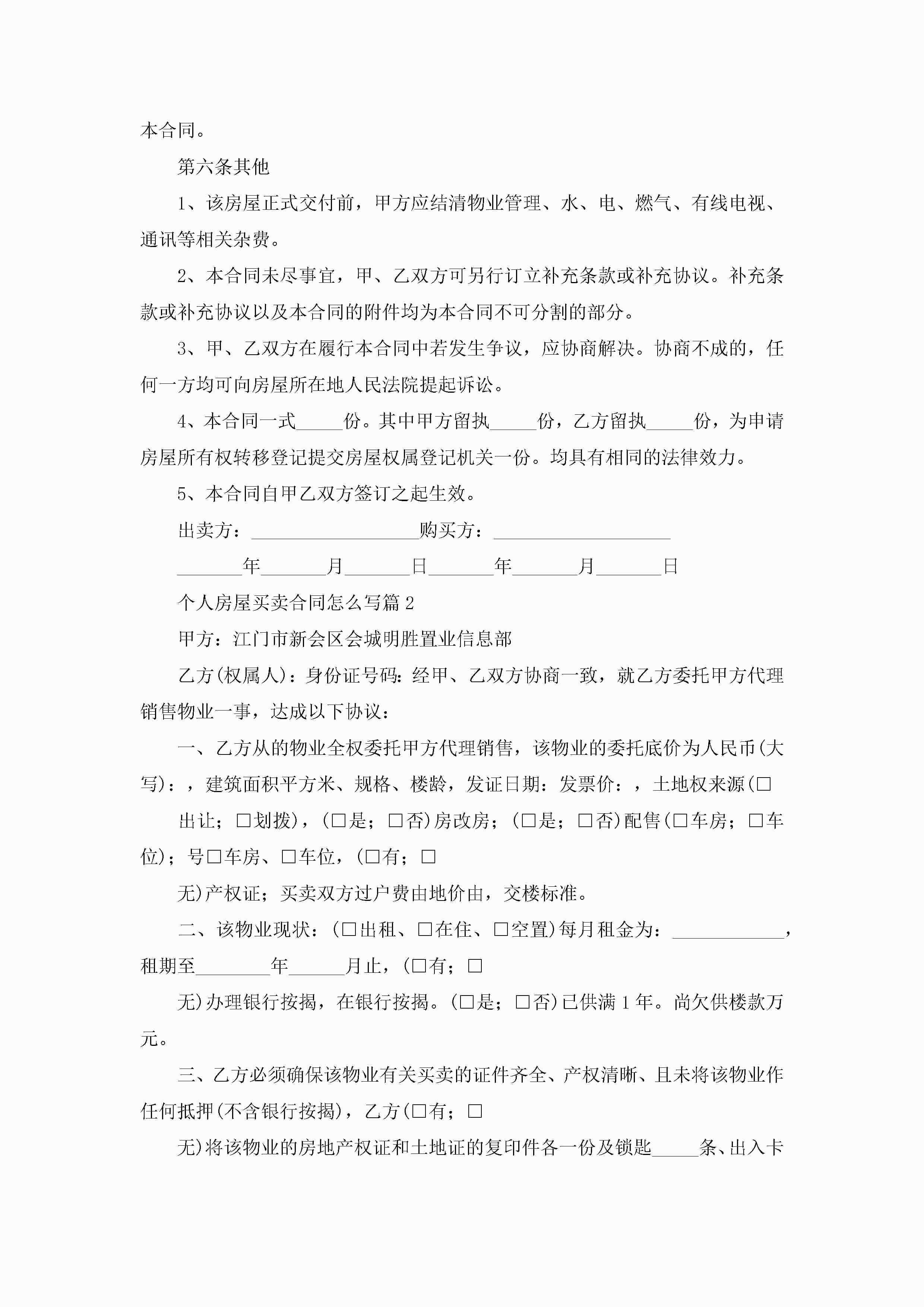 个人房屋买卖合同怎么写6篇(精选)jugei3月23日 01:38发布关注184 个人房屋买卖合同怎么写6篇(精选)此内容为付费资源,请付费后查看¥10.9 单篇文档限时特惠¥15个人会员开通企业会员开通立即下载无需登陆!可直接快捷下载单个模板付费资源© 版权声明THE ENDWord模板# 实用文档# 实用模板# 合同模板# 买卖合同 如有问题,可点击最底部“联系我们”联系客服 分享QQ空间微博QQ好友海报分享复制链接收藏