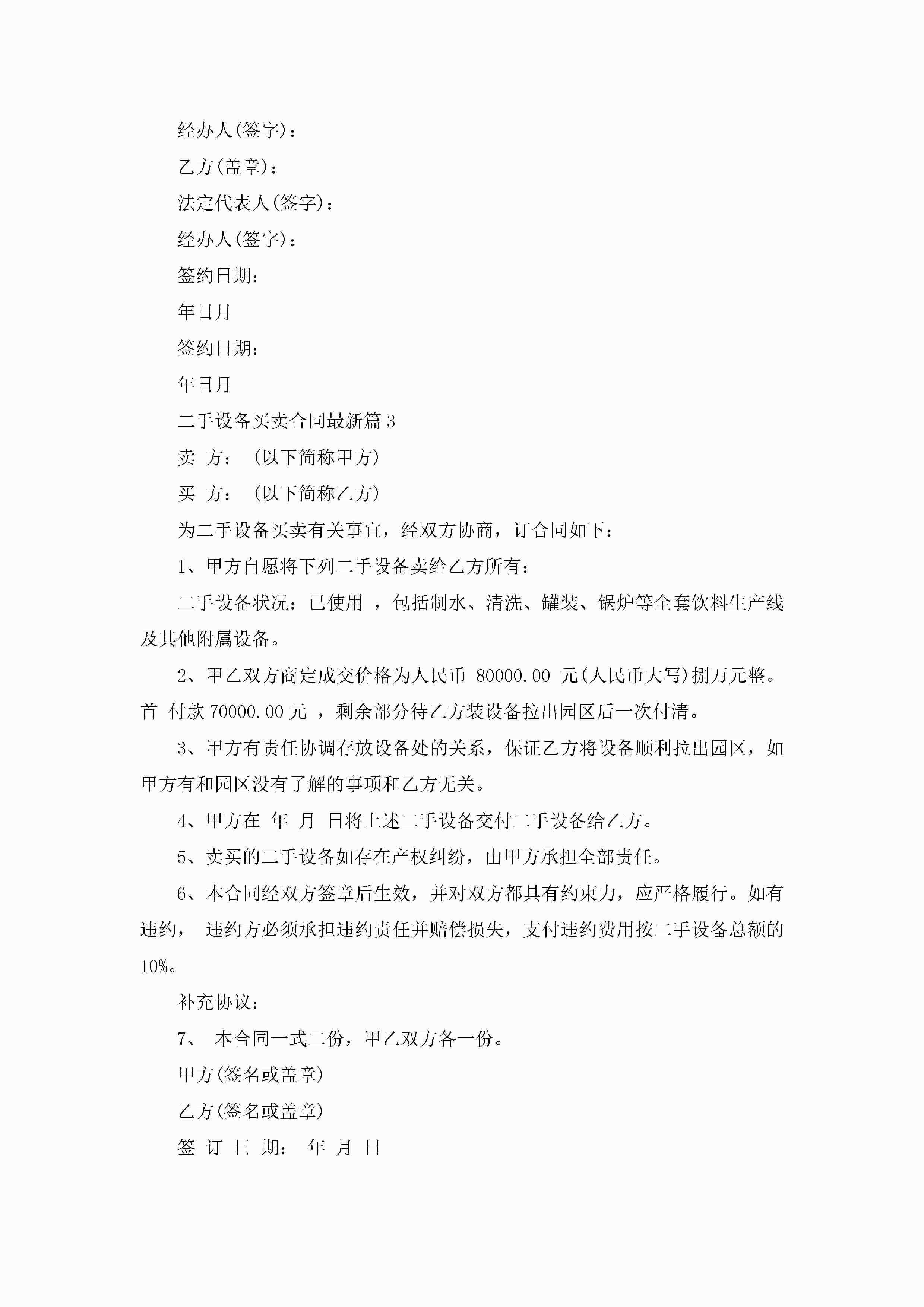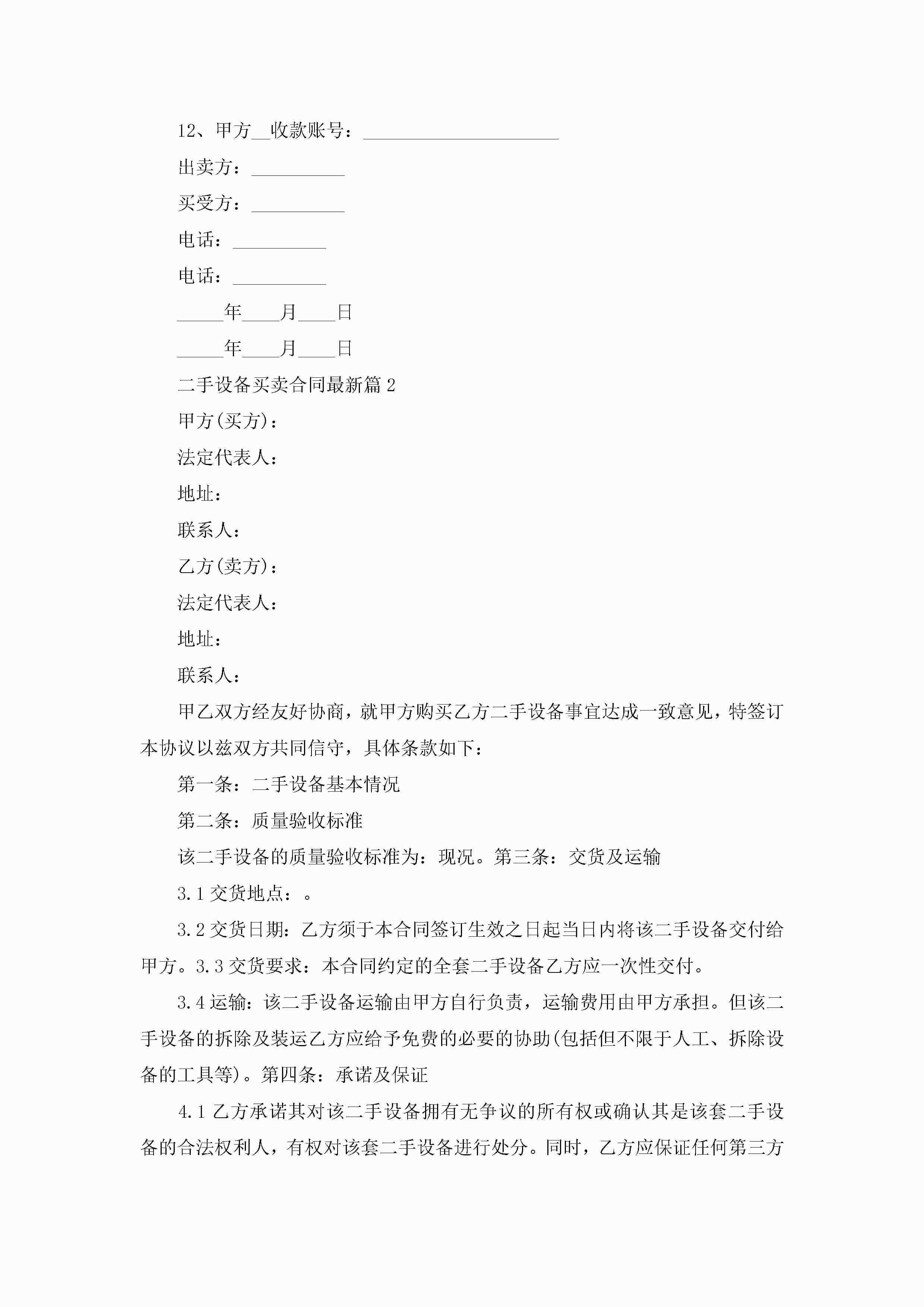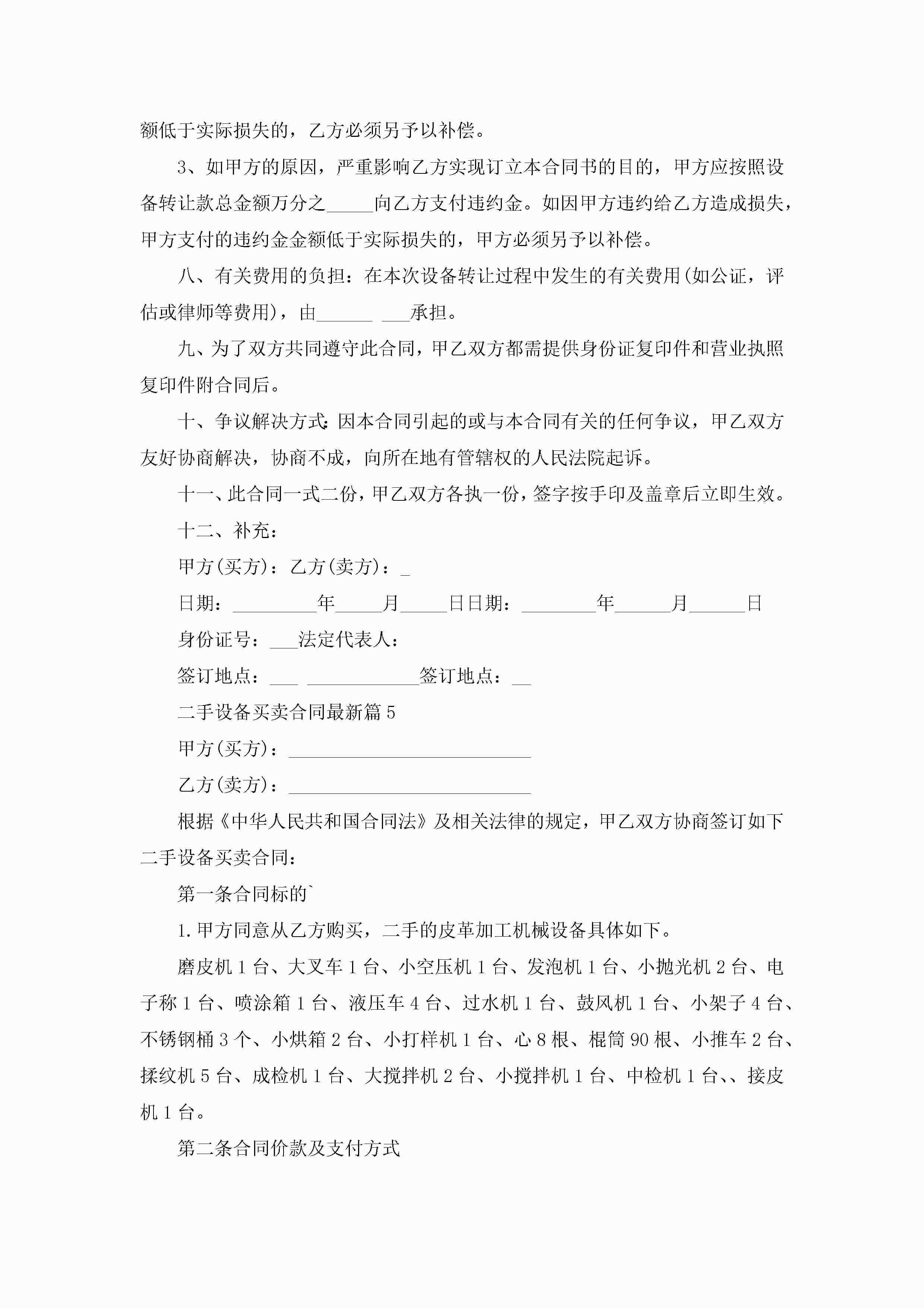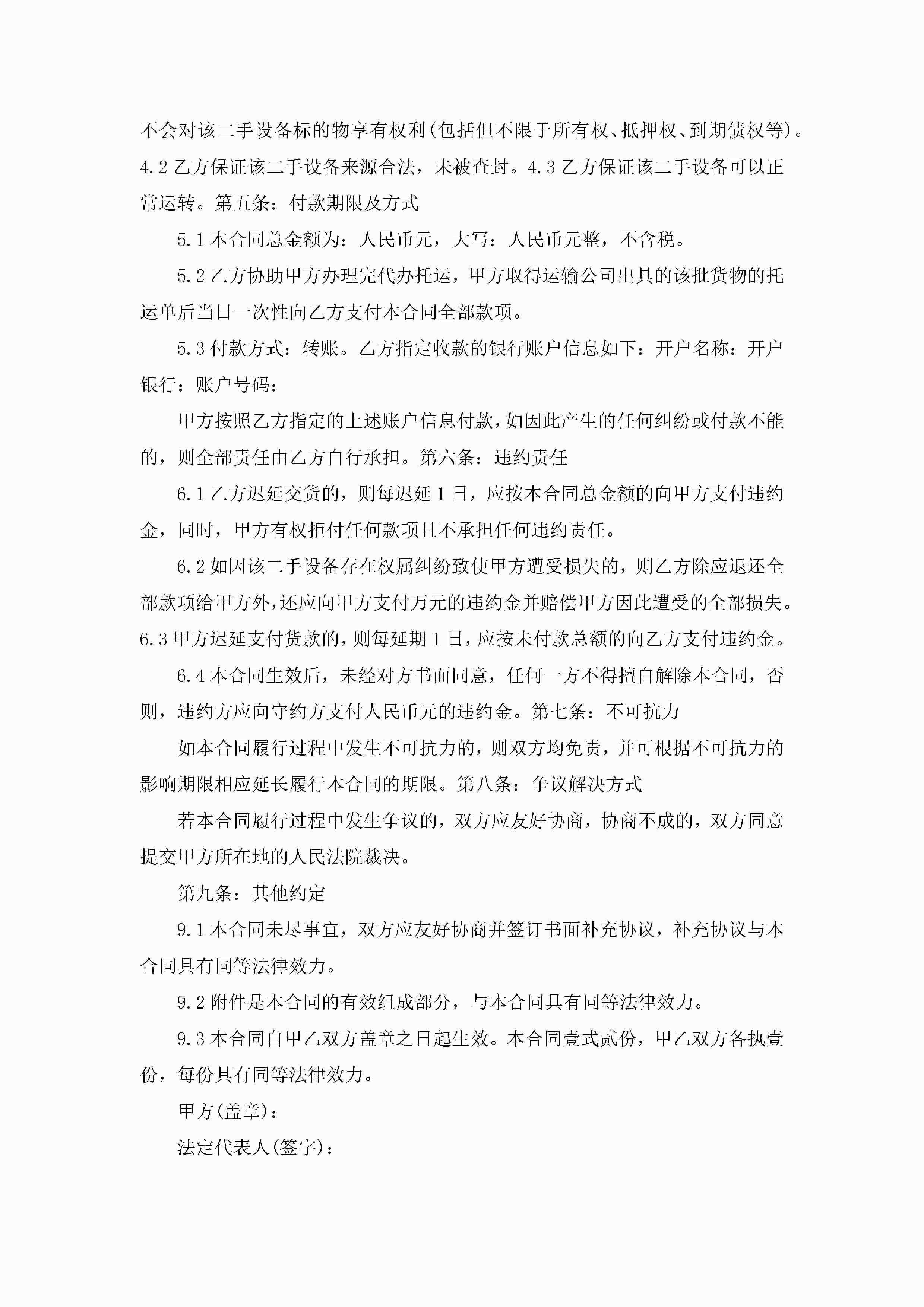 二手设备买卖合同最新模板jugei3月23日 01:38发布关注189 二手设备买卖合同最新模板此内容为付费资源,请付费后查看¥10.9 单篇文档限时特惠¥15个人会员开通企业会员开通立即下载无需登陆!可直接快捷下载单个模板付费资源© 版权声明THE ENDWord模板# 实用文档# 实用模板# 合同模板# 买卖合同 如有问题,可点击最底部“联系我们”联系客服 分享QQ空间微博QQ好友海报分享复制链接收藏