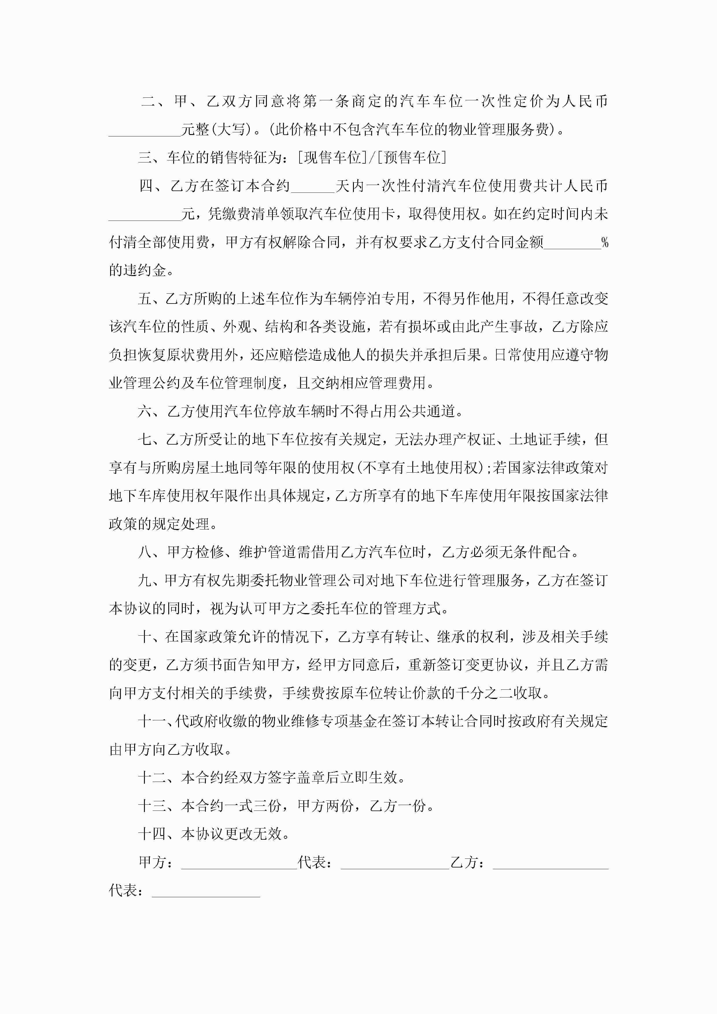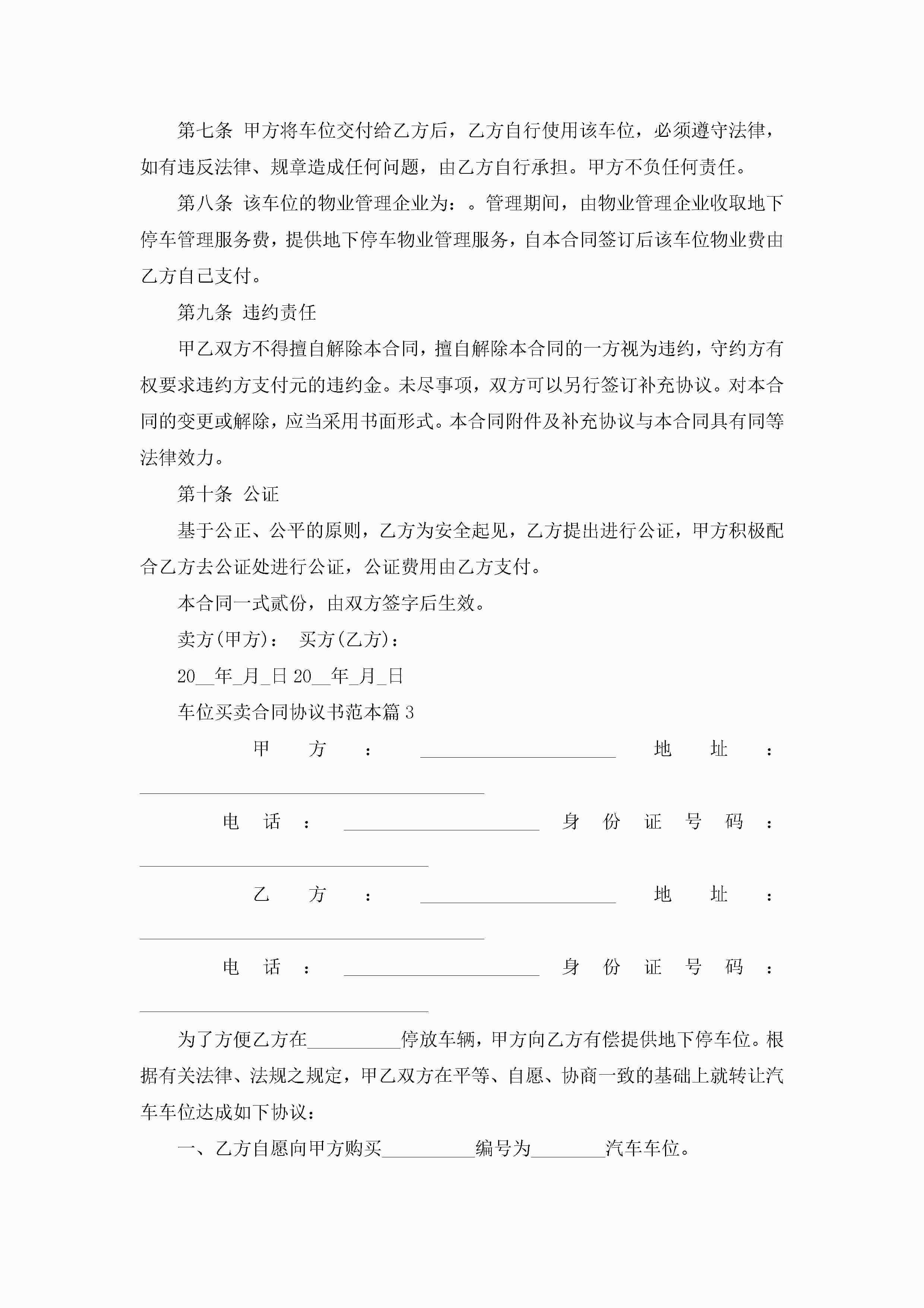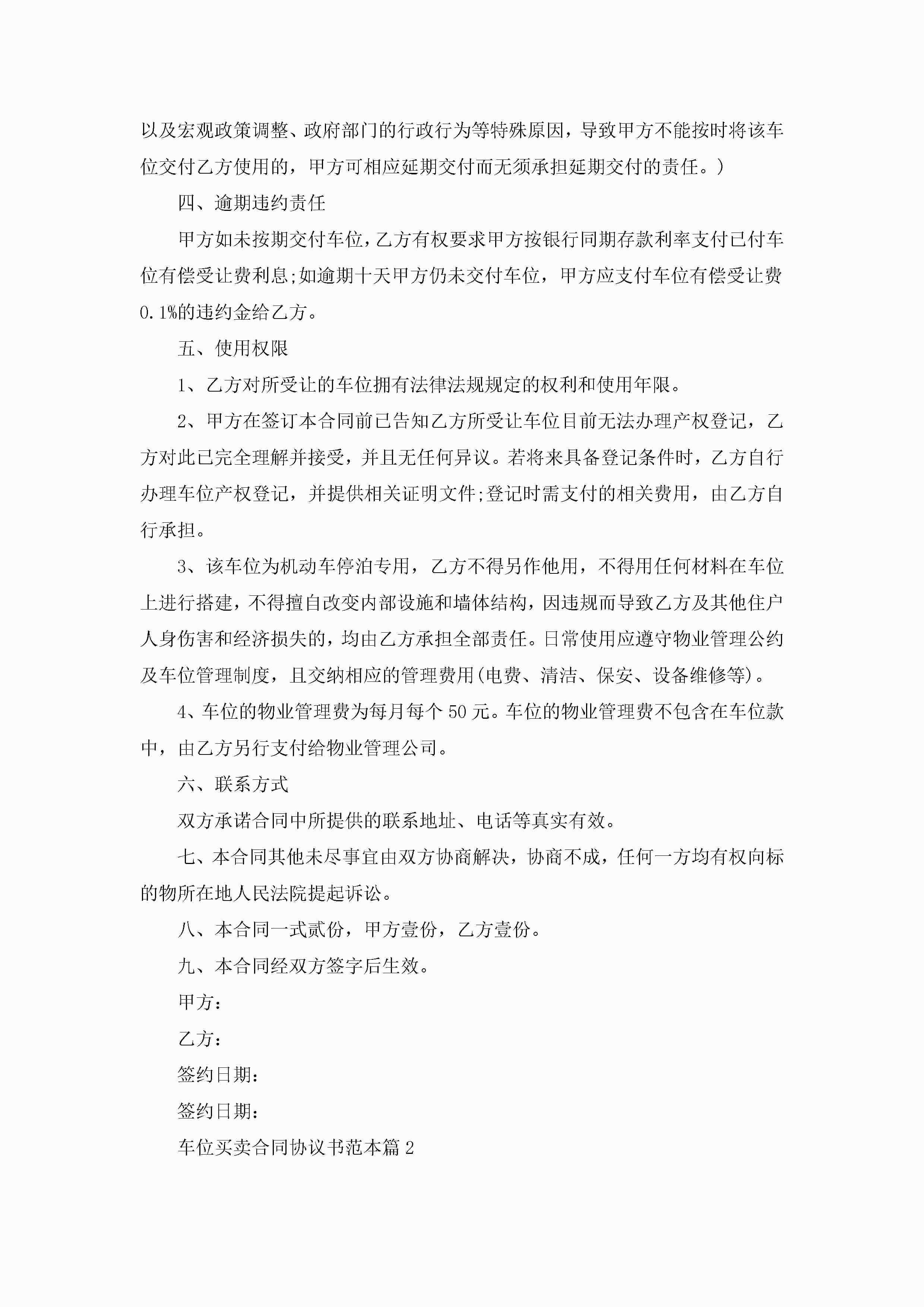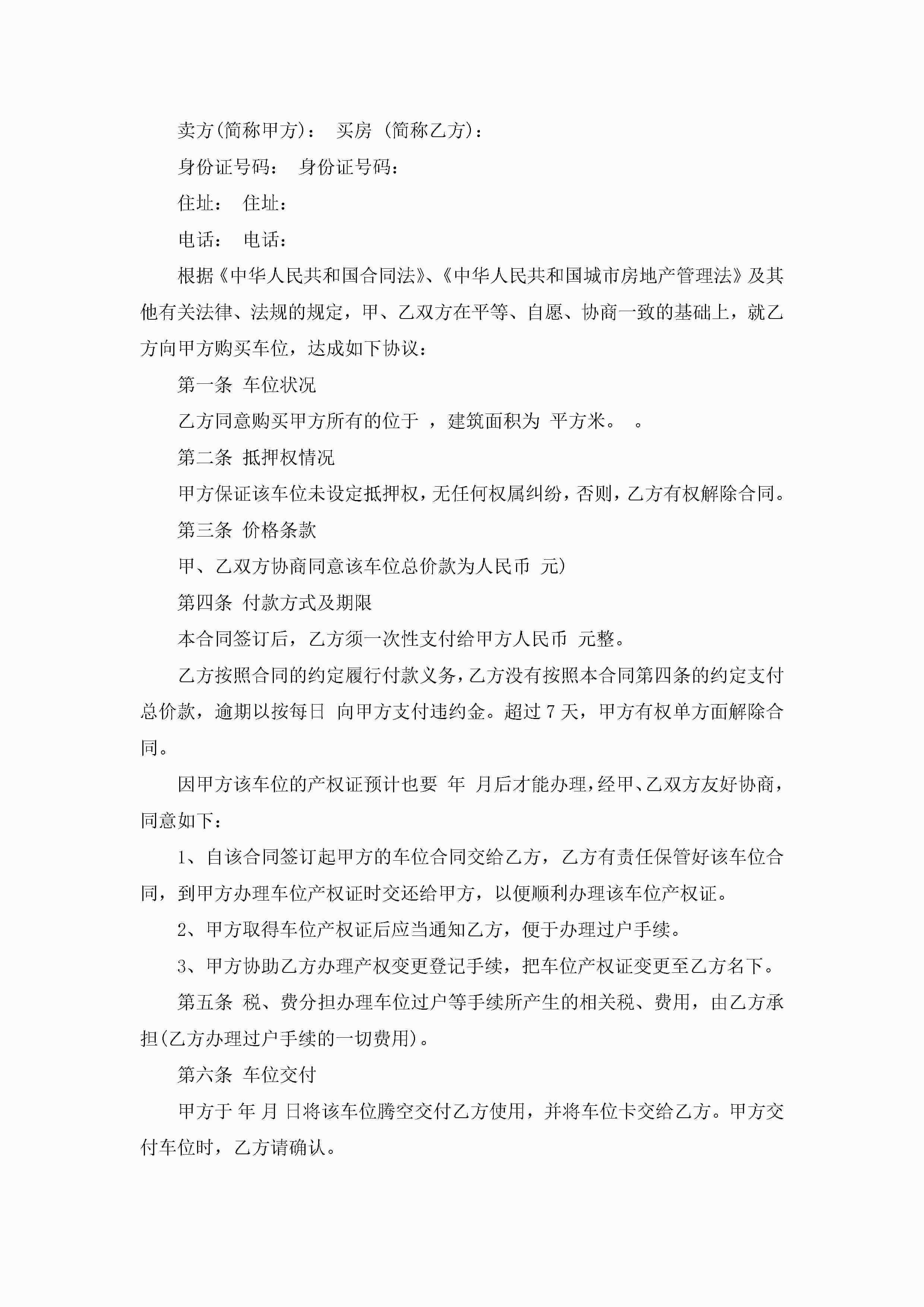 车位买卖合同协议书范本【7篇】jugei3月23日 01:38发布关注186 车位买卖合同协议书范本【7篇】此内容为付费资源,请付费后查看¥10.9 单篇文档限时特惠¥15个人会员开通企业会员开通立即下载无需登陆!可直接快捷下载单个模板付费资源© 版权声明THE ENDWord模板# 实用文档# 实用模板# 合同模板# 买卖合同 如有问题,可点击最底部“联系我们”联系客服 分享QQ空间微博QQ好友海报分享复制链接收藏