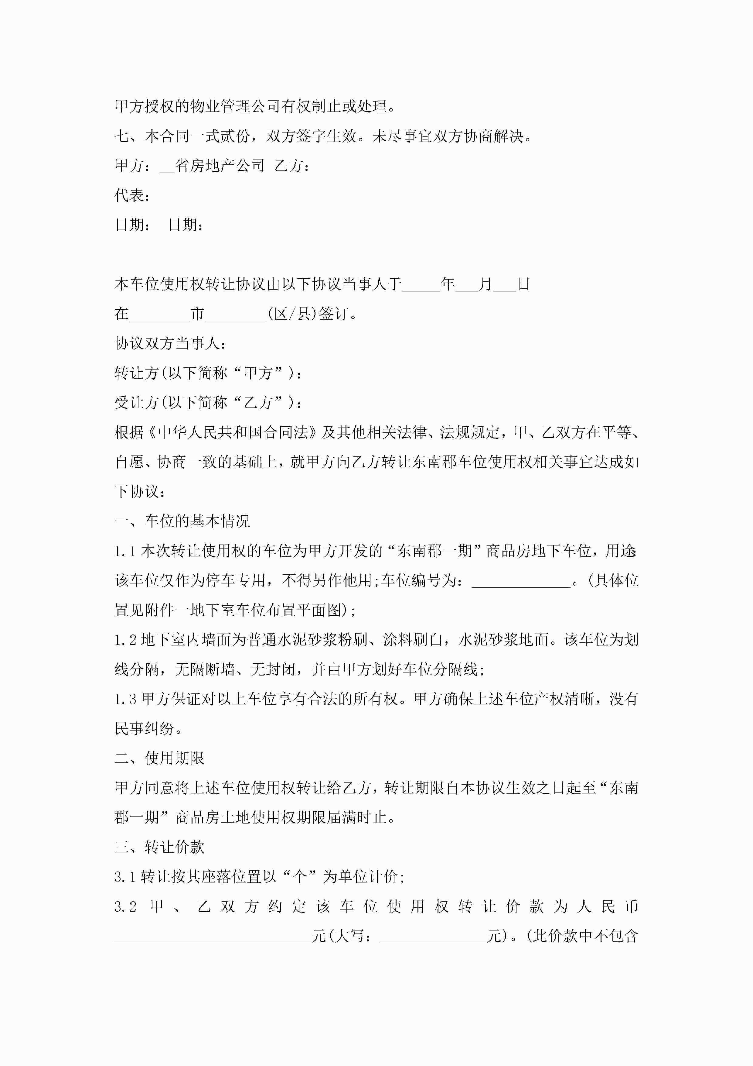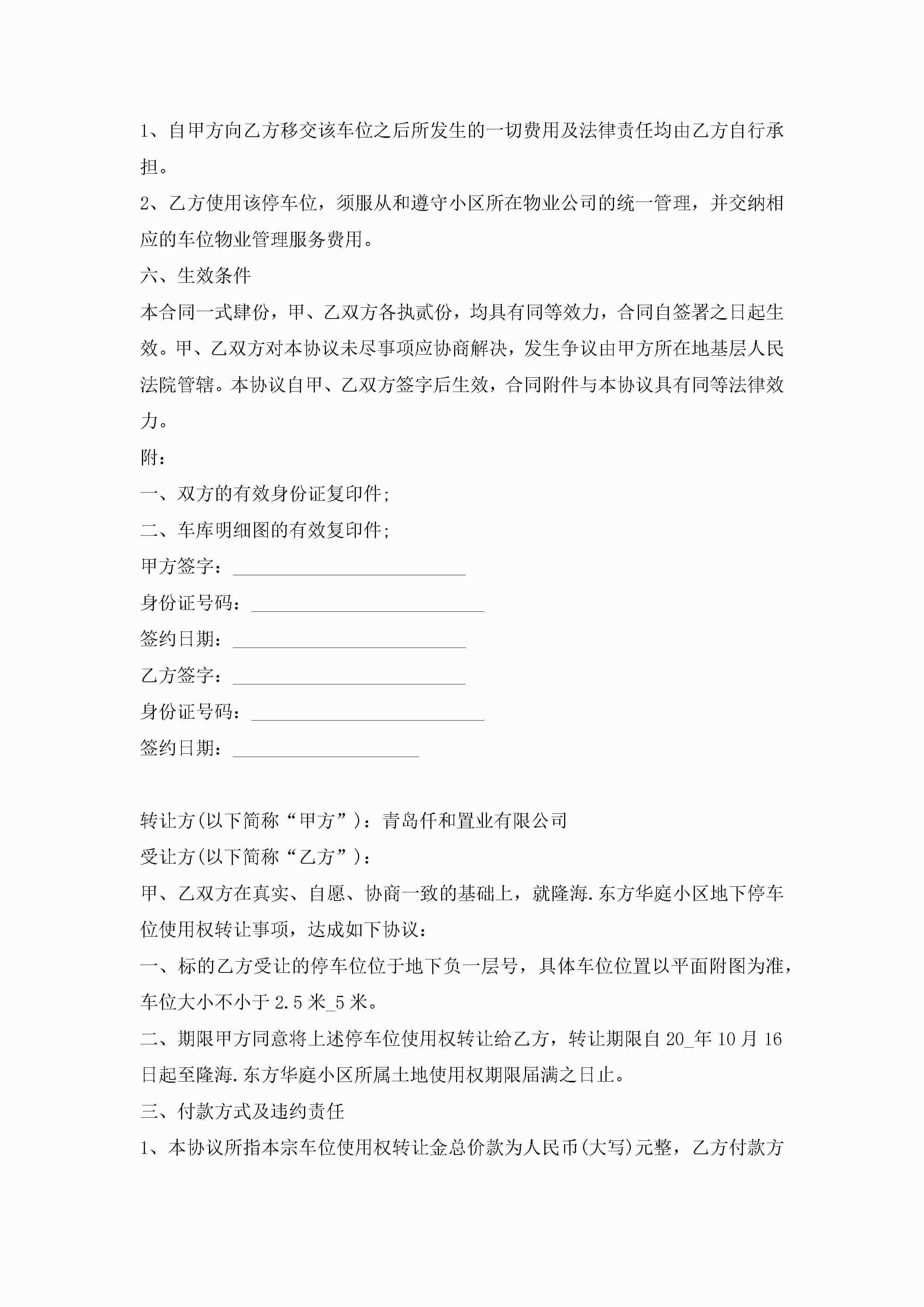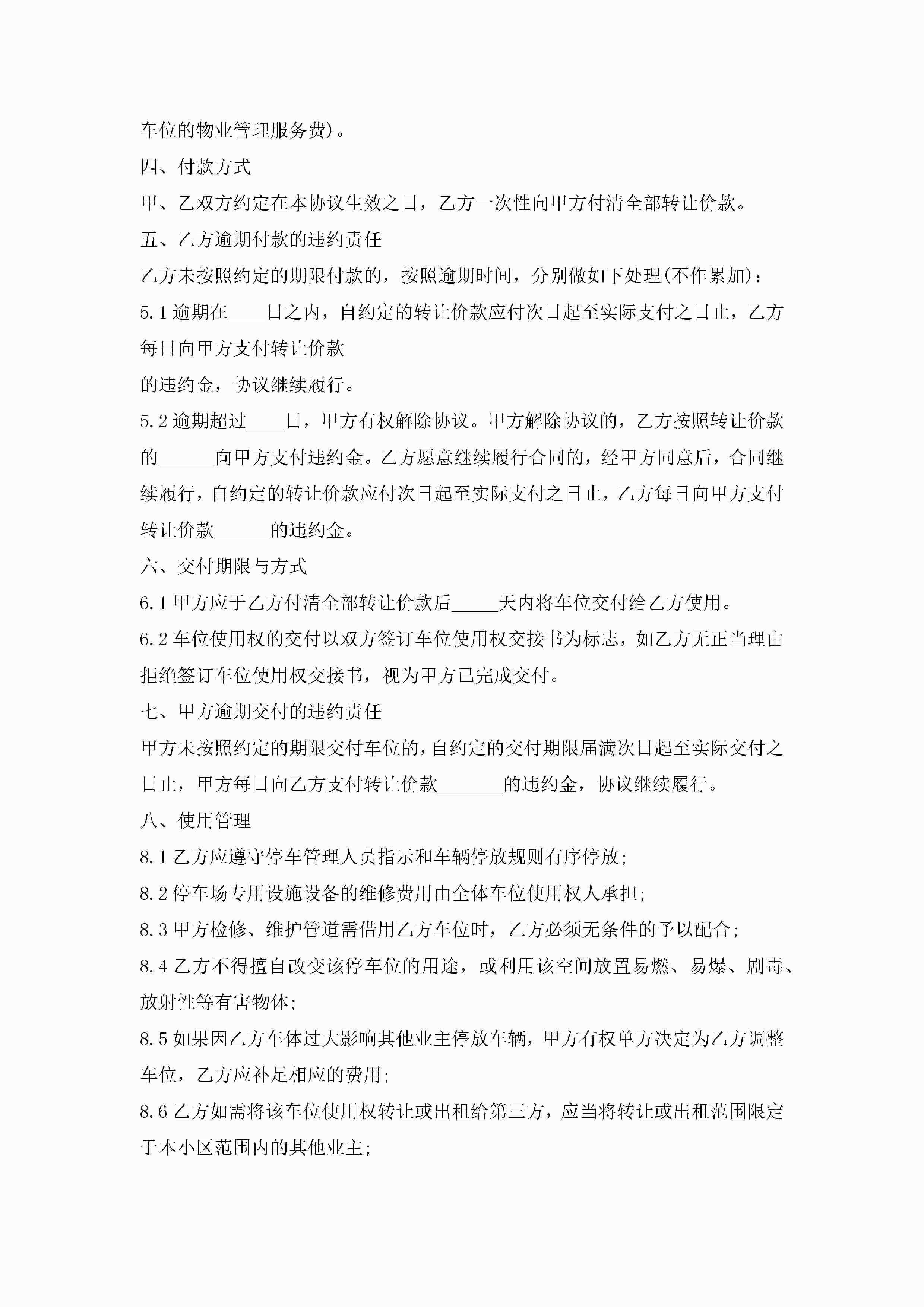 停车位买卖合同【7篇】jugei3月23日 01:38发布关注187 停车位买卖合同【7篇】此内容为付费资源,请付费后查看¥10.9 单篇文档限时特惠¥15个人会员开通企业会员开通立即下载无需登陆!可直接快捷下载单个模板付费资源© 版权声明THE ENDWord模板# 实用文档# 实用模板# 合同模板# 买卖合同 如有问题,可点击最底部“联系我们”联系客服 分享QQ空间微博QQ好友海报分享复制链接收藏