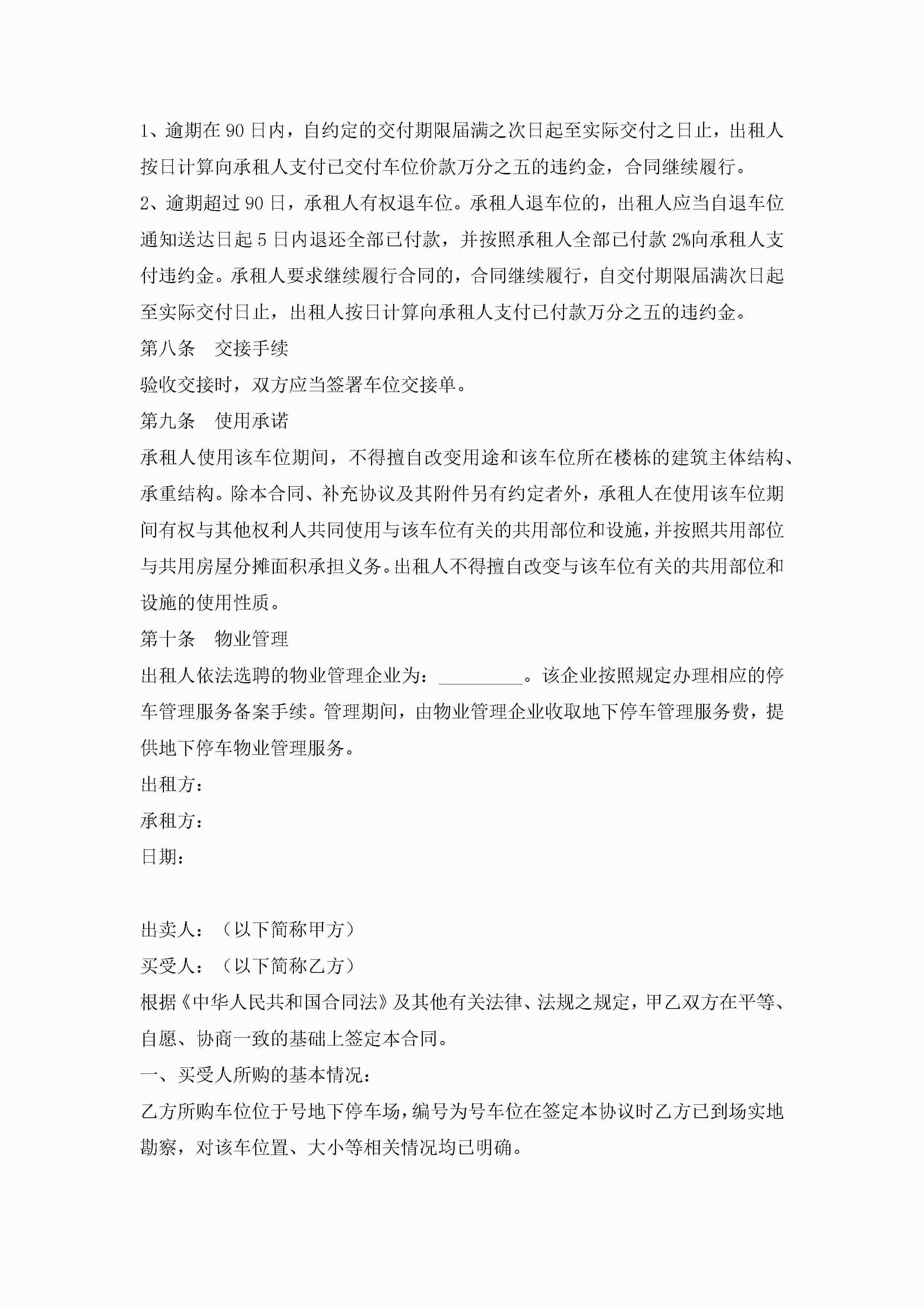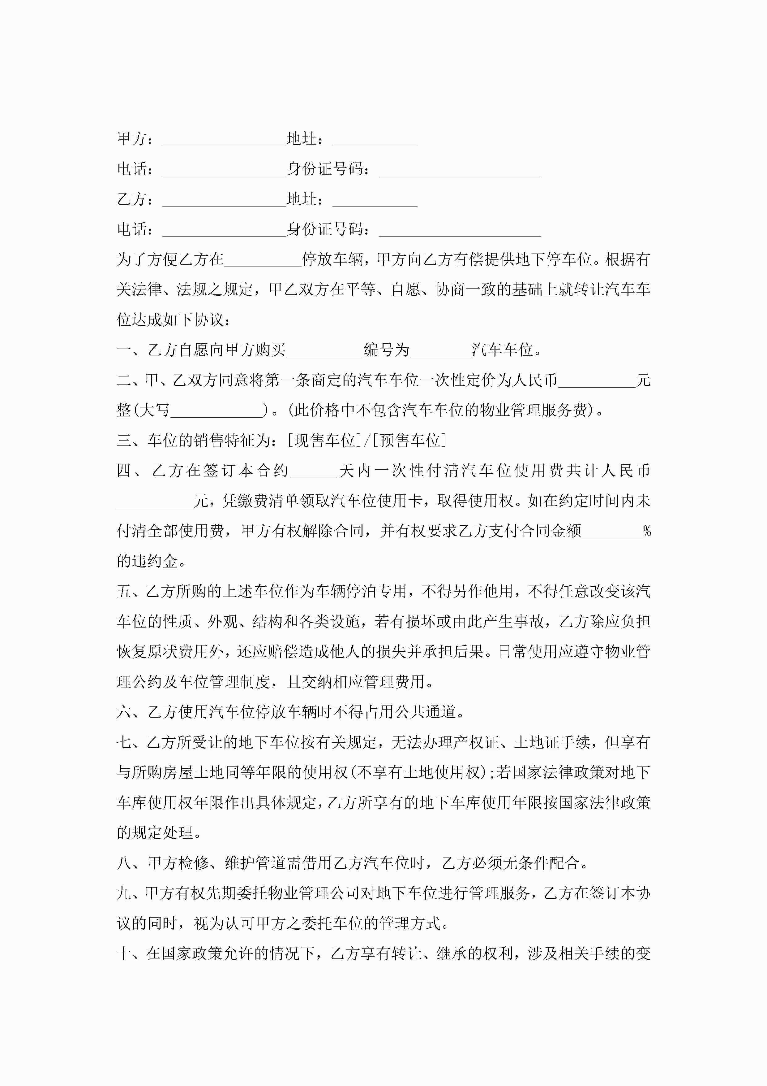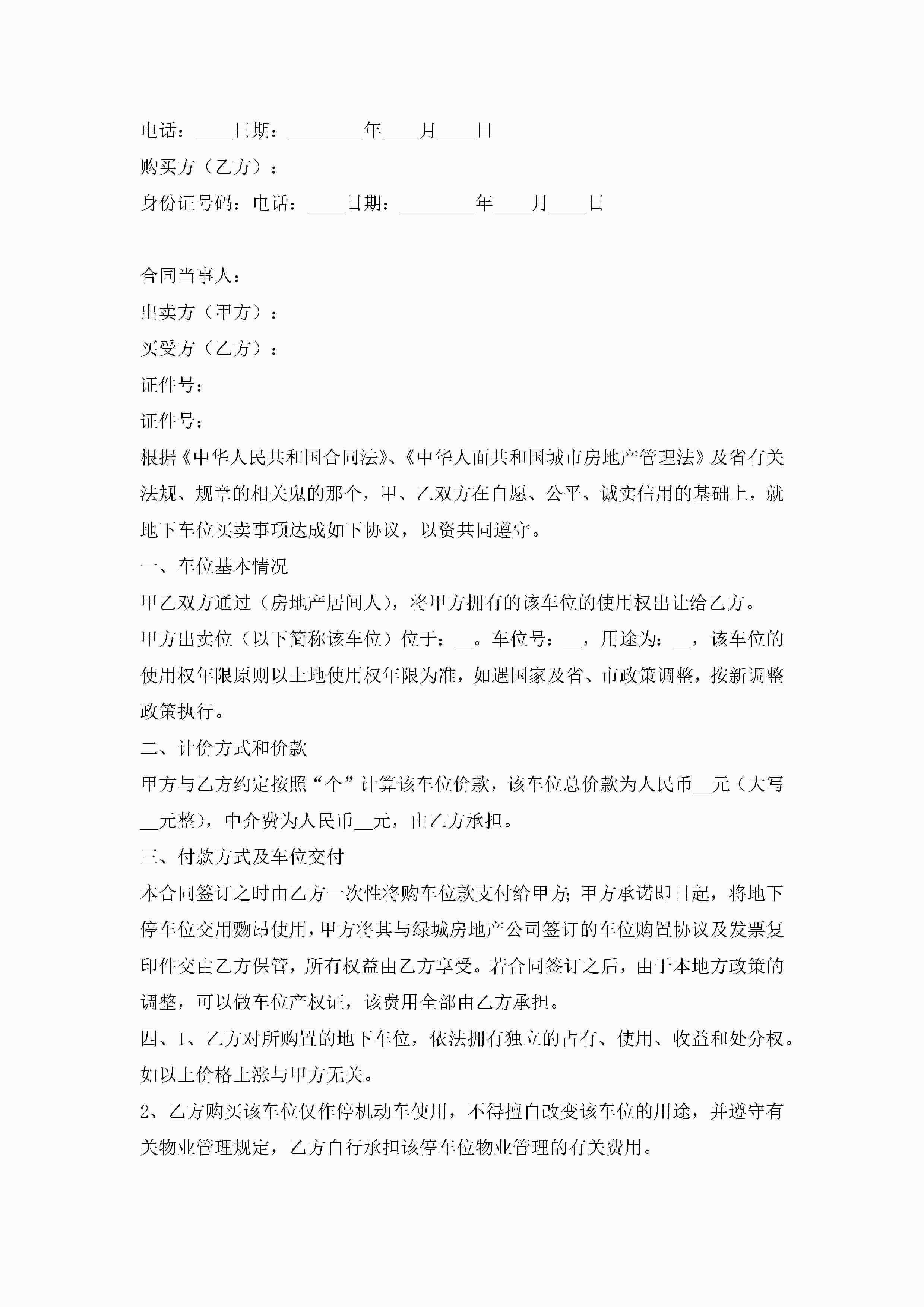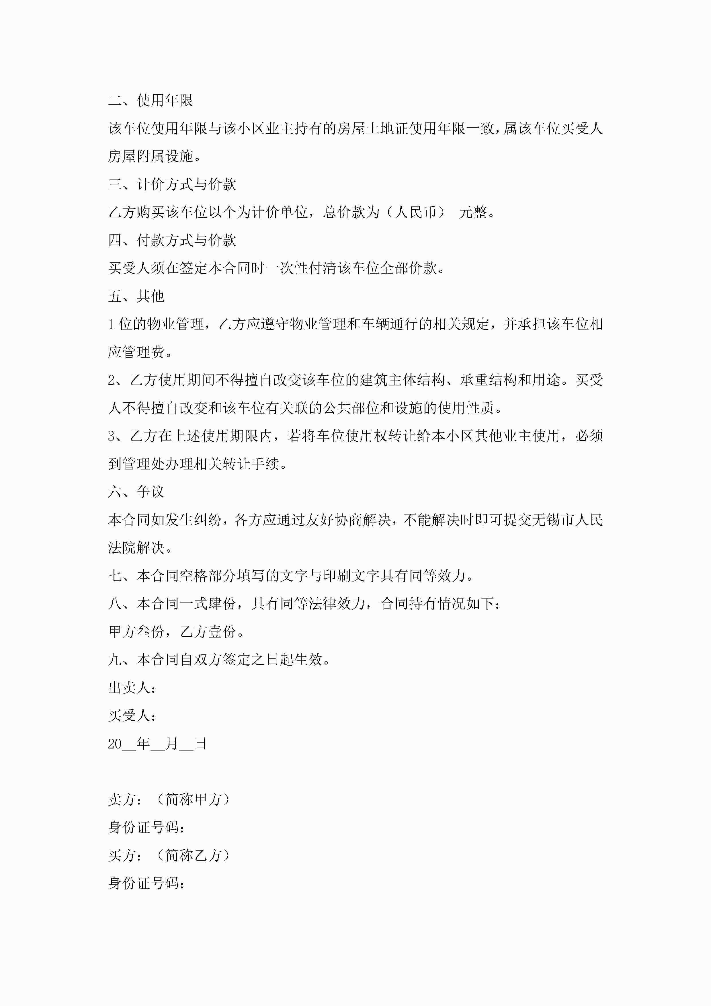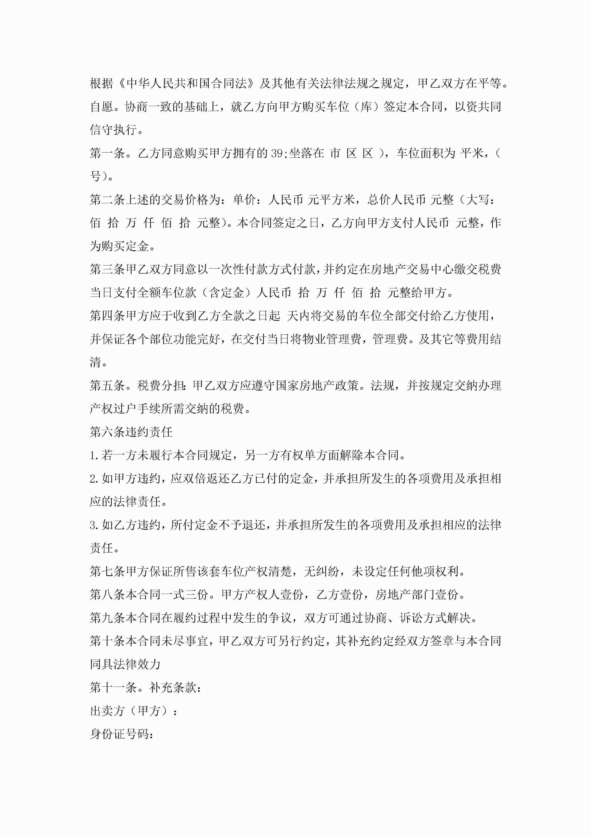 车位买卖合同模板(7篇)jugei3月23日 01:39发布关注184 车位买卖合同模板(7篇)此内容为付费资源,请付费后查看¥10.9 单篇文档限时特惠¥15个人会员开通企业会员开通立即下载无需登陆!可直接快捷下载单个模板付费资源© 版权声明THE ENDWord模板# 实用文档# 实用模板# 合同模板# 买卖合同 如有问题,可点击最底部“联系我们”联系客服 分享QQ空间微博QQ好友海报分享复制链接收藏