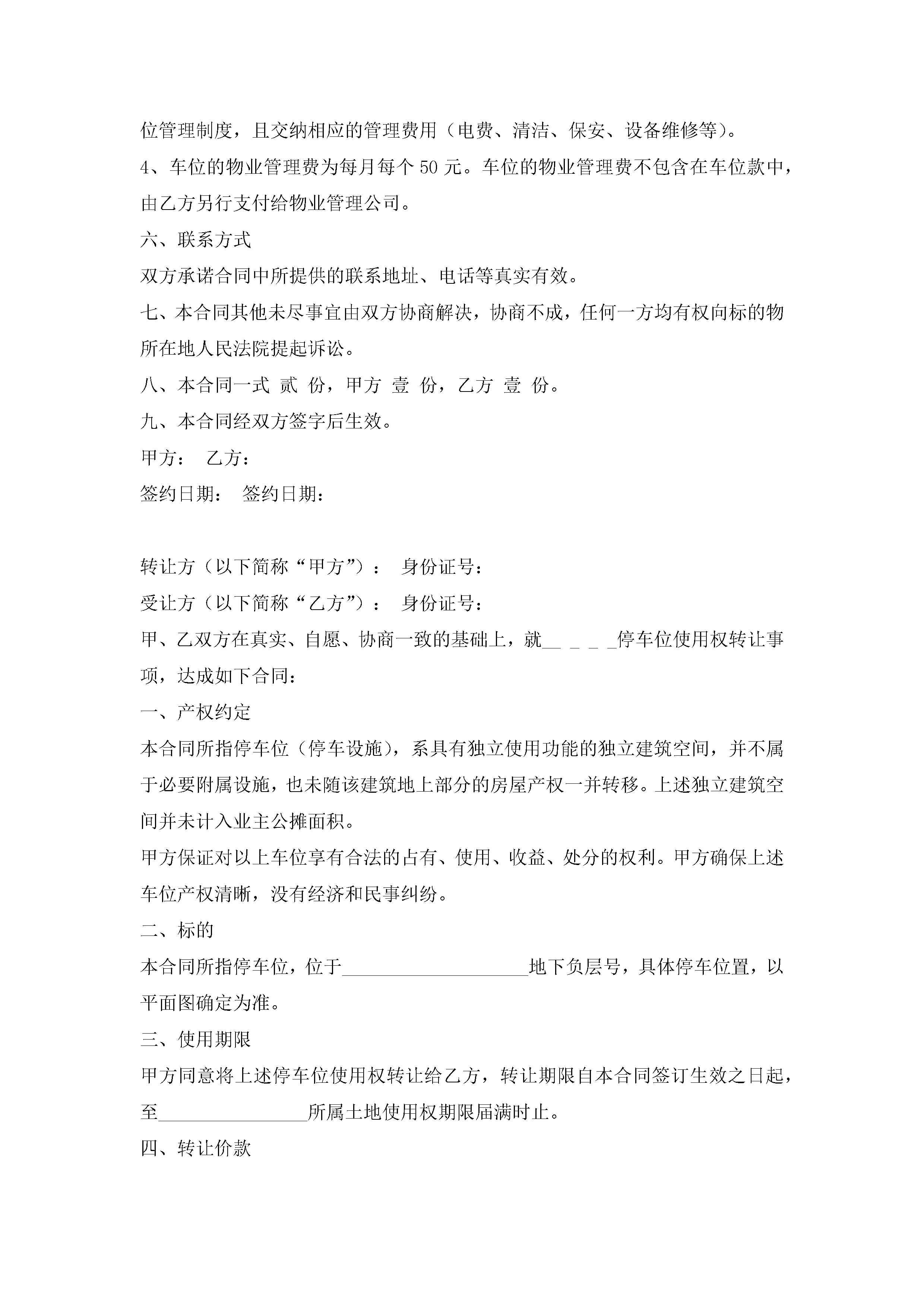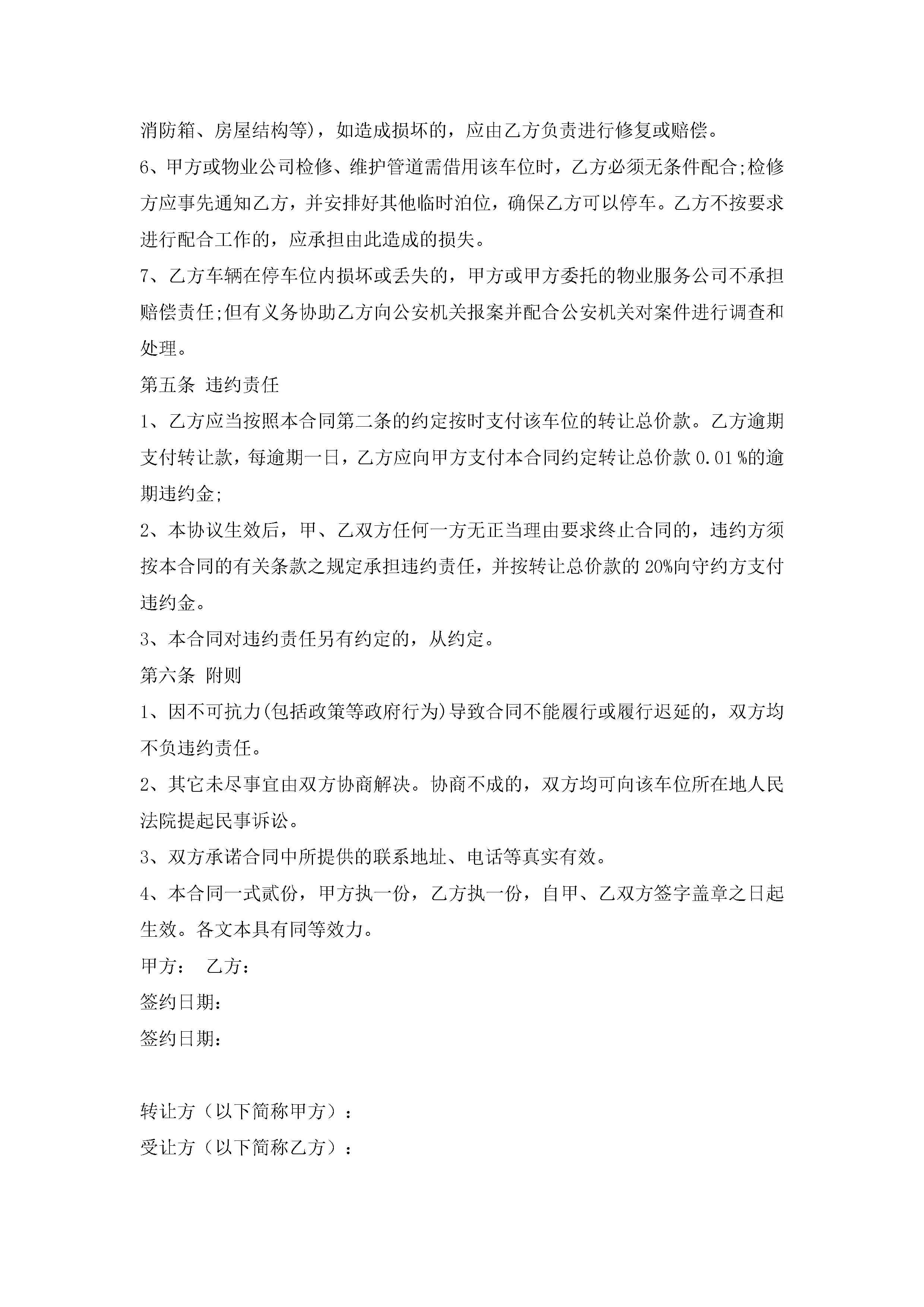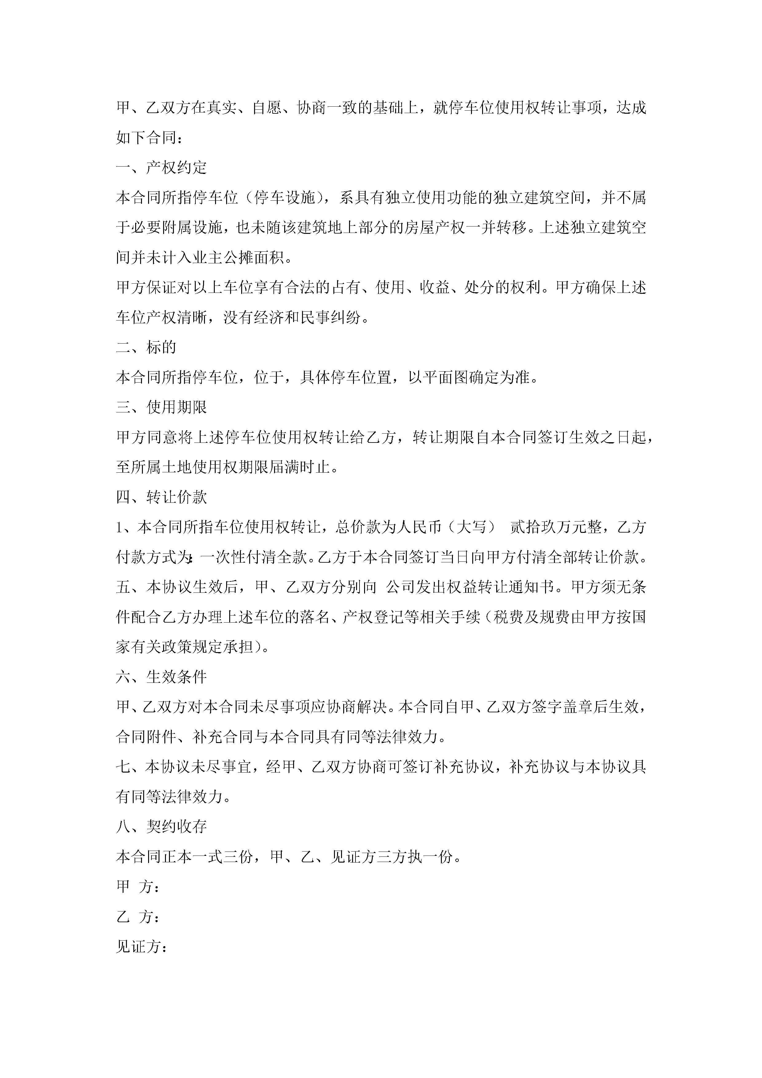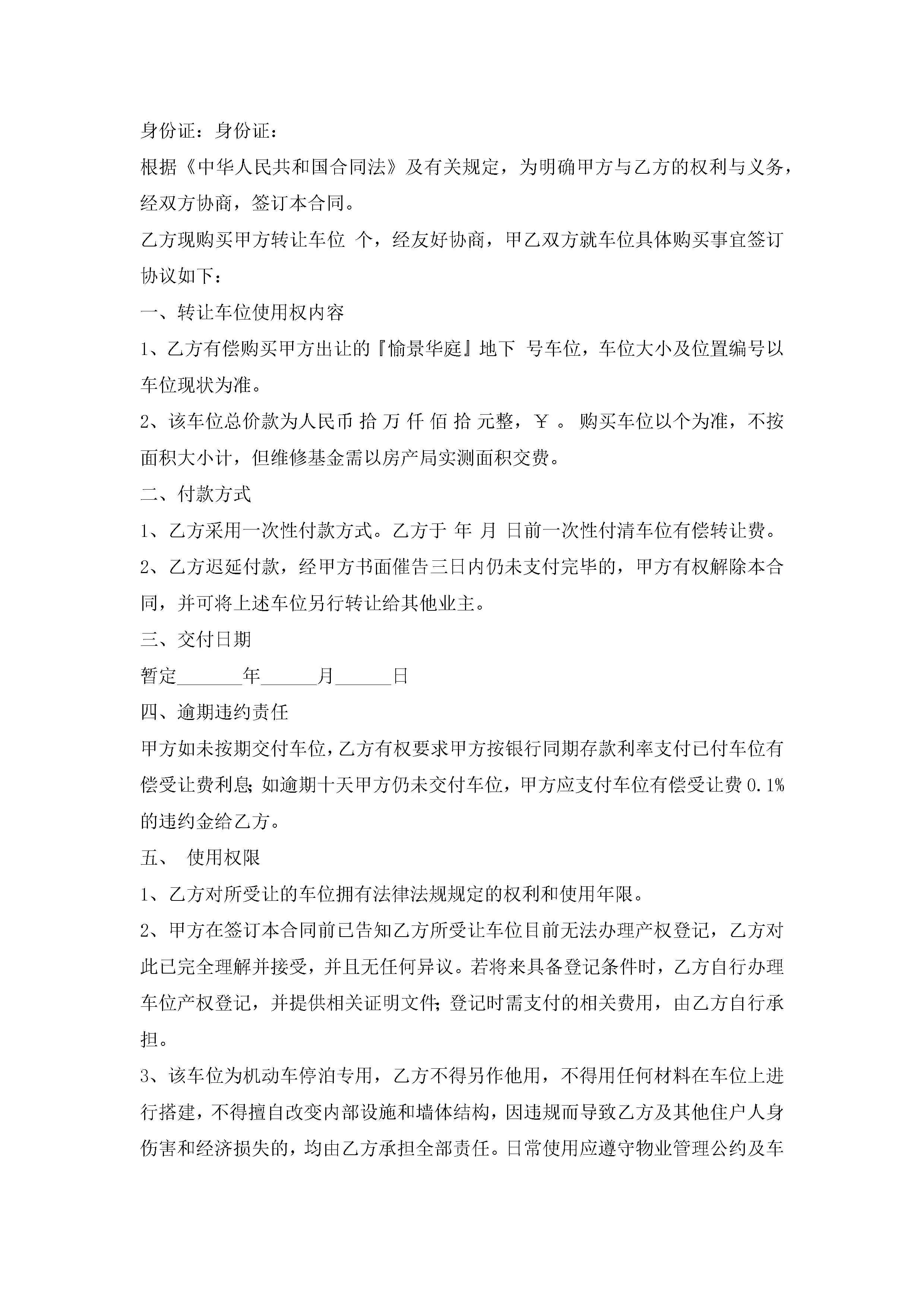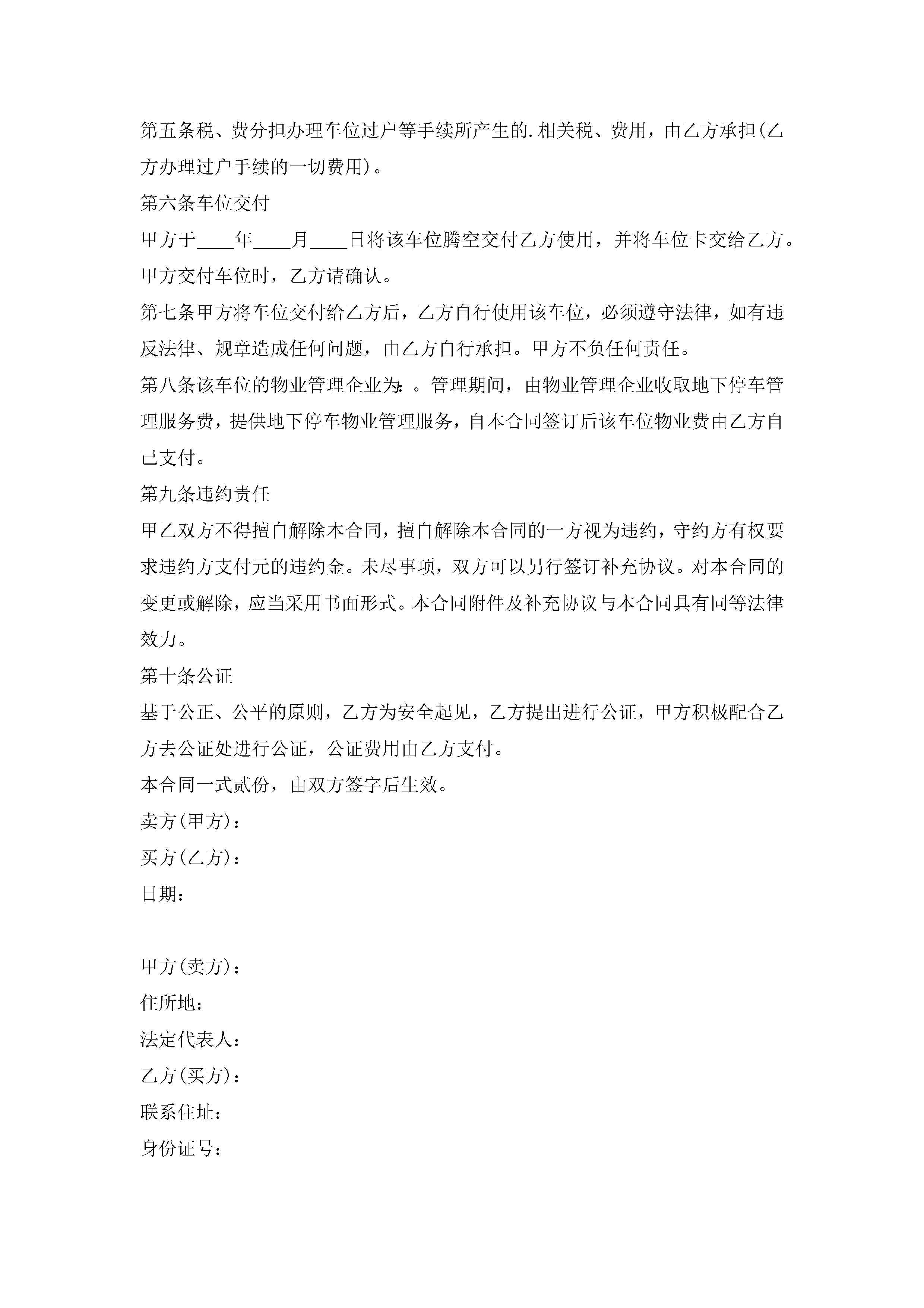 车位购买合同书(通用9篇)jugei3月23日 01:39发布关注186 车位购买合同书(通用9篇)此内容为付费资源,请付费后查看¥10.9 单篇文档限时特惠¥15个人会员开通企业会员开通立即下载无需登陆!可直接快捷下载单个模板付费资源© 版权声明THE ENDWord模板# 实用文档# 实用模板# 合同模板# 买卖合同 如有问题,可点击最底部“联系我们”联系客服 分享QQ空间微博QQ好友海报分享复制链接收藏